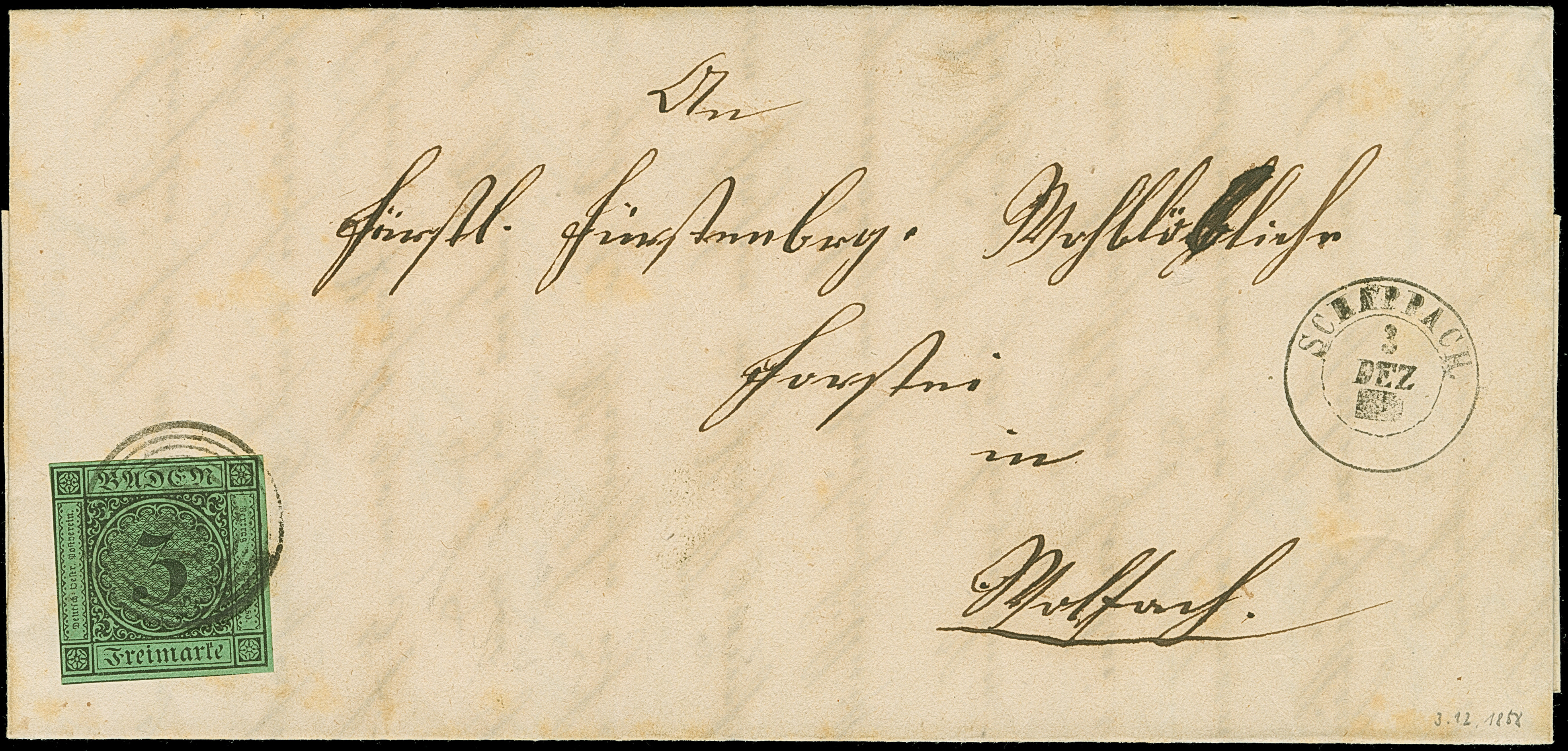 3 Kr. auf grün, voll- bis breitrandig, mit zentrisch auf- und zusätzlich nebengesetztem Uhrradstempel "10" (Kuppenheim) und nebengesetztem DKr. "RASTATT 10.FEB" auf Briefhülle nach Bruchsal. Lagerungsbedingte Tönungsstellen, sonst tadellose und ursprüngliche Erhaltung. Uhrradstempel sind auf dieser Marke außerordentlich selten; PROFI hat kein weiteres Ganzstück registriert. Fotoattest Stegmüller BPP (2026)