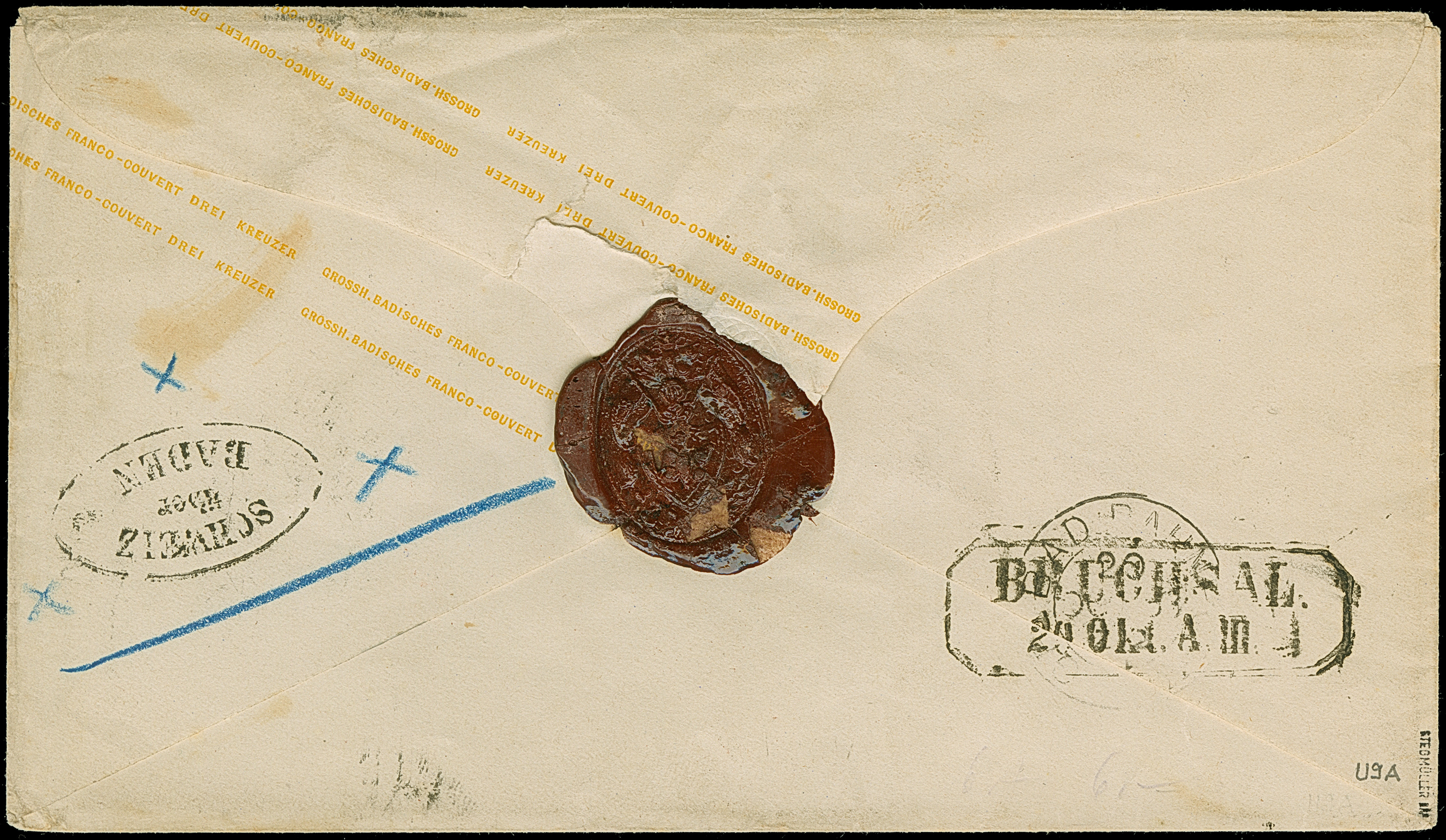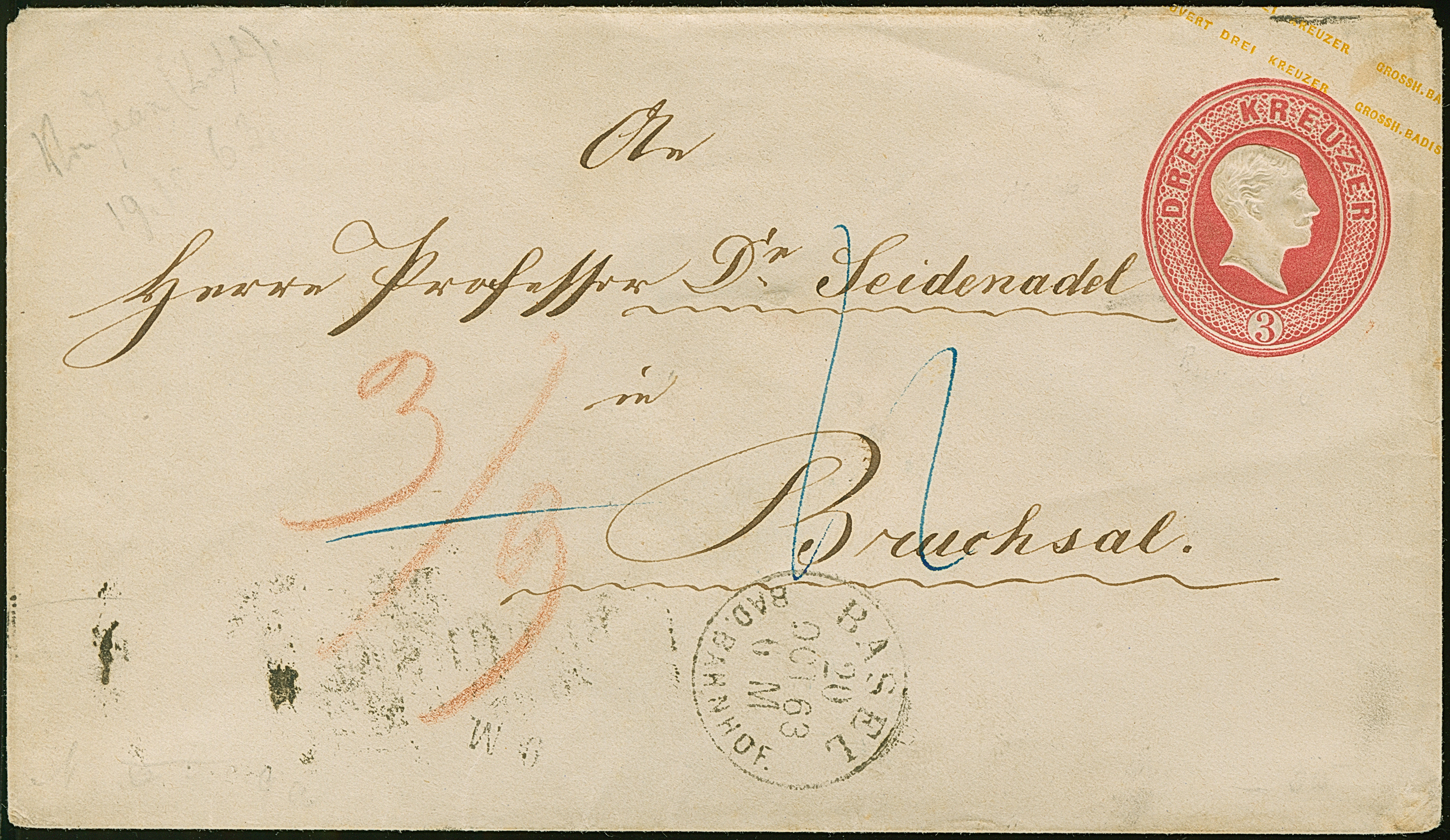 Umschlag 3 Kr. rosa mit nebengesetztem schweizer EKr. "BASEL BAD. BAHNHOF 20 O CT 63", nach Bruchsal, mit rückseitigem "SCHWEIZ über BADEN" und Ankunftsstempel. Der Brief wurde versehentlich in den Schweizer Briefkasten im Badischen Bahnhof geworfen, entsprechend als unfrankiert taxiert mit "3/9" (Kreuzern). Ein ungewöhnliches und interessantes Stück. Signiert Stegmüller BPP