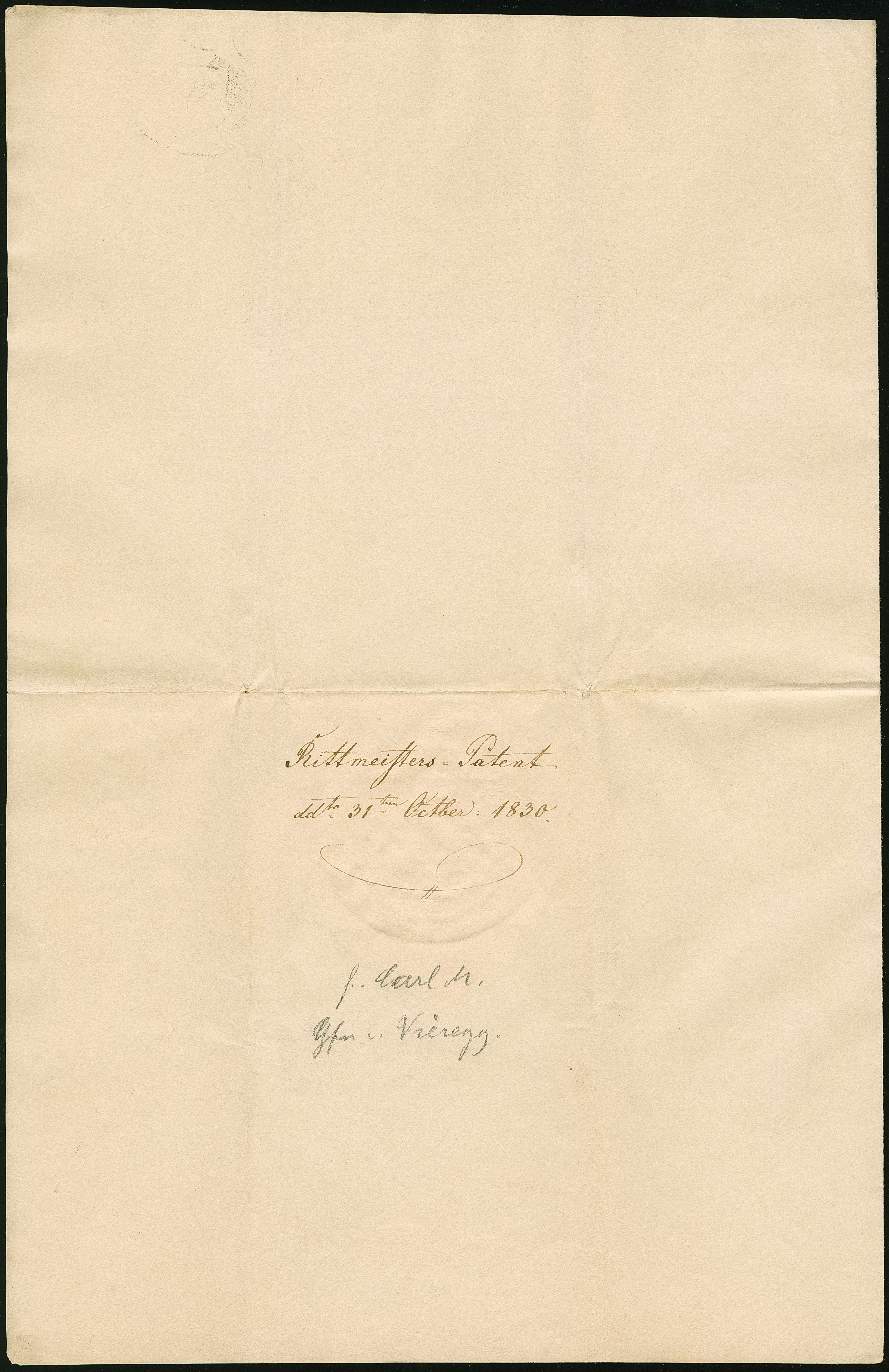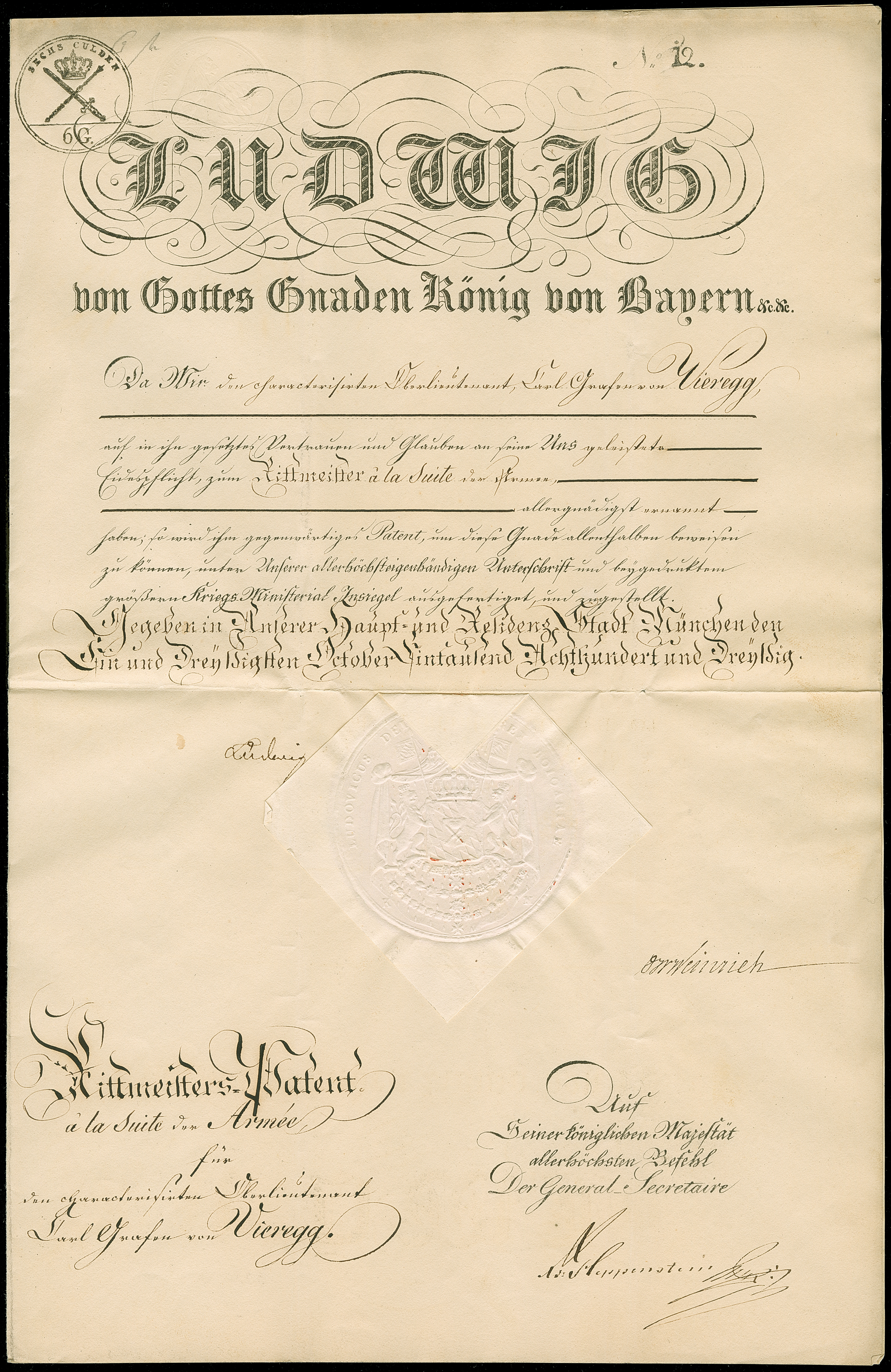1830, Ludwig I., König von Bayern, eigenhändige Unterschrift auf Rittmeister-Patent für den Grafen von Vieregg