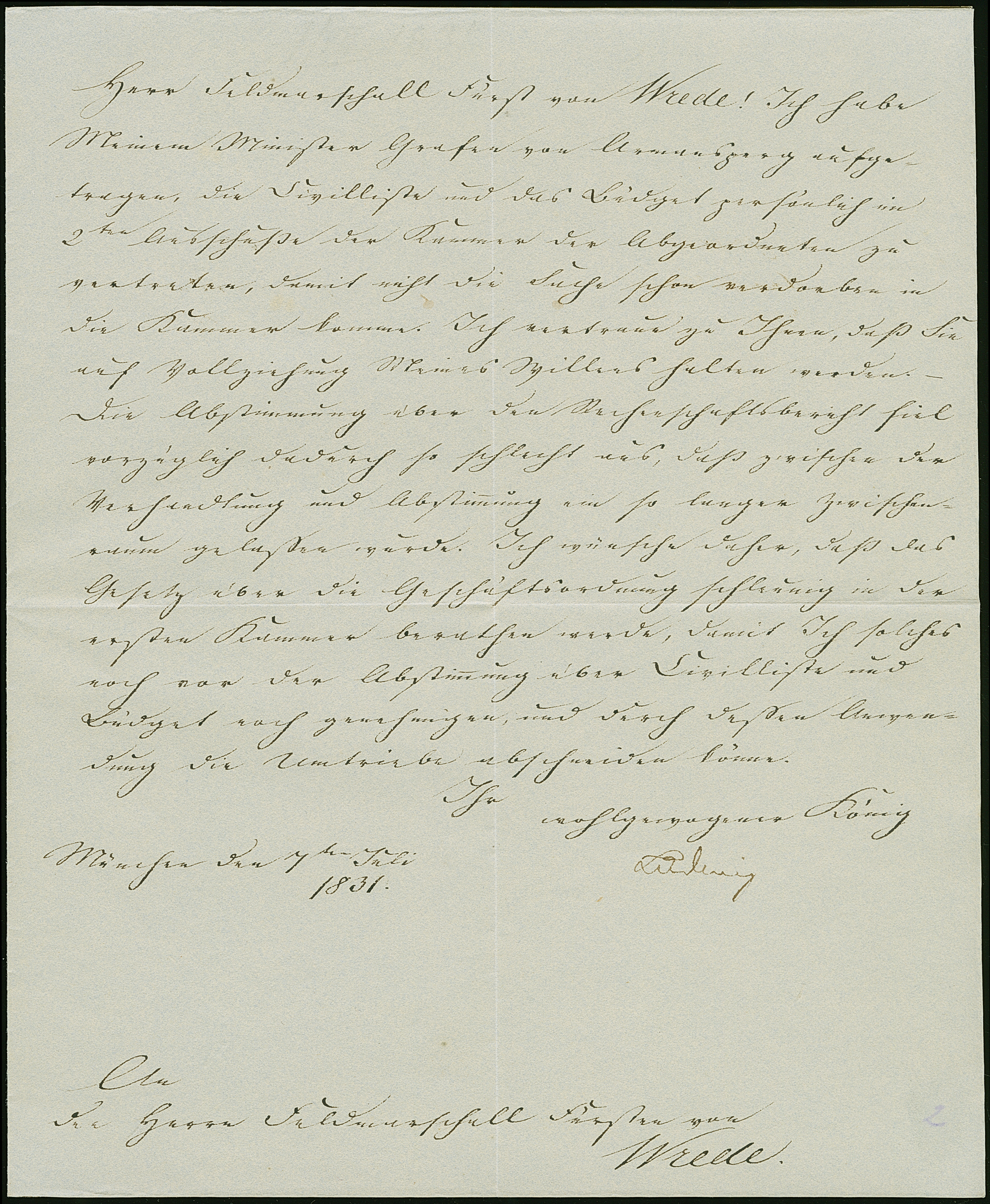 1831, Ludwig I., König von Bayern, eigenhändige Unterschrift auf einseitigem Schreiben an den Feldmarschall Fürst von Wrede.