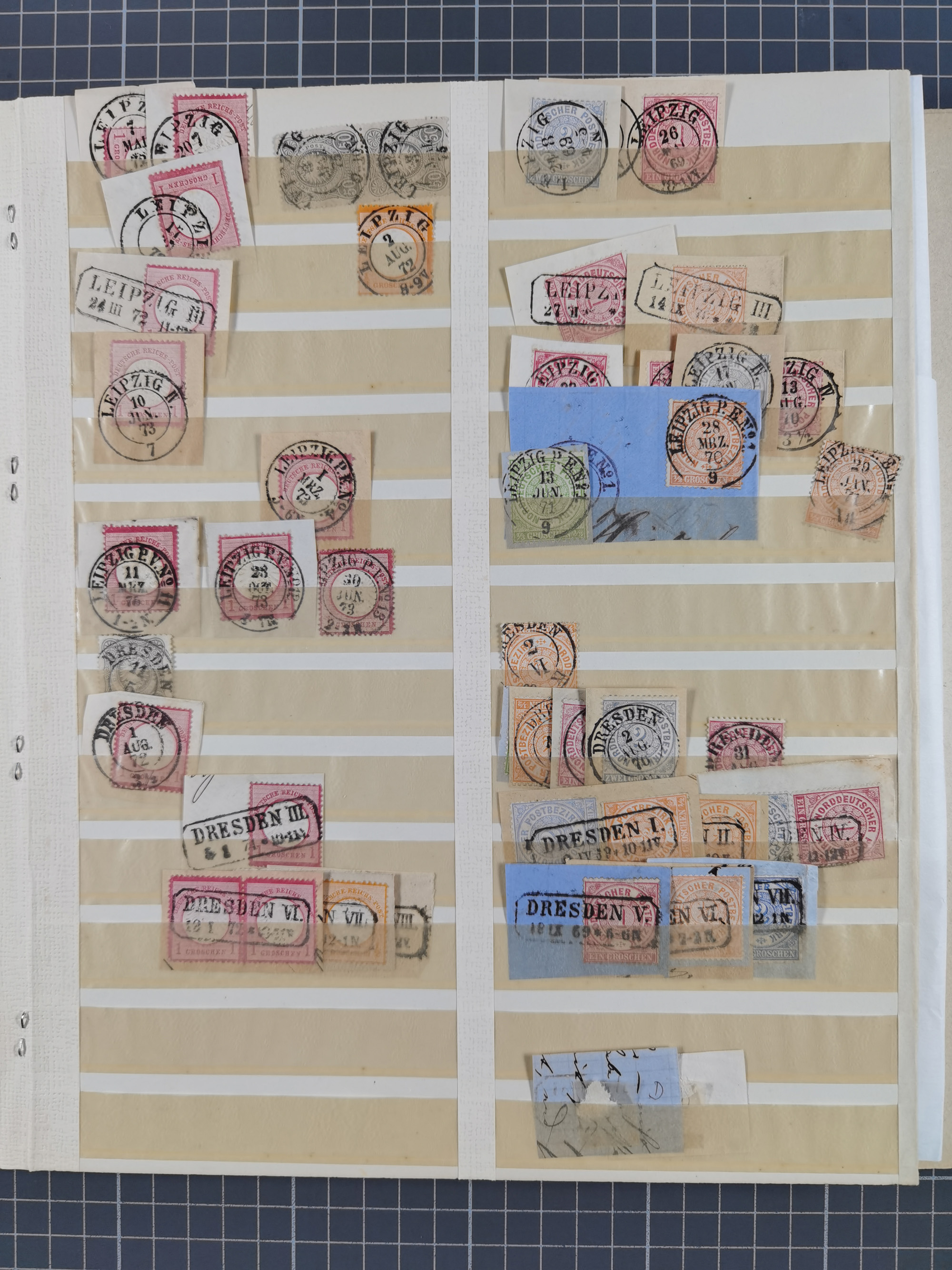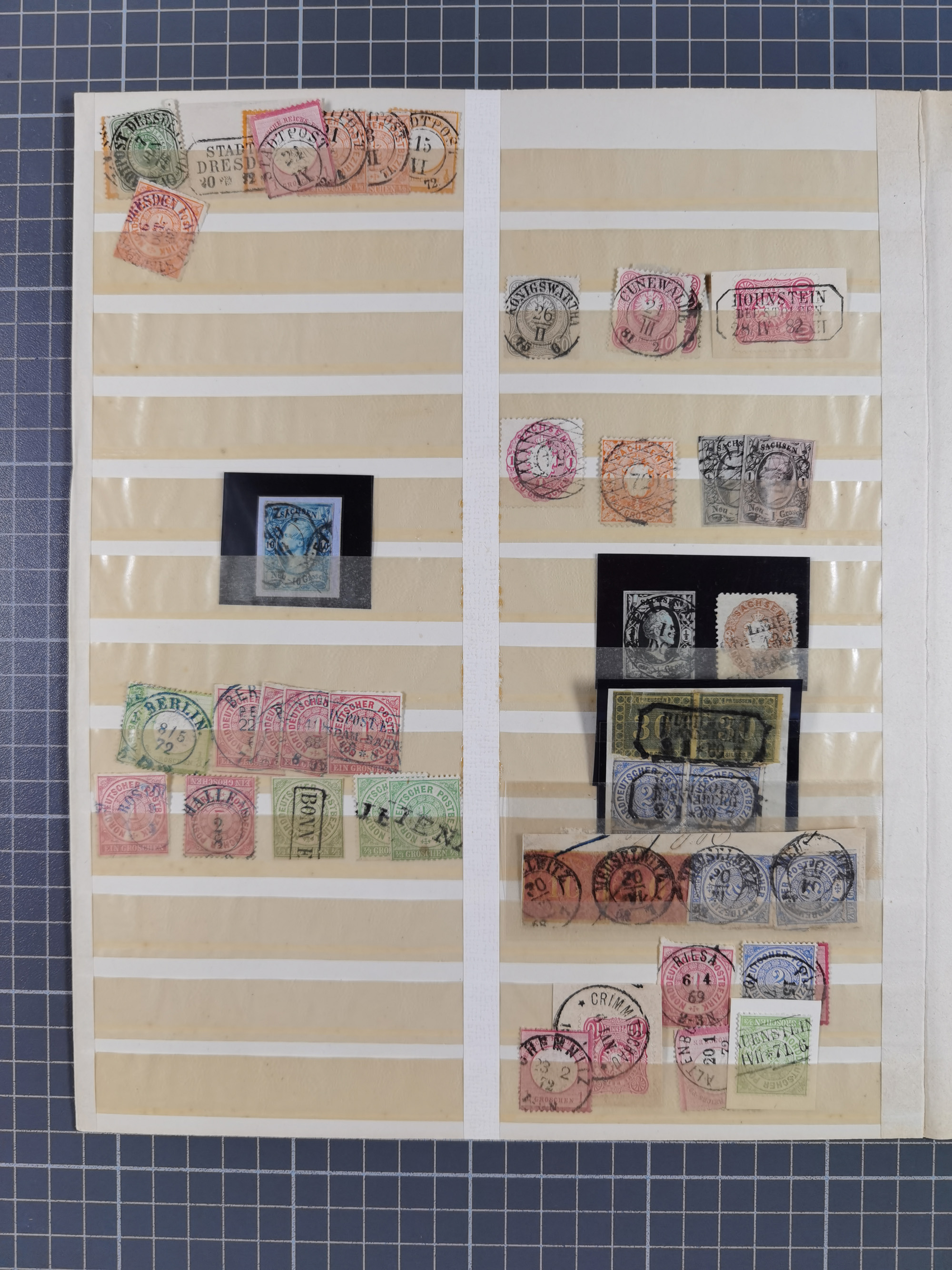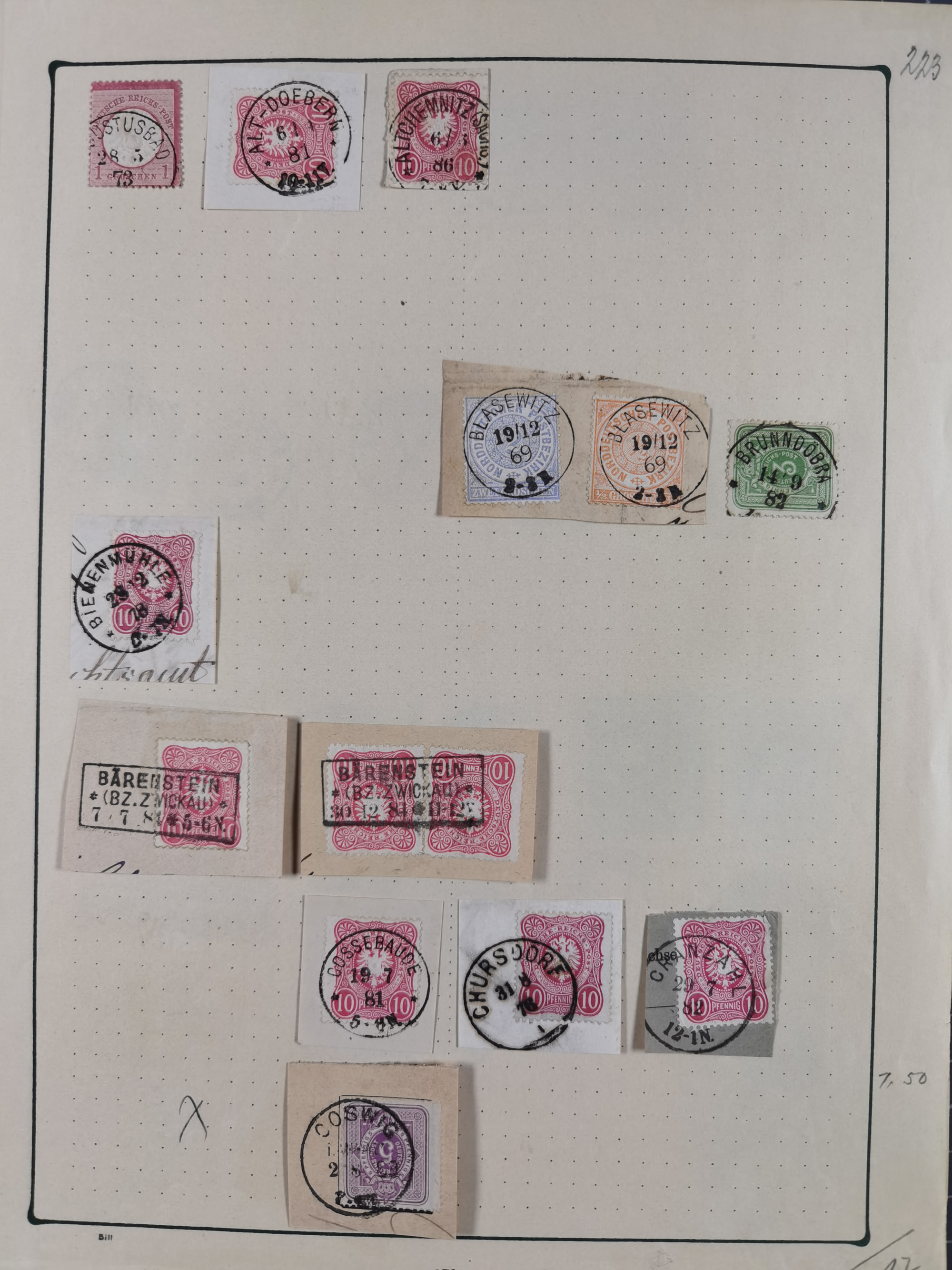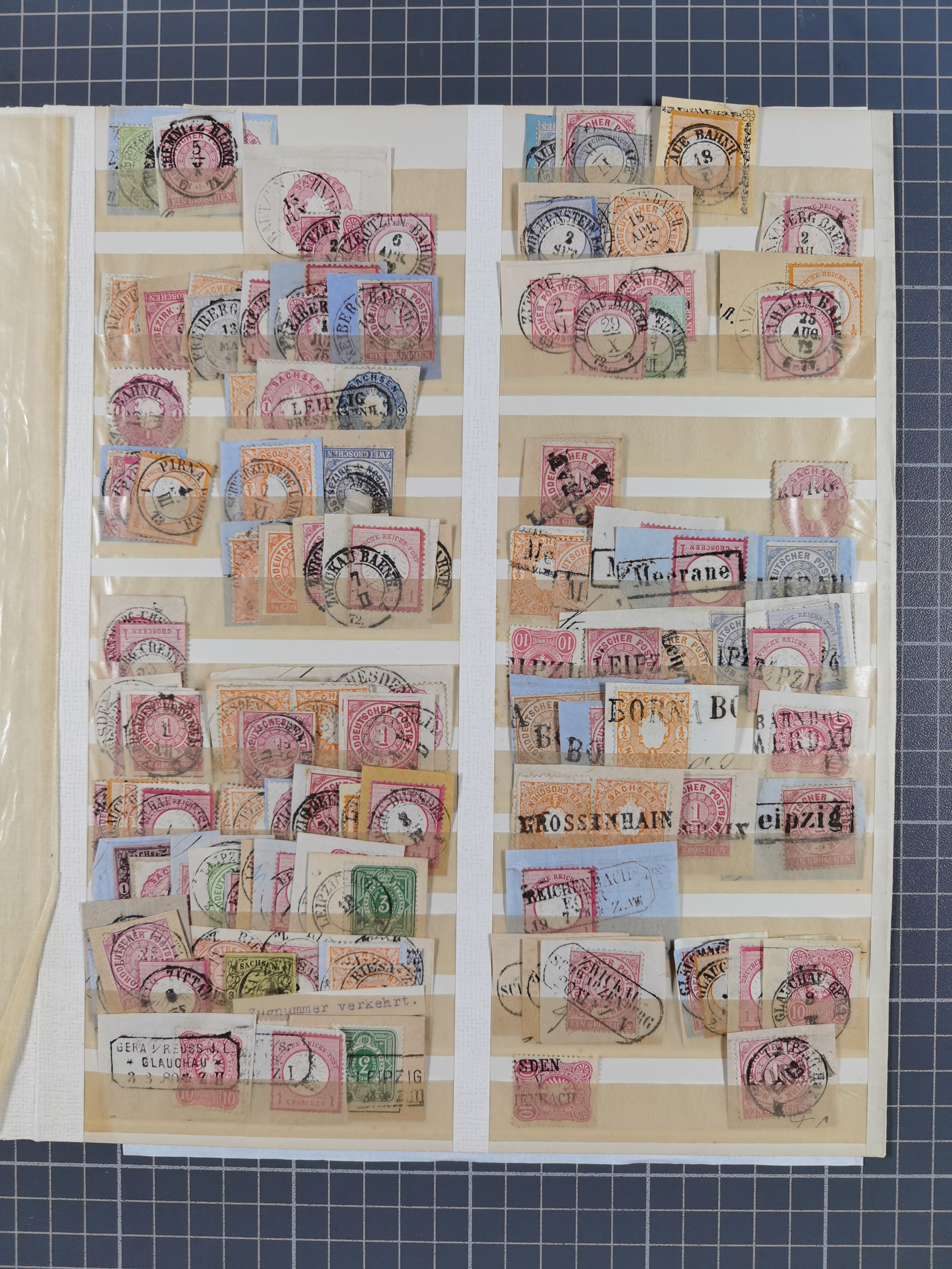 ANNABERG bis ZWICKAU, Sammlung der Nummern- und Ortsstempel, nachverwendet auf über 500 Marken und Briefstücken NDP und Dt. Reich, meist sehr schöne Abschläge, eng gesteckt auf Steckseiten.