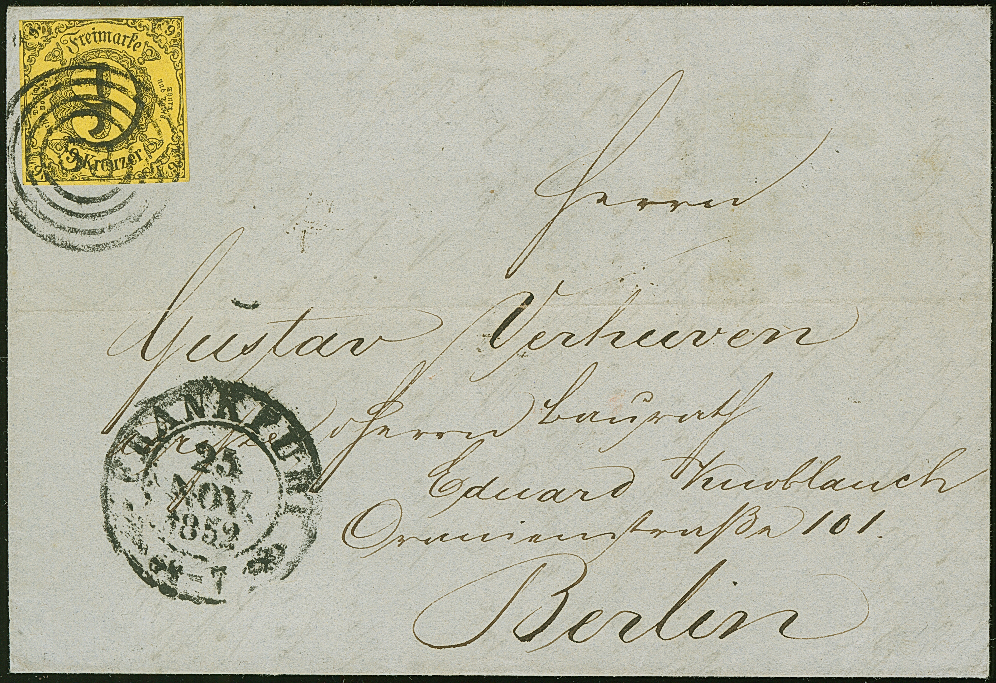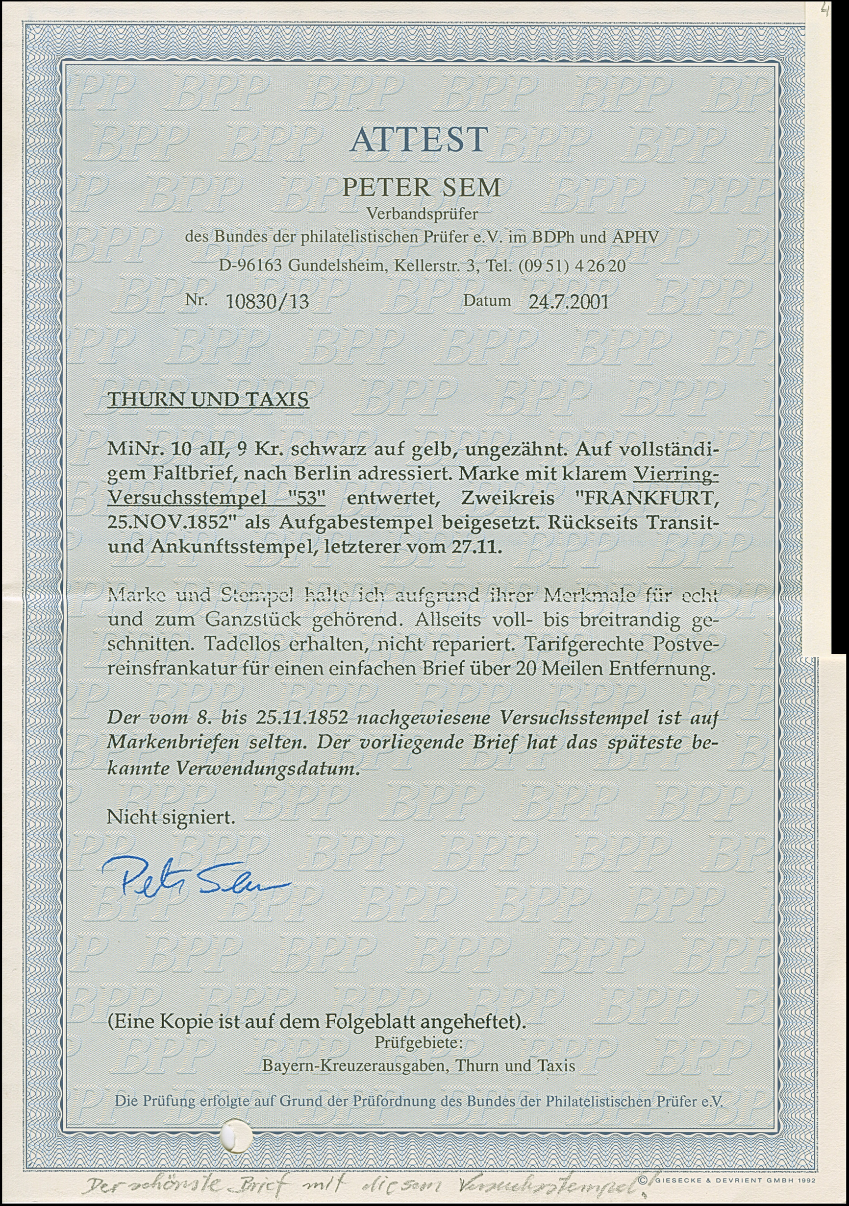 "53", der Versuchsstempel von Frankfurt am Main, sauber und gut lesbar abgeschlagen auf 9 Kr. auf gelb, farbfrisch und voll- bis breitrandig, auf komplettem Faltbrief mit nebengesetztem DKr. "FRANKFURT 25 NOV. 1852", nach Berlin. Zweifellos einer der schönsten der wenigen registrierten Briefe mit dem Versuchsstempel und der einzige bei PROFI registrierte mit der 9 Kreuzer. Fotoattest Sem BPP (2001)