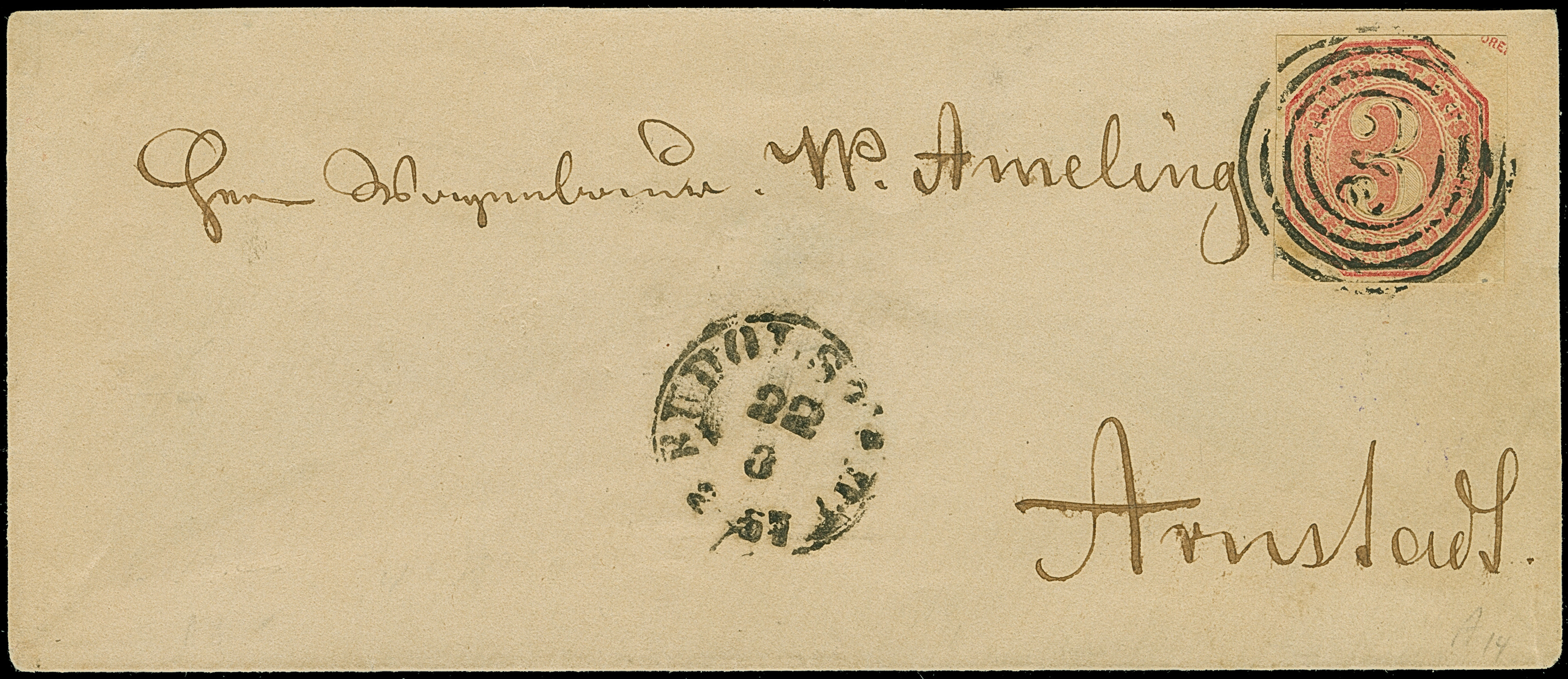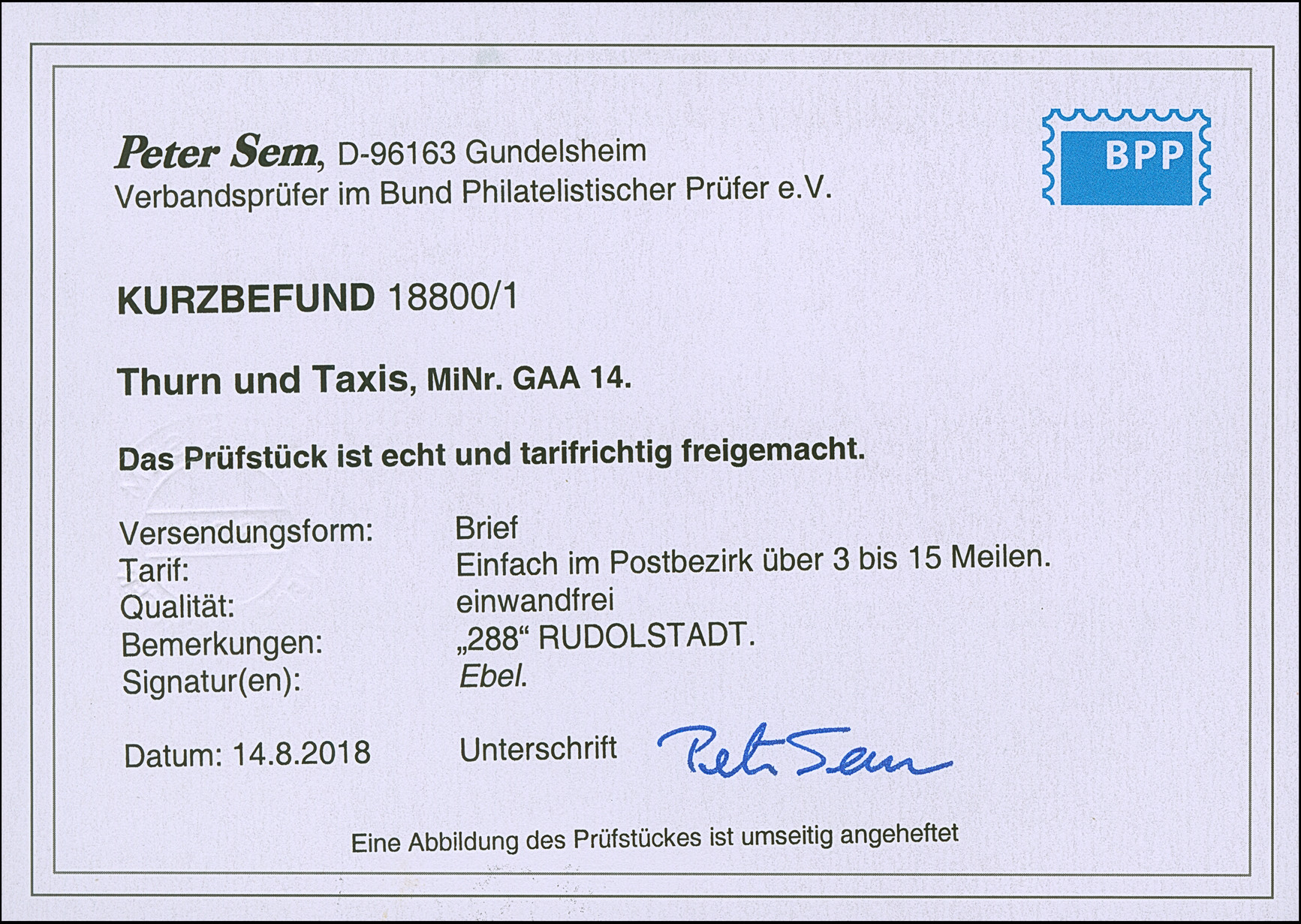 Ganzsachen-Ausschnitt 3 Kr. rosa, vollrandig viereckig geschnitten, mit Nr. “288” auf kleinem Briefkuvert von Rudolstadt nach Arnstadt. Kurzbefund Sem BPP