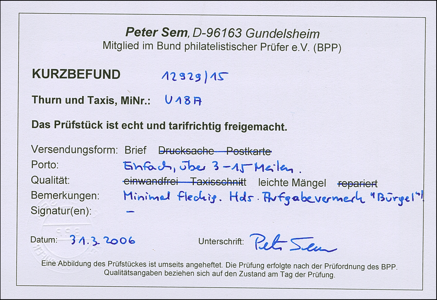 9 Kr. gelb im waagerechten Paar, Type II, farbfrisch, unten links gering berührt, sonst voll- bis überrandig, rechts mit kleinem Teil der Nebenmarke und unten mit ca. 11 mm Bogenrand, ungebraucht mit praktisch vollständigem, frischem Originalgummi (im oberen Bereich etwas getönt). Eine der größten Ungebraucht-Seltenheiten von Thurn und Taxis; größte bekannte ungebrauchte Einheit beider Typen dieser Marke, von der PROFI nur ein weiteres Stück (ex Boker) registriert hat.