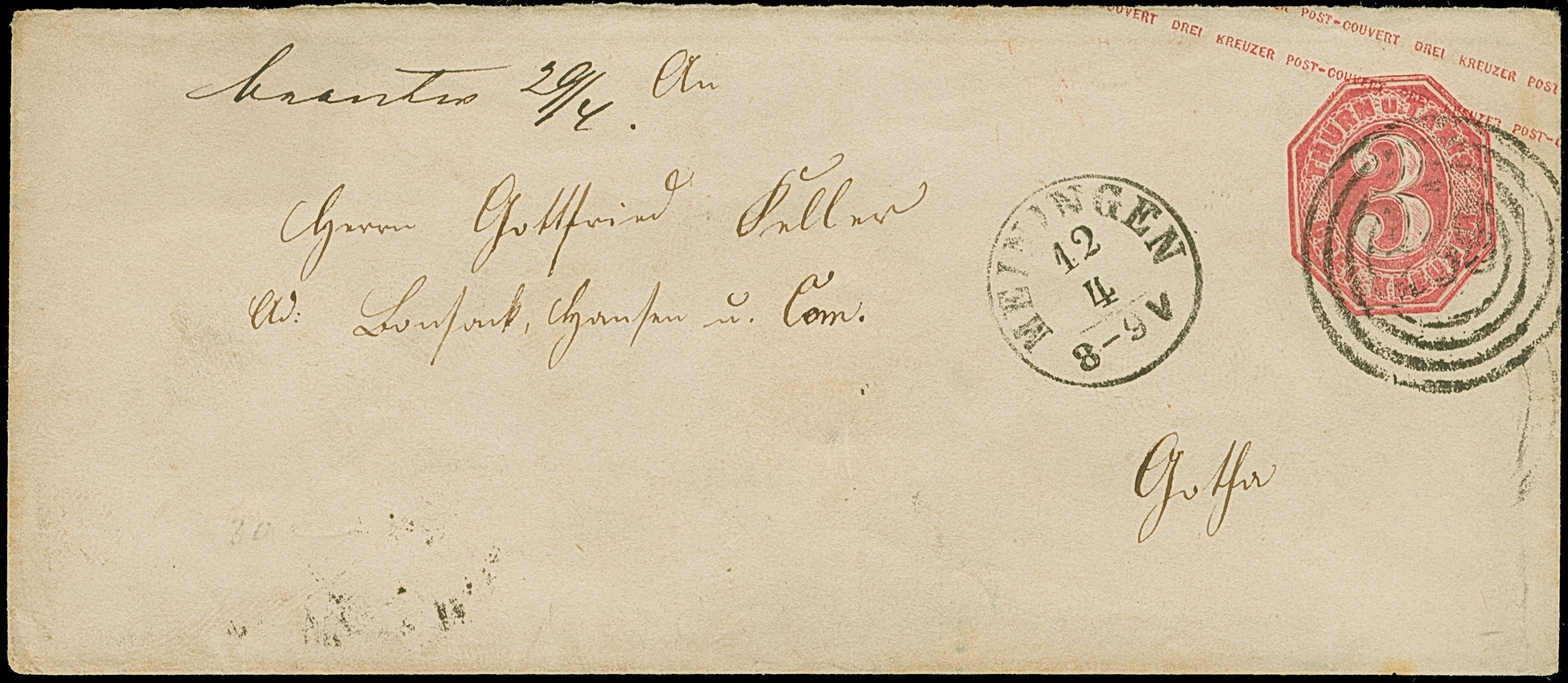 1865, Umschlag 3 Kr. rosa im Damenformat mit leicht aufgesetzter Nr. "258" und sauber nebengesetztem Fingerhutstempel "MEININGEN 12 42" (1867) nach Gotha, selten