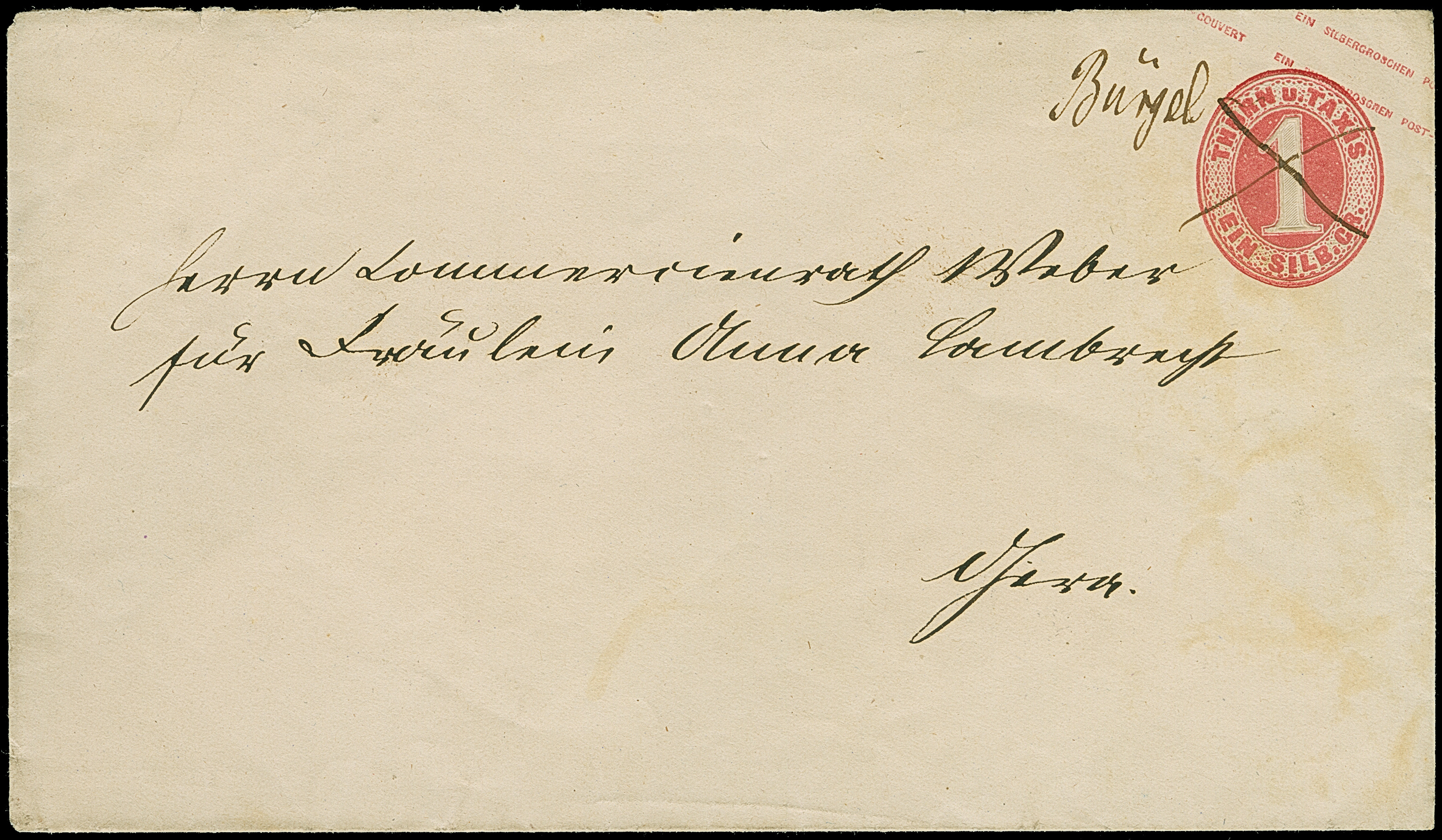 "Bürgel" handschriftlicher Aufgabevermerk auf Ganzsachenumschlag 1 Sgr. mit Federkreuzentwertung, nach Gera, mit Ankunftsstempel.