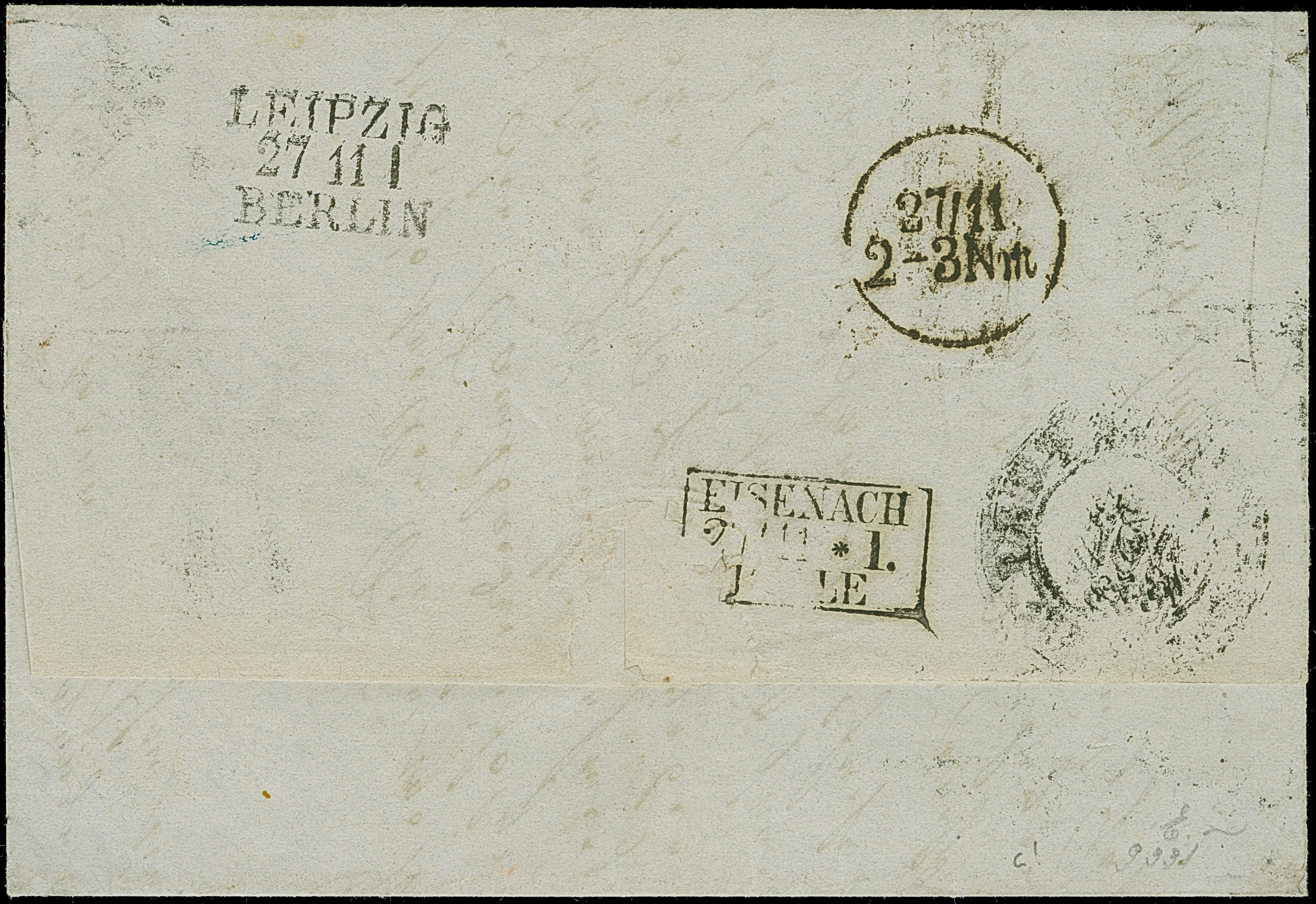 1849, Paketbegleit-Briefhülle mit blauem Hufeisenstempel “FRANKFURT 10 NOV.1849” nach Vaduz im Fürstentum Liechtenstein. Sehr seltene Destination.