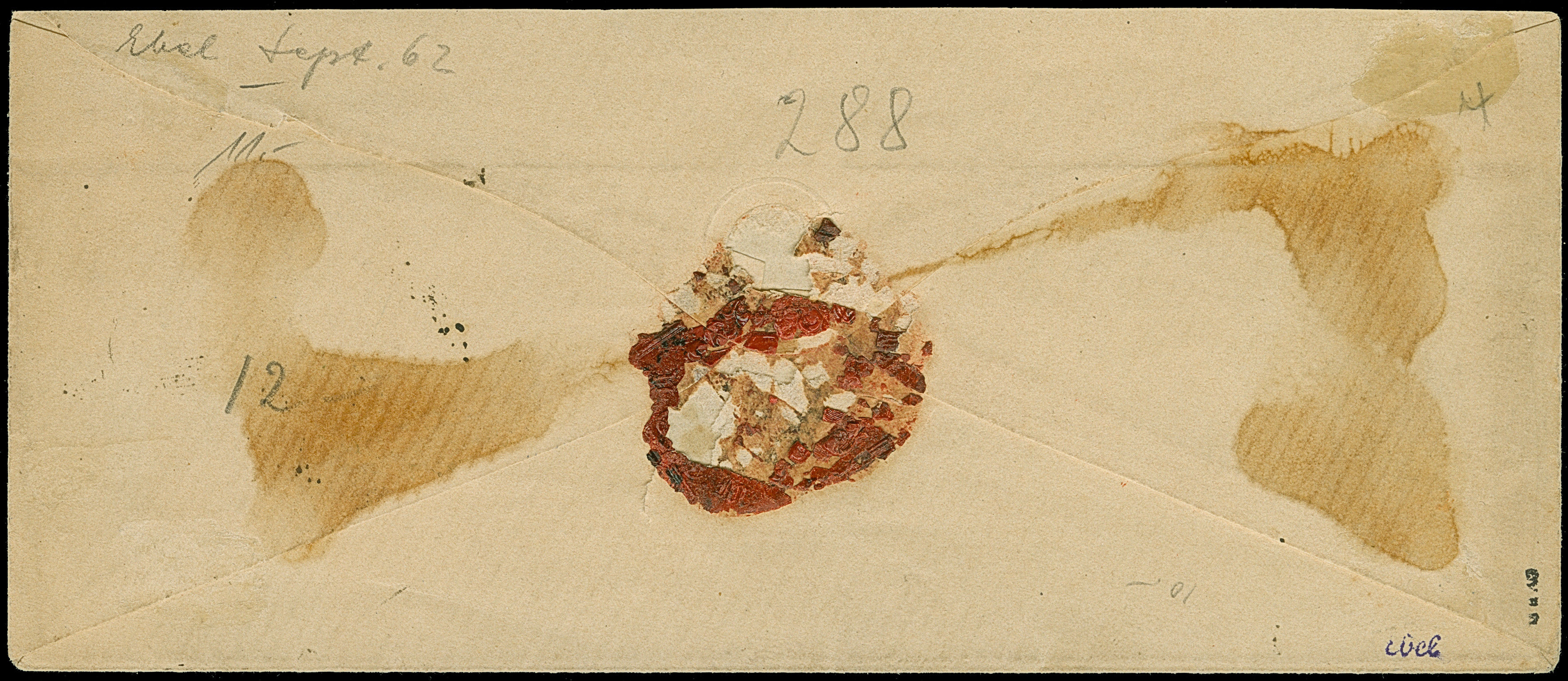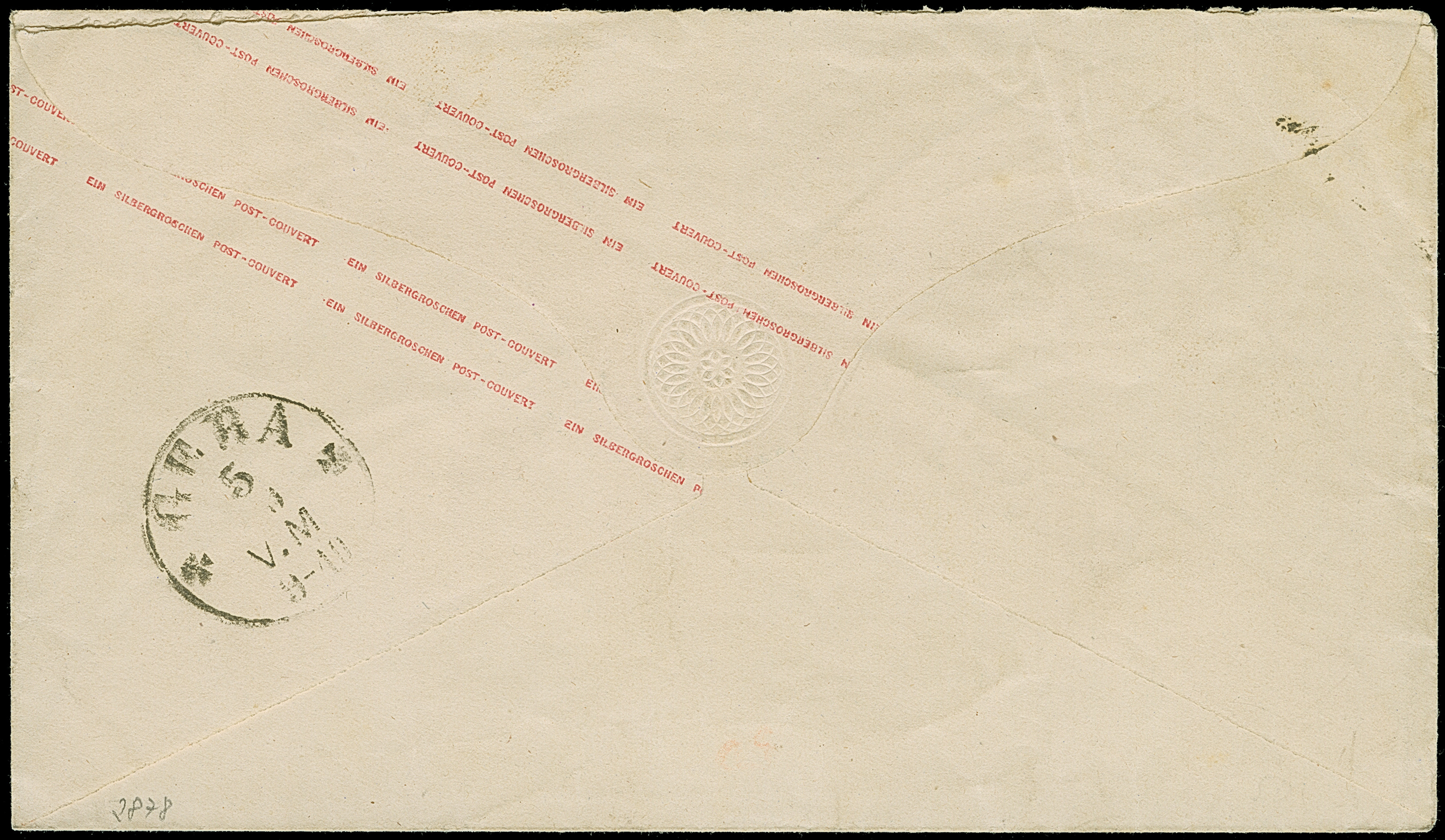 6 Kr. auf lebhaftgraurot und Farbänderung 3 Kr. auf hellgrautürkis, mit jeweils sauber aufgesetzter Nr. "115" und nebengesetztem L2 "JENA 14 APR 1861" auf Briefkuvert an den Schriftsteller und Direktor des St. Petersburger Hoftheaters, Alexander Tollert. Ein attraktiver und interessanter Brief nach Russland.