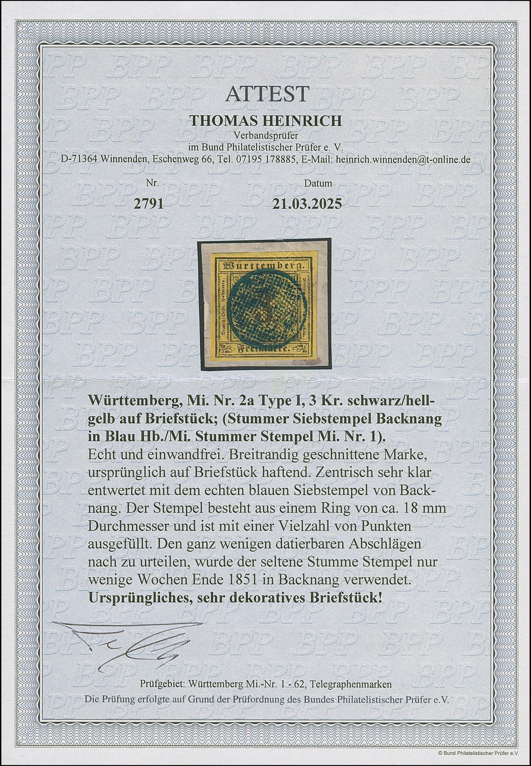 BACKNANG, der stumme Siebstempel, zentrisch und klar abgeschlagen auf 3 Kr. auf gelb, allseits breitrandig, auf kleine Briefstück. Ein schönes und tadellose Stück des seltenen Stempels. Fotoattest Heinrich BPP (2025)