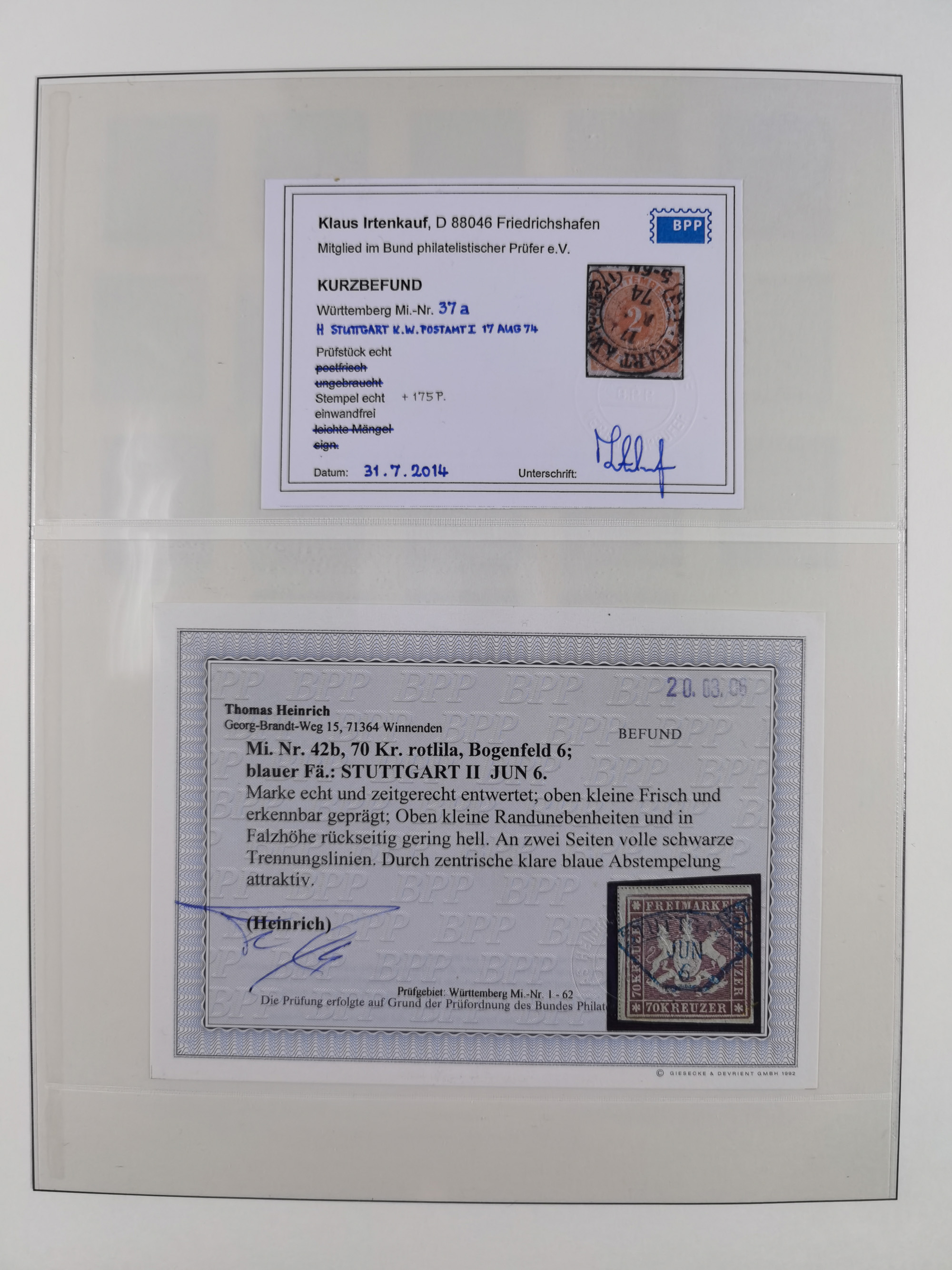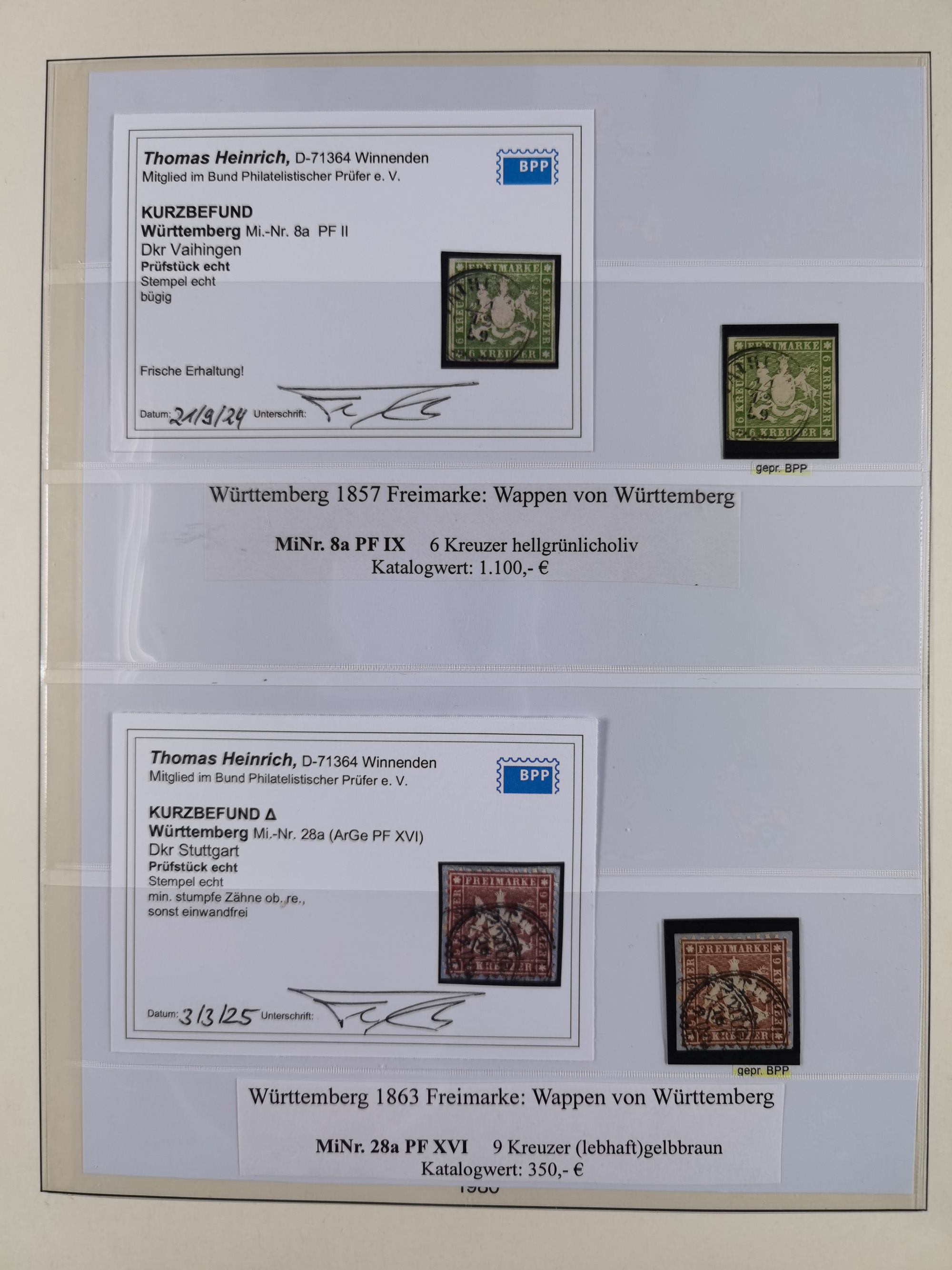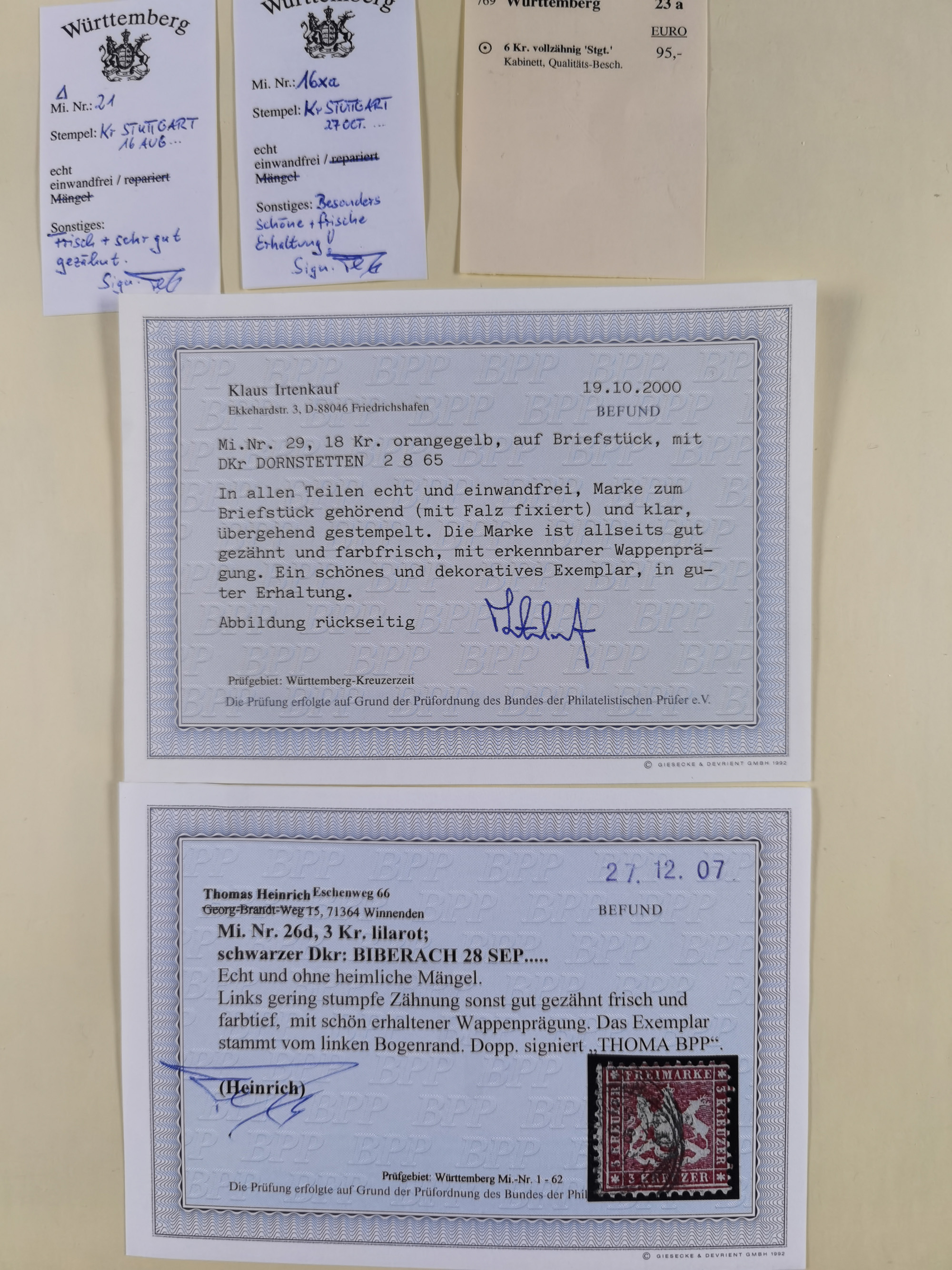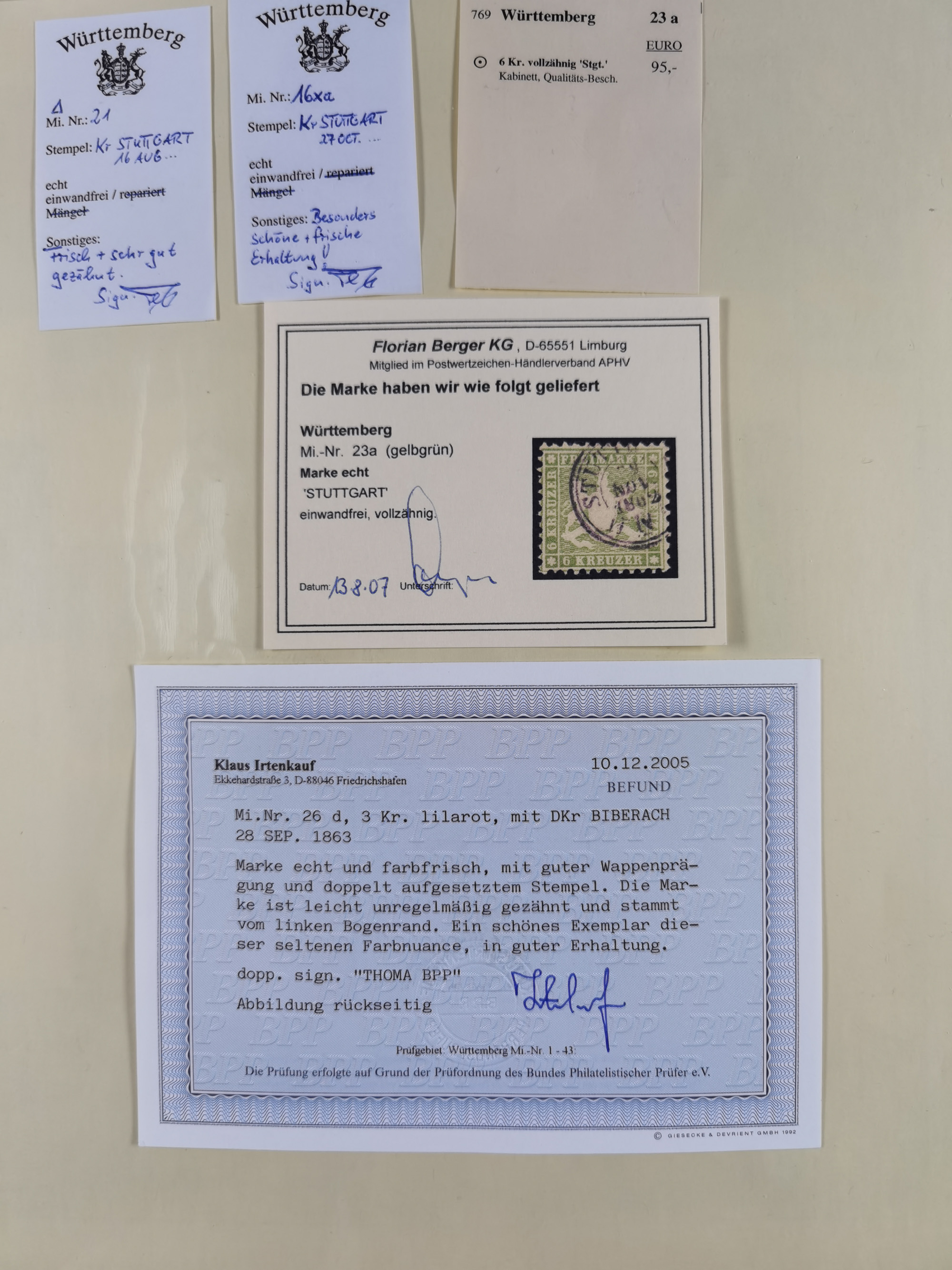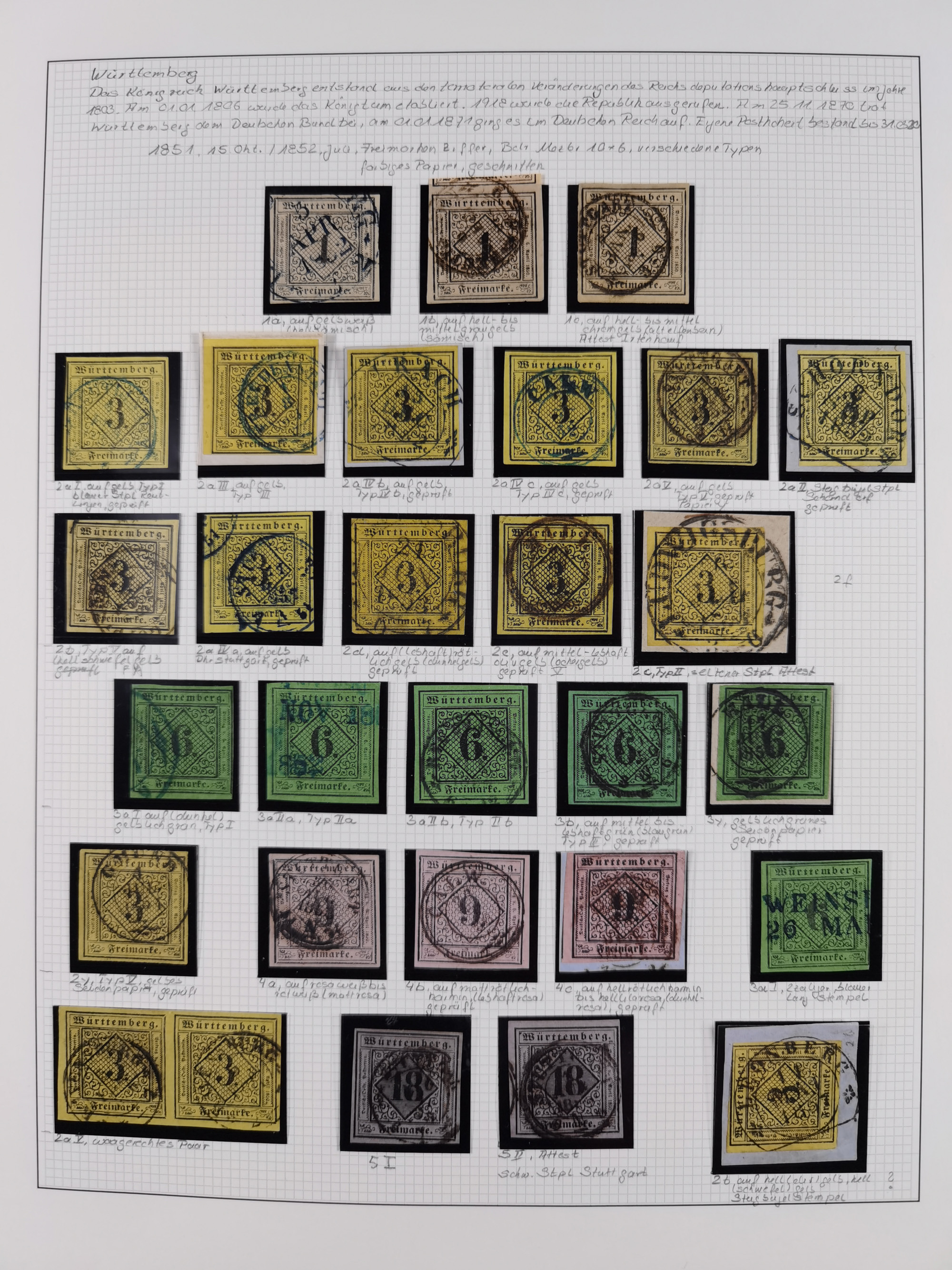 1851/1923, umfangreiche gestempelte Sammlung mit fast allen besseren Marken, vielen Farben und Besonderheiten. Dabei u.a. Mi.-Nr. Nr. 1c auf Briefstück (doppelt sign. Heinrich BPP), Mi.-Nr. 5I (FA Thoma BPP), Mi.-Nr. 5II (FA Heinrich BPP), Mi.-Nr. 9b (FA Irtenkauf BPP), Mi.-Nr. 10a auf Briefstück (FA Heinrich BPP), Mi.-Nr. 14b (FA Irtenkauf BPP), Mi.-Nr. 15 (FA Irtenkauf BPP), Mi.-Nr. 19xb (FA Irtenkauf BPP), Mi-Nr. 24 (FA Irtenkauf BPP), Mi.-Nr. 31c (FA Irtenkauf BPP), Mi.-Nr. 42b mit glasklarem EKr. “LUDWIGSBURG” (sign. Pfenninger mit FA), Mi.-Nr. 188 (FA Winkler BPP), Mi.-Nr. 211 (FA Thoma BPP), Mi.-Nr. 231aa (FA Winkler BPP) und Mi.-Nr. 264d (FA Winkler BPP). Fast durchgehend in guter Erhaltung mit ausgesucht schönen Stempeln, bessere Marken alle signiert bzw. mit KB, FB und Fotoattesten. Eine besonders empfehlenswerte Sammlung