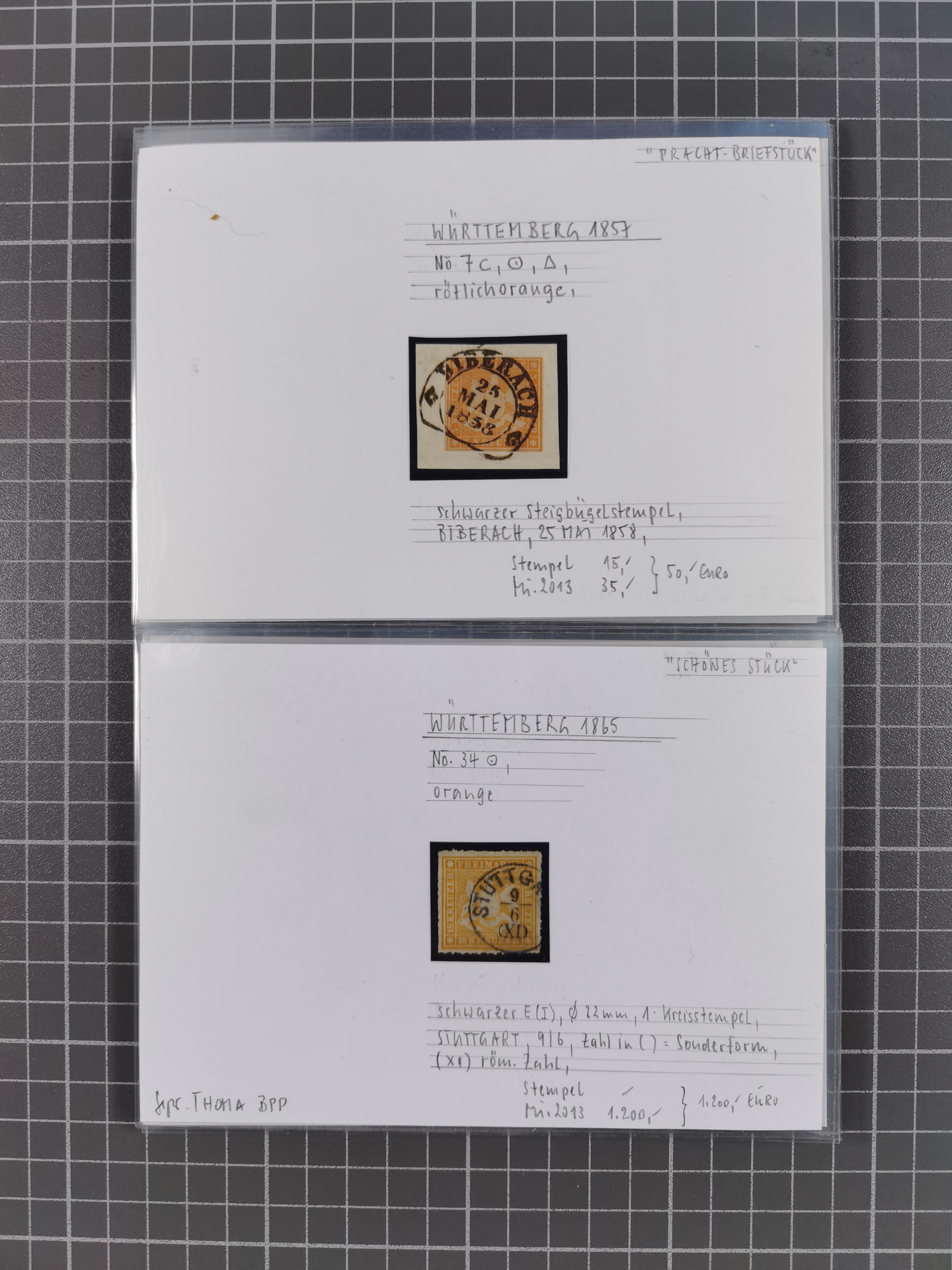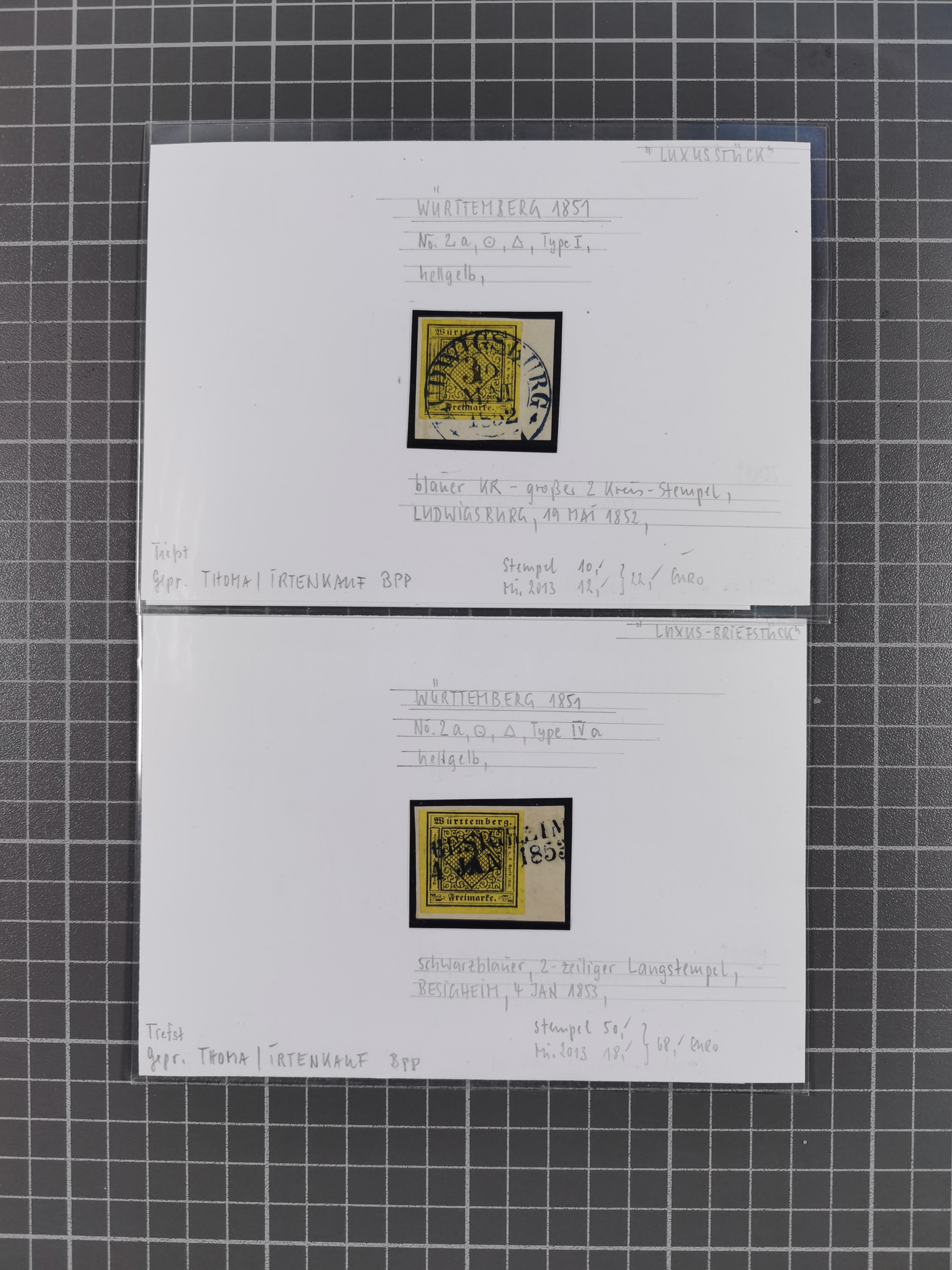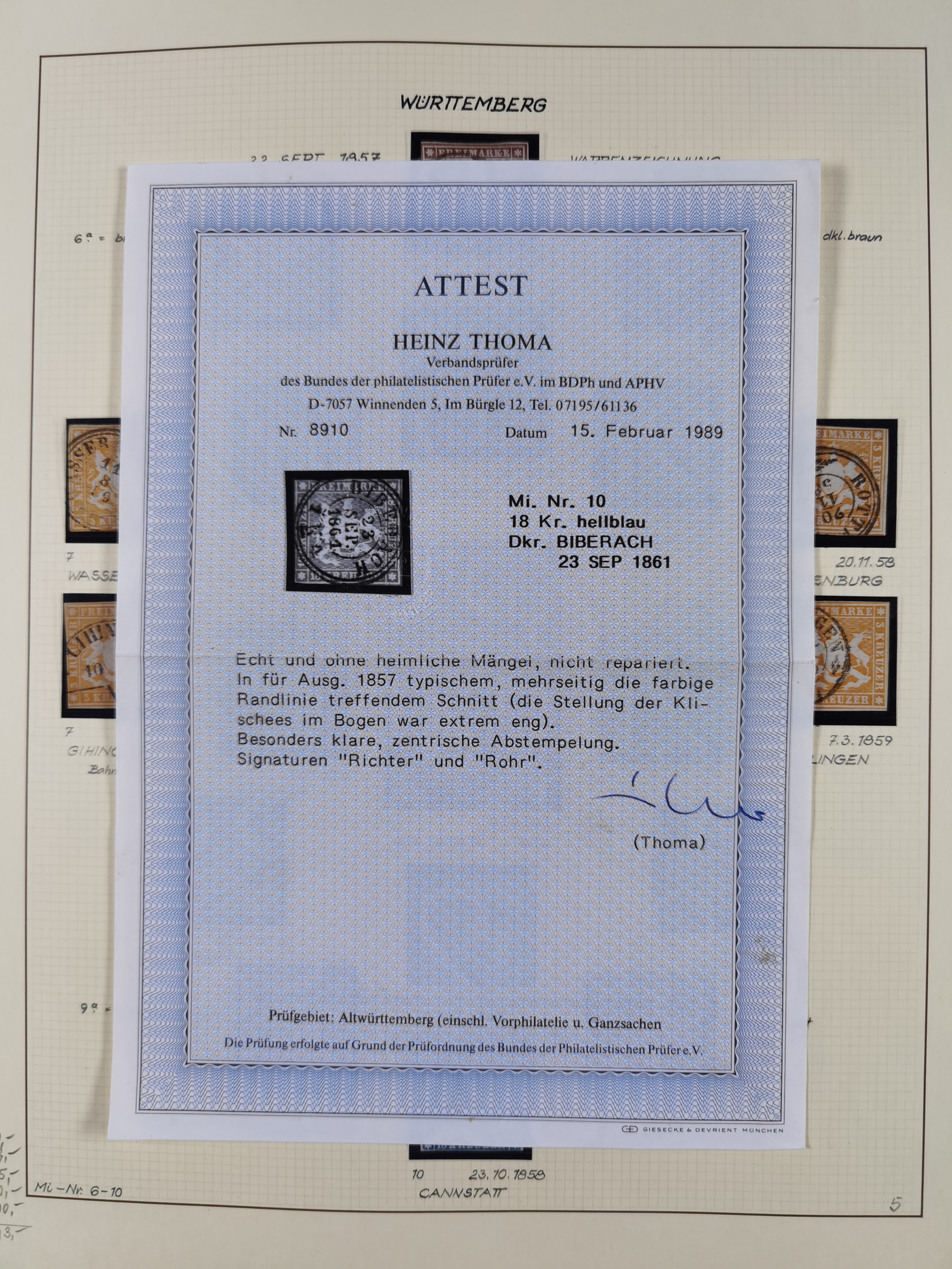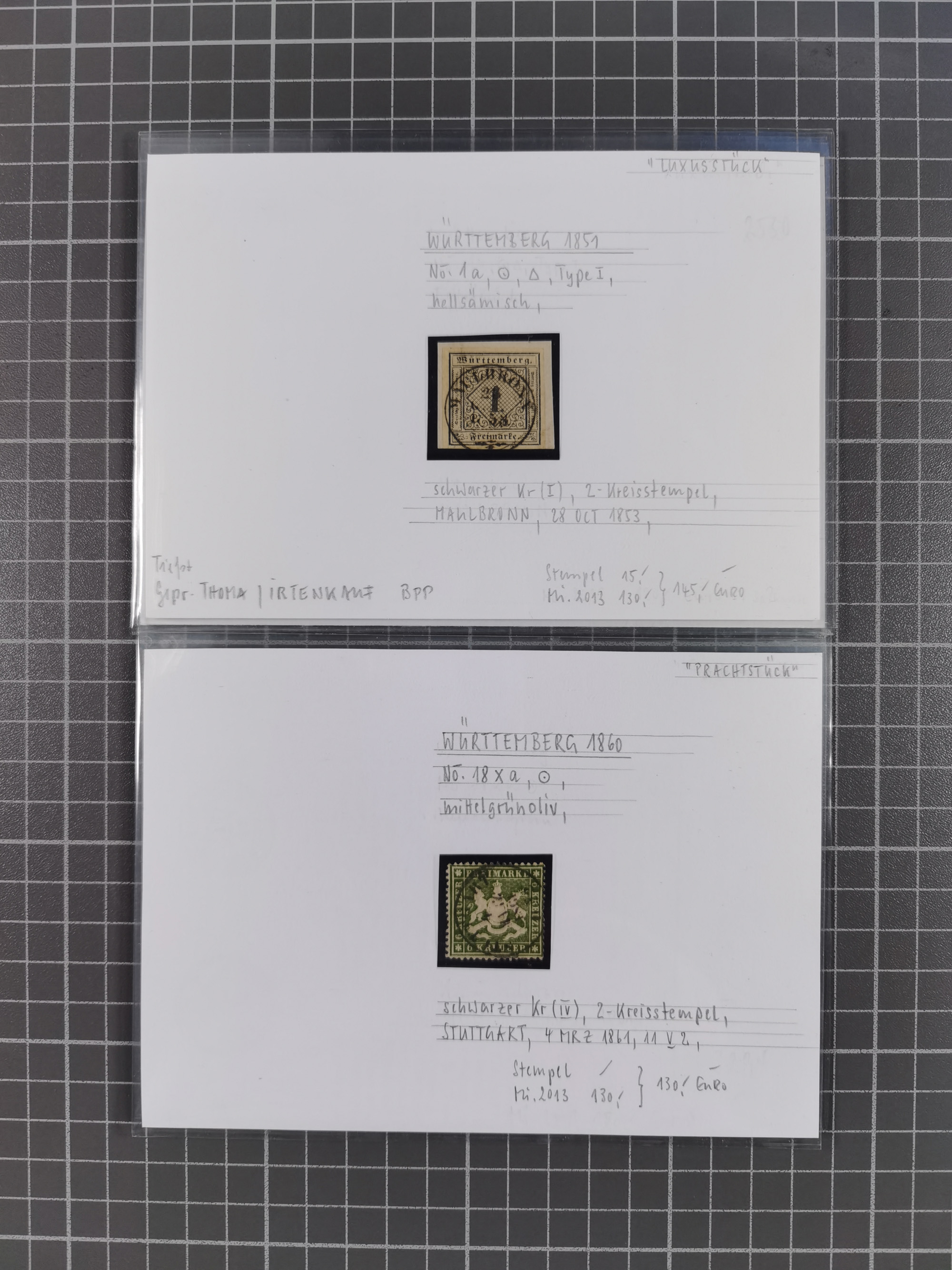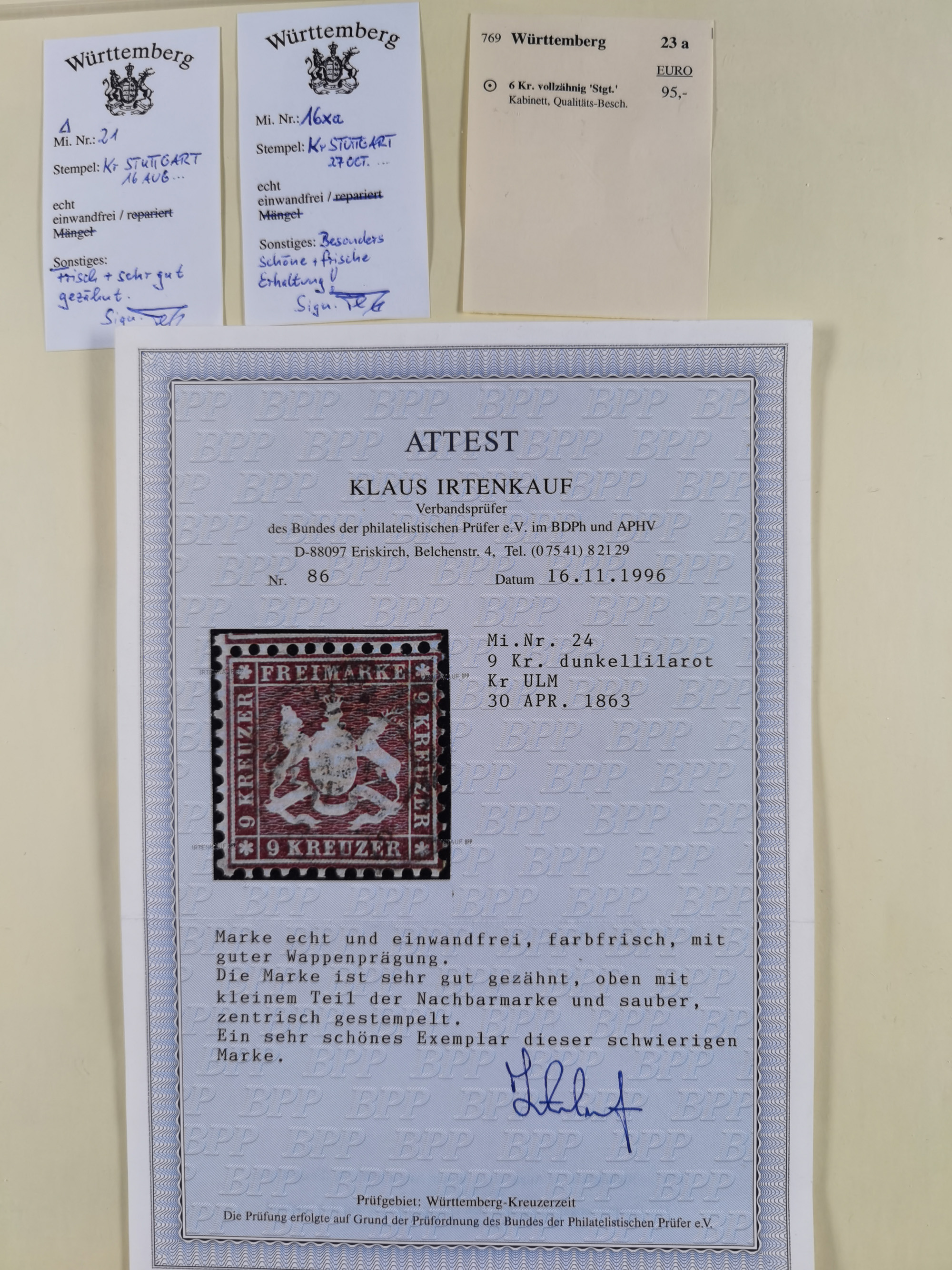 1851/1923, umfangreiche gestempelte Sammlung mit fast allen besseren Marken, vielen Farben und Besonderheiten. Dabei u.a. Mi.-Nr. Nr. 1c auf Briefstück (doppelt sign. Heinrich BPP), Mi.-Nr. 5I (FA Thoma BPP), Mi.-Nr. 5II (FA Heinrich BPP), Mi.-Nr. 9b (FA Irtenkauf BPP), Mi.-Nr. 10a auf Briefstück (FA Heinrich BPP), Mi.-Nr. 14b (FA Irtenkauf BPP), Mi.-Nr. 15 (FA Irtenkauf BPP), Mi.-Nr. 19xb (FA Irtenkauf BPP), Mi-Nr. 24 (FA Irtenkauf BPP), Mi.-Nr. 31c (FA Irtenkauf BPP), Mi.-Nr. 42b mit glasklarem EKr. “LUDWIGSBURG” (sign. Pfenninger mit FA), Mi.-Nr. 188 (FA Winkler BPP), Mi.-Nr. 211 (FA Thoma BPP), Mi.-Nr. 231aa (FA Winkler BPP) und Mi.-Nr. 264d (FA Winkler BPP). Fast durchgehend in guter Erhaltung mit ausgesucht schönen Stempeln, bessere Marken alle signiert bzw. mit KB, FB und Fotoattesten. Eine besonders empfehlenswerte Sammlung