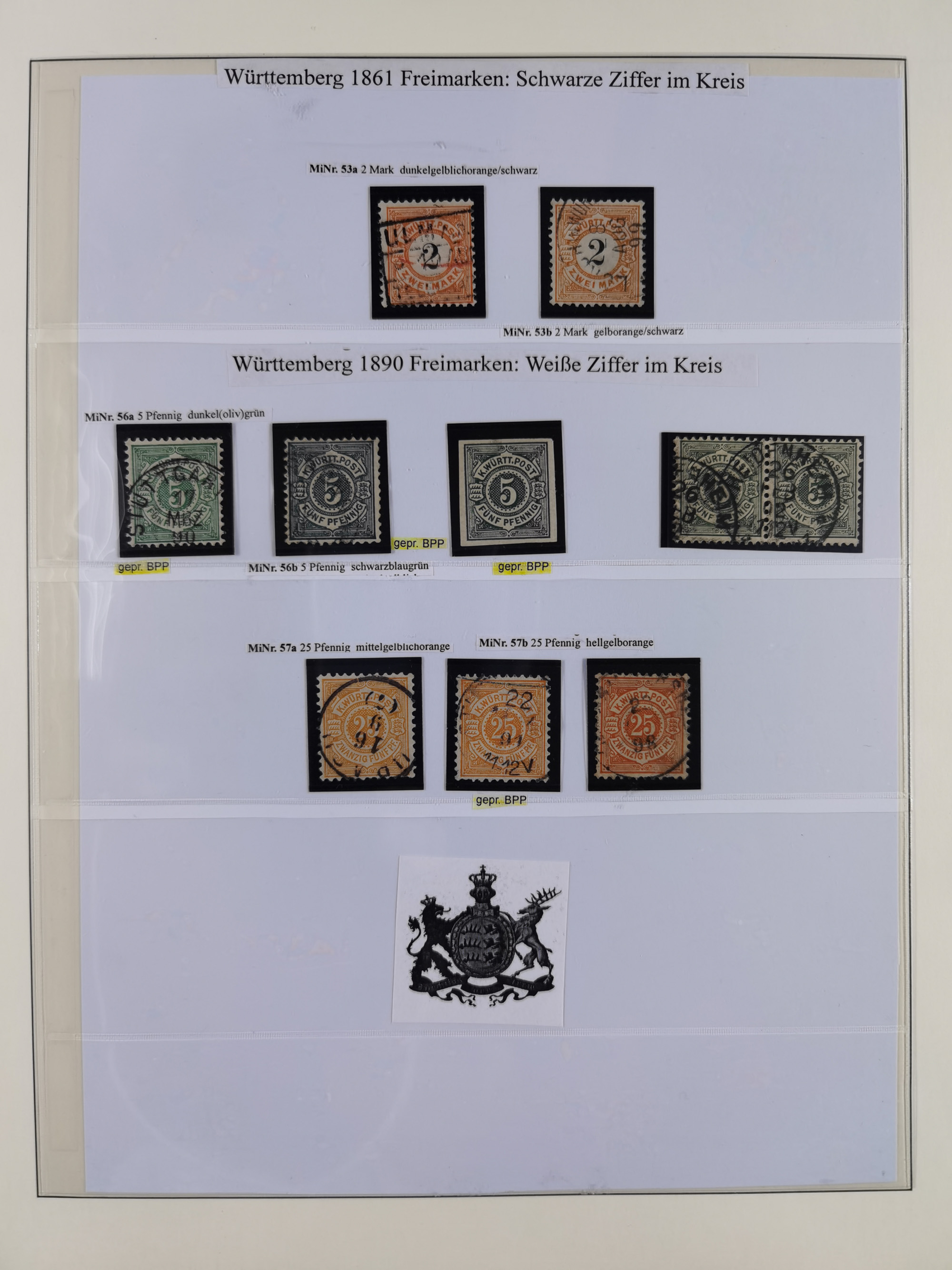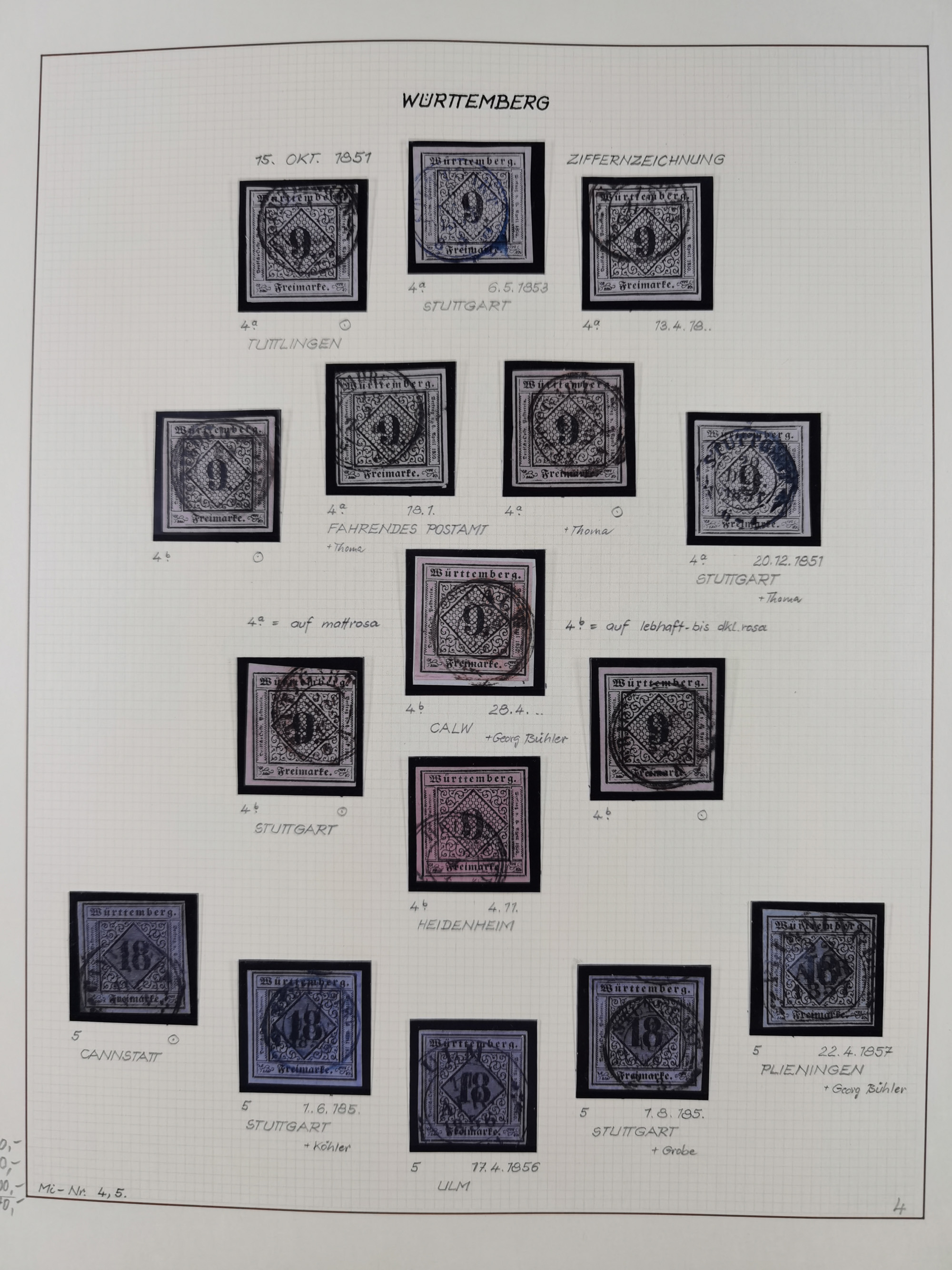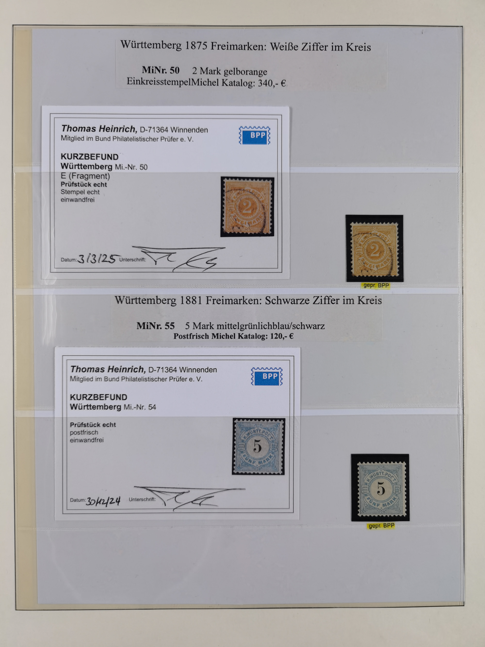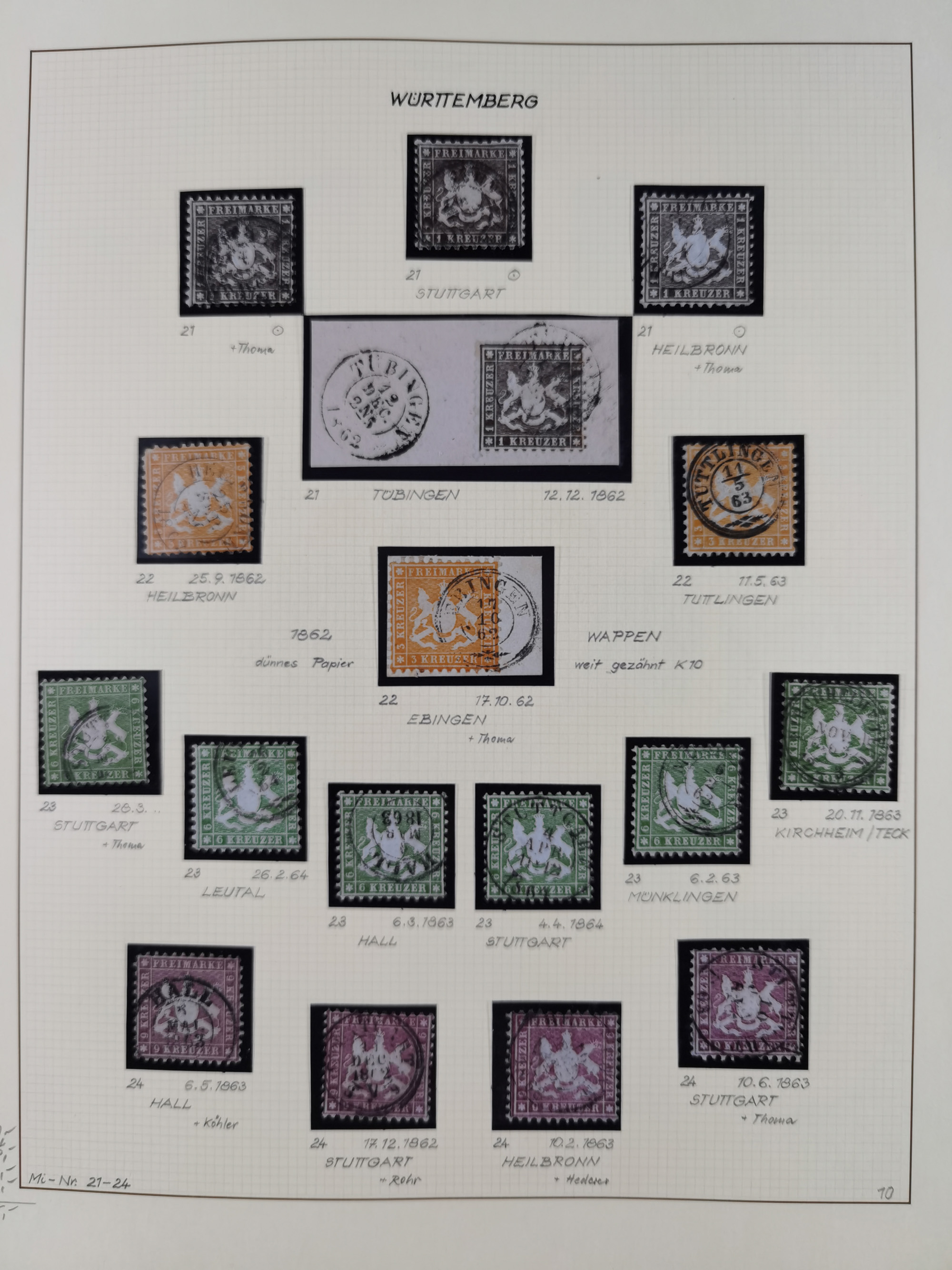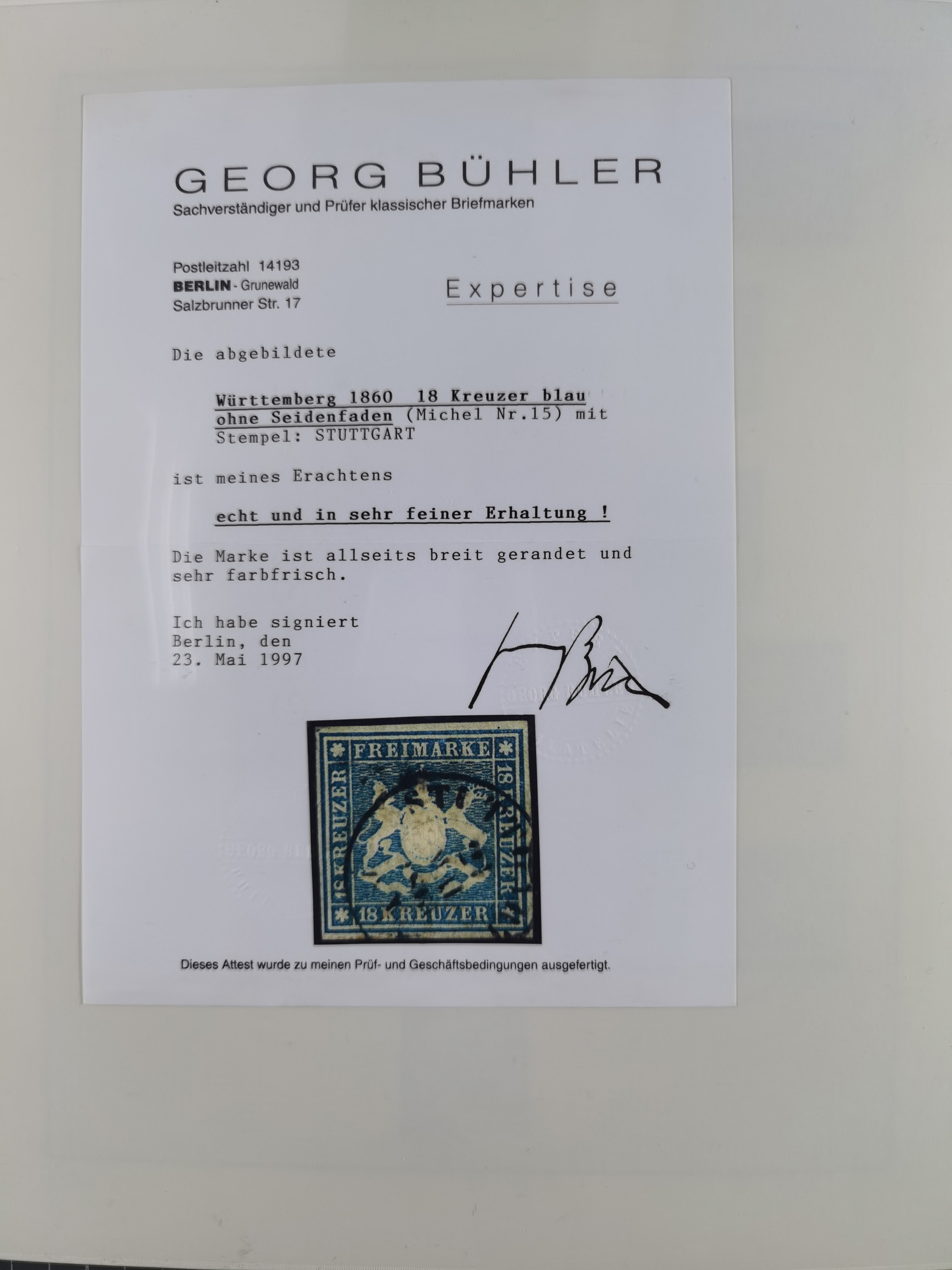 1851/1923, umfangreiche gestempelte Sammlung mit fast allen besseren Marken, vielen Farben und Besonderheiten. Dabei u.a. Mi.-Nr. Nr. 1c auf Briefstück (doppelt sign. Heinrich BPP), Mi.-Nr. 5I (FA Thoma BPP), Mi.-Nr. 5II (FA Heinrich BPP), Mi.-Nr. 9b (FA Irtenkauf BPP), Mi.-Nr. 10a auf Briefstück (FA Heinrich BPP), Mi.-Nr. 14b (FA Irtenkauf BPP), Mi.-Nr. 15 (FA Irtenkauf BPP), Mi.-Nr. 19xb (FA Irtenkauf BPP), Mi-Nr. 24 (FA Irtenkauf BPP), Mi.-Nr. 31c (FA Irtenkauf BPP), Mi.-Nr. 42b mit glasklarem EKr. “LUDWIGSBURG” (sign. Pfenninger mit FA), Mi.-Nr. 188 (FA Winkler BPP), Mi.-Nr. 211 (FA Thoma BPP), Mi.-Nr. 231aa (FA Winkler BPP) und Mi.-Nr. 264d (FA Winkler BPP). Fast durchgehend in guter Erhaltung mit ausgesucht schönen Stempeln, bessere Marken alle signiert bzw. mit KB, FB und Fotoattesten. Eine besonders empfehlenswerte Sammlung