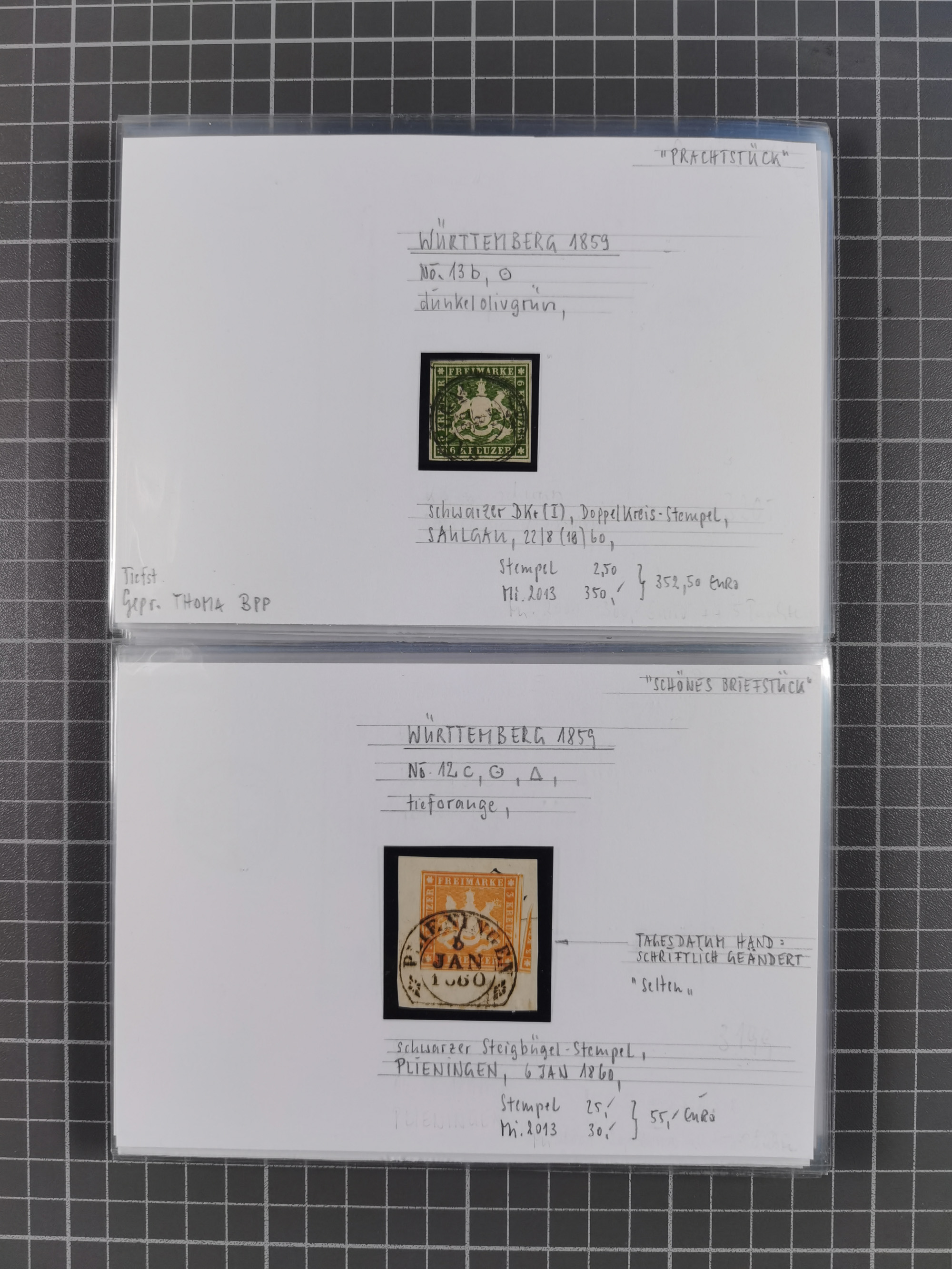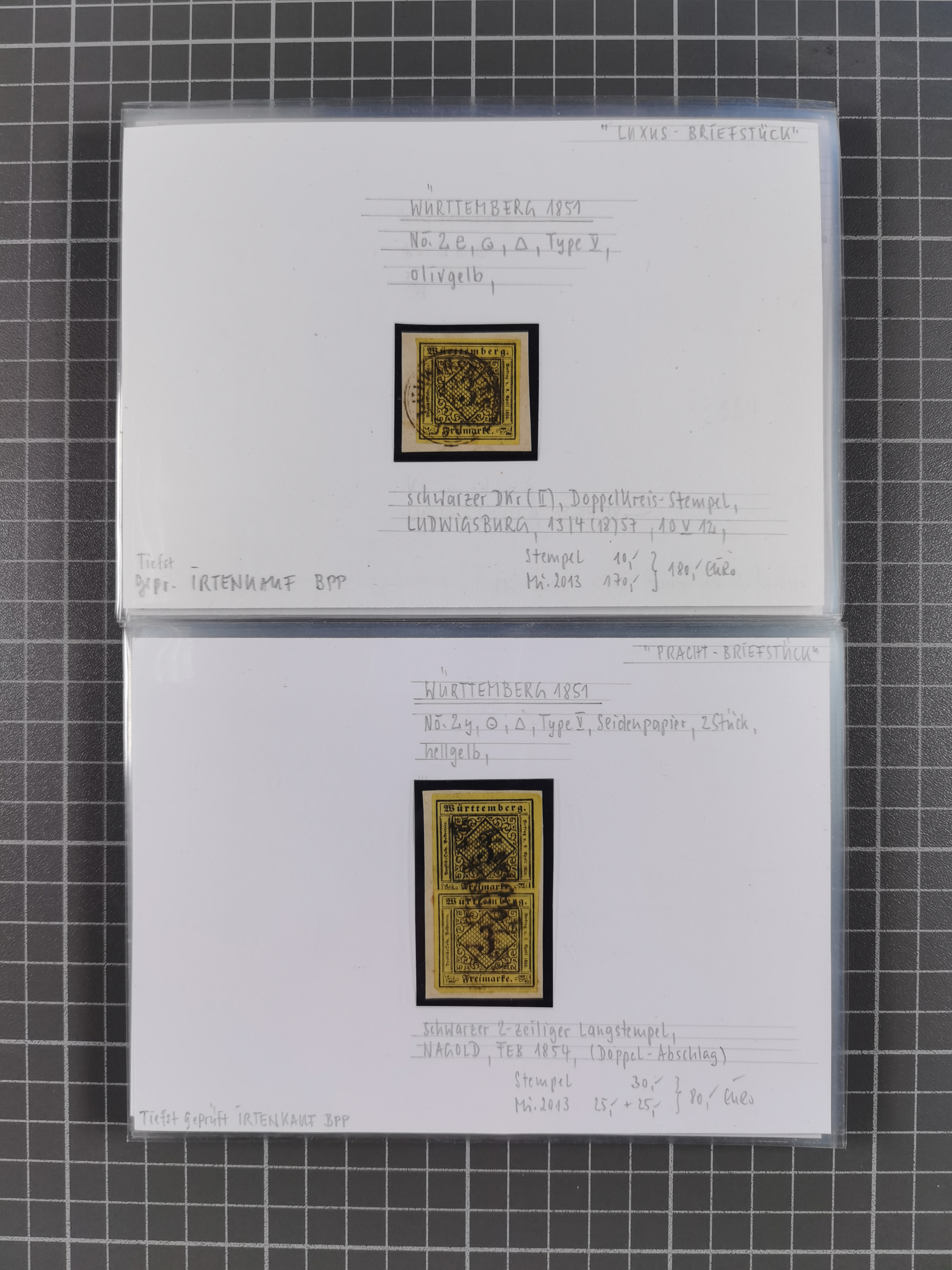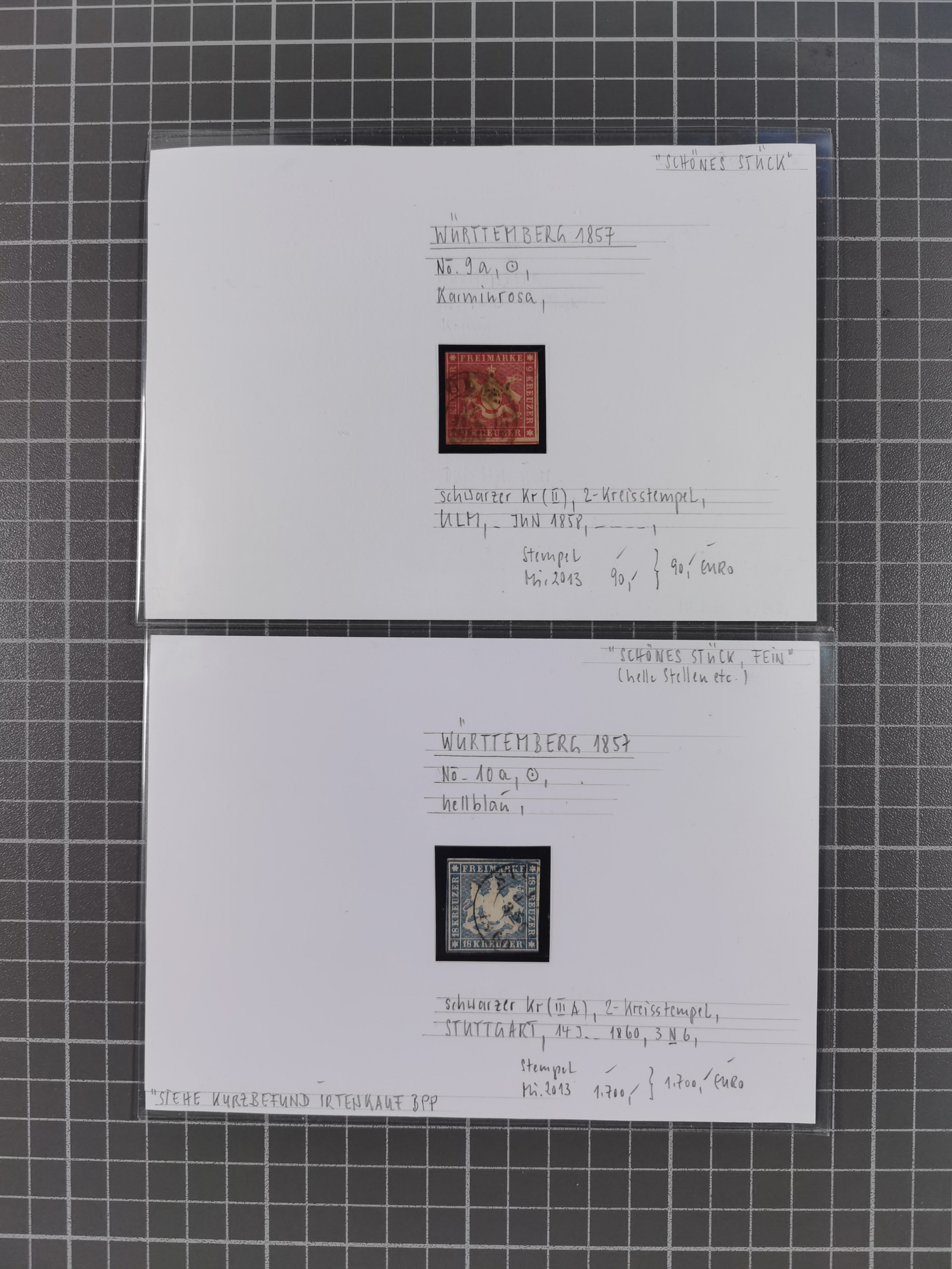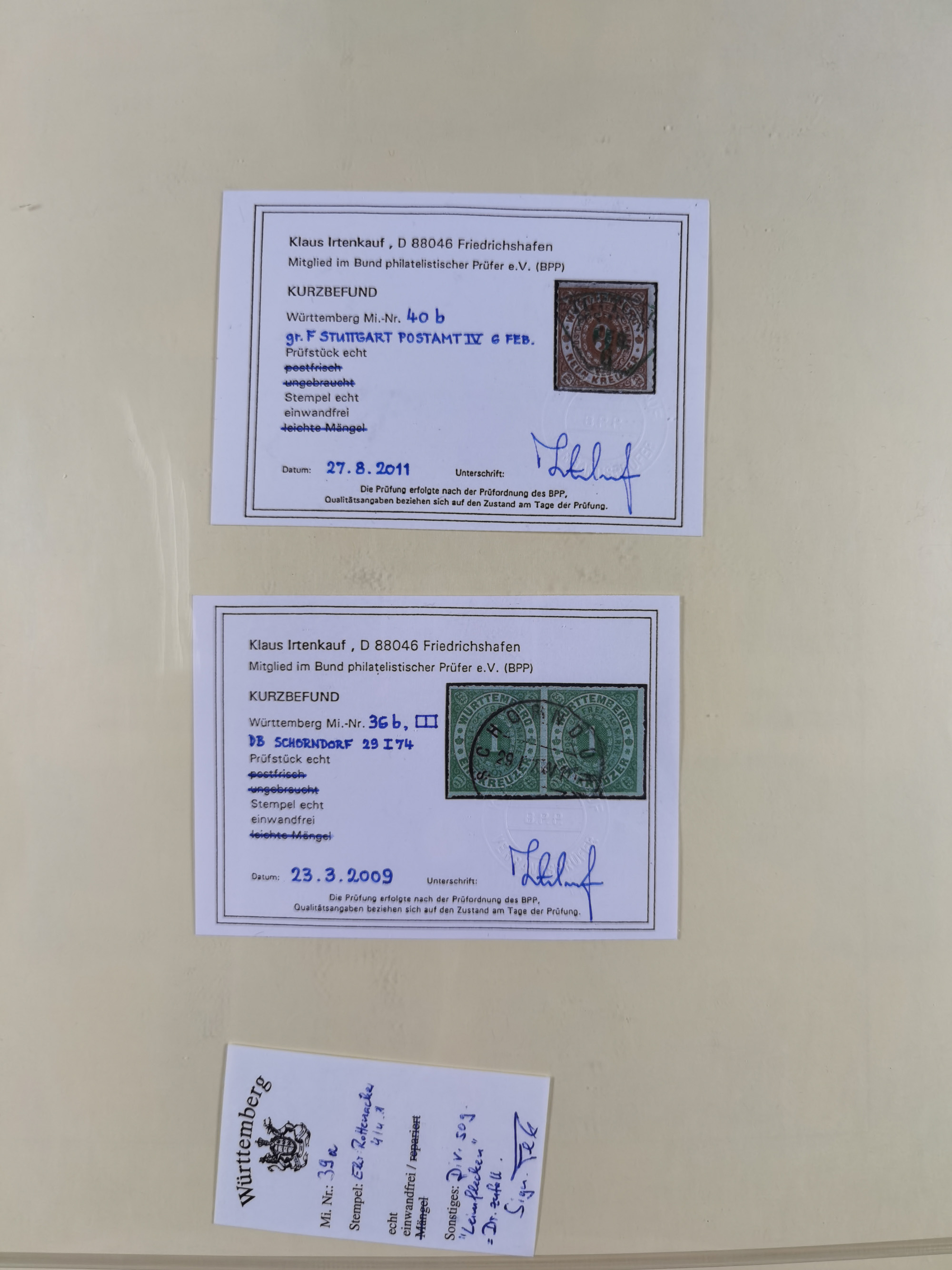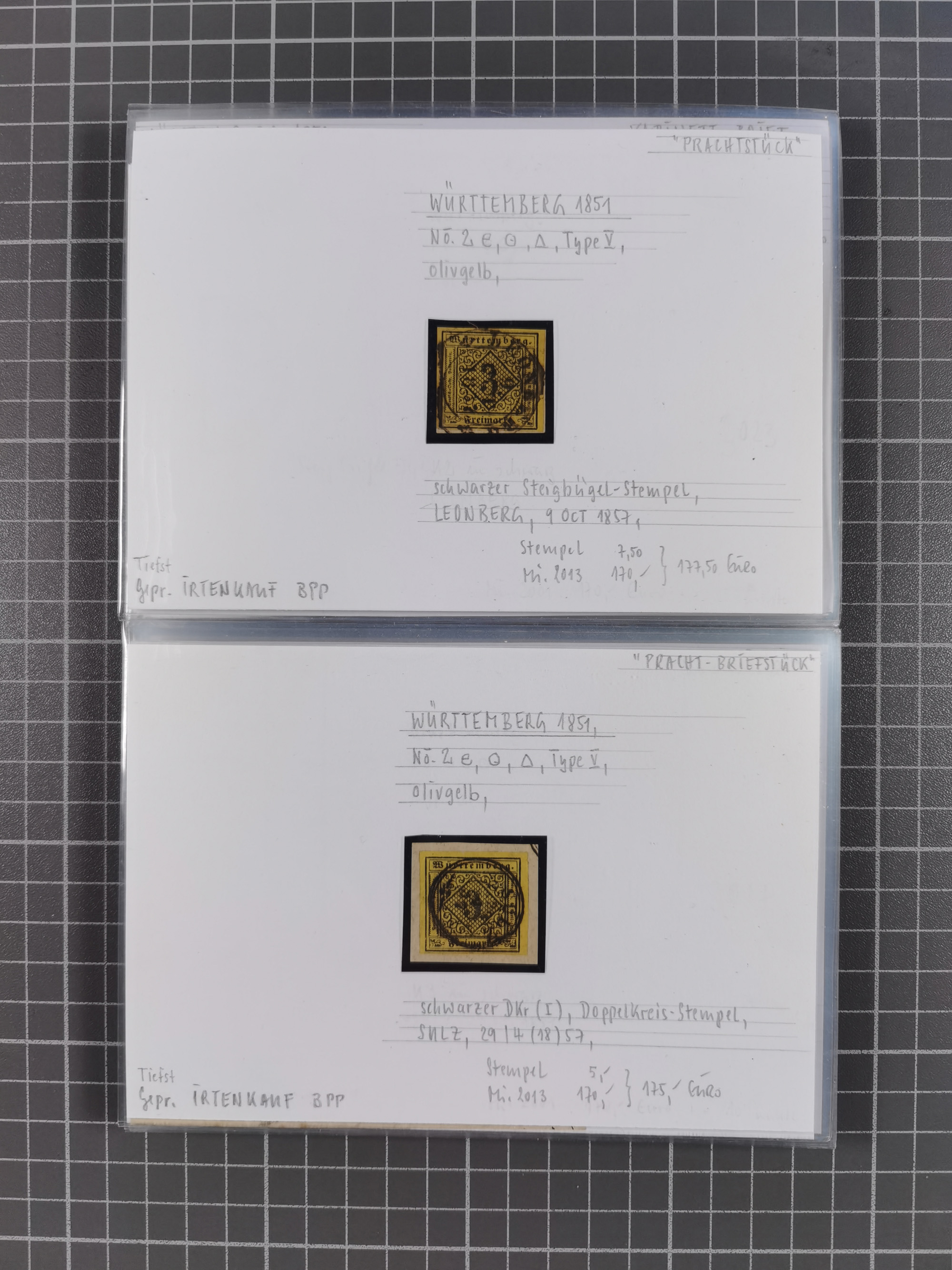 1851/1923, umfangreiche gestempelte Sammlung mit fast allen besseren Marken, vielen Farben und Besonderheiten. Dabei u.a. Mi.-Nr. Nr. 1c auf Briefstück (doppelt sign. Heinrich BPP), Mi.-Nr. 5I (FA Thoma BPP), Mi.-Nr. 5II (FA Heinrich BPP), Mi.-Nr. 9b (FA Irtenkauf BPP), Mi.-Nr. 10a auf Briefstück (FA Heinrich BPP), Mi.-Nr. 14b (FA Irtenkauf BPP), Mi.-Nr. 15 (FA Irtenkauf BPP), Mi.-Nr. 19xb (FA Irtenkauf BPP), Mi-Nr. 24 (FA Irtenkauf BPP), Mi.-Nr. 31c (FA Irtenkauf BPP), Mi.-Nr. 42b mit glasklarem EKr. “LUDWIGSBURG” (sign. Pfenninger mit FA), Mi.-Nr. 188 (FA Winkler BPP), Mi.-Nr. 211 (FA Thoma BPP), Mi.-Nr. 231aa (FA Winkler BPP) und Mi.-Nr. 264d (FA Winkler BPP). Fast durchgehend in guter Erhaltung mit ausgesucht schönen Stempeln, bessere Marken alle signiert bzw. mit KB, FB und Fotoattesten. Eine besonders empfehlenswerte Sammlung