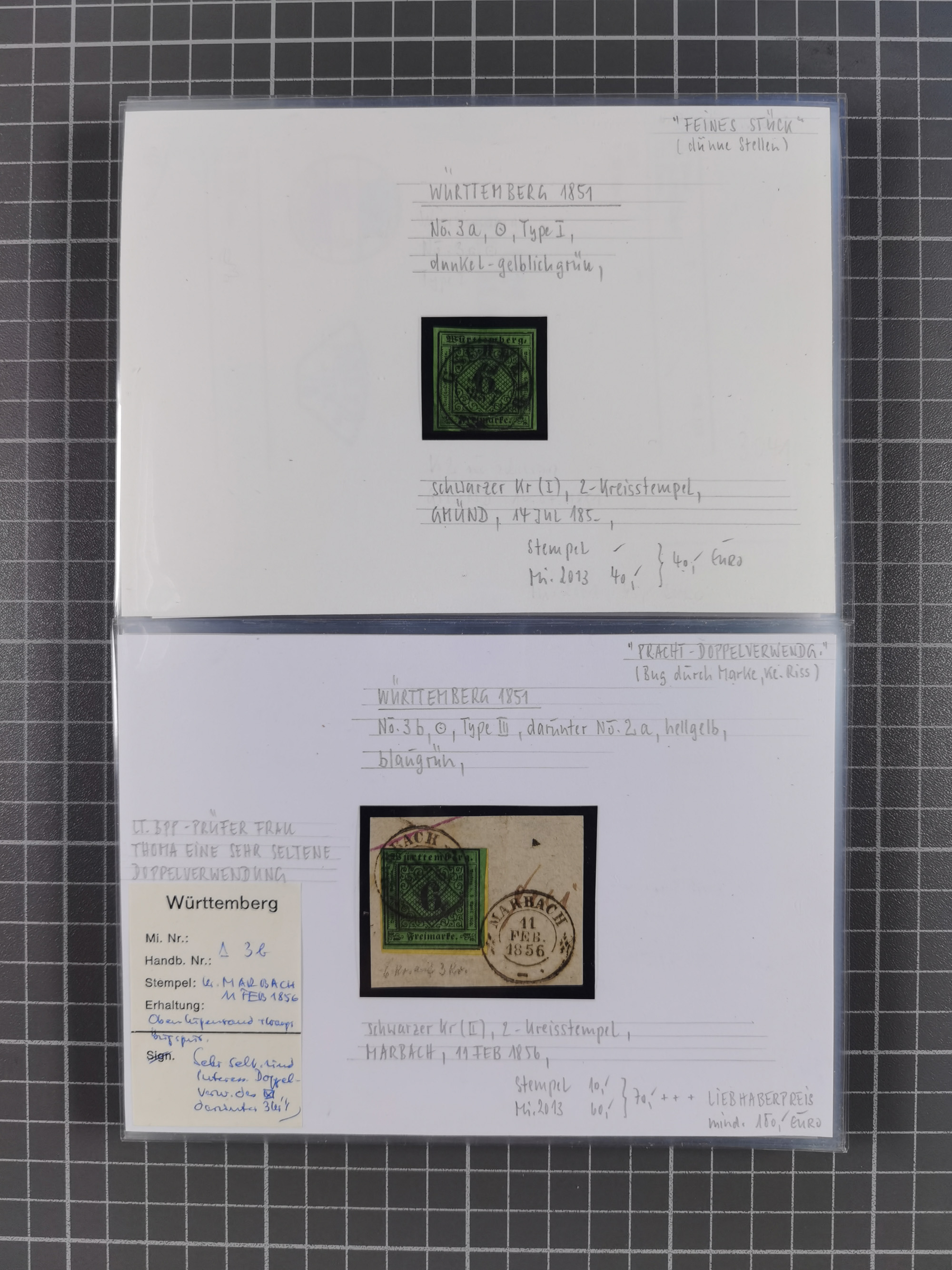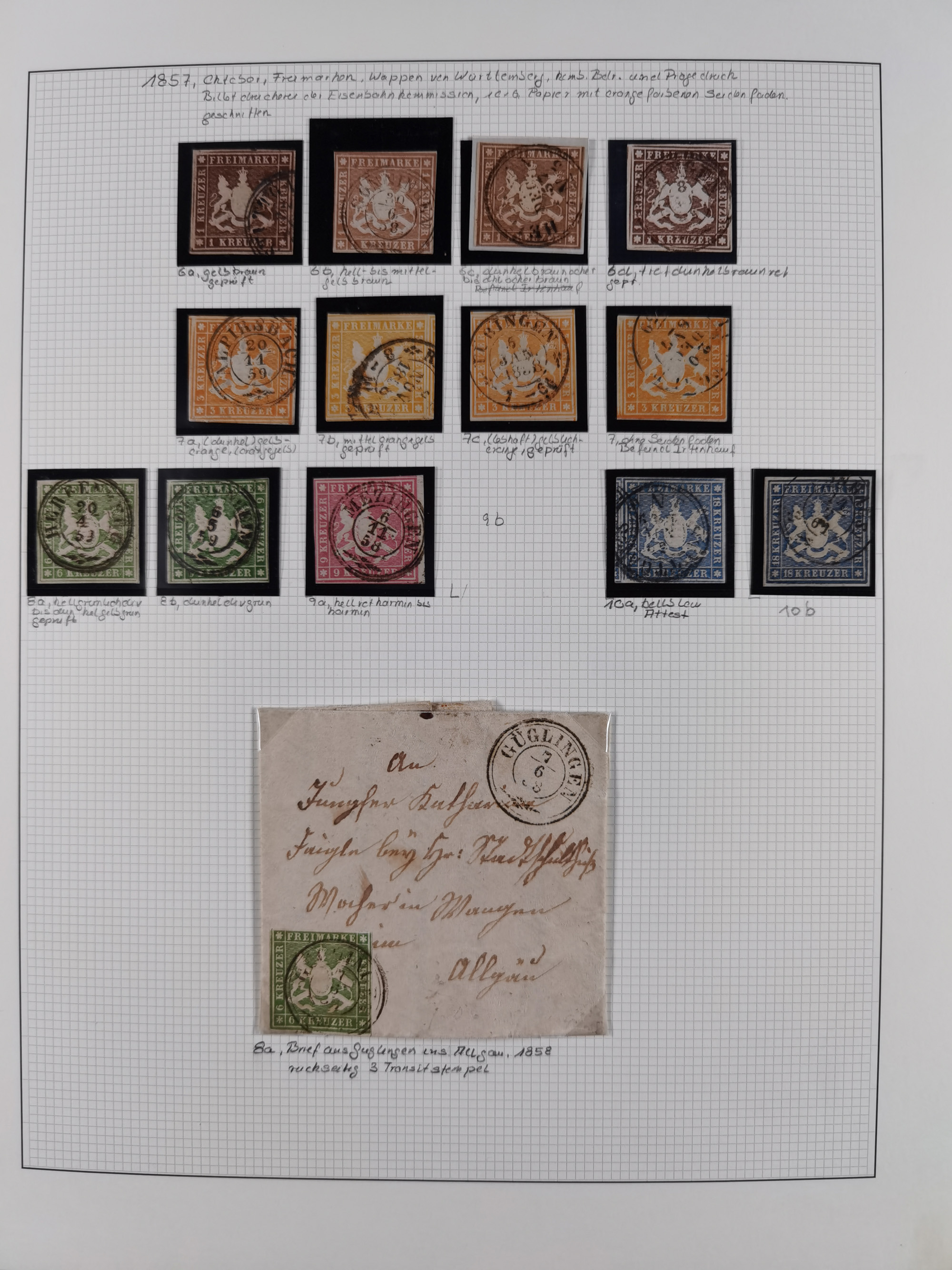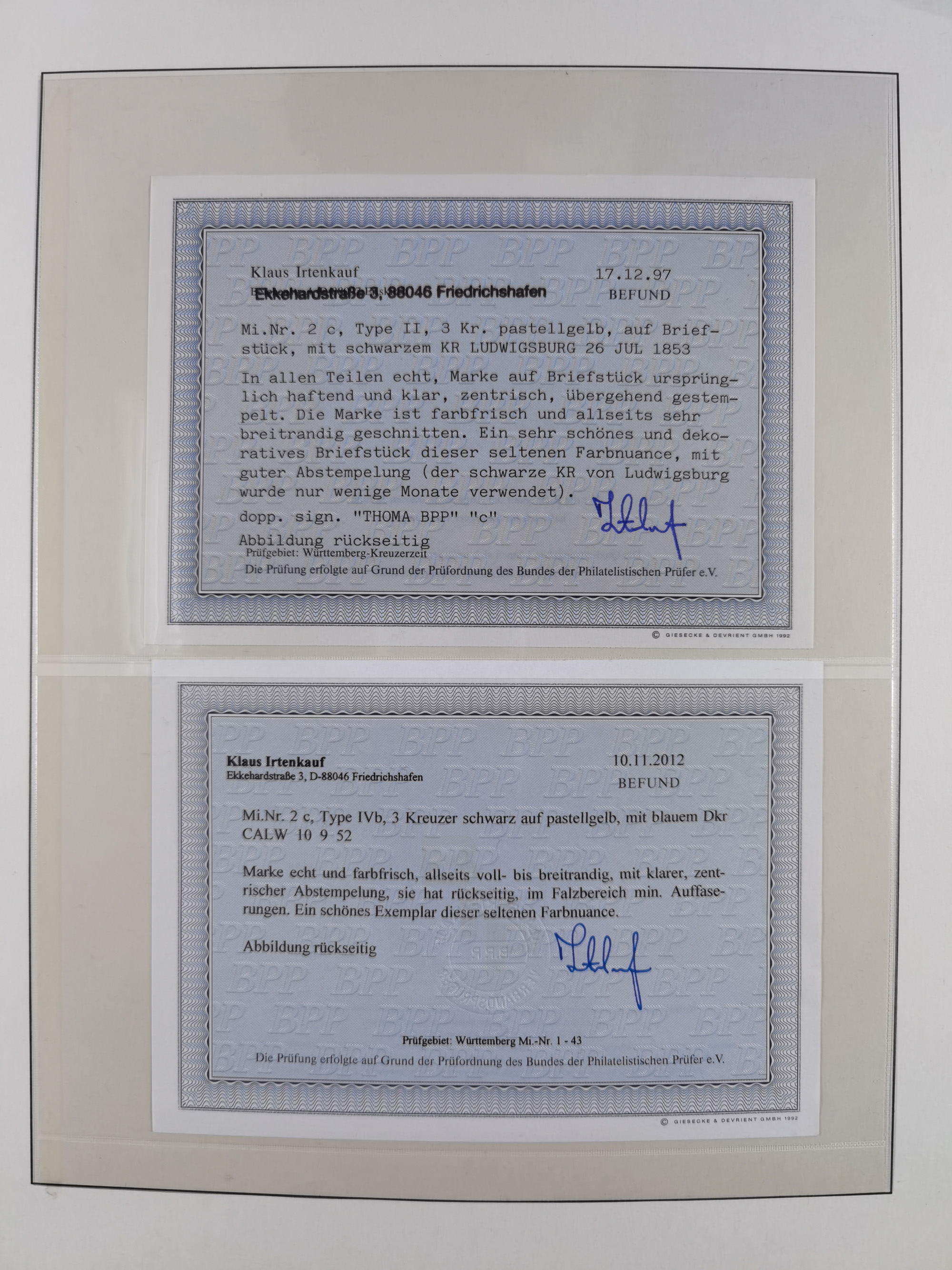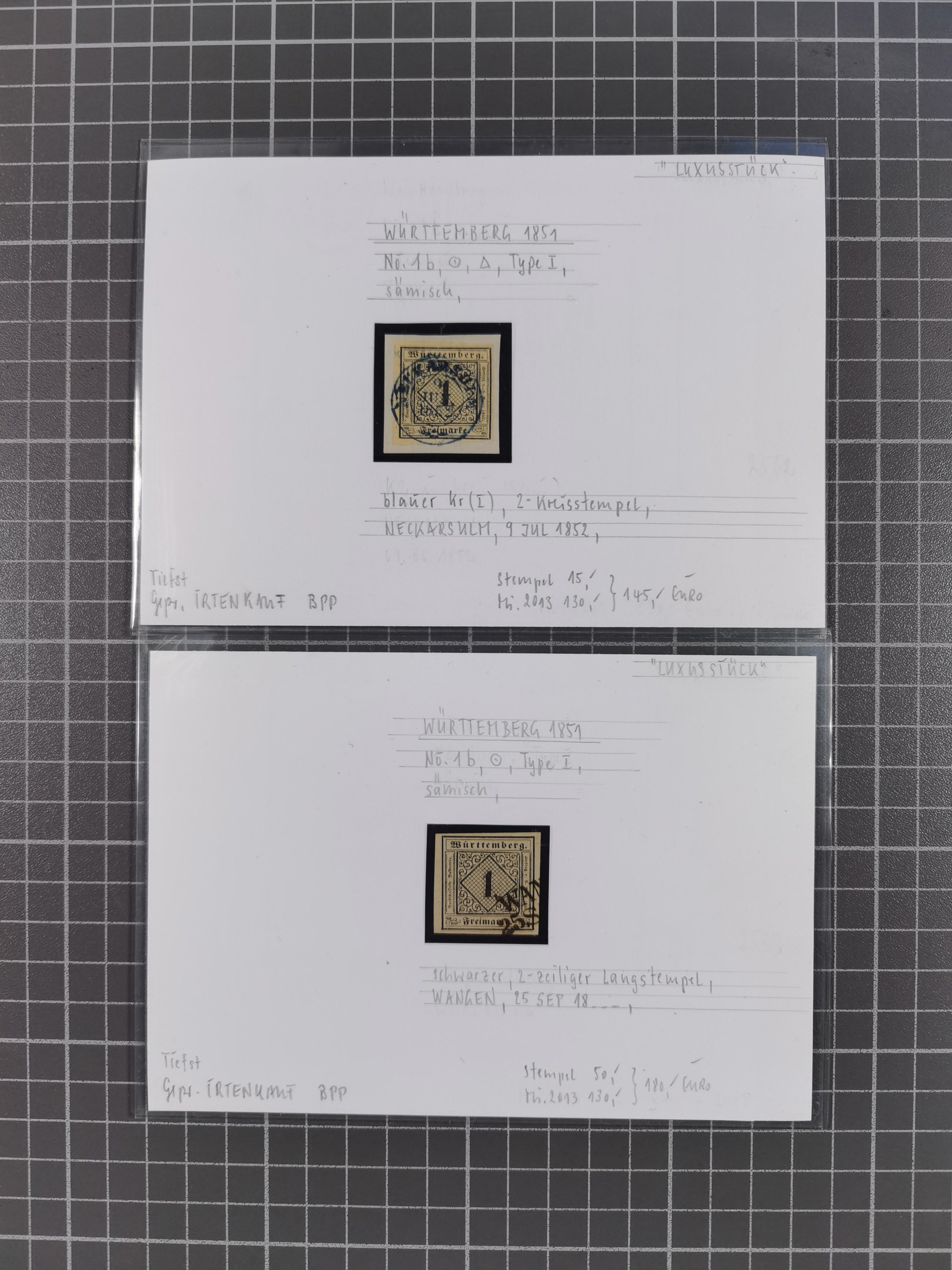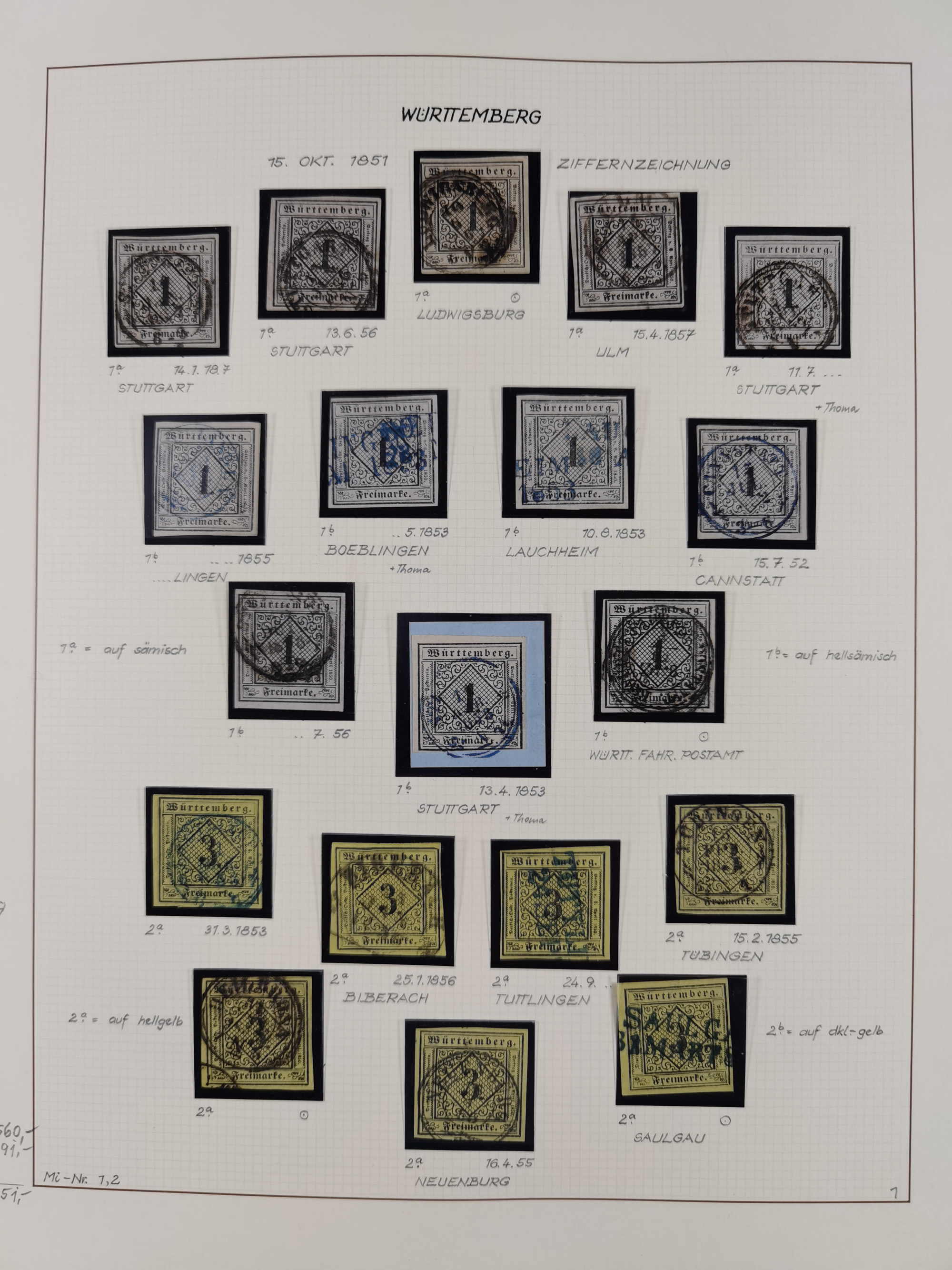 1851/1923, umfangreiche gestempelte Sammlung mit fast allen besseren Marken, vielen Farben und Besonderheiten. Dabei u.a. Mi.-Nr. Nr. 1c auf Briefstück (doppelt sign. Heinrich BPP), Mi.-Nr. 5I (FA Thoma BPP), Mi.-Nr. 5II (FA Heinrich BPP), Mi.-Nr. 9b (FA Irtenkauf BPP), Mi.-Nr. 10a auf Briefstück (FA Heinrich BPP), Mi.-Nr. 14b (FA Irtenkauf BPP), Mi.-Nr. 15 (FA Irtenkauf BPP), Mi.-Nr. 19xb (FA Irtenkauf BPP), Mi-Nr. 24 (FA Irtenkauf BPP), Mi.-Nr. 31c (FA Irtenkauf BPP), Mi.-Nr. 42b mit glasklarem EKr. “LUDWIGSBURG” (sign. Pfenninger mit FA), Mi.-Nr. 188 (FA Winkler BPP), Mi.-Nr. 211 (FA Thoma BPP), Mi.-Nr. 231aa (FA Winkler BPP) und Mi.-Nr. 264d (FA Winkler BPP). Fast durchgehend in guter Erhaltung mit ausgesucht schönen Stempeln, bessere Marken alle signiert bzw. mit KB, FB und Fotoattesten. Eine besonders empfehlenswerte Sammlung
