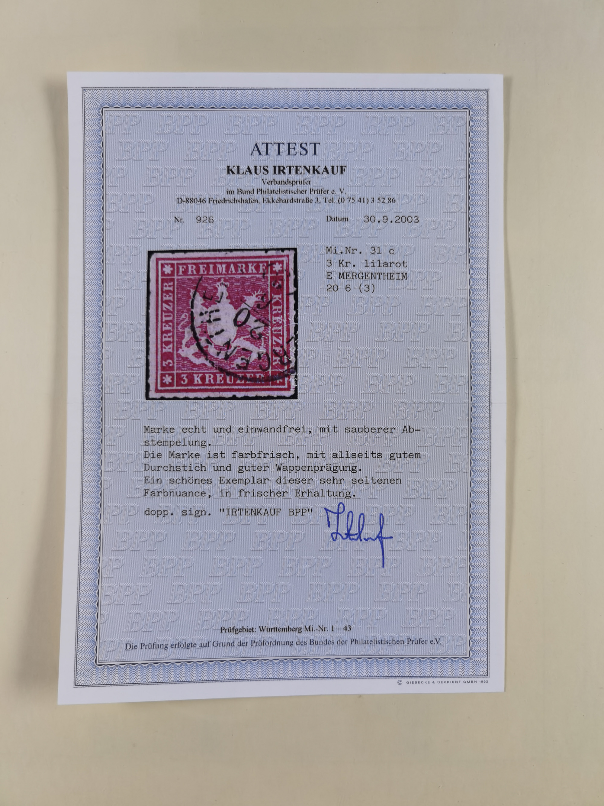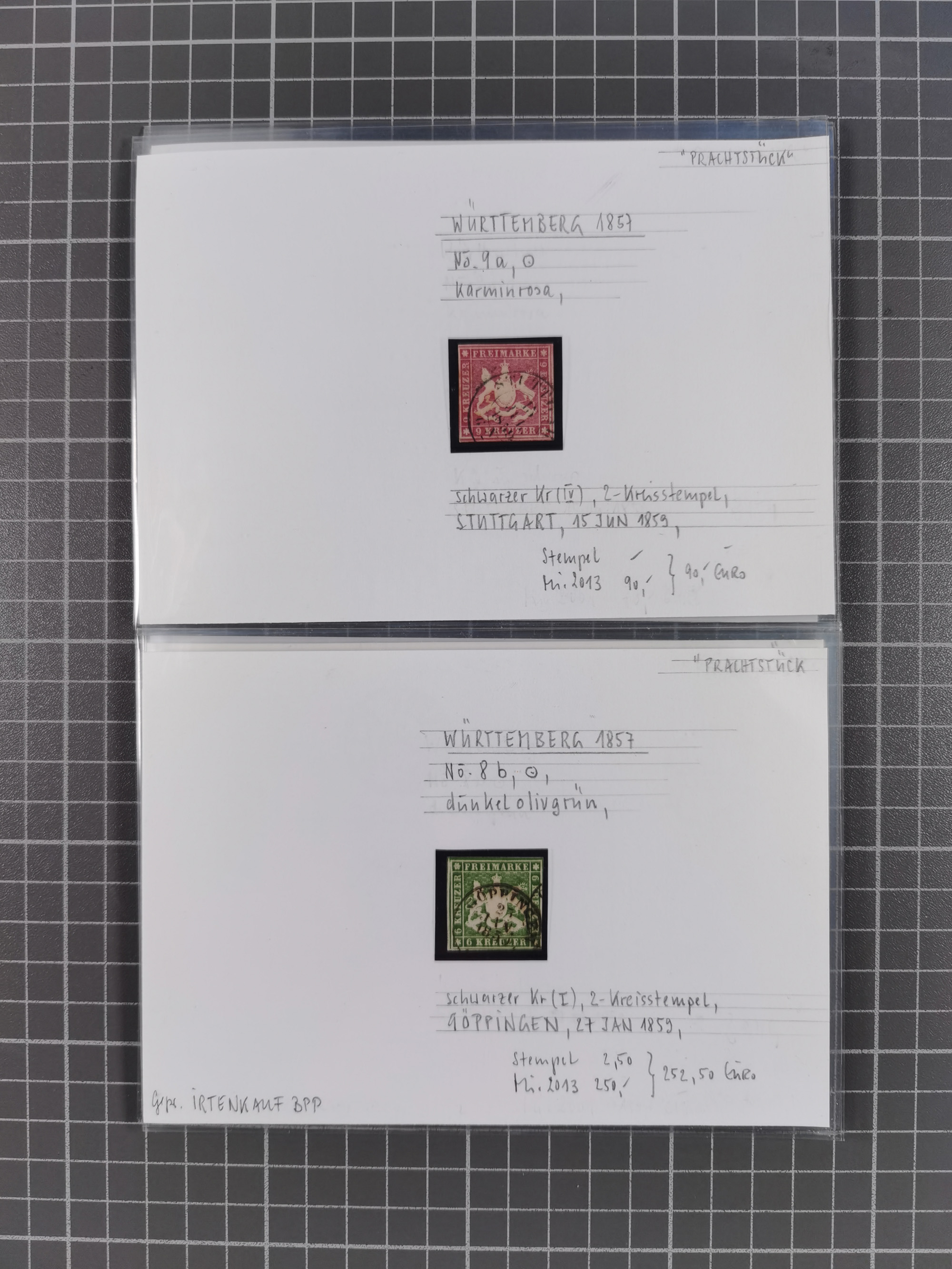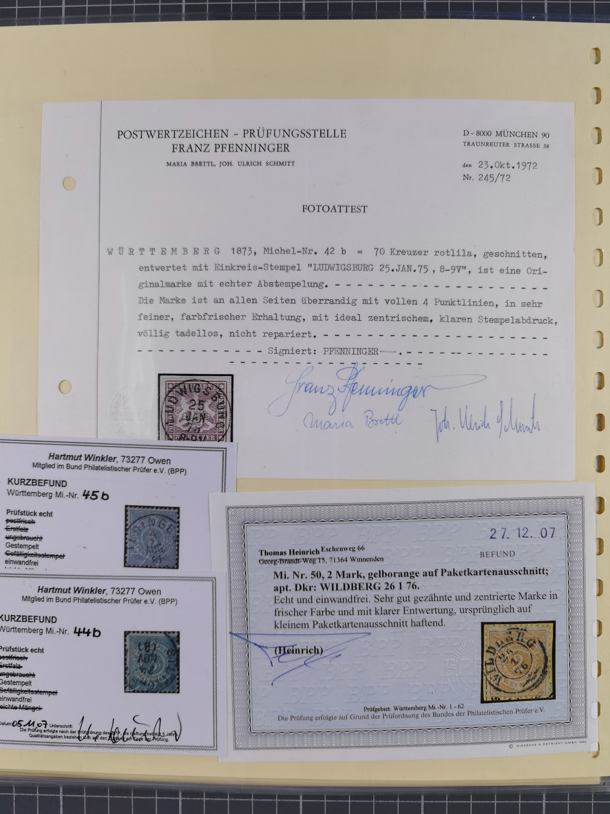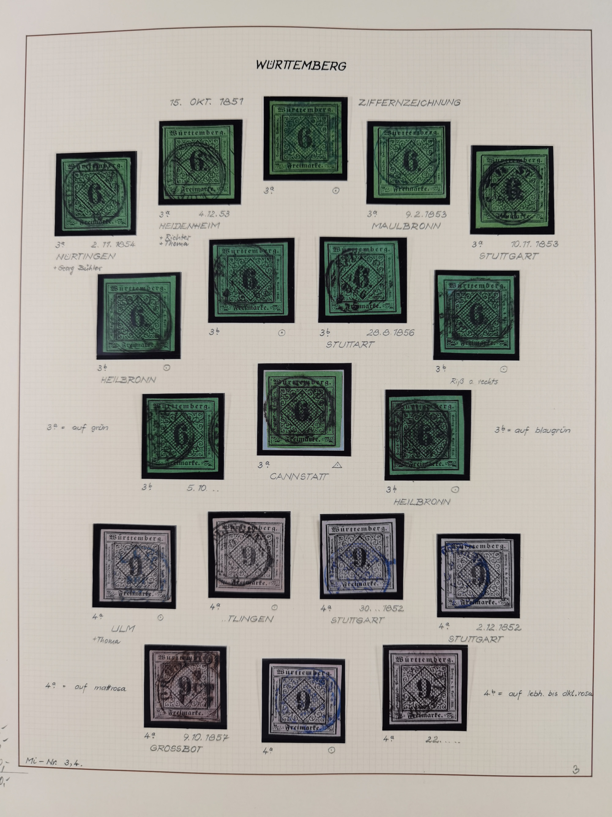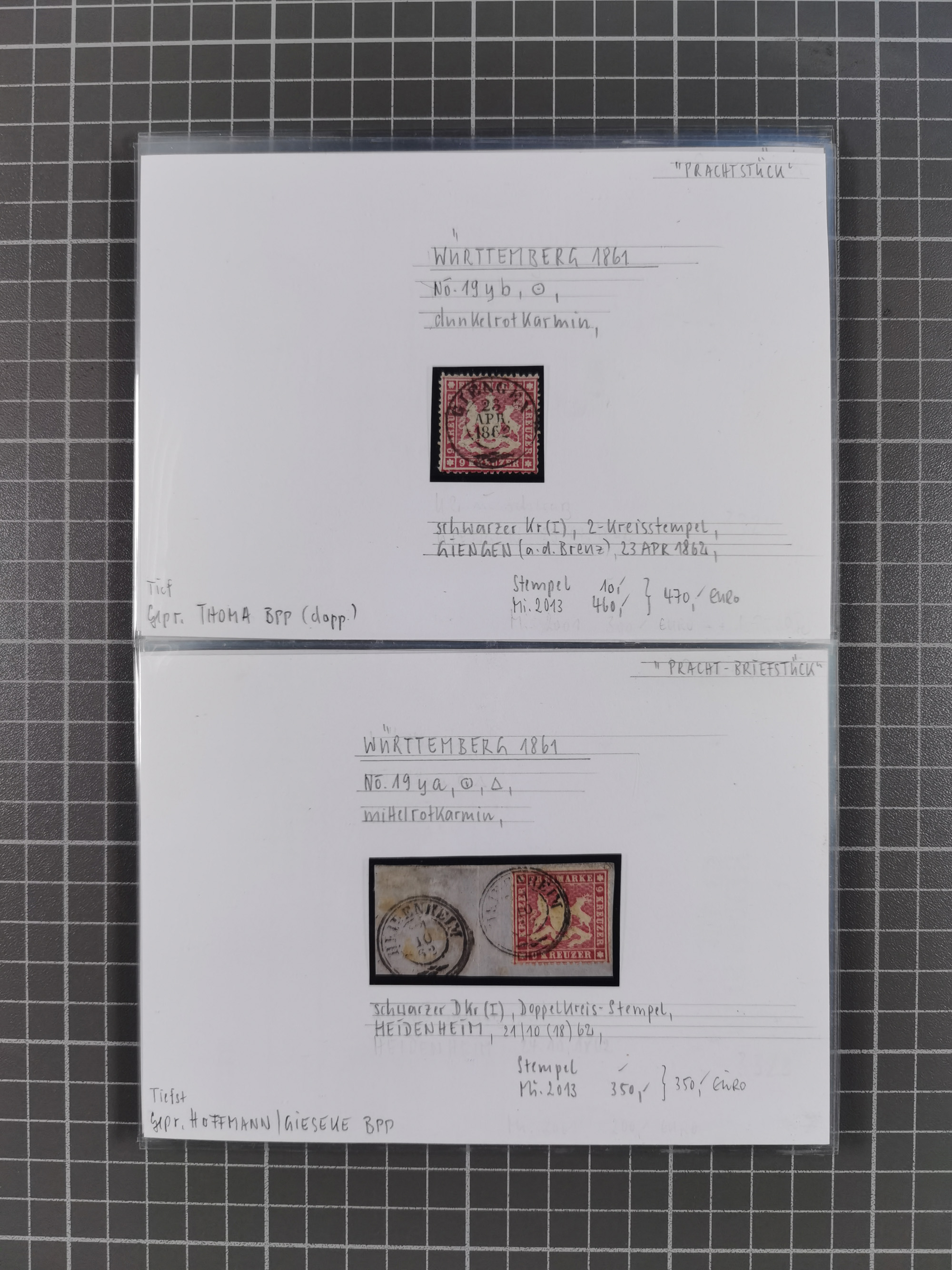 1851/1923, umfangreiche gestempelte Sammlung mit fast allen besseren Marken, vielen Farben und Besonderheiten. Dabei u.a. Mi.-Nr. Nr. 1c auf Briefstück (doppelt sign. Heinrich BPP), Mi.-Nr. 5I (FA Thoma BPP), Mi.-Nr. 5II (FA Heinrich BPP), Mi.-Nr. 9b (FA Irtenkauf BPP), Mi.-Nr. 10a auf Briefstück (FA Heinrich BPP), Mi.-Nr. 14b (FA Irtenkauf BPP), Mi.-Nr. 15 (FA Irtenkauf BPP), Mi.-Nr. 19xb (FA Irtenkauf BPP), Mi-Nr. 24 (FA Irtenkauf BPP), Mi.-Nr. 31c (FA Irtenkauf BPP), Mi.-Nr. 42b mit glasklarem EKr. “LUDWIGSBURG” (sign. Pfenninger mit FA), Mi.-Nr. 188 (FA Winkler BPP), Mi.-Nr. 211 (FA Thoma BPP), Mi.-Nr. 231aa (FA Winkler BPP) und Mi.-Nr. 264d (FA Winkler BPP). Fast durchgehend in guter Erhaltung mit ausgesucht schönen Stempeln, bessere Marken alle signiert bzw. mit KB, FB und Fotoattesten. Eine besonders empfehlenswerte Sammlung