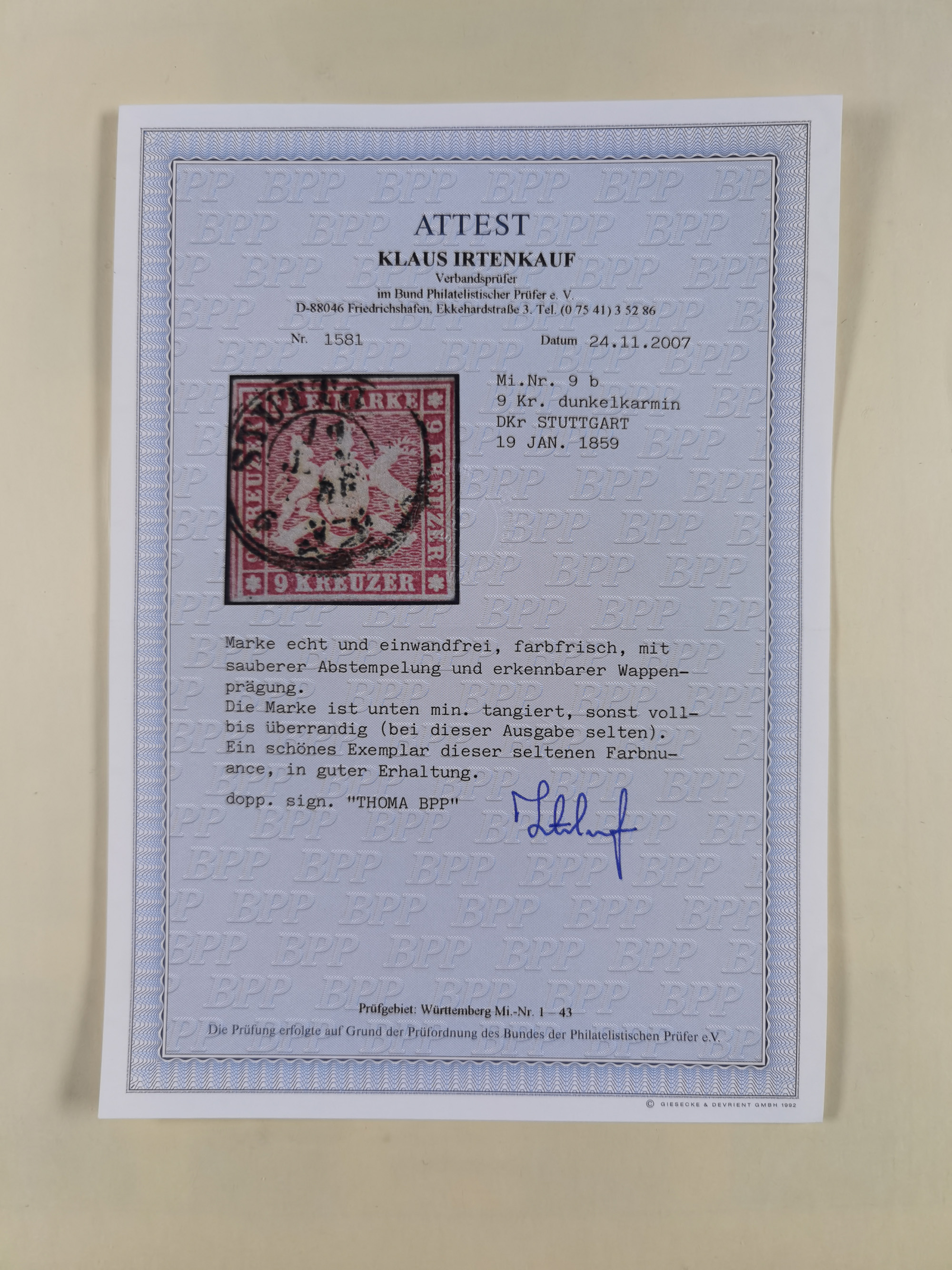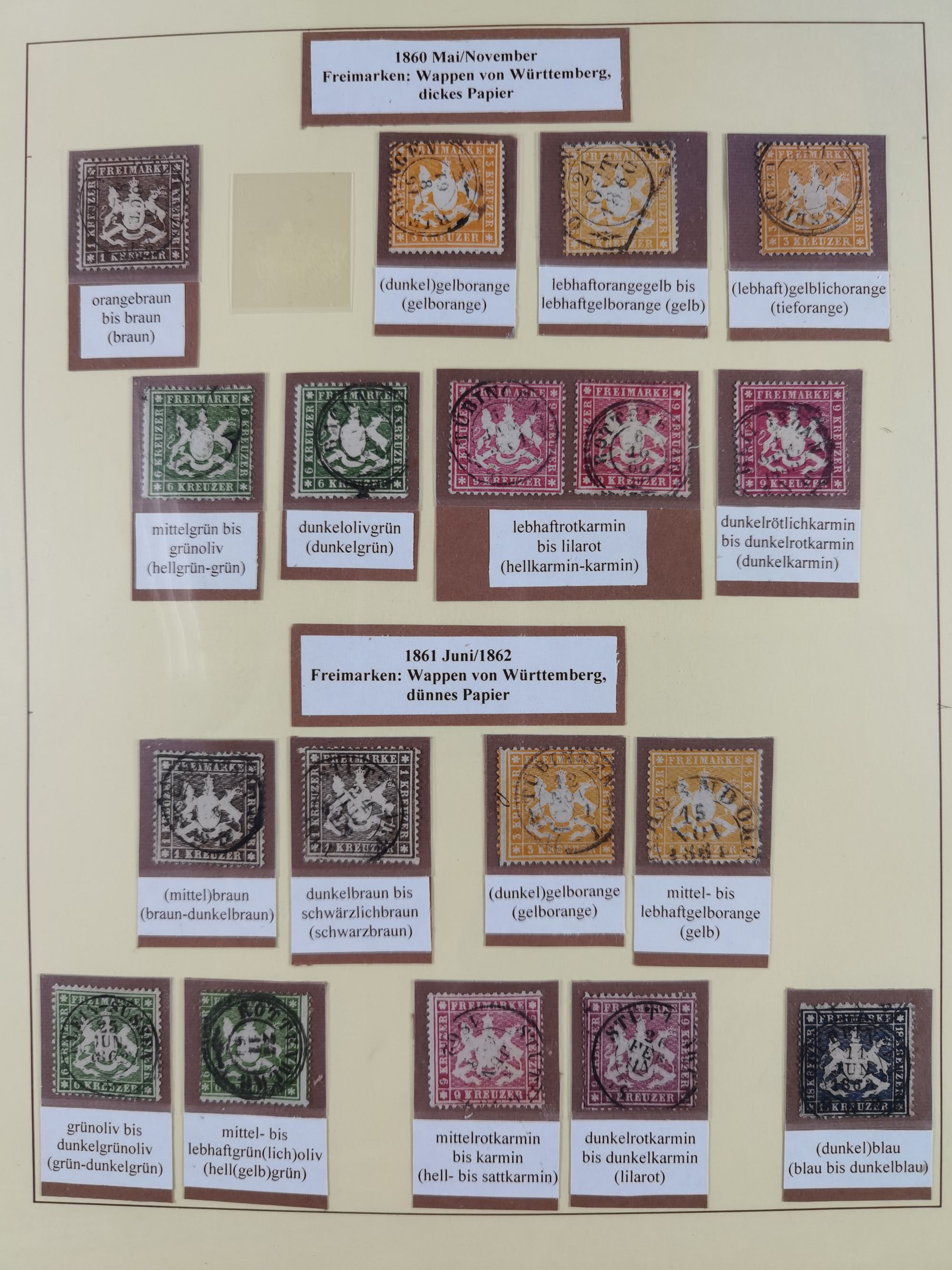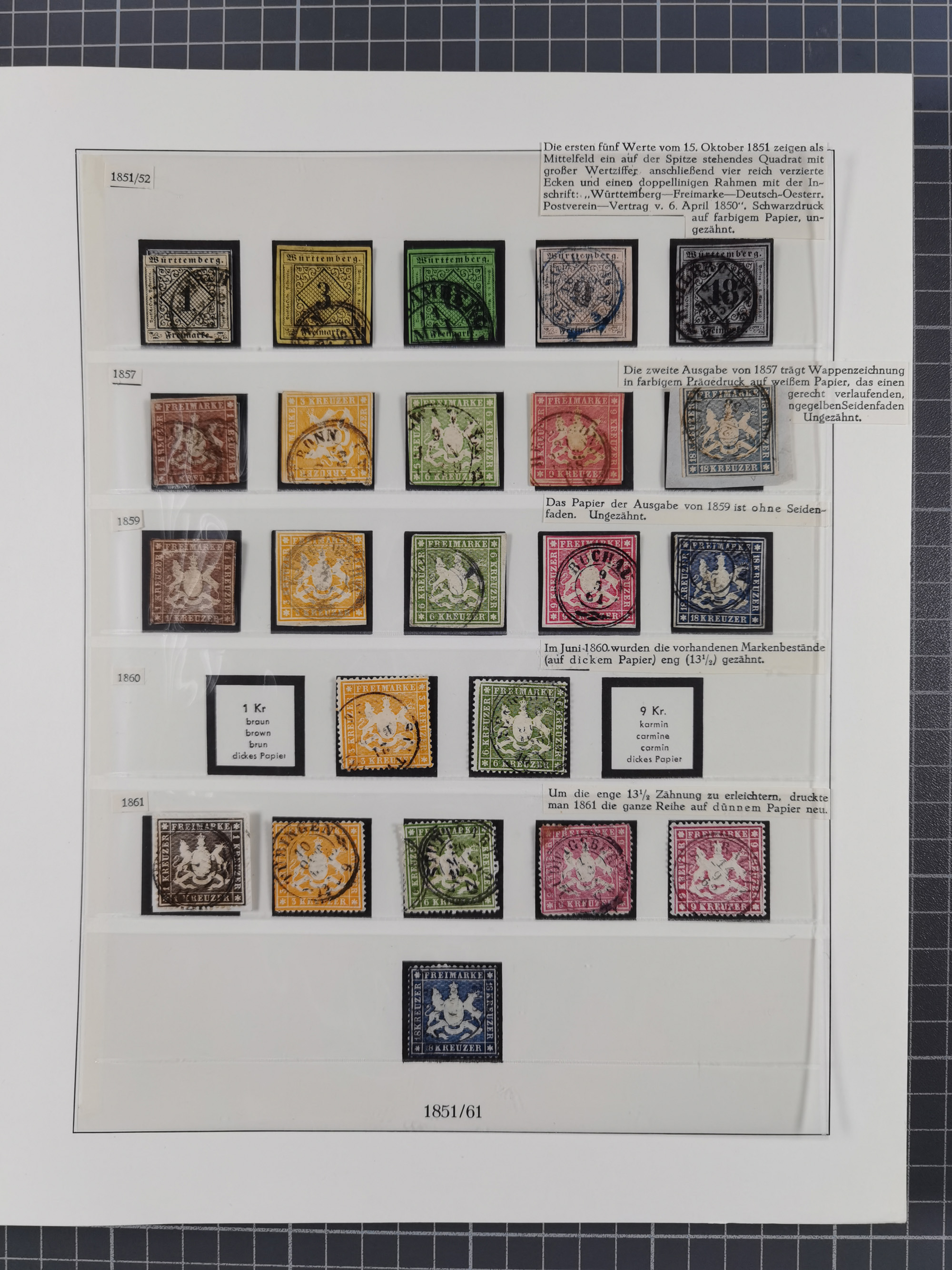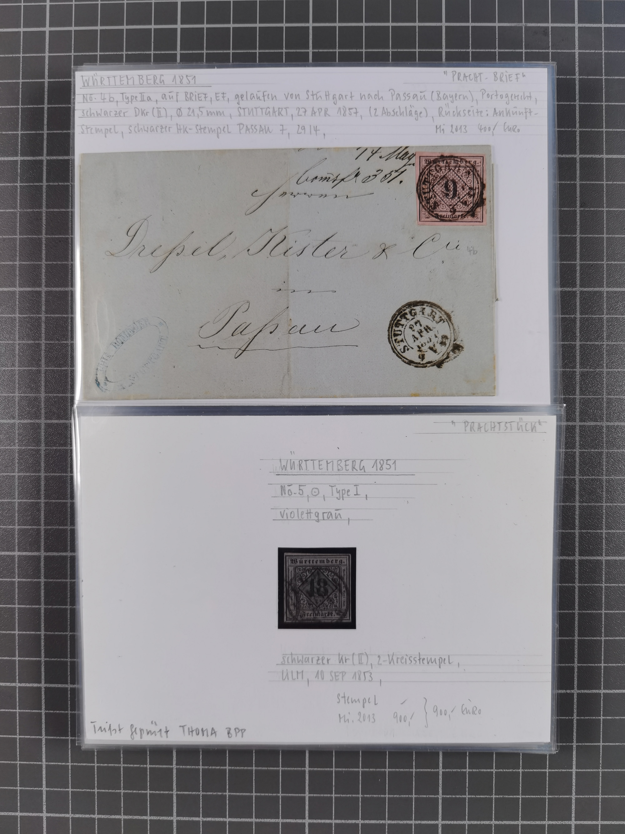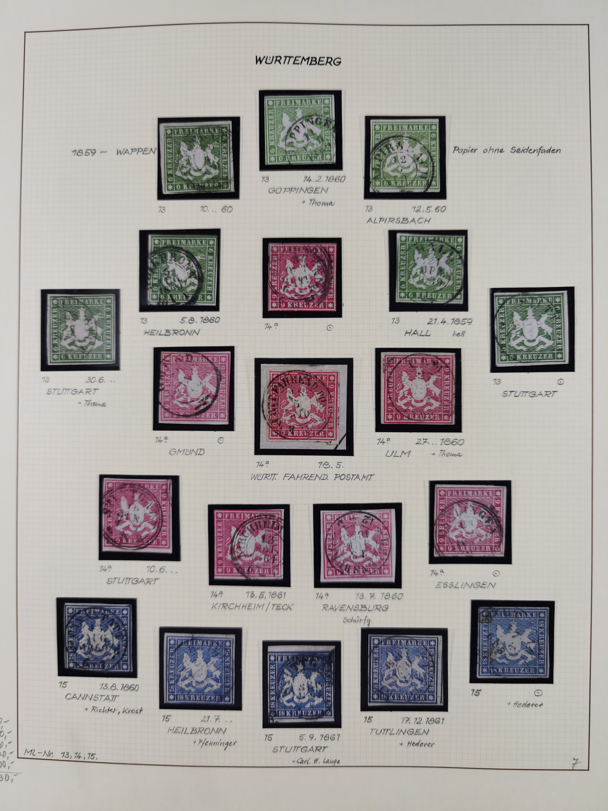 1851/1923, umfangreiche gestempelte Sammlung mit fast allen besseren Marken, vielen Farben und Besonderheiten. Dabei u.a. Mi.-Nr. Nr. 1c auf Briefstück (doppelt sign. Heinrich BPP), Mi.-Nr. 5I (FA Thoma BPP), Mi.-Nr. 5II (FA Heinrich BPP), Mi.-Nr. 9b (FA Irtenkauf BPP), Mi.-Nr. 10a auf Briefstück (FA Heinrich BPP), Mi.-Nr. 14b (FA Irtenkauf BPP), Mi.-Nr. 15 (FA Irtenkauf BPP), Mi.-Nr. 19xb (FA Irtenkauf BPP), Mi-Nr. 24 (FA Irtenkauf BPP), Mi.-Nr. 31c (FA Irtenkauf BPP), Mi.-Nr. 42b mit glasklarem EKr. “LUDWIGSBURG” (sign. Pfenninger mit FA), Mi.-Nr. 188 (FA Winkler BPP), Mi.-Nr. 211 (FA Thoma BPP), Mi.-Nr. 231aa (FA Winkler BPP) und Mi.-Nr. 264d (FA Winkler BPP). Fast durchgehend in guter Erhaltung mit ausgesucht schönen Stempeln, bessere Marken alle signiert bzw. mit KB, FB und Fotoattesten. Eine besonders empfehlenswerte Sammlung