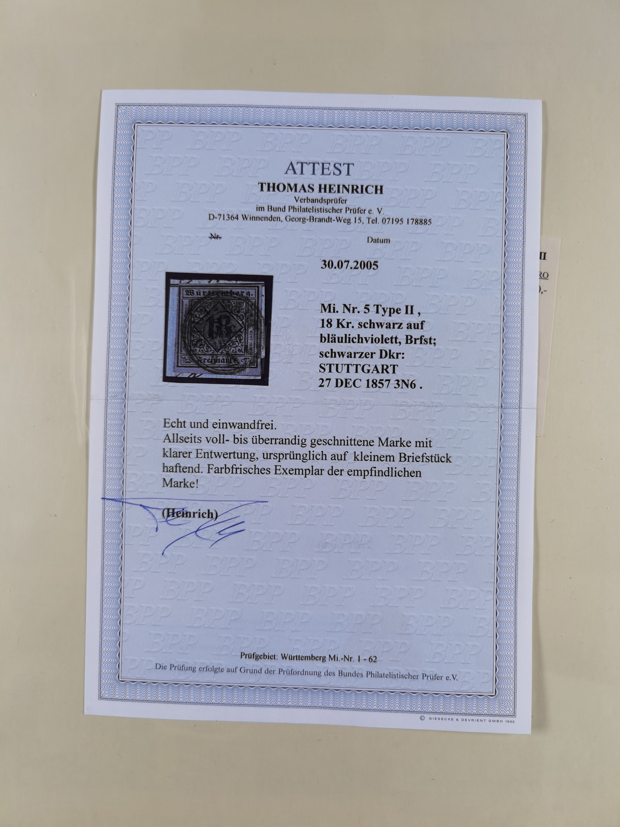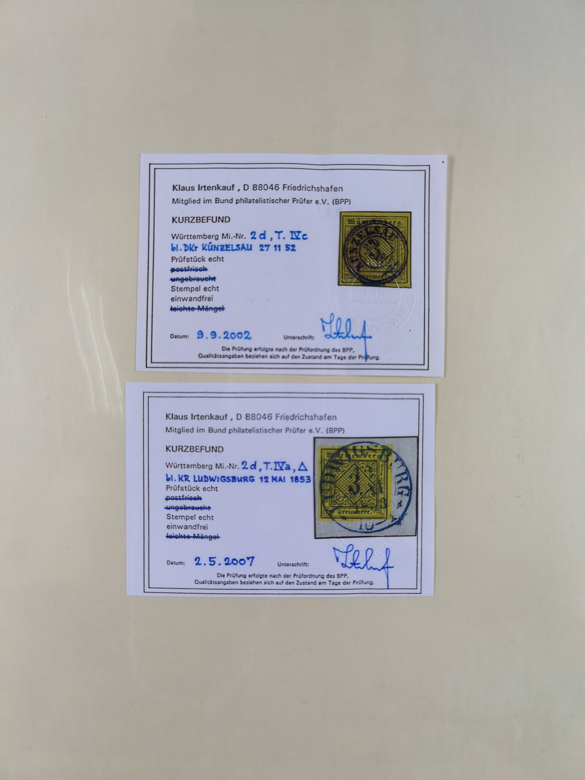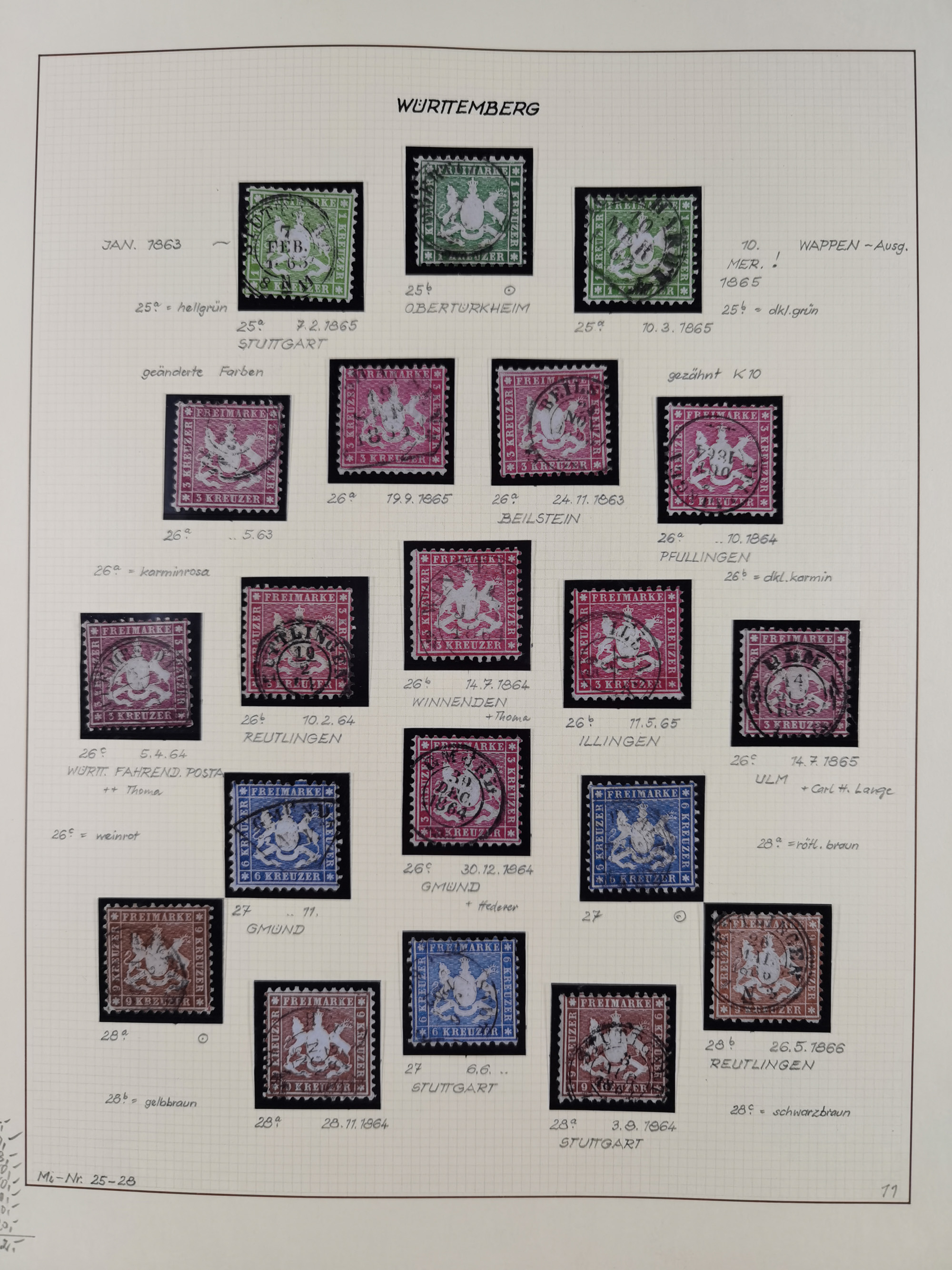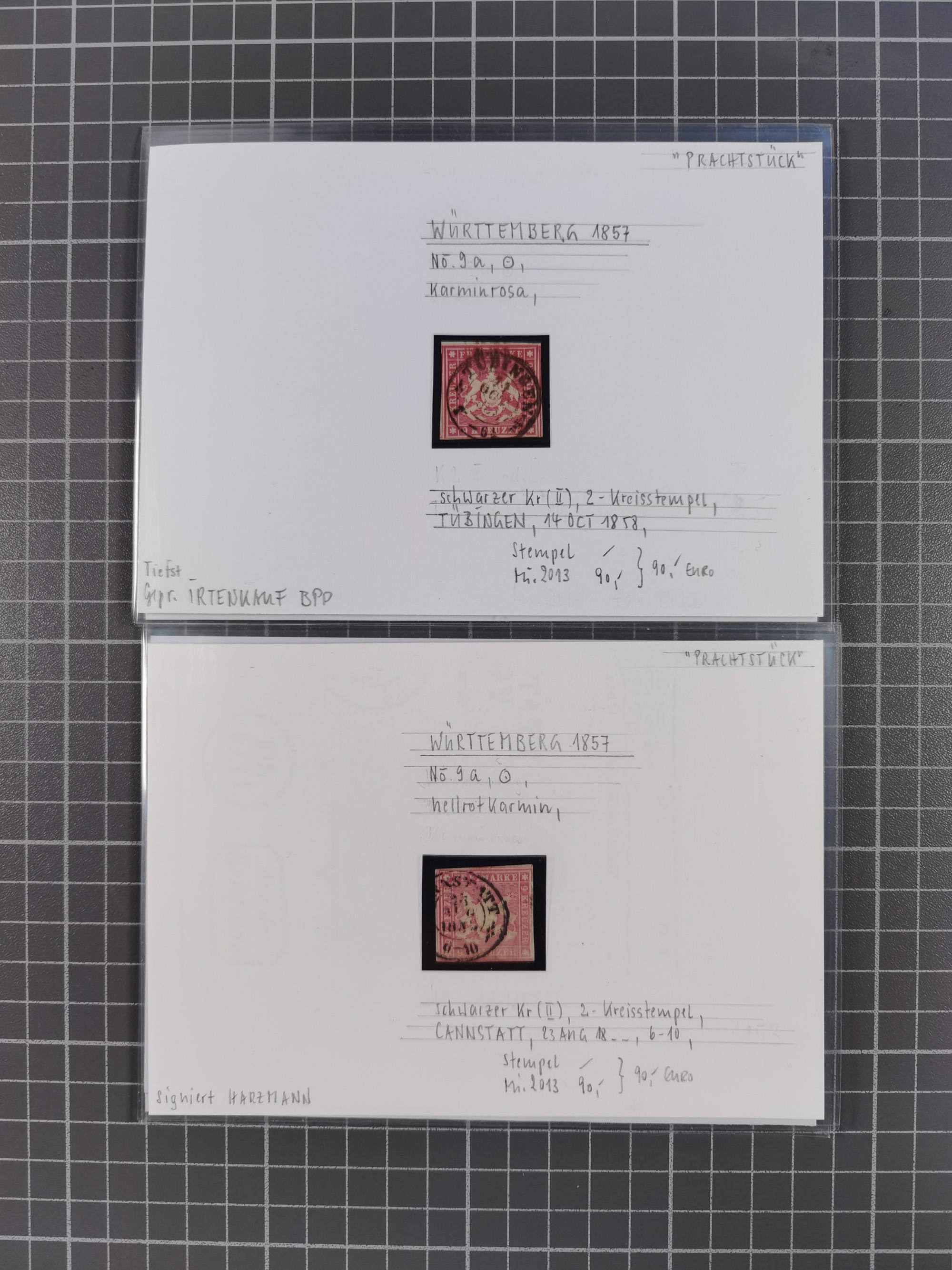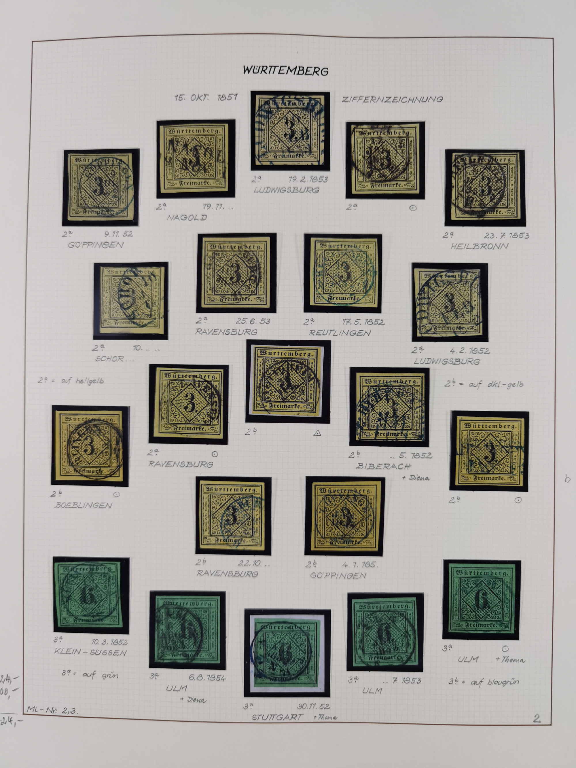1851/1923, umfangreiche gestempelte Sammlung mit fast allen besseren Marken, vielen Farben und Besonderheiten. Dabei u.a. Mi.-Nr. Nr. 1c auf Briefstück (doppelt sign. Heinrich BPP), Mi.-Nr. 5I (FA Thoma BPP), Mi.-Nr. 5II (FA Heinrich BPP), Mi.-Nr. 9b (FA Irtenkauf BPP), Mi.-Nr. 10a auf Briefstück (FA Heinrich BPP), Mi.-Nr. 14b (FA Irtenkauf BPP), Mi.-Nr. 15 (FA Irtenkauf BPP), Mi.-Nr. 19xb (FA Irtenkauf BPP), Mi-Nr. 24 (FA Irtenkauf BPP), Mi.-Nr. 31c (FA Irtenkauf BPP), Mi.-Nr. 42b mit glasklarem EKr. “LUDWIGSBURG” (sign. Pfenninger mit FA), Mi.-Nr. 188 (FA Winkler BPP), Mi.-Nr. 211 (FA Thoma BPP), Mi.-Nr. 231aa (FA Winkler BPP) und Mi.-Nr. 264d (FA Winkler BPP). Fast durchgehend in guter Erhaltung mit ausgesucht schönen Stempeln, bessere Marken alle signiert bzw. mit KB, FB und Fotoattesten. Eine besonders empfehlenswerte Sammlung