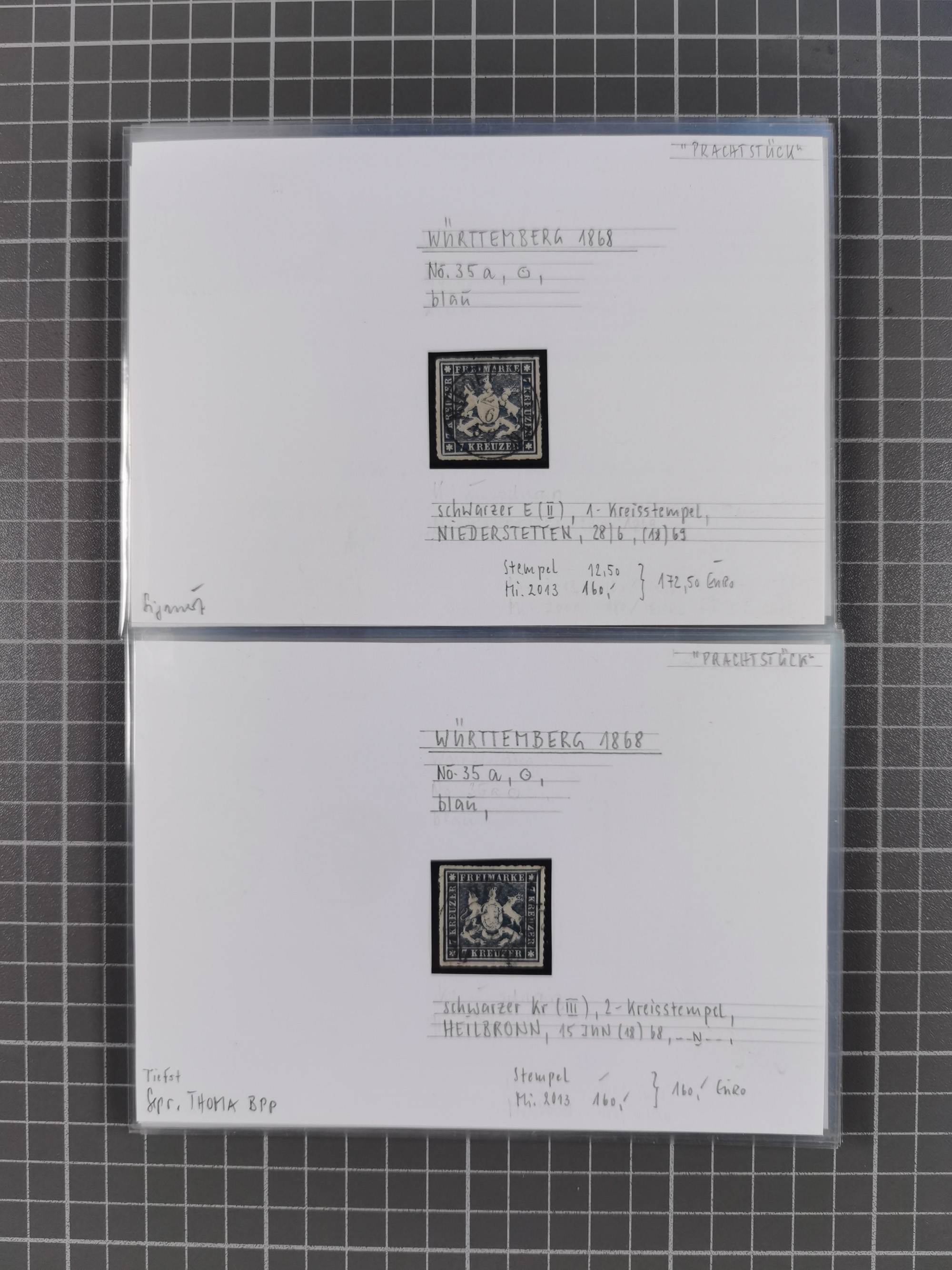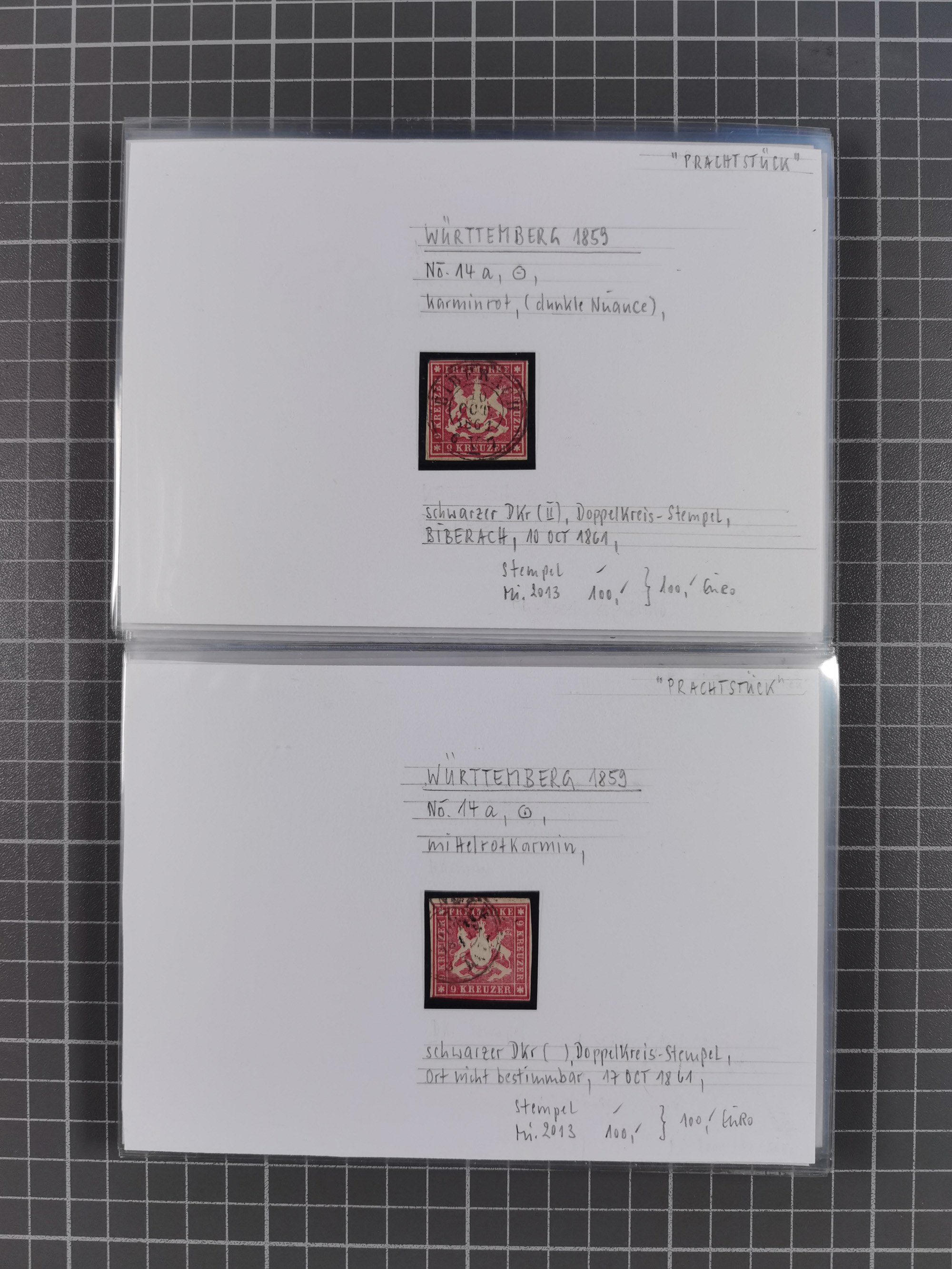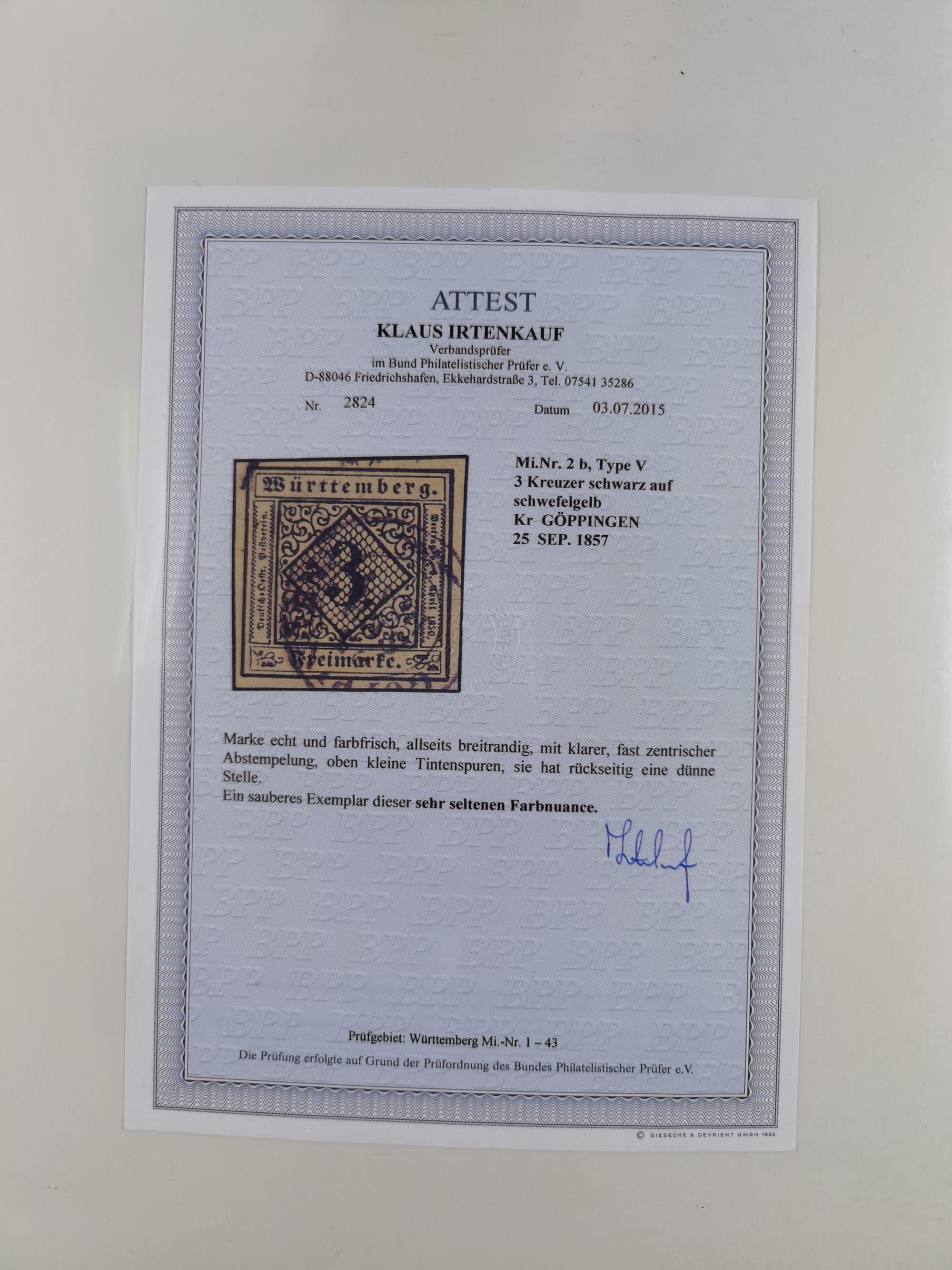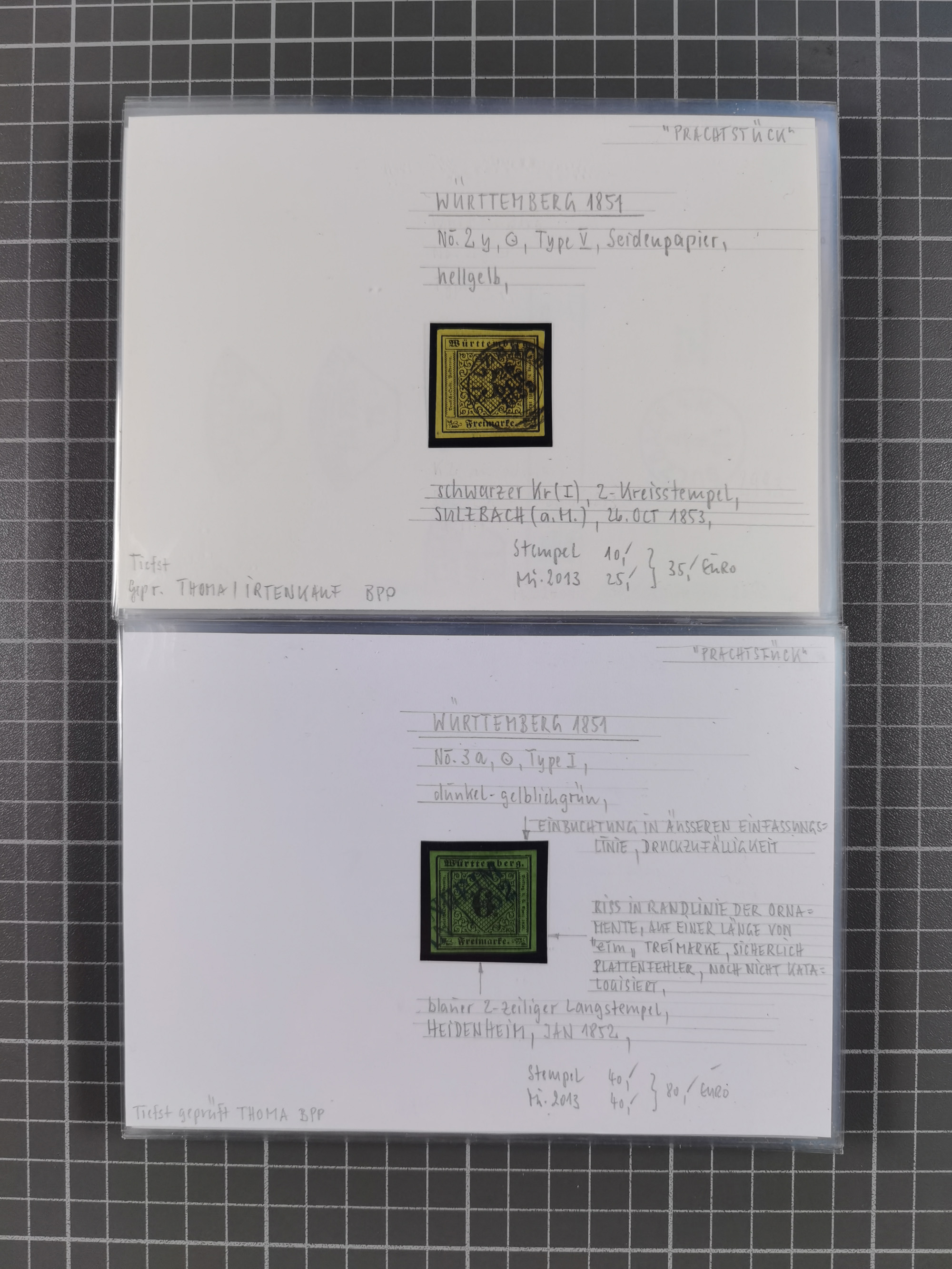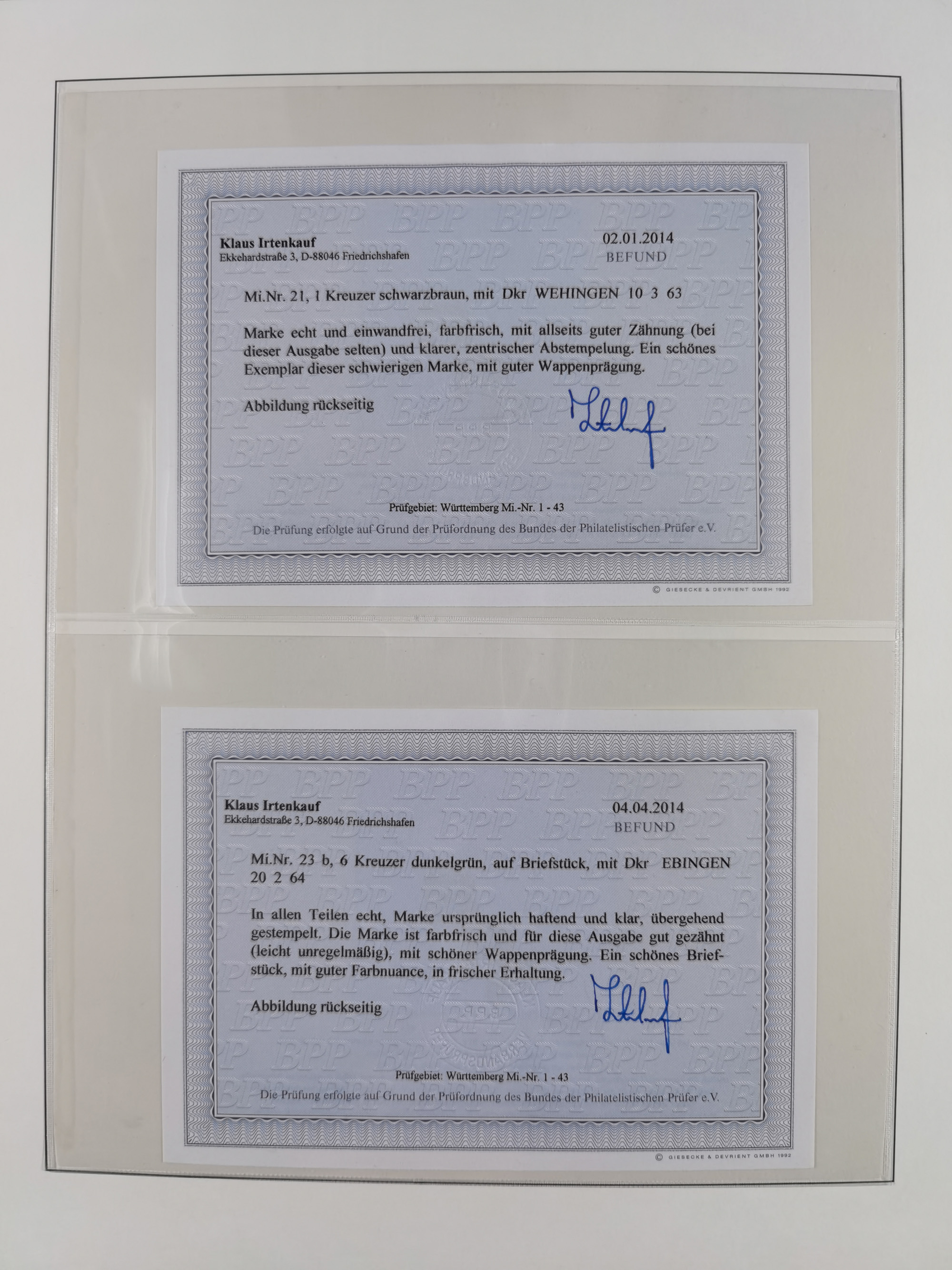 1851/1923, umfangreiche gestempelte Sammlung mit fast allen besseren Marken, vielen Farben und Besonderheiten. Dabei u.a. Mi.-Nr. Nr. 1c auf Briefstück (doppelt sign. Heinrich BPP), Mi.-Nr. 5I (FA Thoma BPP), Mi.-Nr. 5II (FA Heinrich BPP), Mi.-Nr. 9b (FA Irtenkauf BPP), Mi.-Nr. 10a auf Briefstück (FA Heinrich BPP), Mi.-Nr. 14b (FA Irtenkauf BPP), Mi.-Nr. 15 (FA Irtenkauf BPP), Mi.-Nr. 19xb (FA Irtenkauf BPP), Mi-Nr. 24 (FA Irtenkauf BPP), Mi.-Nr. 31c (FA Irtenkauf BPP), Mi.-Nr. 42b mit glasklarem EKr. “LUDWIGSBURG” (sign. Pfenninger mit FA), Mi.-Nr. 188 (FA Winkler BPP), Mi.-Nr. 211 (FA Thoma BPP), Mi.-Nr. 231aa (FA Winkler BPP) und Mi.-Nr. 264d (FA Winkler BPP). Fast durchgehend in guter Erhaltung mit ausgesucht schönen Stempeln, bessere Marken alle signiert bzw. mit KB, FB und Fotoattesten. Eine besonders empfehlenswerte Sammlung