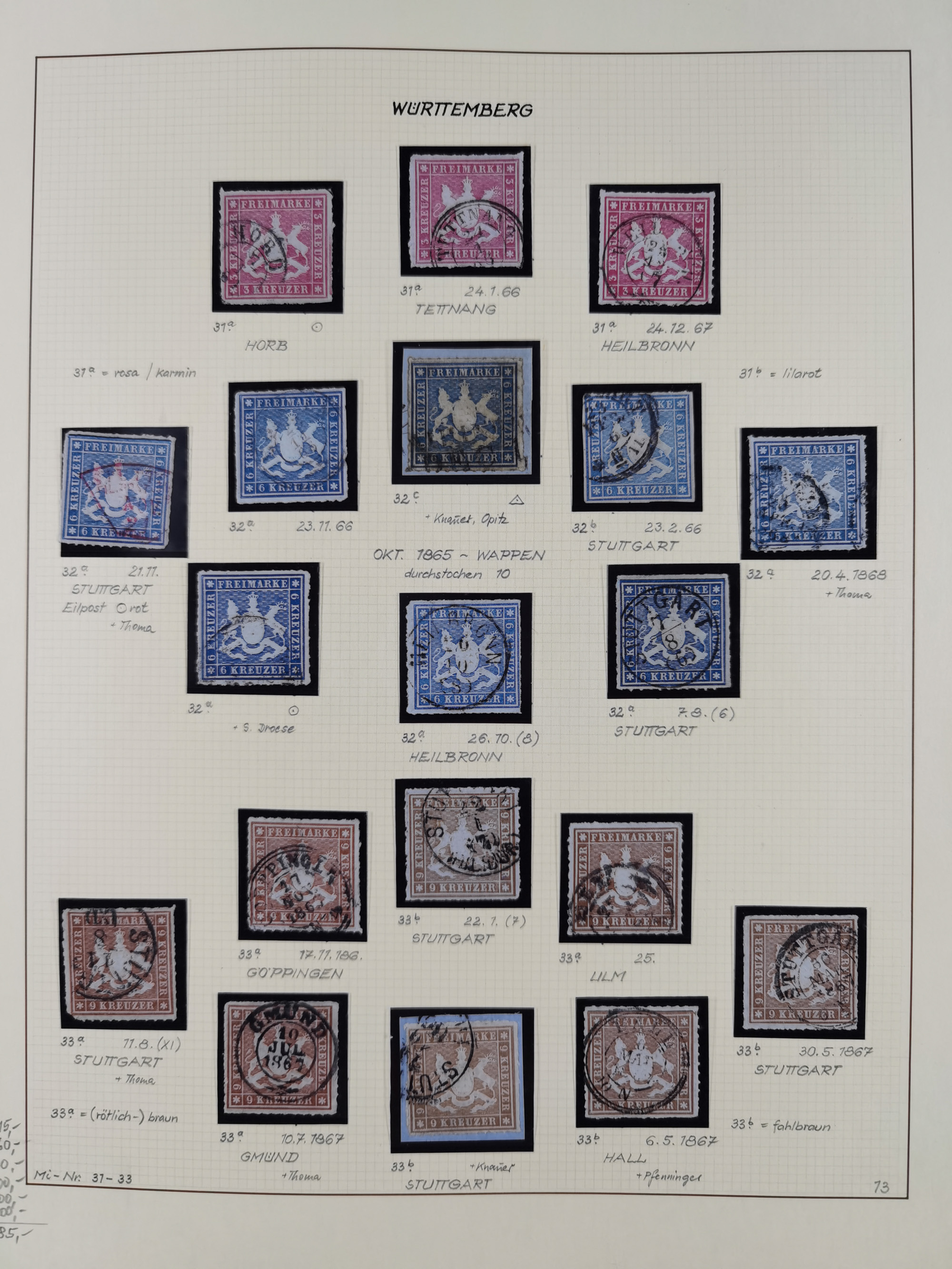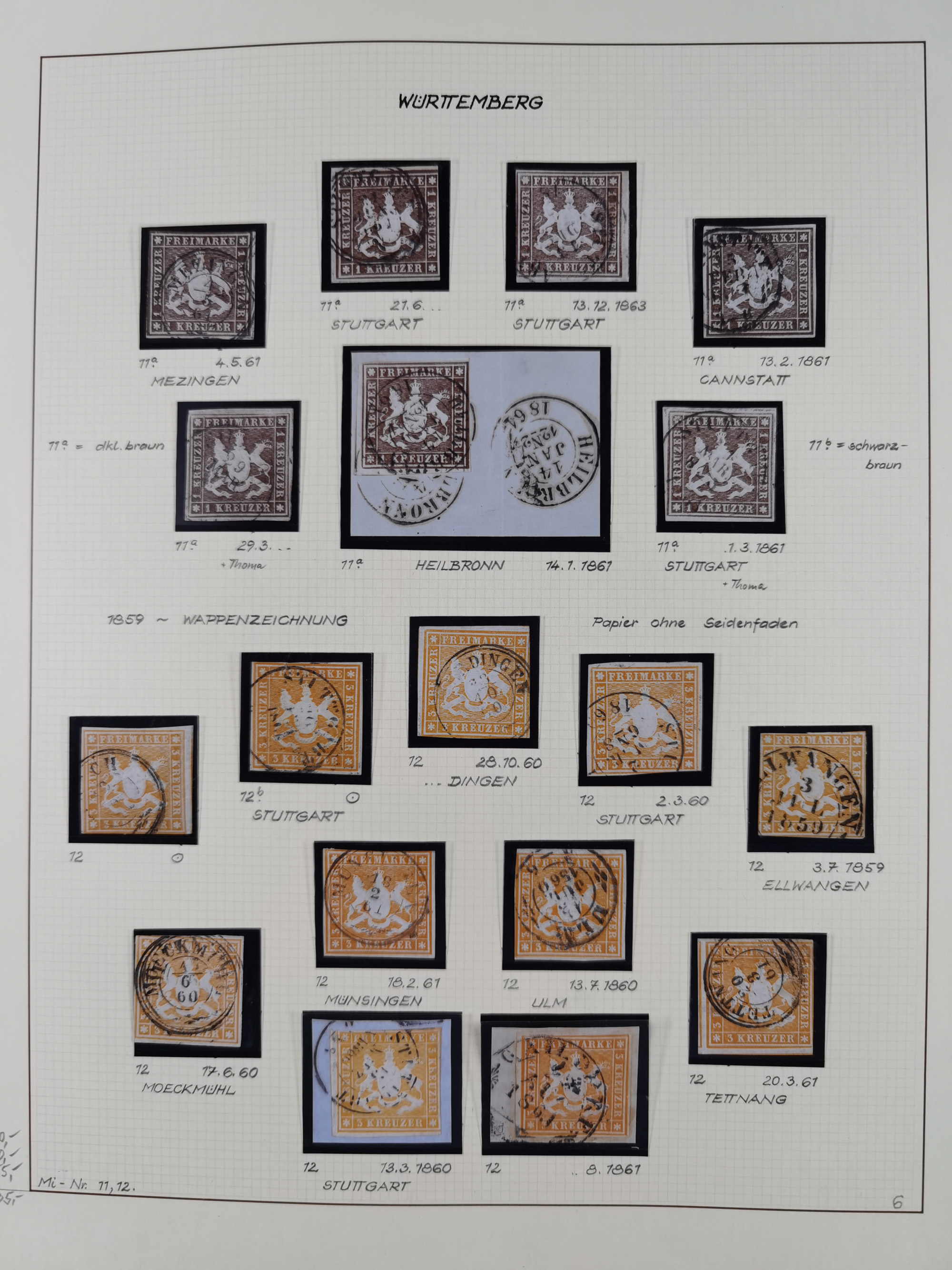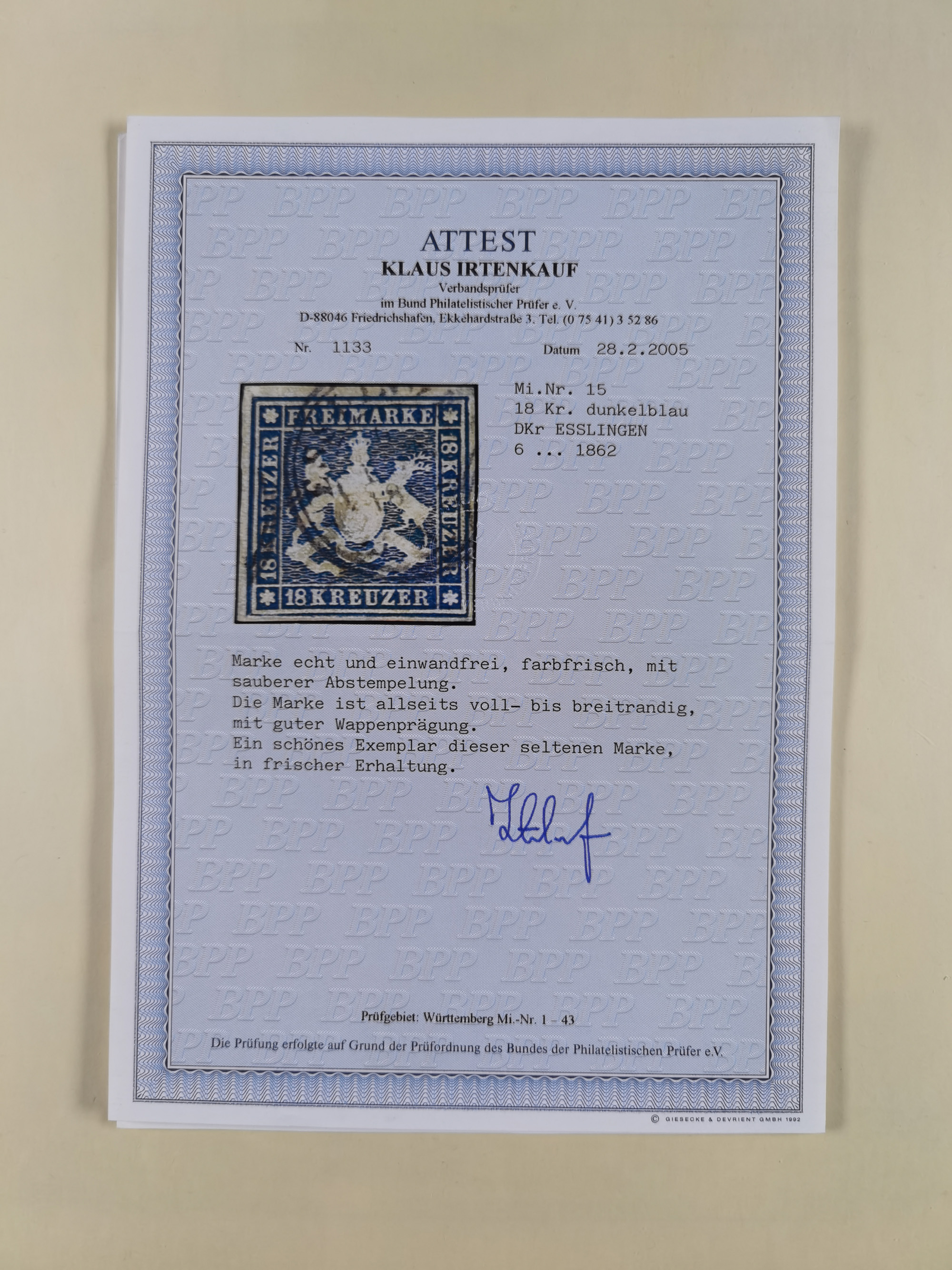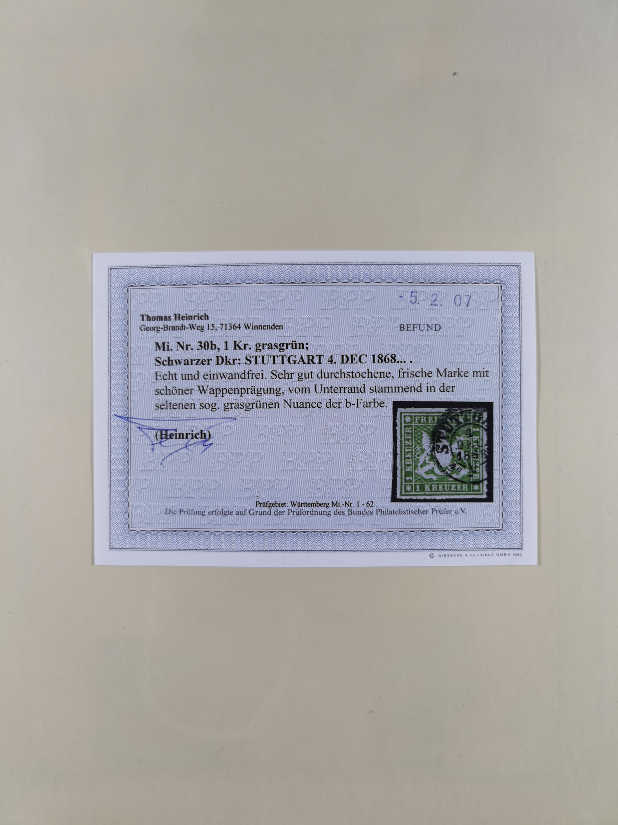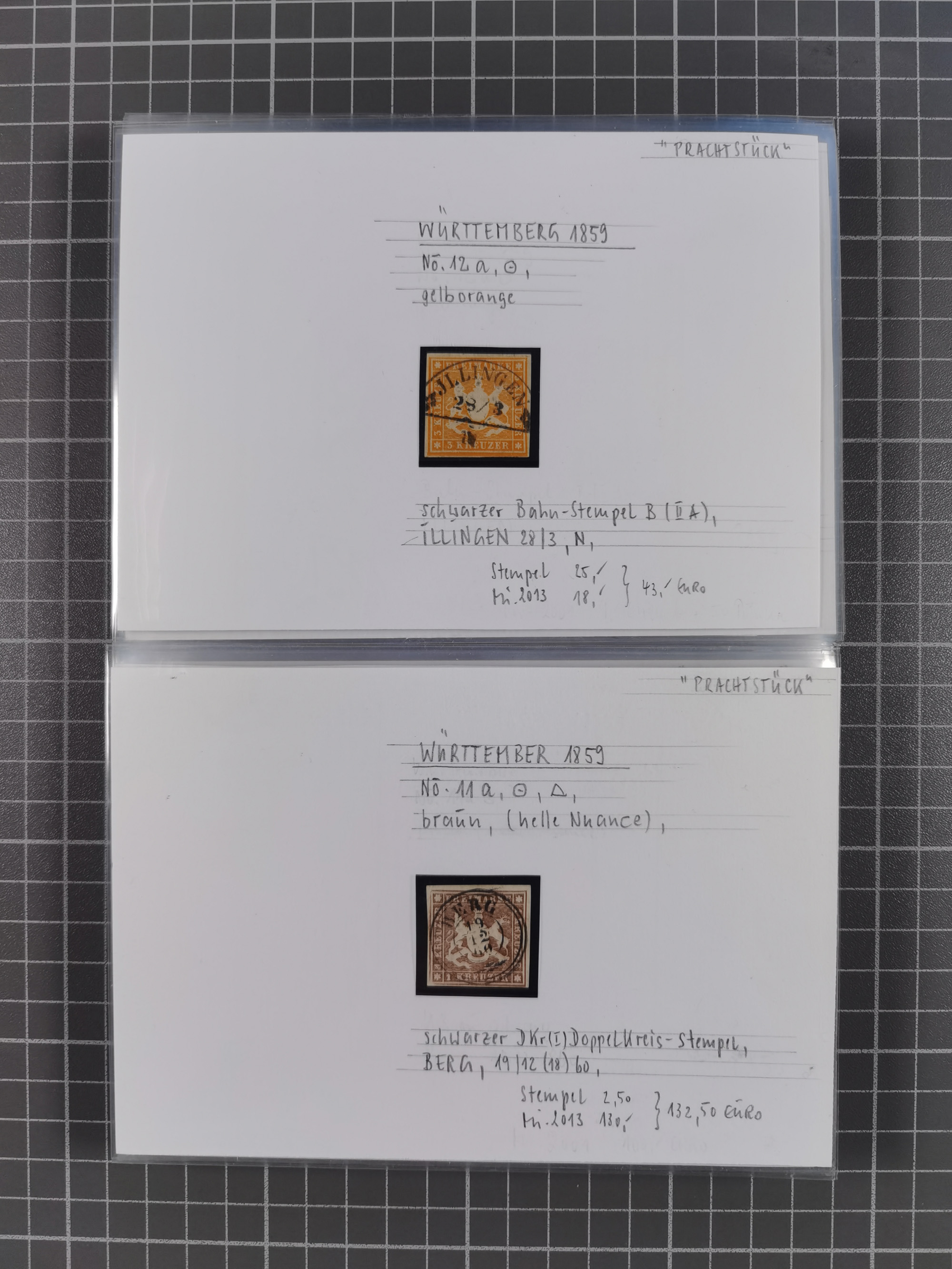 1851/1923, umfangreiche gestempelte Sammlung mit fast allen besseren Marken, vielen Farben und Besonderheiten. Dabei u.a. Mi.-Nr. Nr. 1c auf Briefstück (doppelt sign. Heinrich BPP), Mi.-Nr. 5I (FA Thoma BPP), Mi.-Nr. 5II (FA Heinrich BPP), Mi.-Nr. 9b (FA Irtenkauf BPP), Mi.-Nr. 10a auf Briefstück (FA Heinrich BPP), Mi.-Nr. 14b (FA Irtenkauf BPP), Mi.-Nr. 15 (FA Irtenkauf BPP), Mi.-Nr. 19xb (FA Irtenkauf BPP), Mi-Nr. 24 (FA Irtenkauf BPP), Mi.-Nr. 31c (FA Irtenkauf BPP), Mi.-Nr. 42b mit glasklarem EKr. “LUDWIGSBURG” (sign. Pfenninger mit FA), Mi.-Nr. 188 (FA Winkler BPP), Mi.-Nr. 211 (FA Thoma BPP), Mi.-Nr. 231aa (FA Winkler BPP) und Mi.-Nr. 264d (FA Winkler BPP). Fast durchgehend in guter Erhaltung mit ausgesucht schönen Stempeln, bessere Marken alle signiert bzw. mit KB, FB und Fotoattesten. Eine besonders empfehlenswerte Sammlung