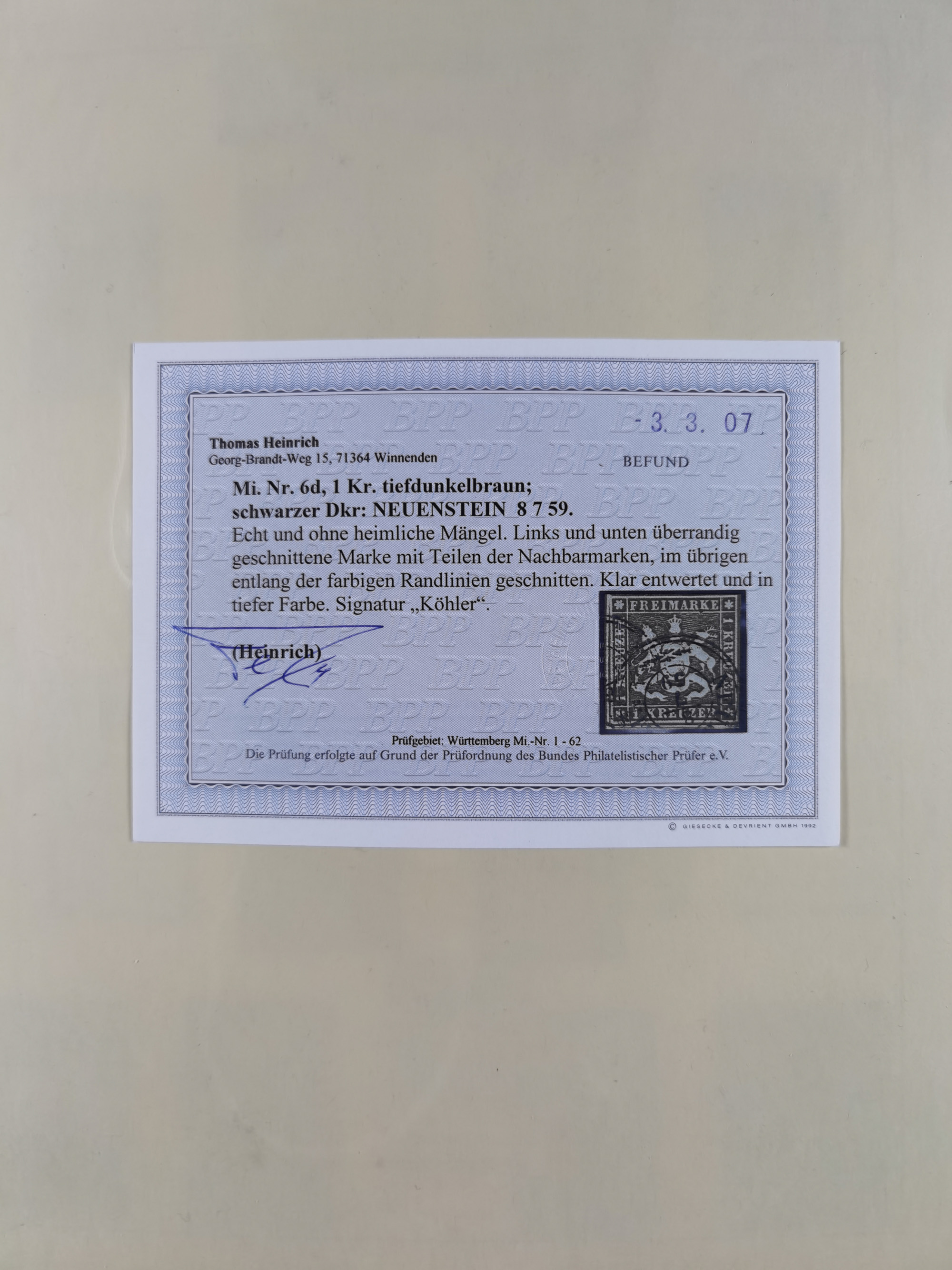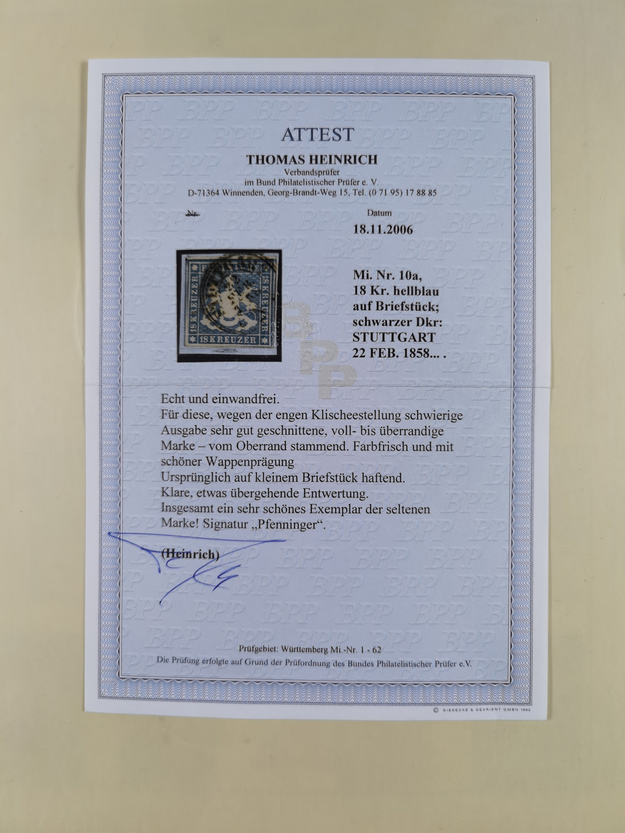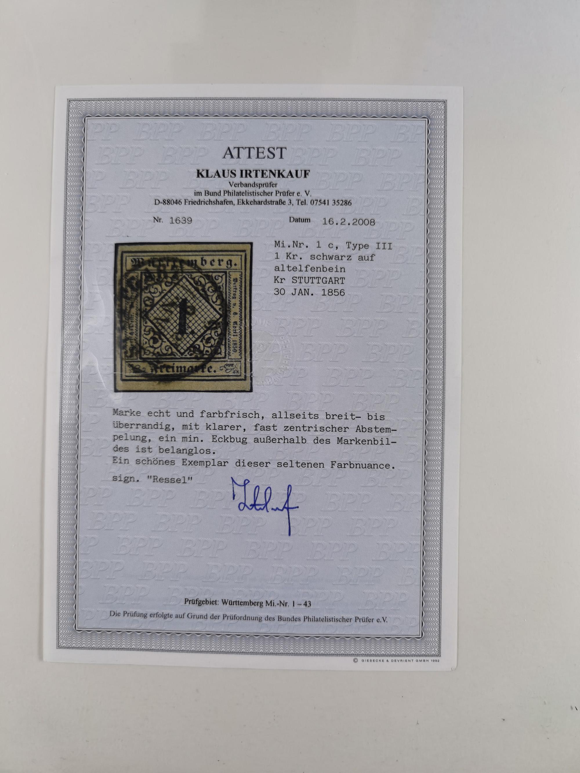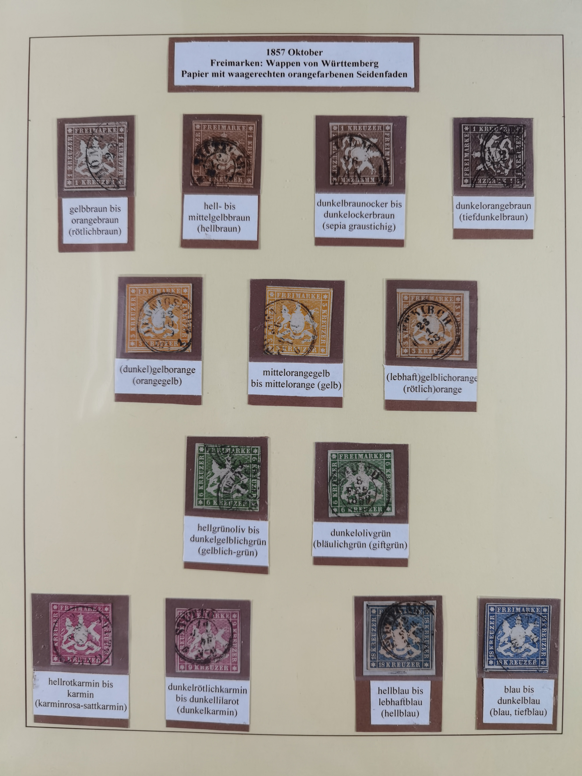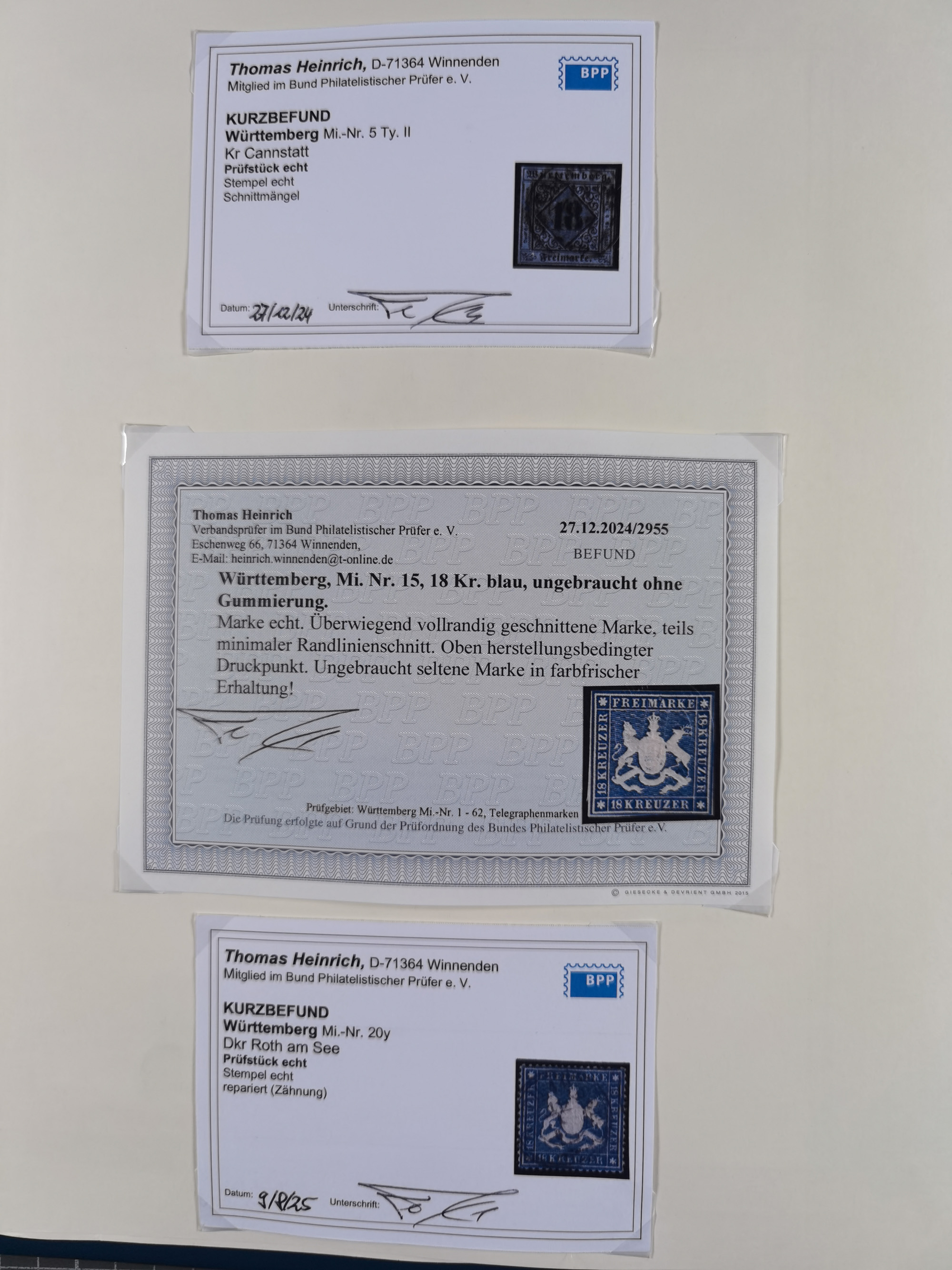 1851/1923, umfangreiche gestempelte Sammlung mit fast allen besseren Marken, vielen Farben und Besonderheiten. Dabei u.a. Mi.-Nr. Nr. 1c auf Briefstück (doppelt sign. Heinrich BPP), Mi.-Nr. 5I (FA Thoma BPP), Mi.-Nr. 5II (FA Heinrich BPP), Mi.-Nr. 9b (FA Irtenkauf BPP), Mi.-Nr. 10a auf Briefstück (FA Heinrich BPP), Mi.-Nr. 14b (FA Irtenkauf BPP), Mi.-Nr. 15 (FA Irtenkauf BPP), Mi.-Nr. 19xb (FA Irtenkauf BPP), Mi-Nr. 24 (FA Irtenkauf BPP), Mi.-Nr. 31c (FA Irtenkauf BPP), Mi.-Nr. 42b mit glasklarem EKr. “LUDWIGSBURG” (sign. Pfenninger mit FA), Mi.-Nr. 188 (FA Winkler BPP), Mi.-Nr. 211 (FA Thoma BPP), Mi.-Nr. 231aa (FA Winkler BPP) und Mi.-Nr. 264d (FA Winkler BPP). Fast durchgehend in guter Erhaltung mit ausgesucht schönen Stempeln, bessere Marken alle signiert bzw. mit KB, FB und Fotoattesten. Eine besonders empfehlenswerte Sammlung