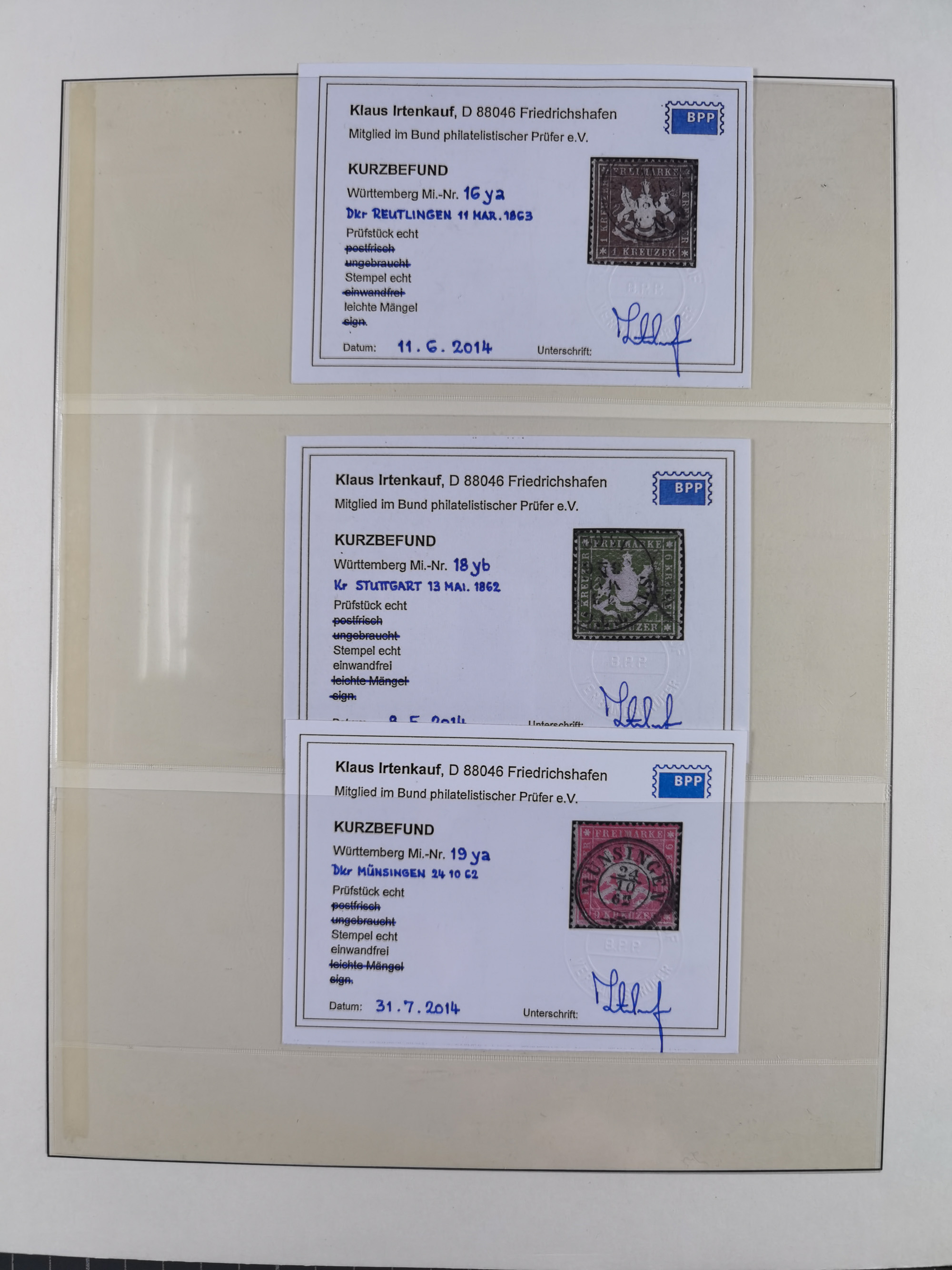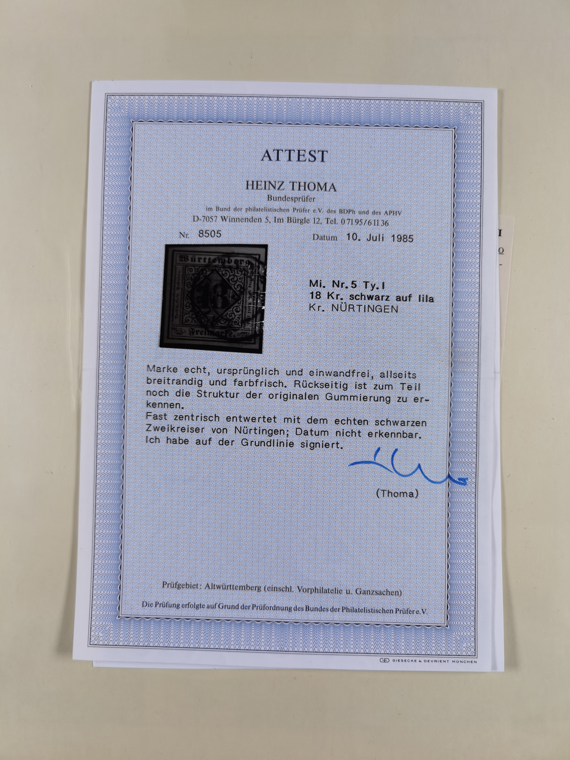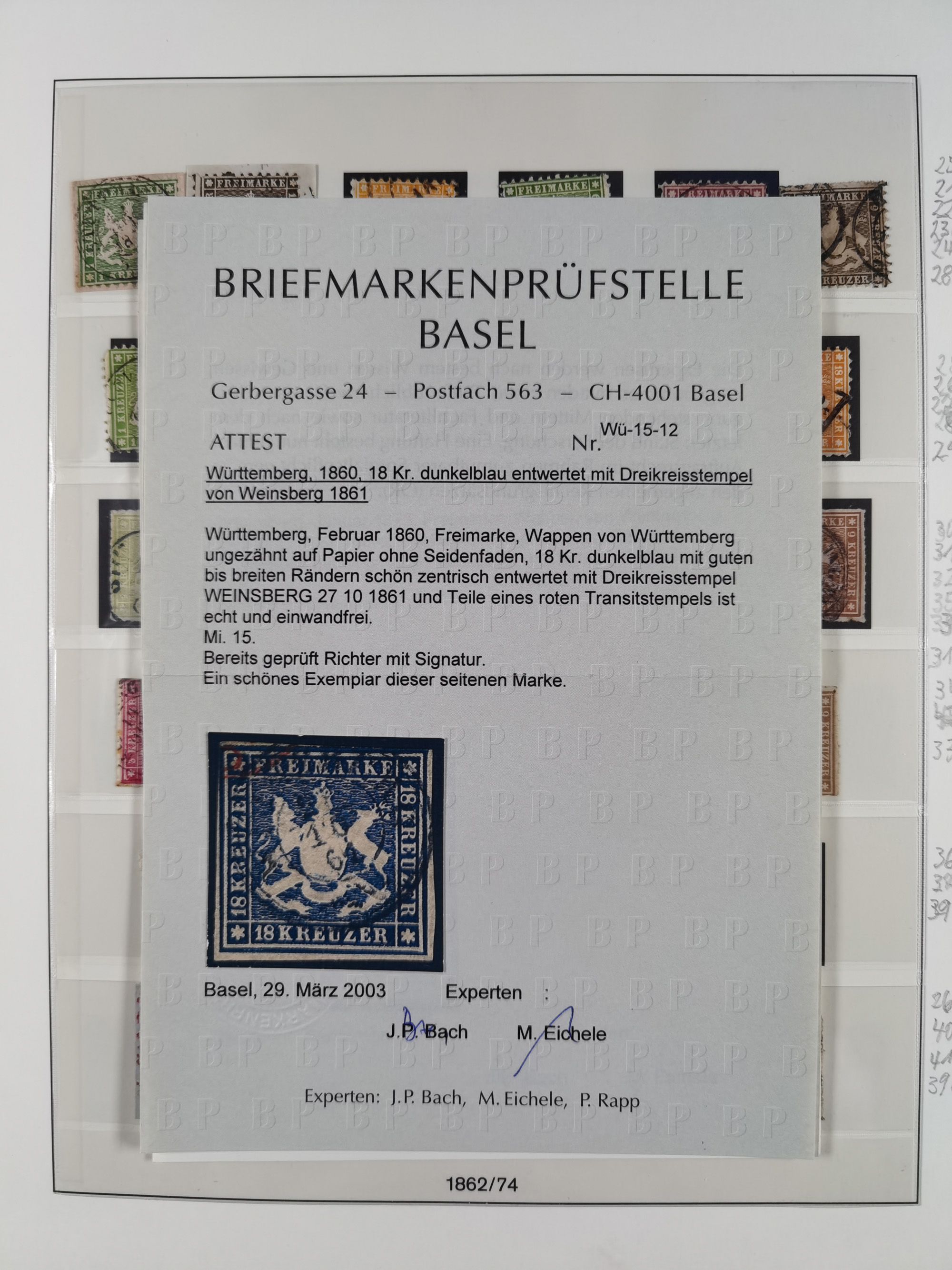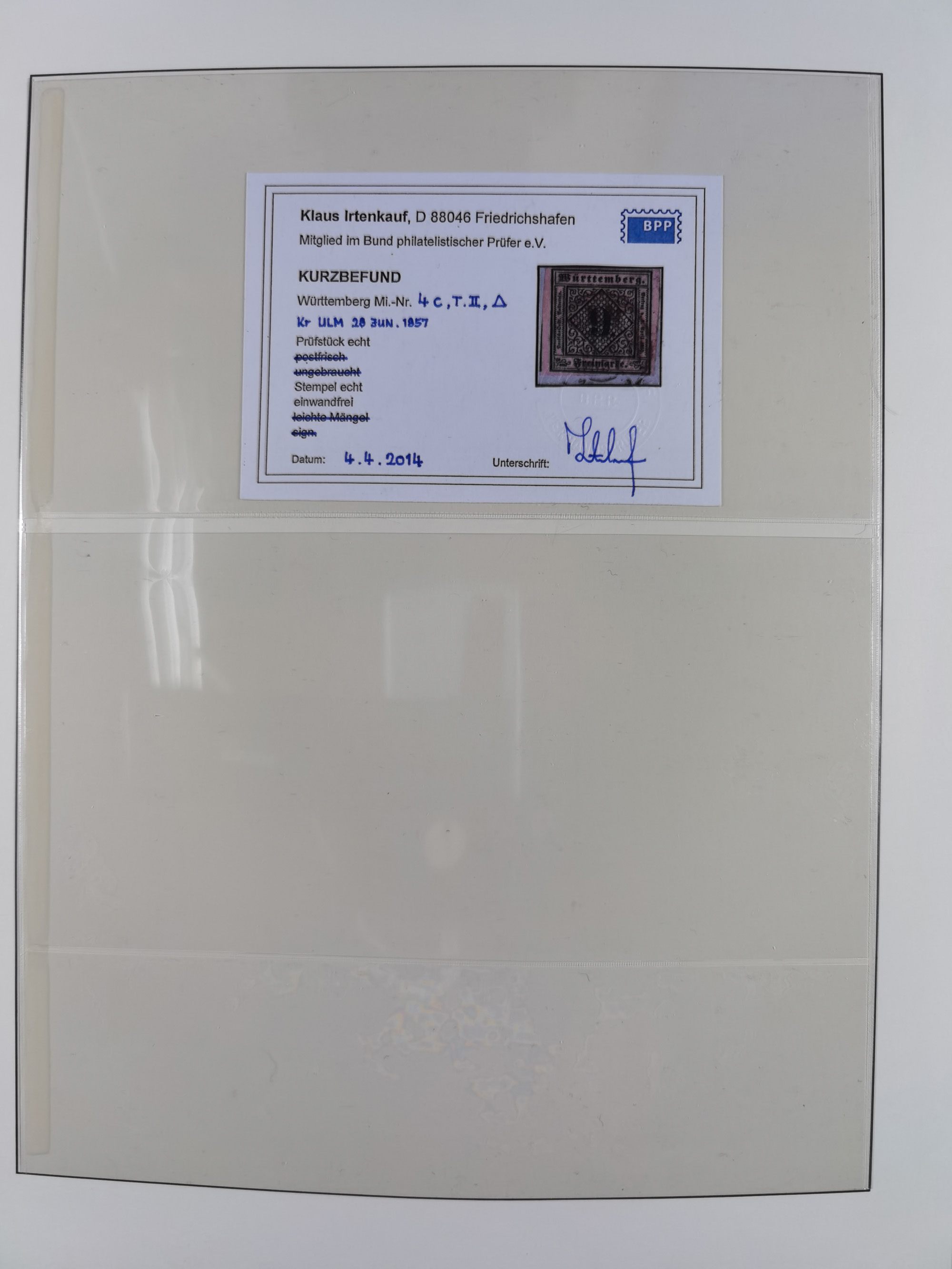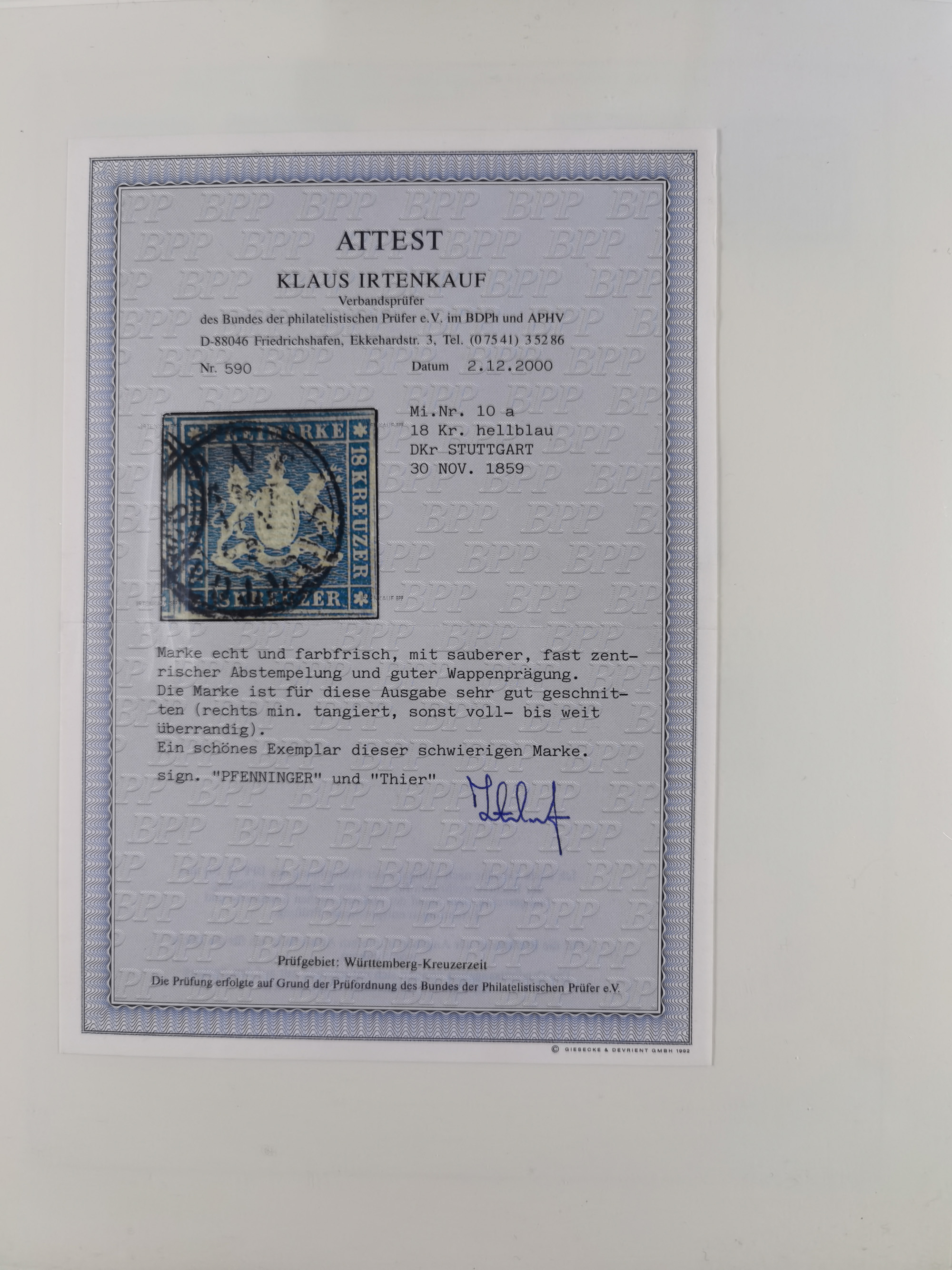 1851/1923, umfangreiche gestempelte Sammlung mit fast allen besseren Marken, vielen Farben und Besonderheiten. Dabei u.a. Mi.-Nr. Nr. 1c auf Briefstück (doppelt sign. Heinrich BPP), Mi.-Nr. 5I (FA Thoma BPP), Mi.-Nr. 5II (FA Heinrich BPP), Mi.-Nr. 9b (FA Irtenkauf BPP), Mi.-Nr. 10a auf Briefstück (FA Heinrich BPP), Mi.-Nr. 14b (FA Irtenkauf BPP), Mi.-Nr. 15 (FA Irtenkauf BPP), Mi.-Nr. 19xb (FA Irtenkauf BPP), Mi-Nr. 24 (FA Irtenkauf BPP), Mi.-Nr. 31c (FA Irtenkauf BPP), Mi.-Nr. 42b mit glasklarem EKr. “LUDWIGSBURG” (sign. Pfenninger mit FA), Mi.-Nr. 188 (FA Winkler BPP), Mi.-Nr. 211 (FA Thoma BPP), Mi.-Nr. 231aa (FA Winkler BPP) und Mi.-Nr. 264d (FA Winkler BPP). Fast durchgehend in guter Erhaltung mit ausgesucht schönen Stempeln, bessere Marken alle signiert bzw. mit KB, FB und Fotoattesten. Eine besonders empfehlenswerte Sammlung