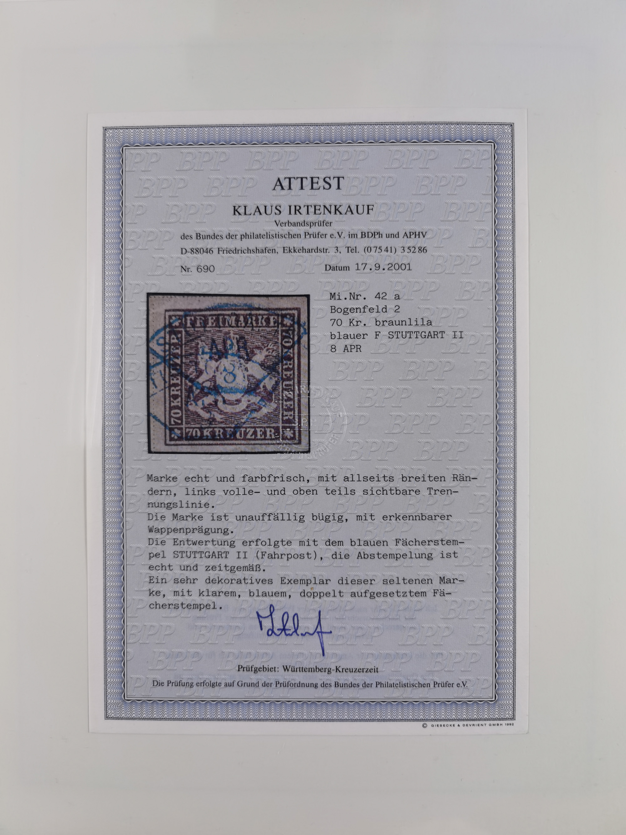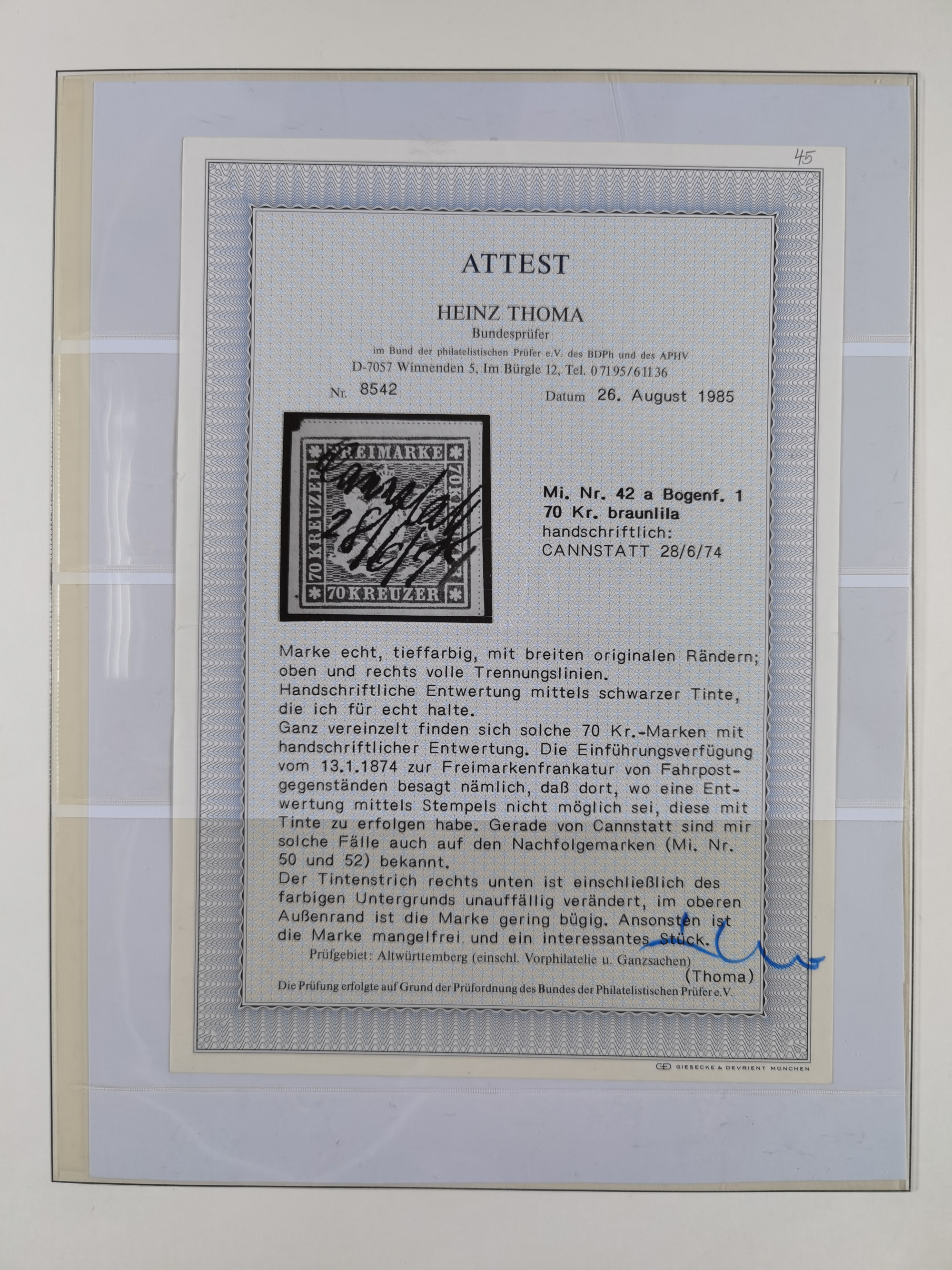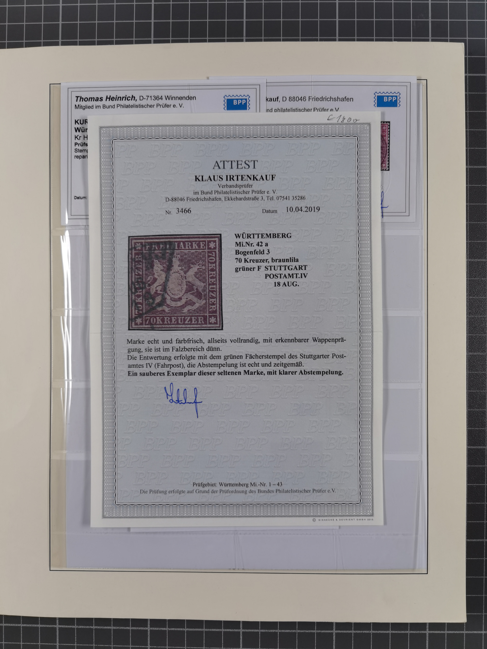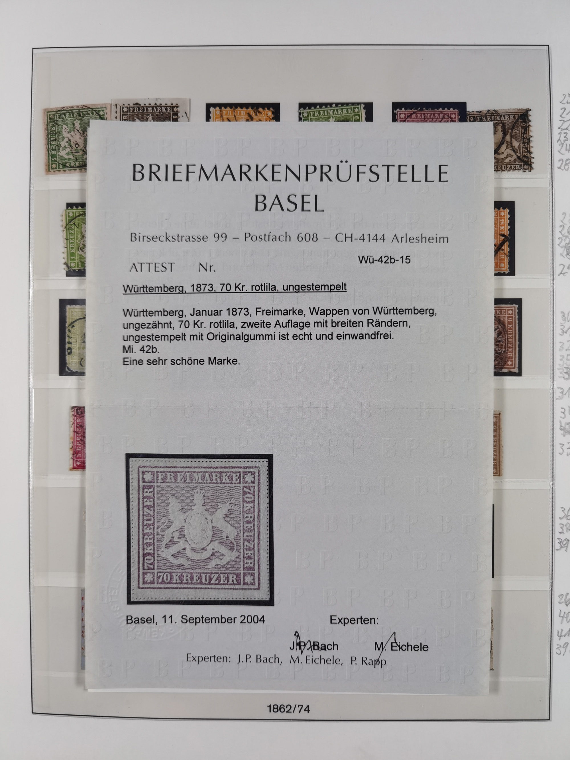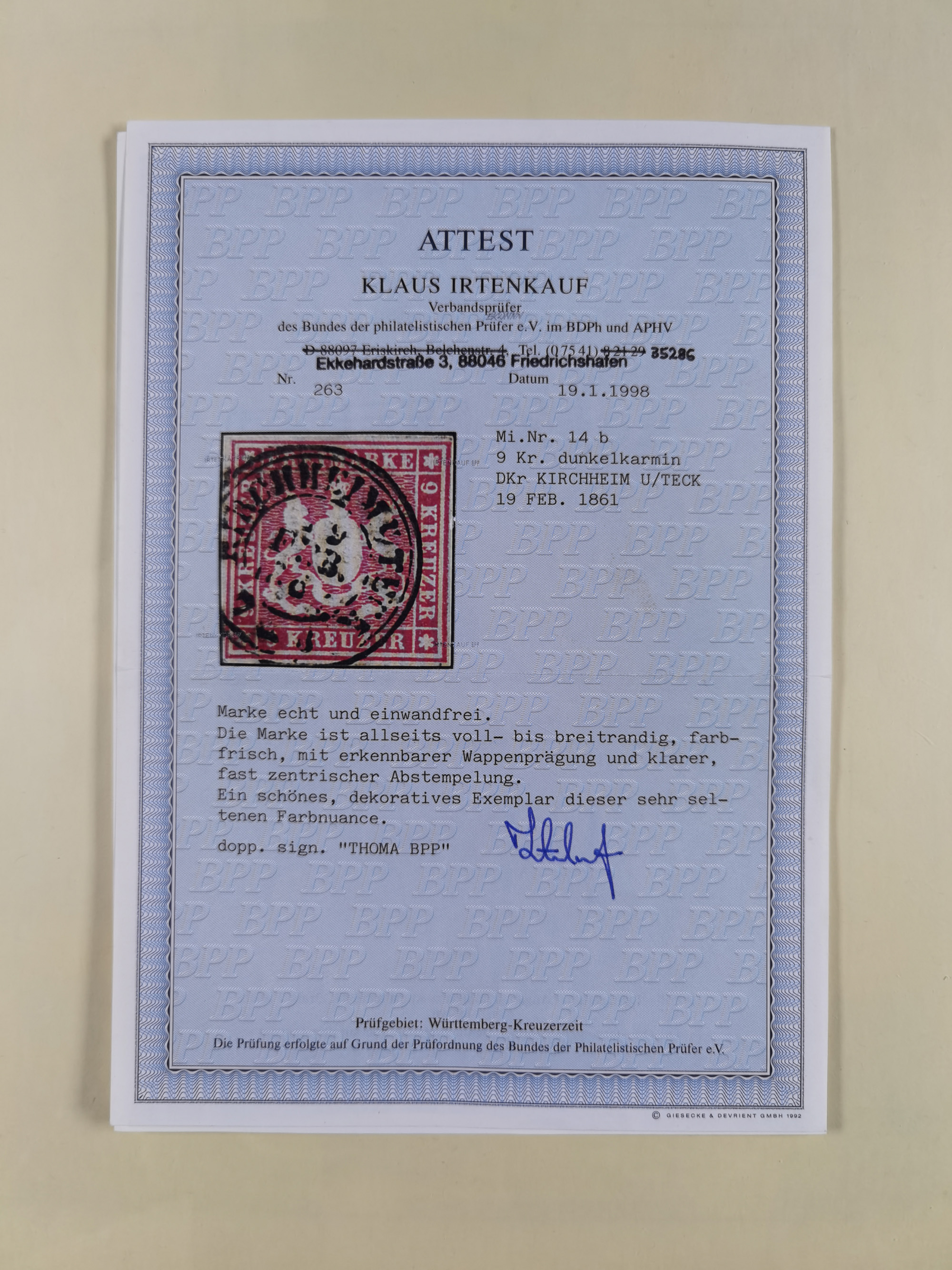 1851/1923, umfangreiche gestempelte Sammlung mit fast allen besseren Marken, vielen Farben und Besonderheiten. Dabei u.a. Mi.-Nr. Nr. 1c auf Briefstück (doppelt sign. Heinrich BPP), Mi.-Nr. 5I (FA Thoma BPP), Mi.-Nr. 5II (FA Heinrich BPP), Mi.-Nr. 9b (FA Irtenkauf BPP), Mi.-Nr. 10a auf Briefstück (FA Heinrich BPP), Mi.-Nr. 14b (FA Irtenkauf BPP), Mi.-Nr. 15 (FA Irtenkauf BPP), Mi.-Nr. 19xb (FA Irtenkauf BPP), Mi-Nr. 24 (FA Irtenkauf BPP), Mi.-Nr. 31c (FA Irtenkauf BPP), Mi.-Nr. 42b mit glasklarem EKr. “LUDWIGSBURG” (sign. Pfenninger mit FA), Mi.-Nr. 188 (FA Winkler BPP), Mi.-Nr. 211 (FA Thoma BPP), Mi.-Nr. 231aa (FA Winkler BPP) und Mi.-Nr. 264d (FA Winkler BPP). Fast durchgehend in guter Erhaltung mit ausgesucht schönen Stempeln, bessere Marken alle signiert bzw. mit KB, FB und Fotoattesten. Eine besonders empfehlenswerte Sammlung