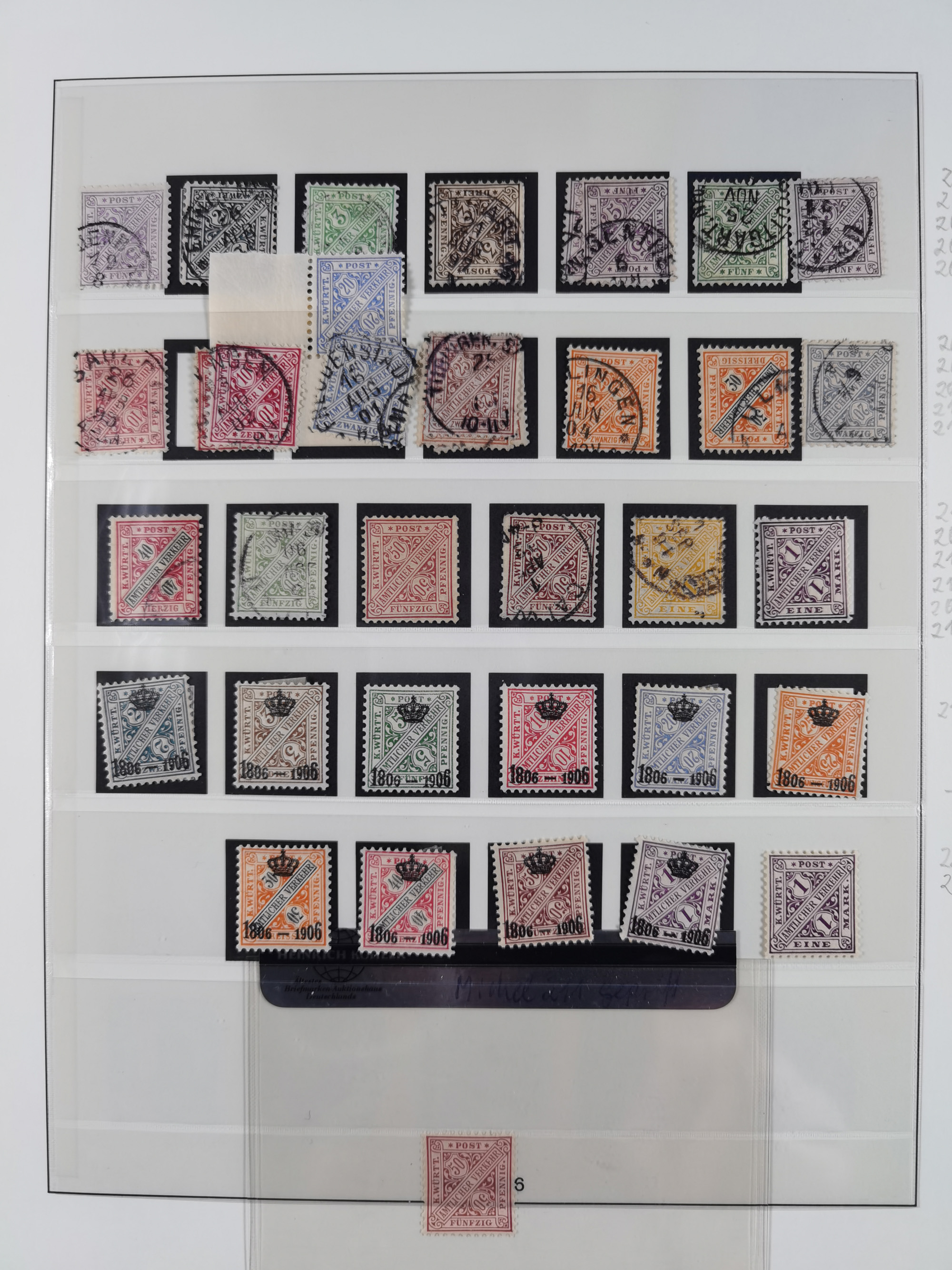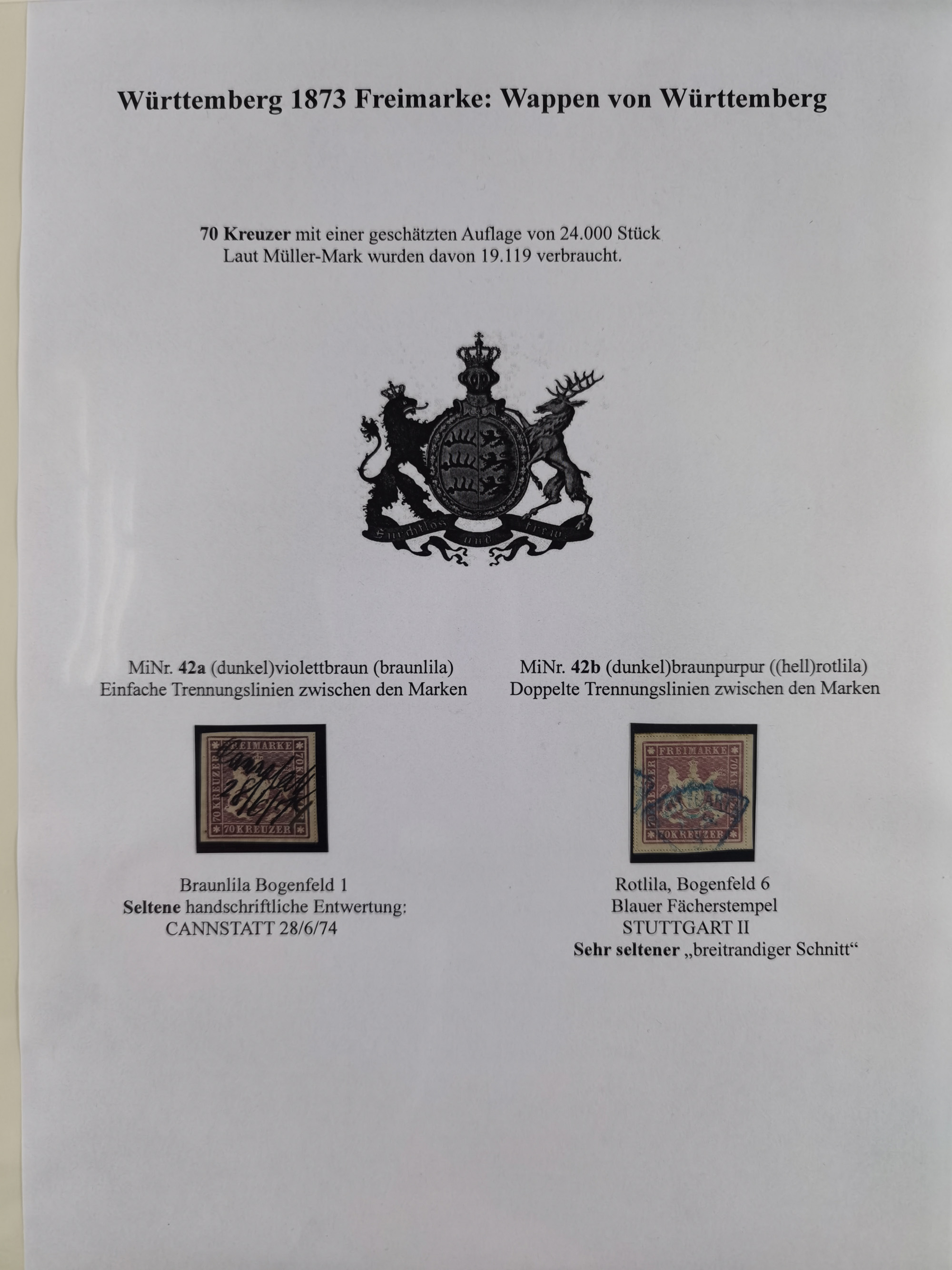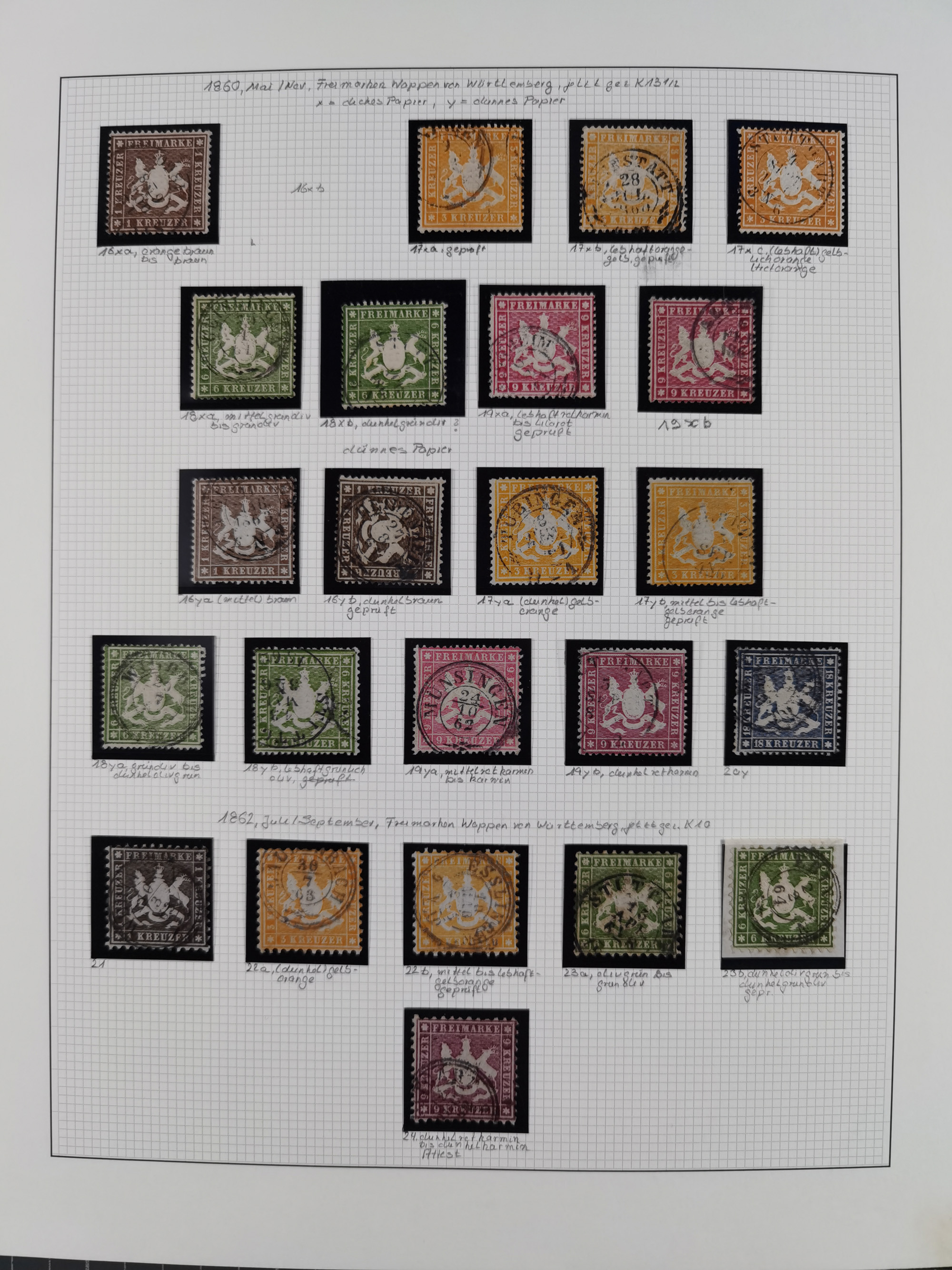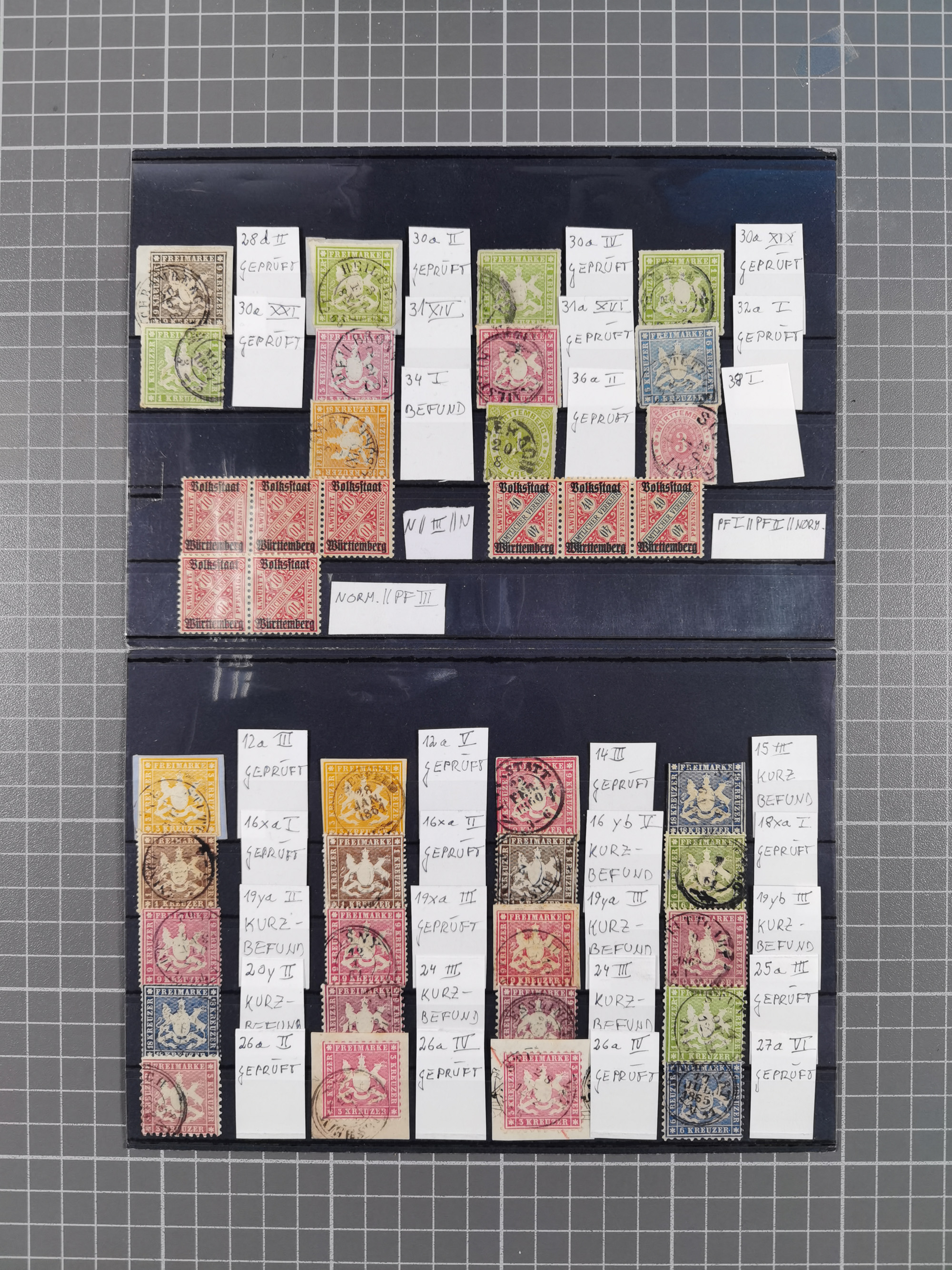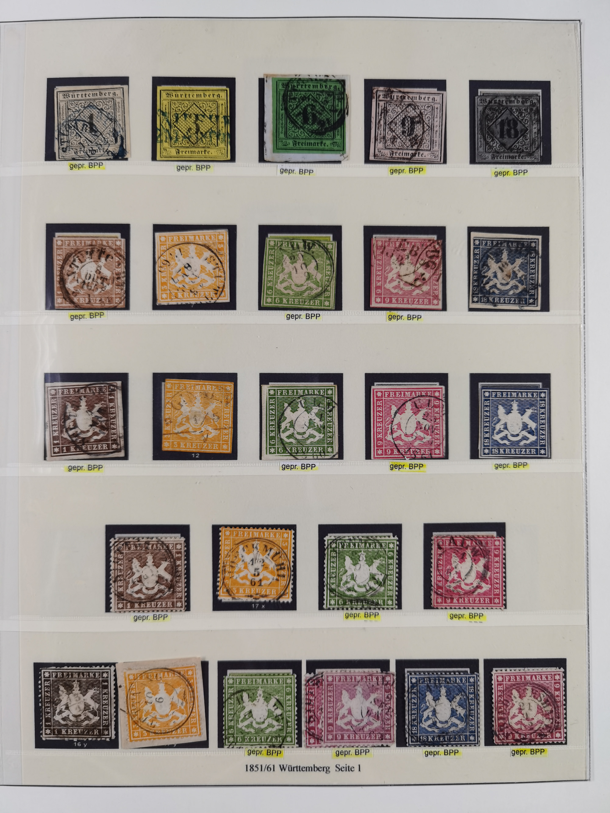 1851/1920, meist gestempelte Sammlung, dabei u.a. elf 18 Kreuzer Werte, teils mit seltenen Plattenfehlern, dabei u.a. Mi.-Nr. 5 gestempelt, 15 ohne Gummi, 8a PF II, 34 PF III, je gestempelt, 42a breitrandig mit handschriftl. Entwertung von Cannstatt, 42b sehr breitrandig mit blauem Fächer-Stempel, 50, 54 postfrisch, etc., Pfennig Teil oft sign. Infla Berlin, teils signiert bzw. 17 Kurz-/Befunde oder Fotoatteste BPP, teils fehlerhaft, meist aber gute Erhaltung