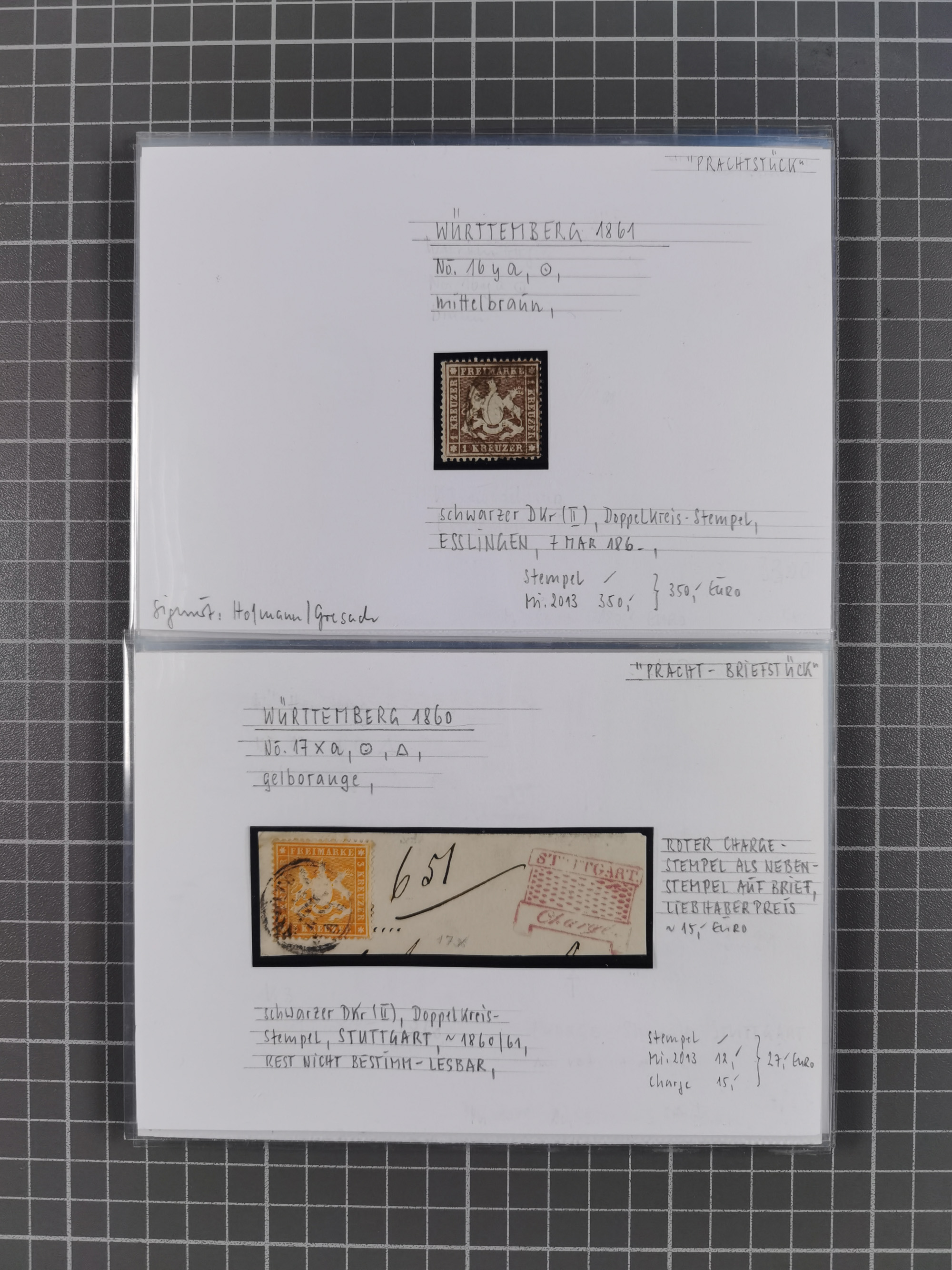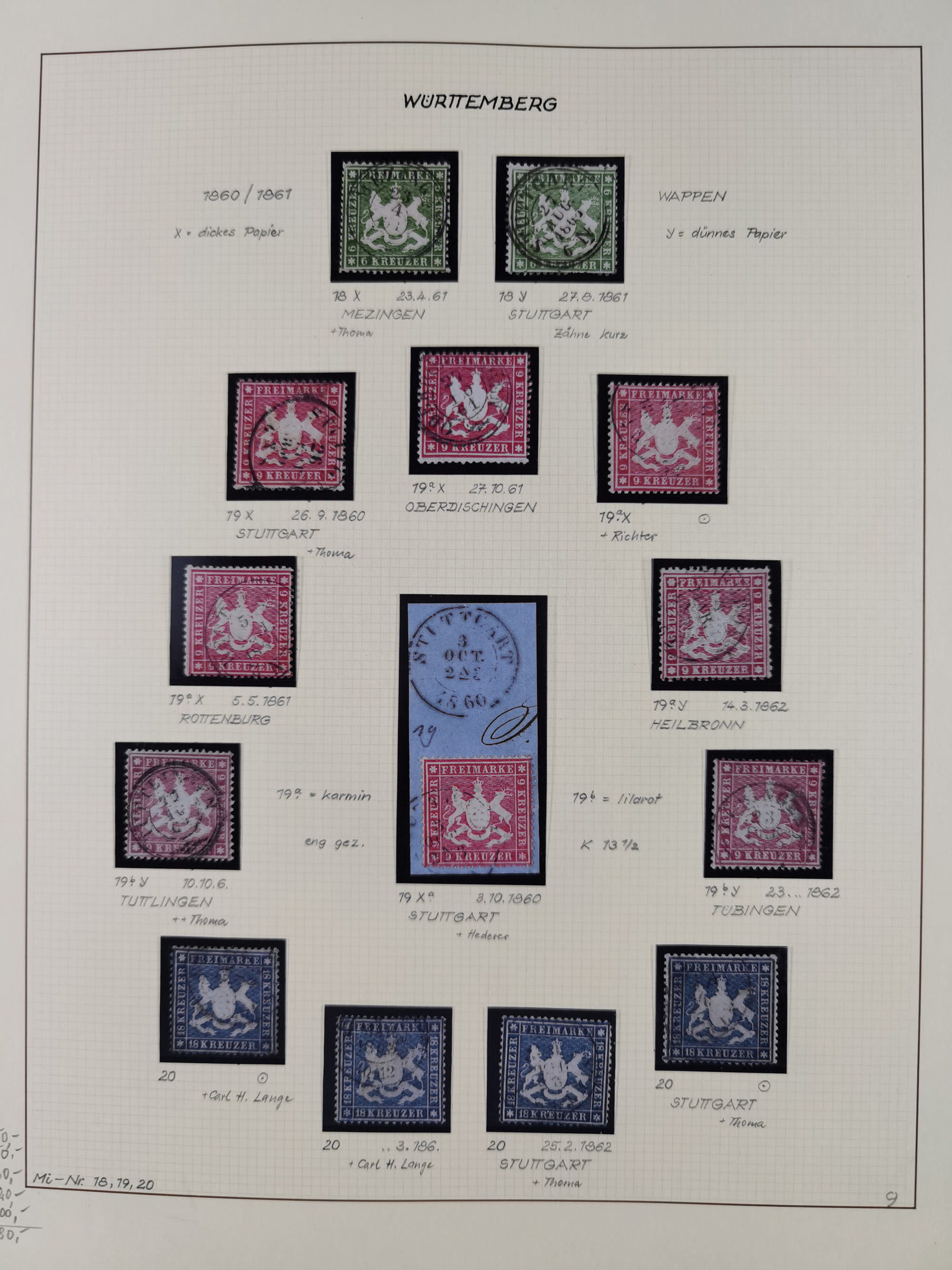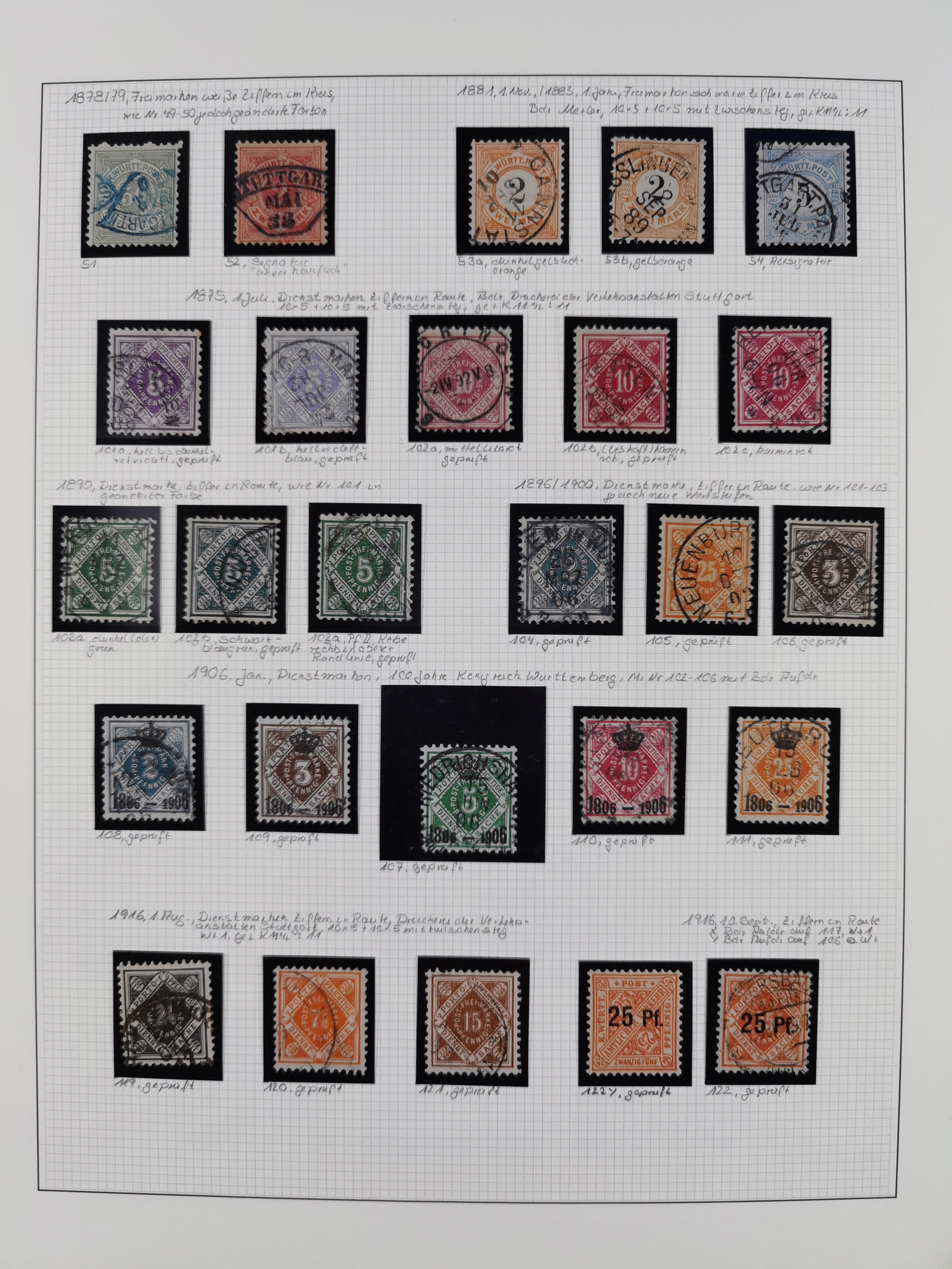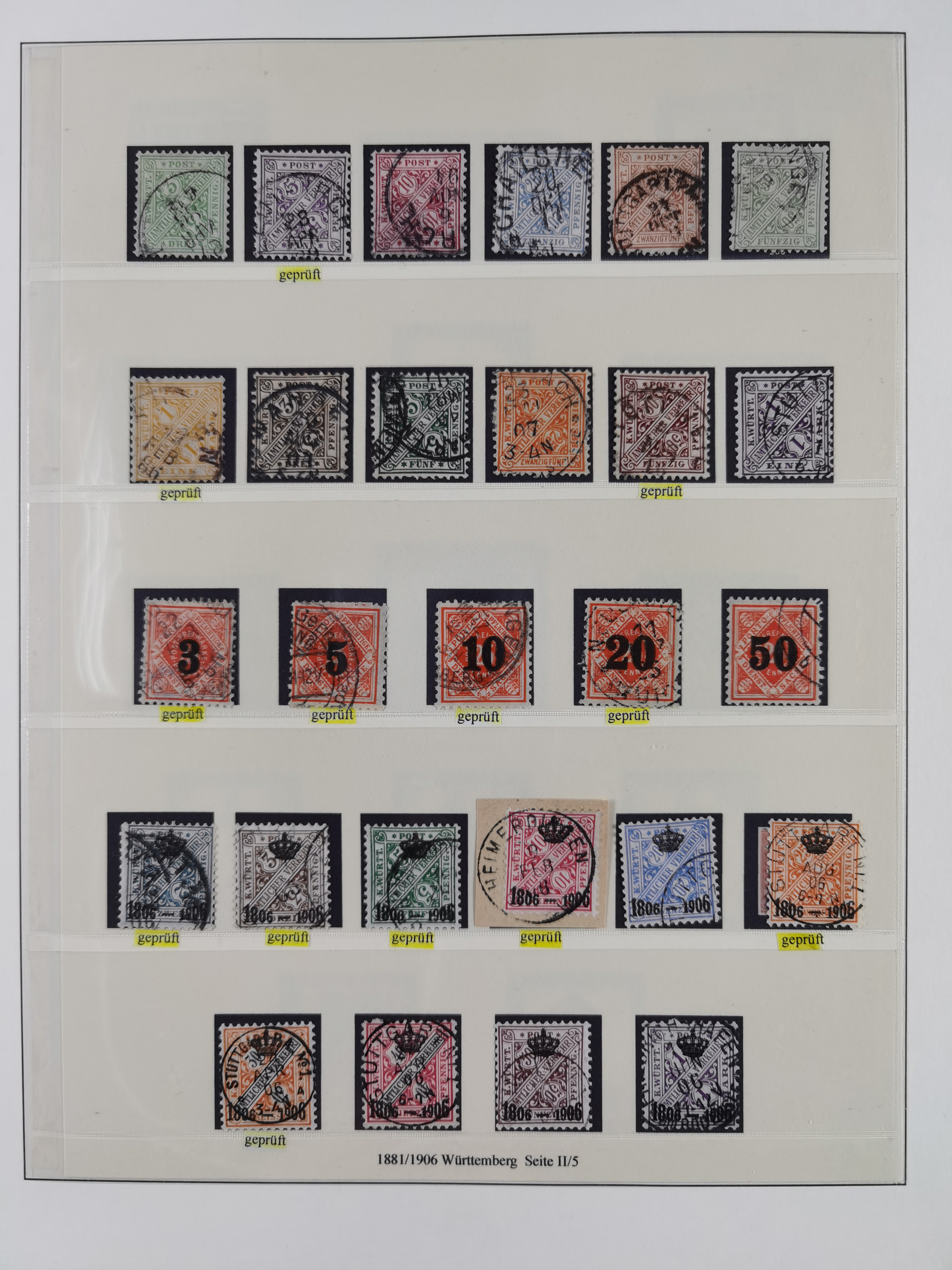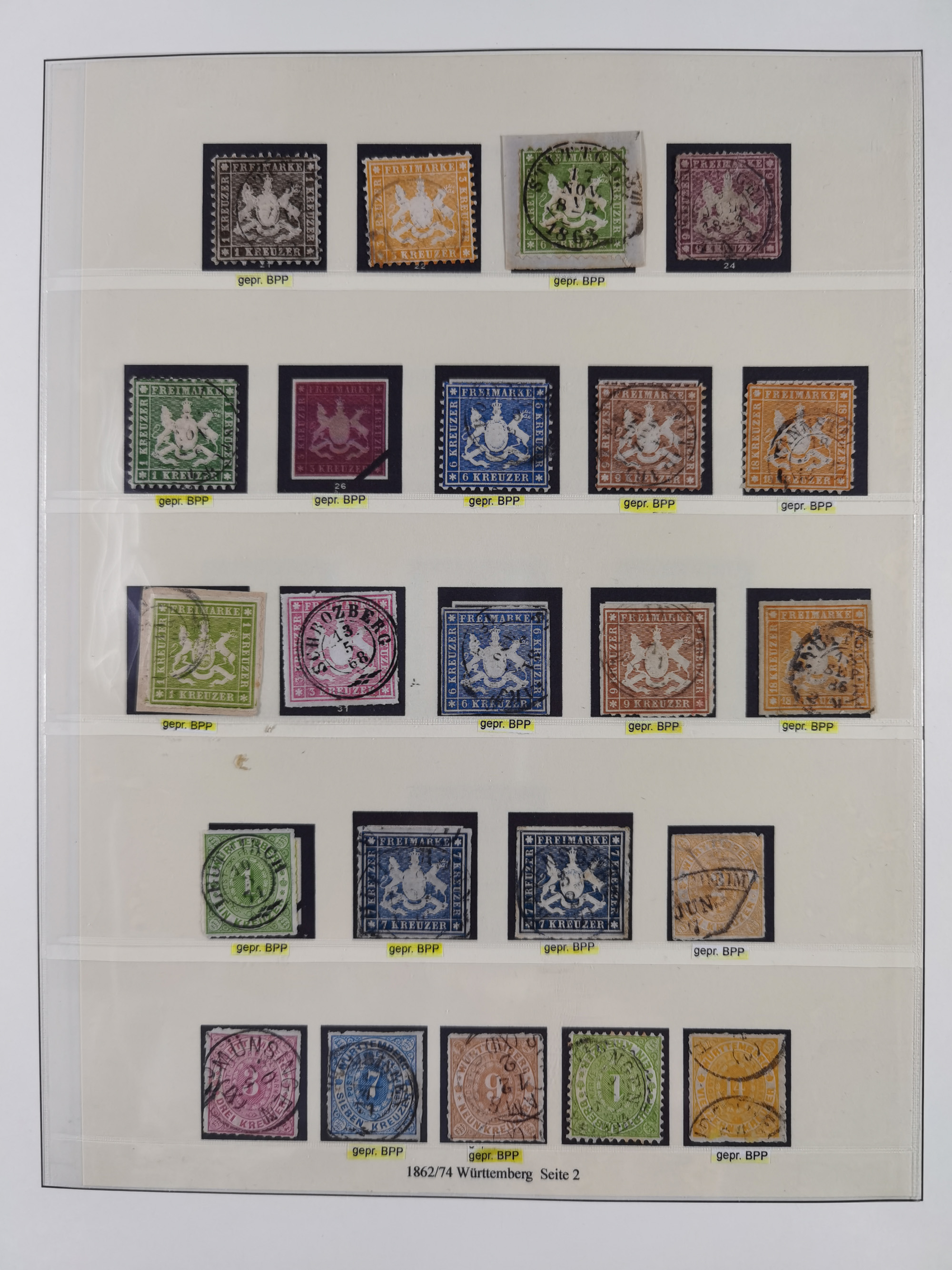 1851/1920, meist gestempelte Sammlung, dabei u.a. elf 18 Kreuzer Werte, teils mit seltenen Plattenfehlern, dabei u.a. Mi.-Nr. 5 gestempelt, 15 ohne Gummi, 8a PF II, 34 PF III, je gestempelt, 42a breitrandig mit handschriftl. Entwertung von Cannstatt, 42b sehr breitrandig mit blauem Fächer-Stempel, 50, 54 postfrisch, etc., Pfennig Teil oft sign. Infla Berlin, teils signiert bzw. 17 Kurz-/Befunde oder Fotoatteste BPP, teils fehlerhaft, meist aber gute Erhaltung