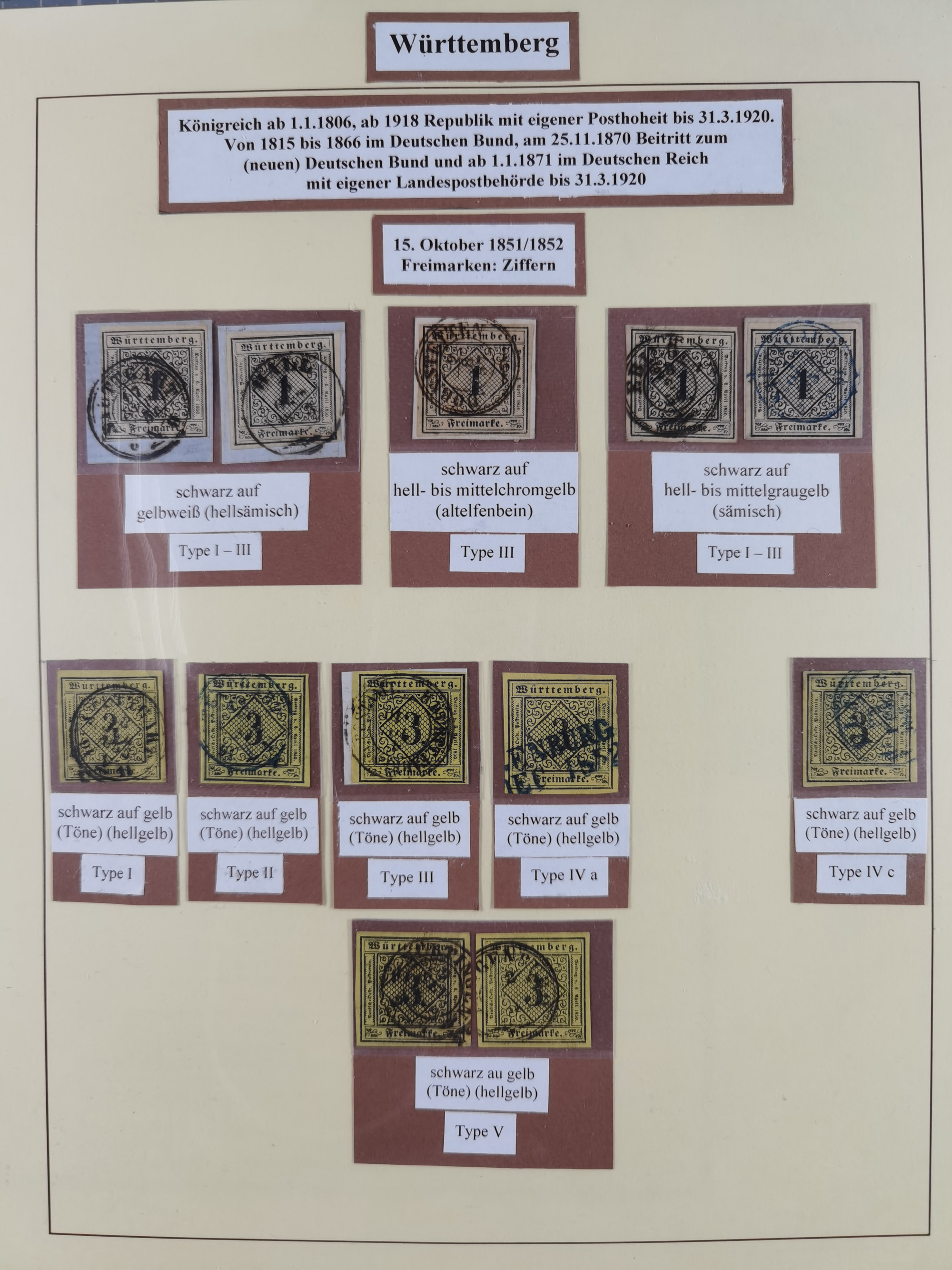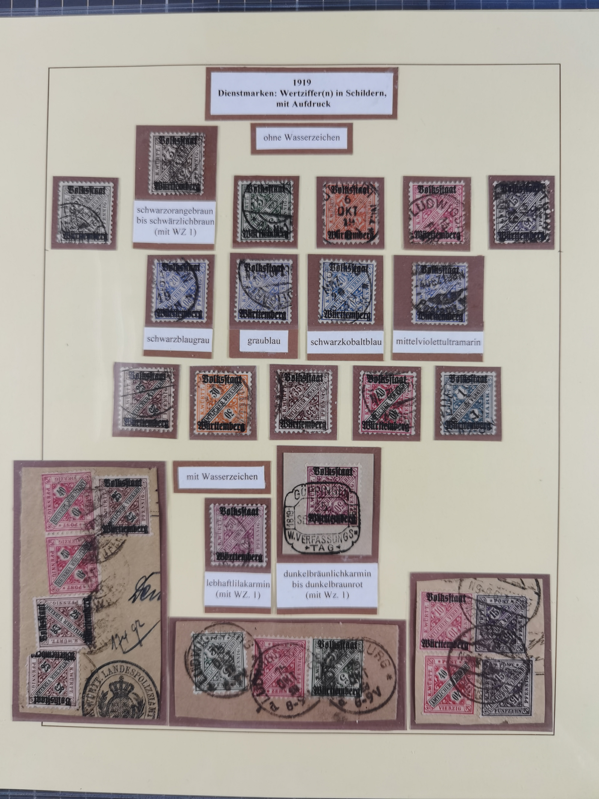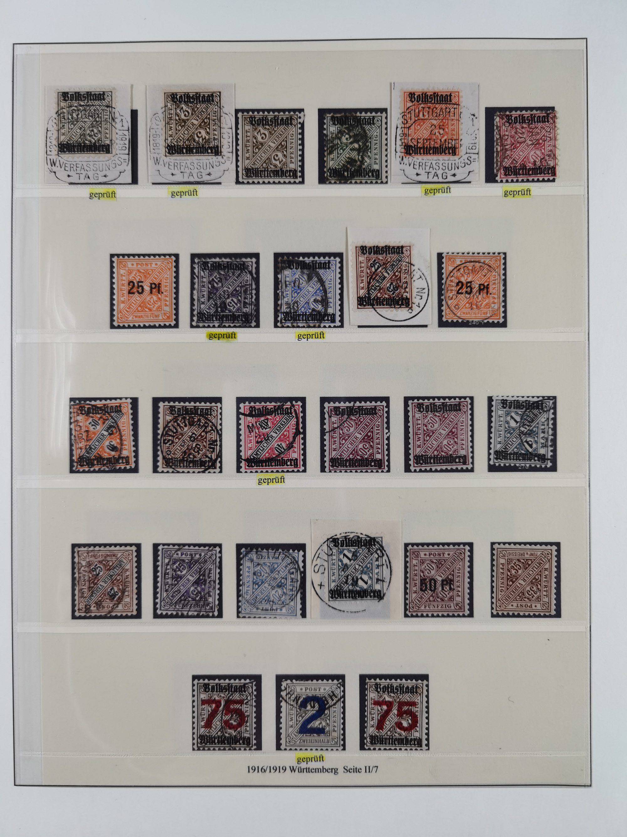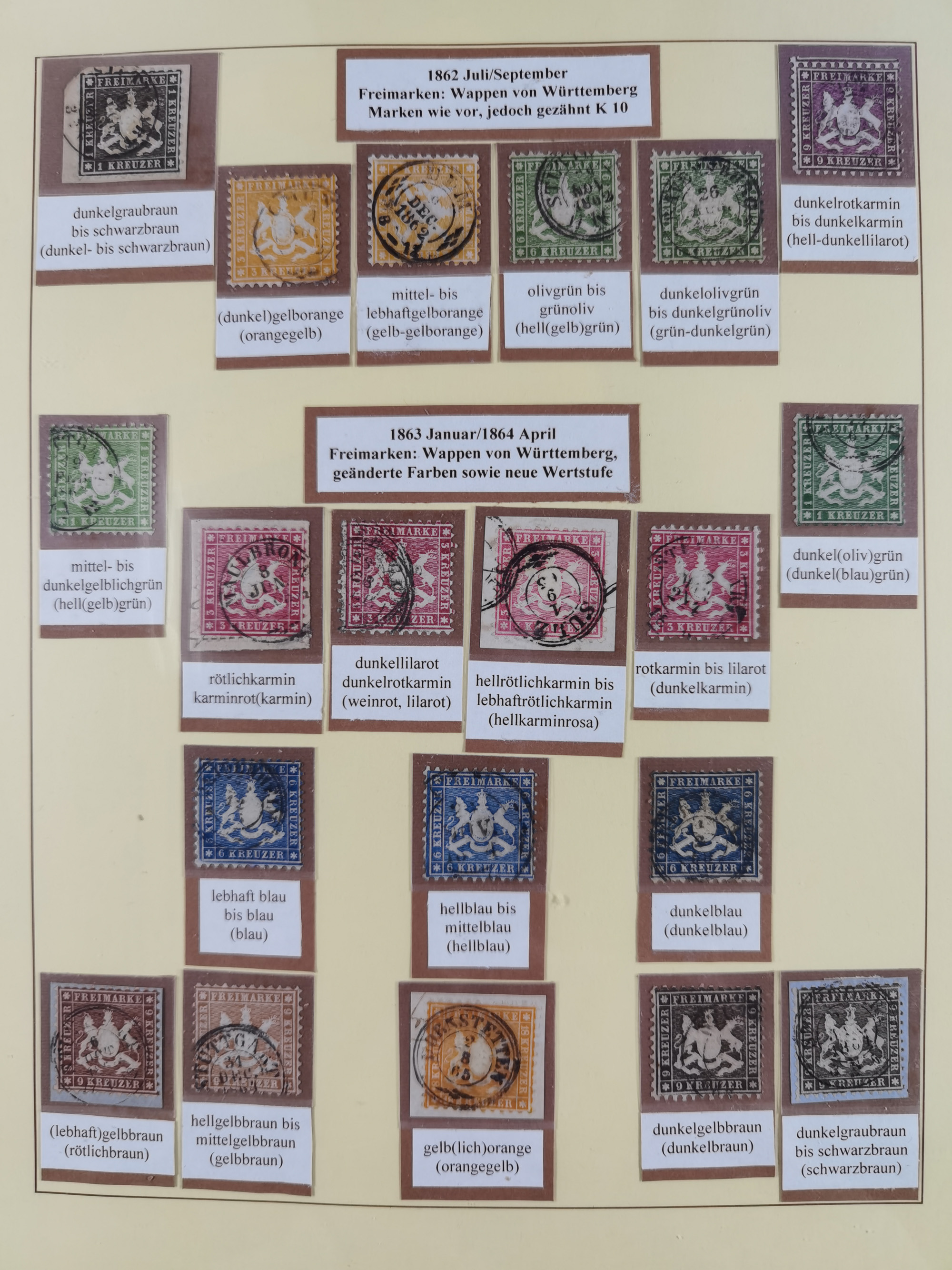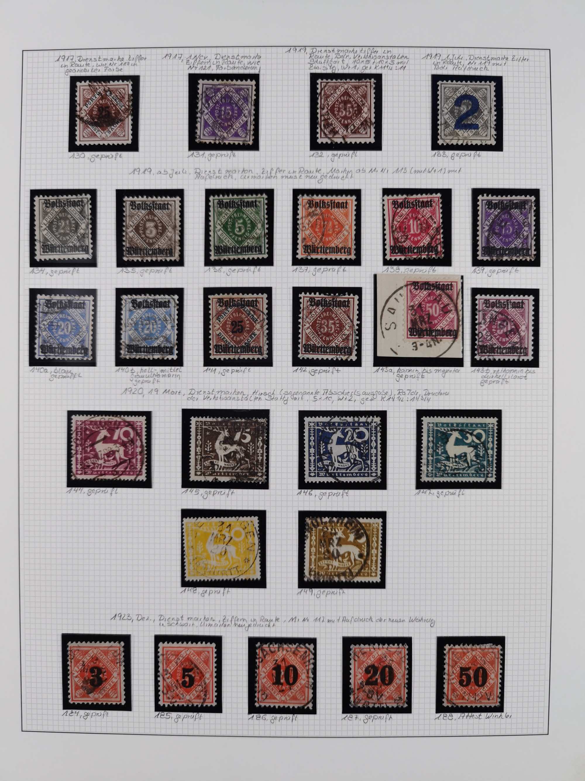 1851/1920, meist gestempelte Sammlung, dabei u.a. elf 18 Kreuzer Werte, teils mit seltenen Plattenfehlern, dabei u.a. Mi.-Nr. 5 gestempelt, 15 ohne Gummi, 8a PF II, 34 PF III, je gestempelt, 42a breitrandig mit handschriftl. Entwertung von Cannstatt, 42b sehr breitrandig mit blauem Fächer-Stempel, 50, 54 postfrisch, etc., Pfennig Teil oft sign. Infla Berlin, teils signiert bzw. 17 Kurz-/Befunde oder Fotoatteste BPP, teils fehlerhaft, meist aber gute Erhaltung