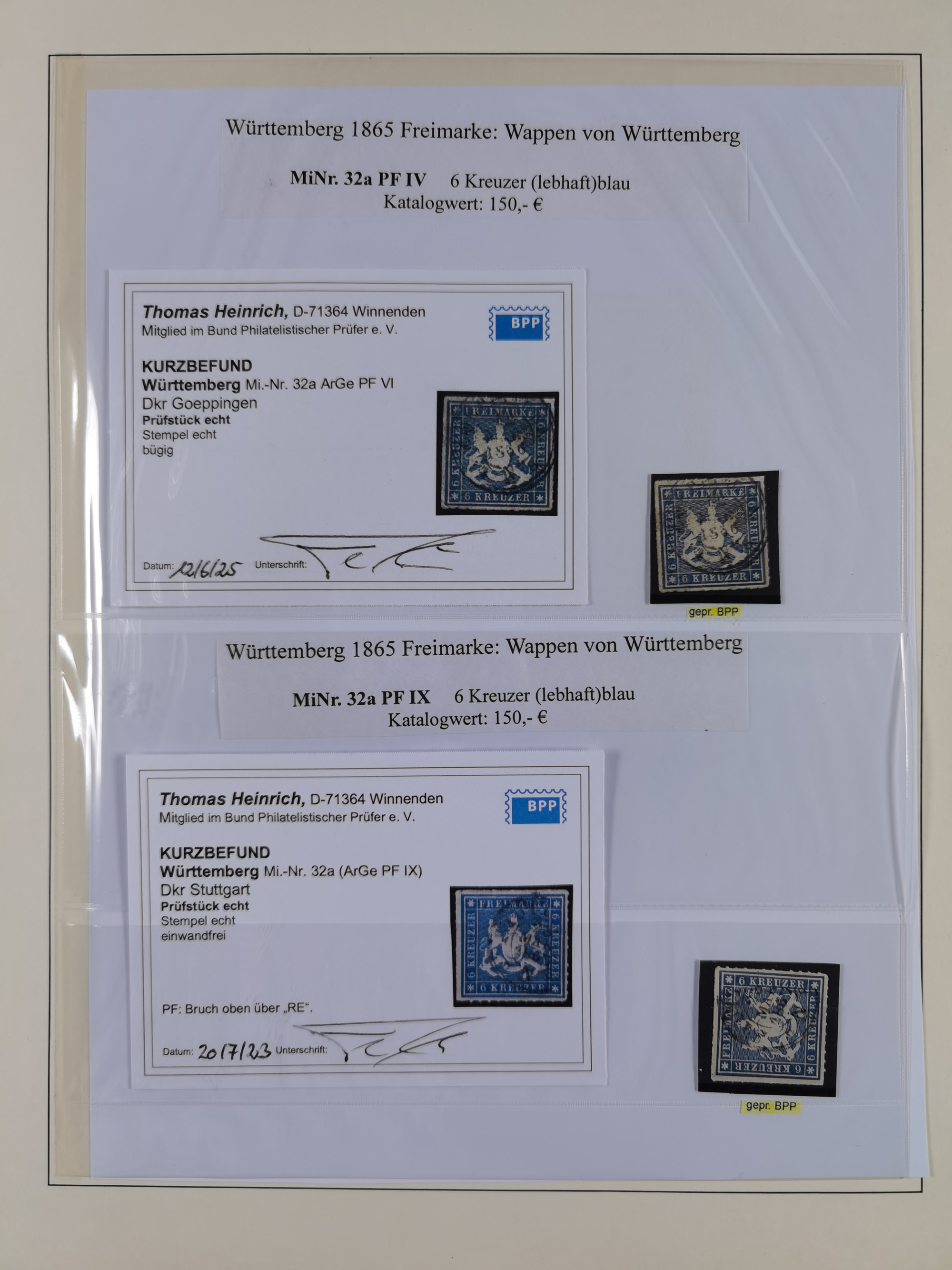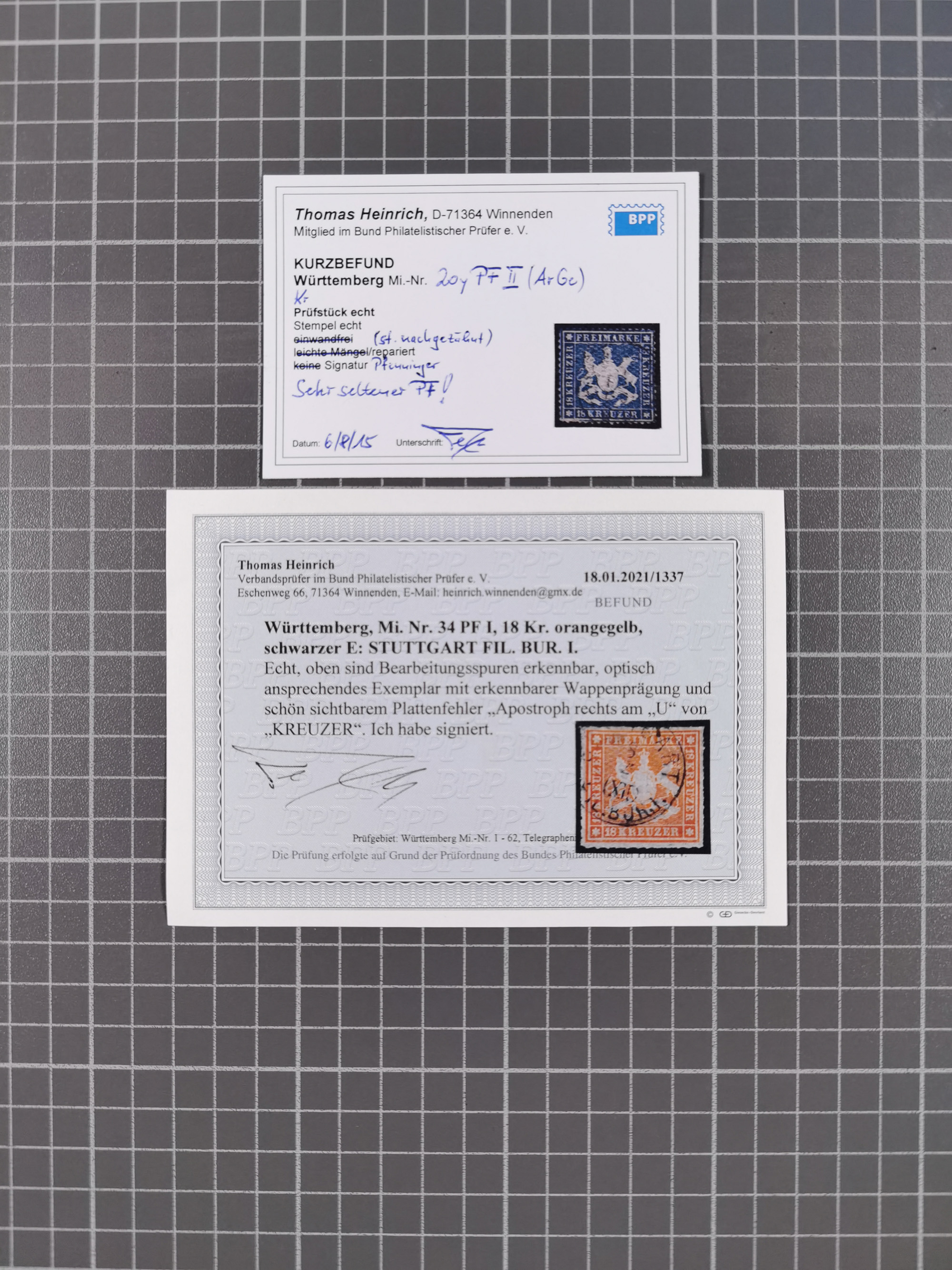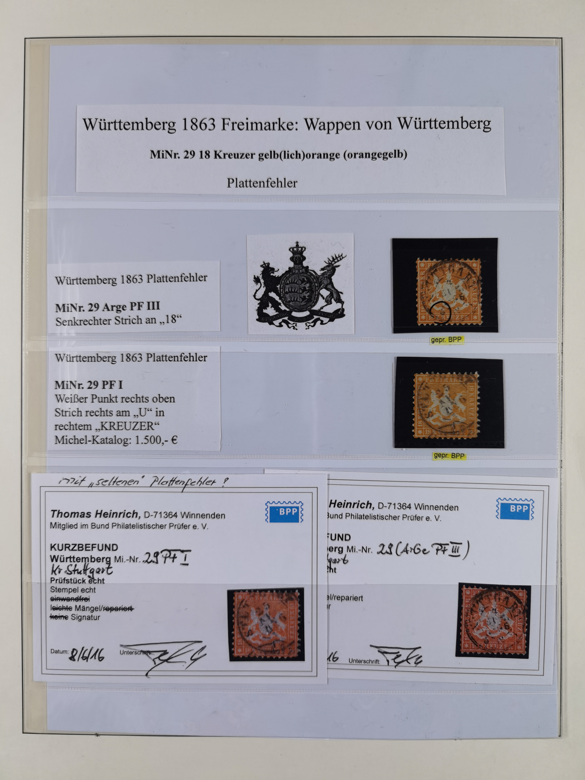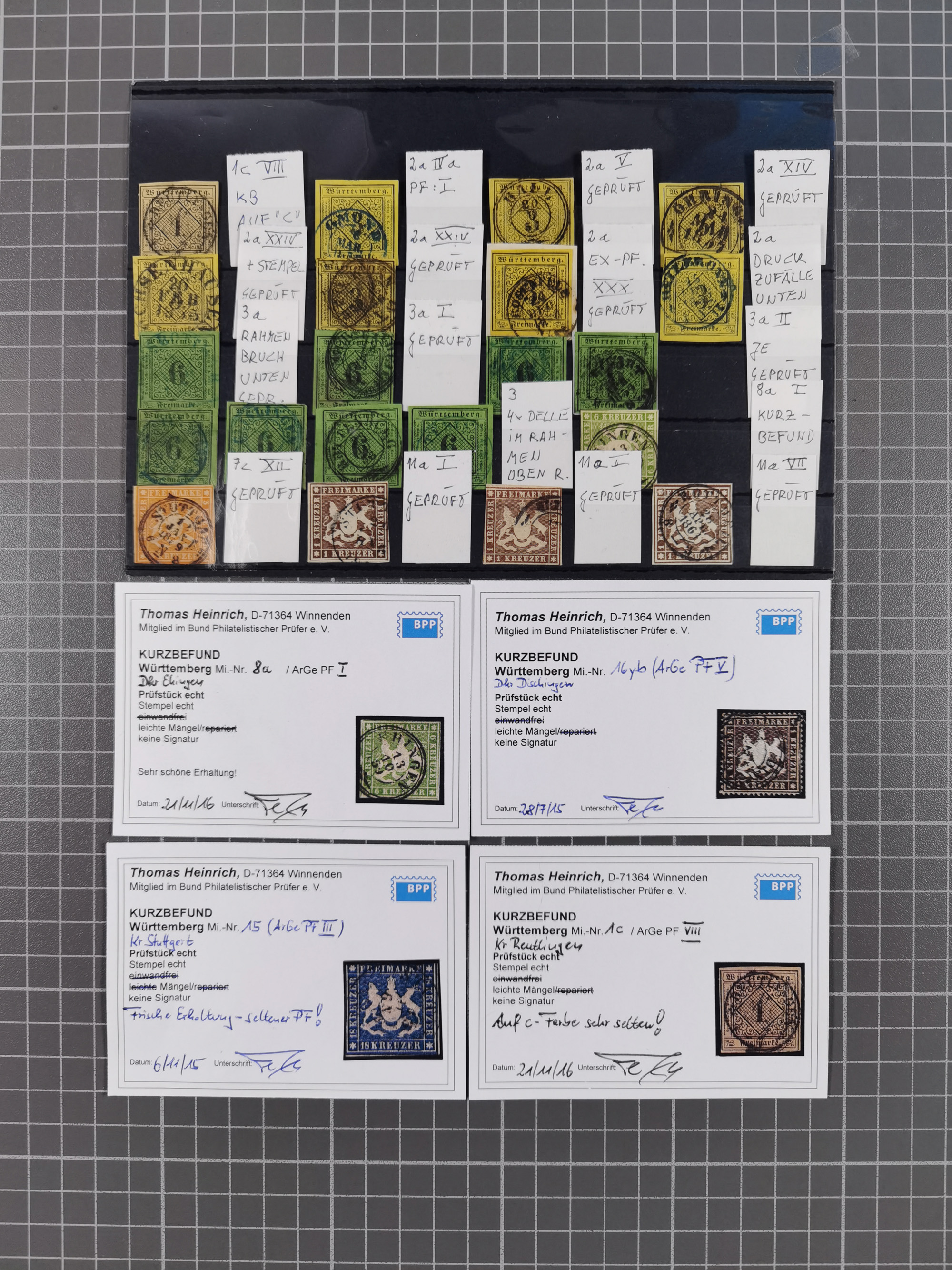 1851/69, interessante Partie mit ca. 50 verschiedenen Plattenfehlern auf gestempelten Kreuzer-Marken mit besseren, dabei u.a. Mi.-Nr. 1cPFVIII (KB Heinrich BPP: “..auf C-Farbe sehr selten”), Mi.-Nr. 8PFI (KB Heinrich BPP), Mi.-Nr. 15PFIII (KB Heinrich BPP),16ybPFV (Arge) mit KB Heinrich BPP und Mi.-Nr. 34 PFI (FB Heinrich BPP). Dazu noch drei weitere Plattenfehler aus 1919 in postfrischen Dreierstreifen bzw. einem Paar mit Normalmarke. Die gestempelten Marken sind alle signiert bzw. KB/FB, in der Erhaltung meist mit kleinen Fehlern, oft optisch sehr ansprechend