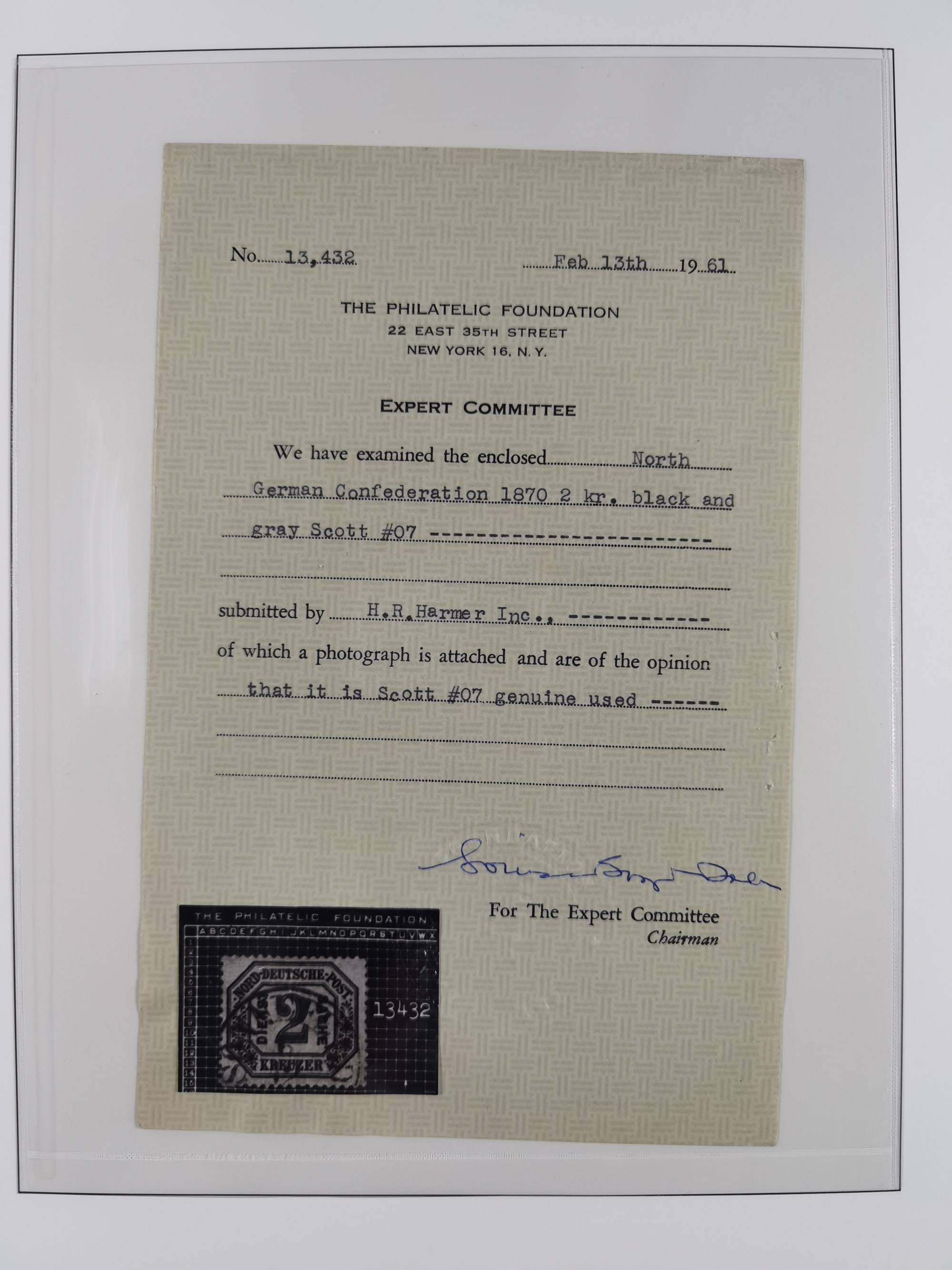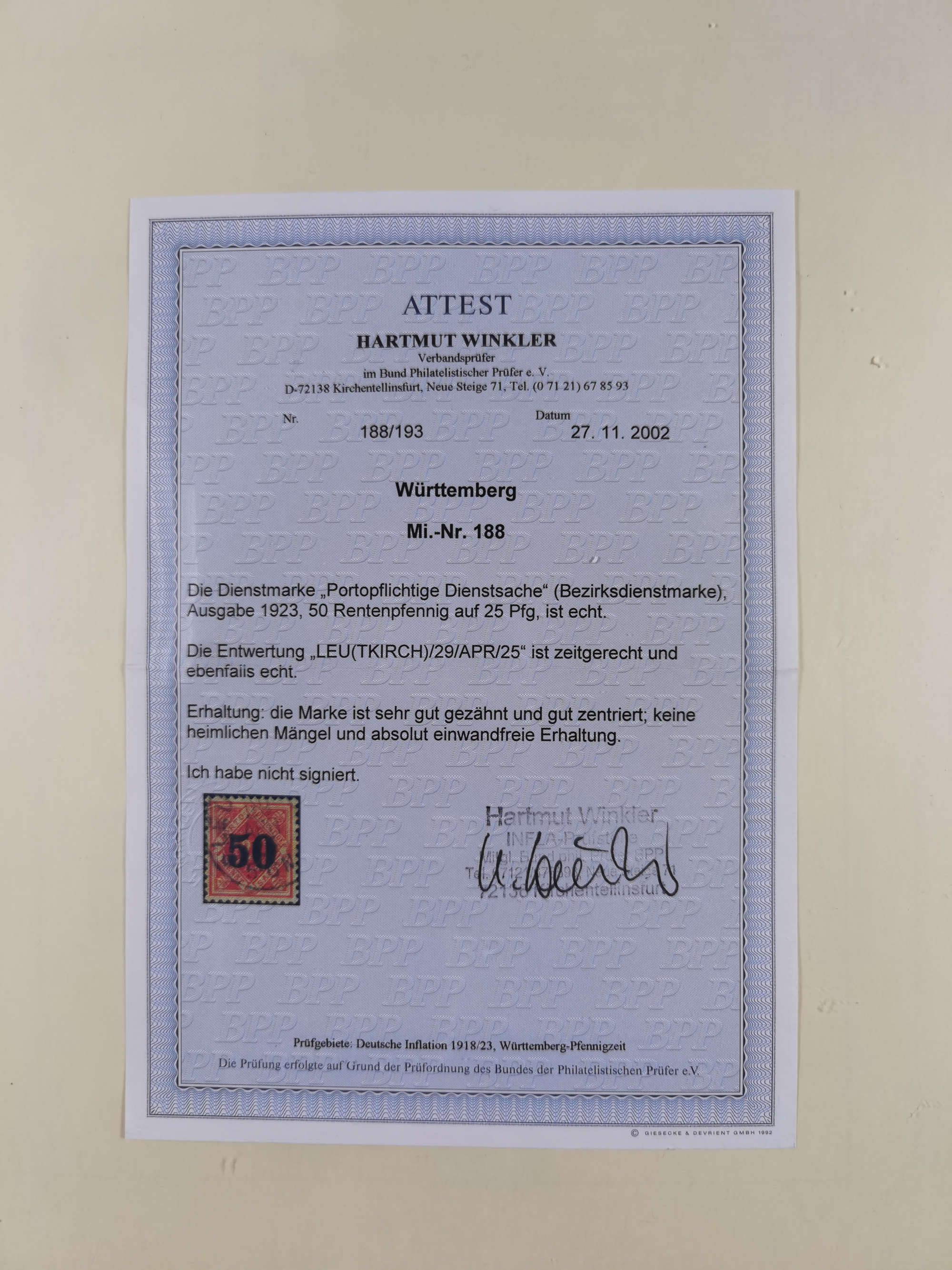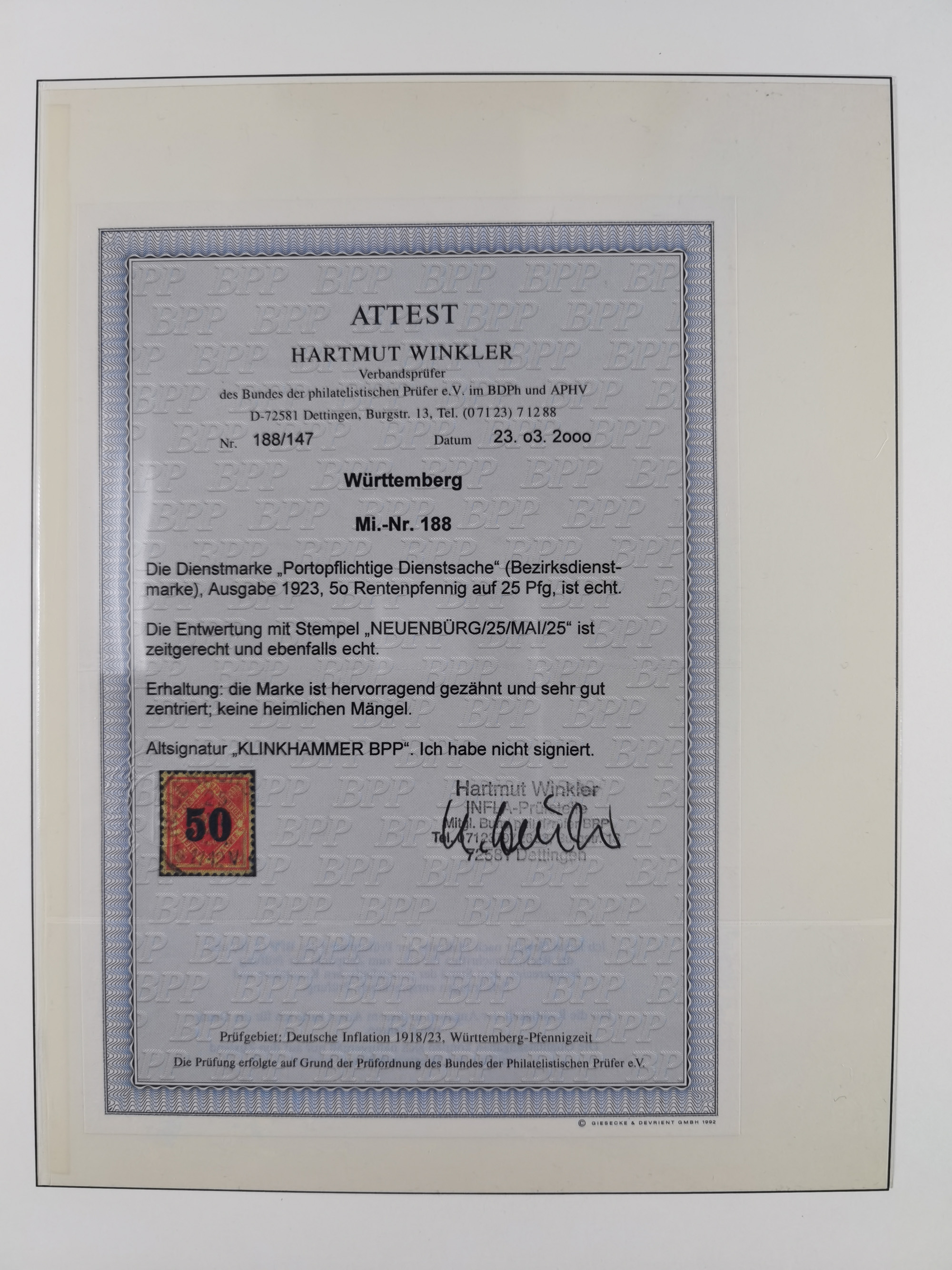 50 Pfg. bräunlichkarmin, farbfrisch und gut gezähnt, ungebraucht mit Falzresten (einer bräunlich, vorderseitig etwas durchschlagend). Diese Marke ist in ungebrauchter Erhaltung eine der seltensten Marken Deutschlands. Diese ist das einzige Stück welches seit Jahrzehnten aufgetaucht ist; PROFI hat keine weiteren Stücke registriert. Signiert Klinkhammer BPP und Fotoattest M.Klinkhammer BPP (2014)