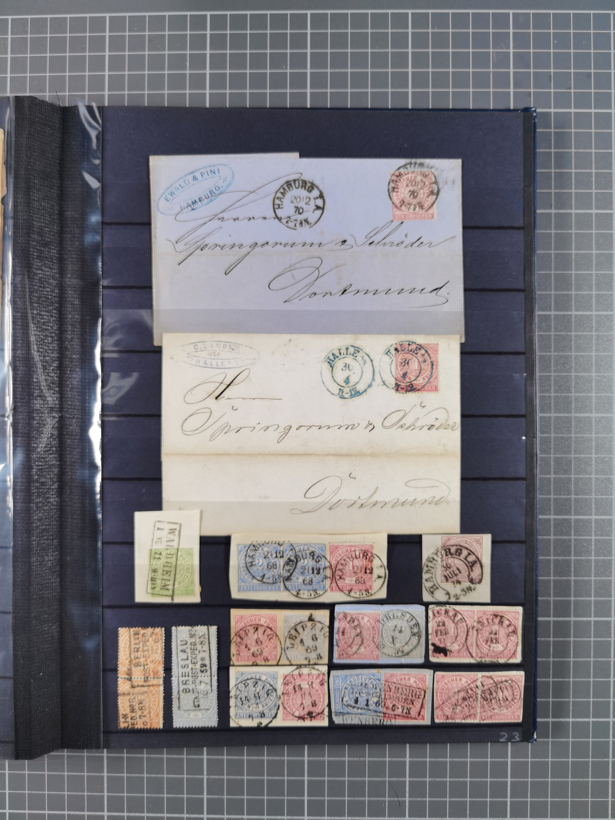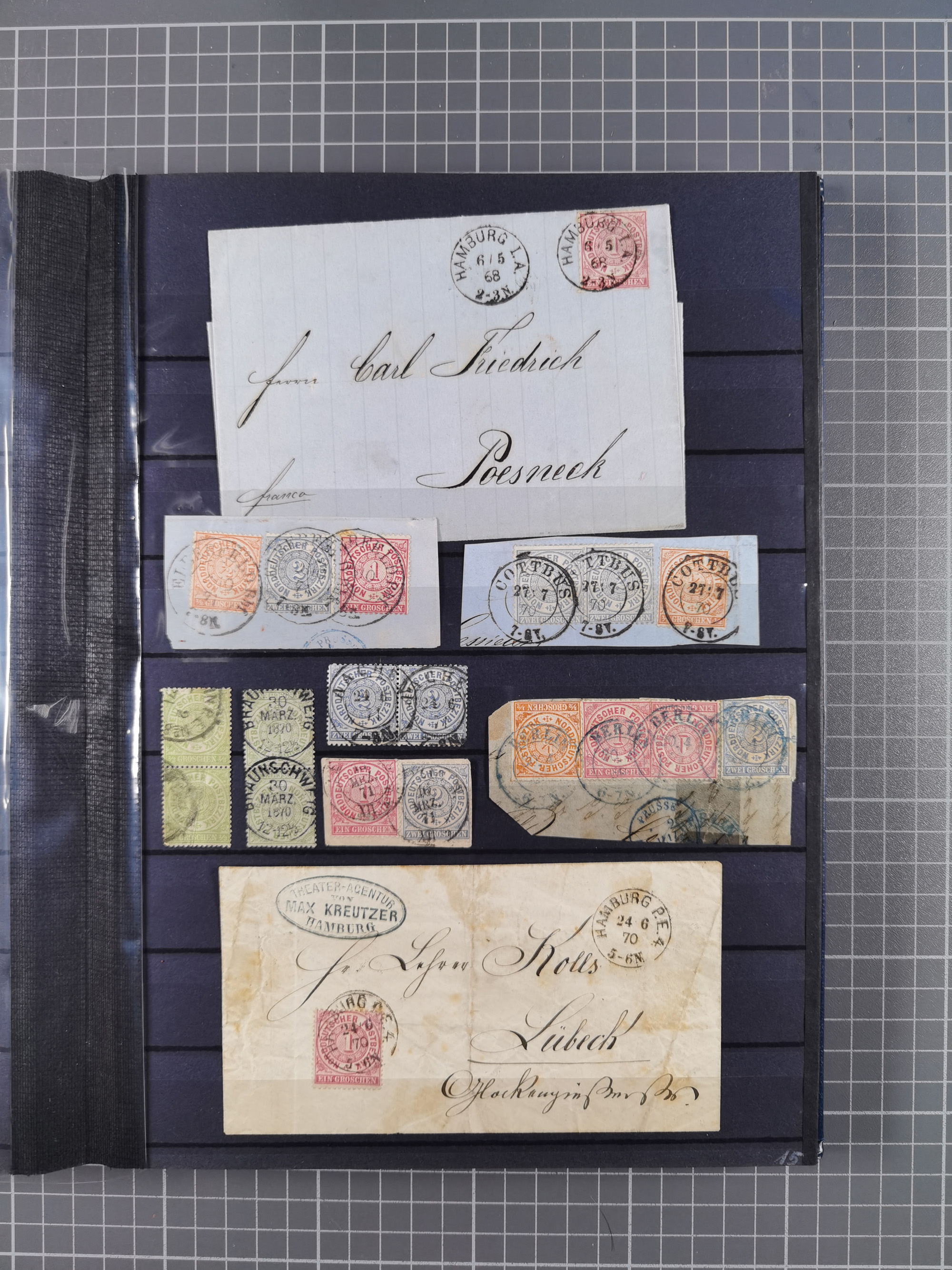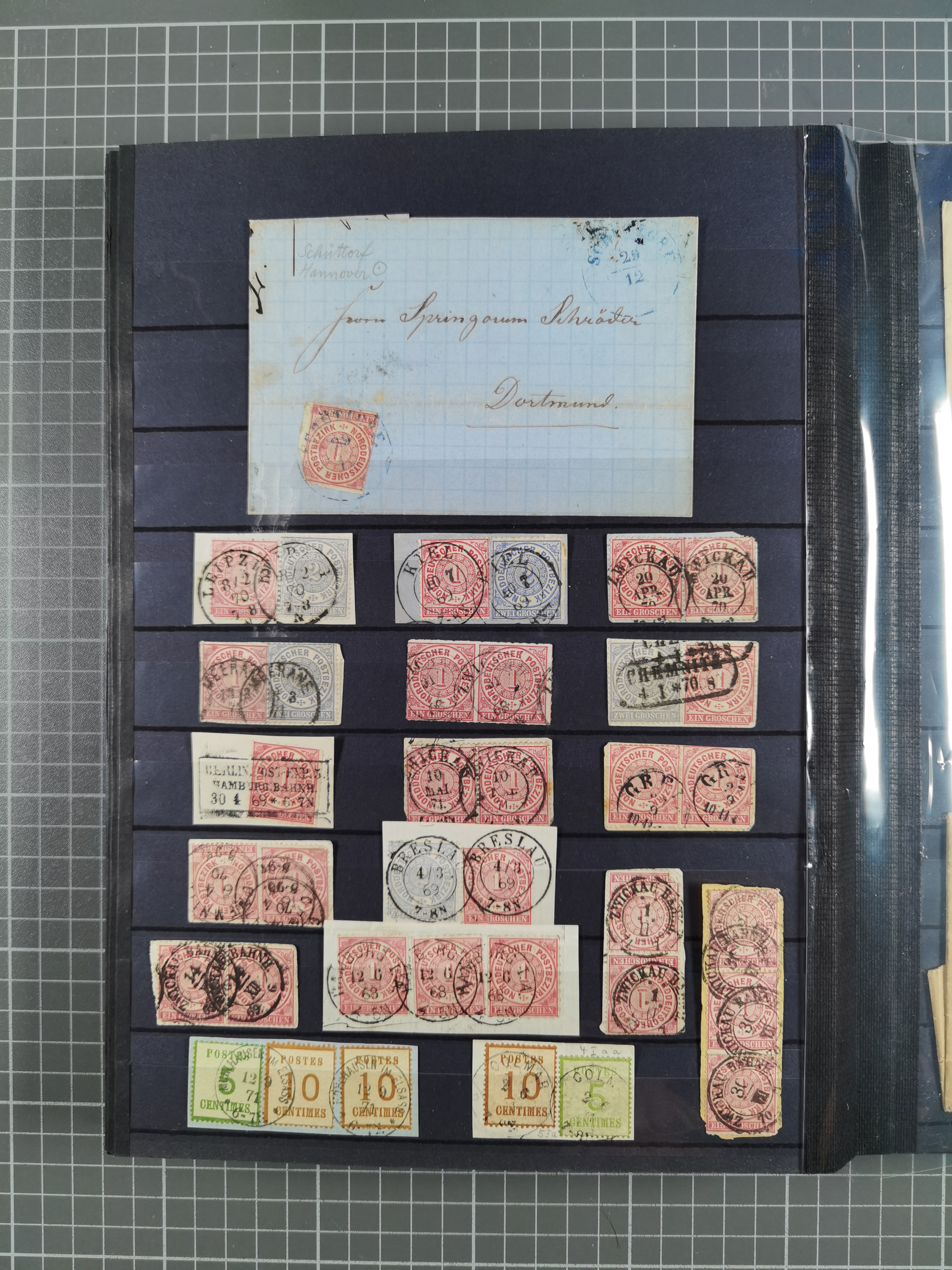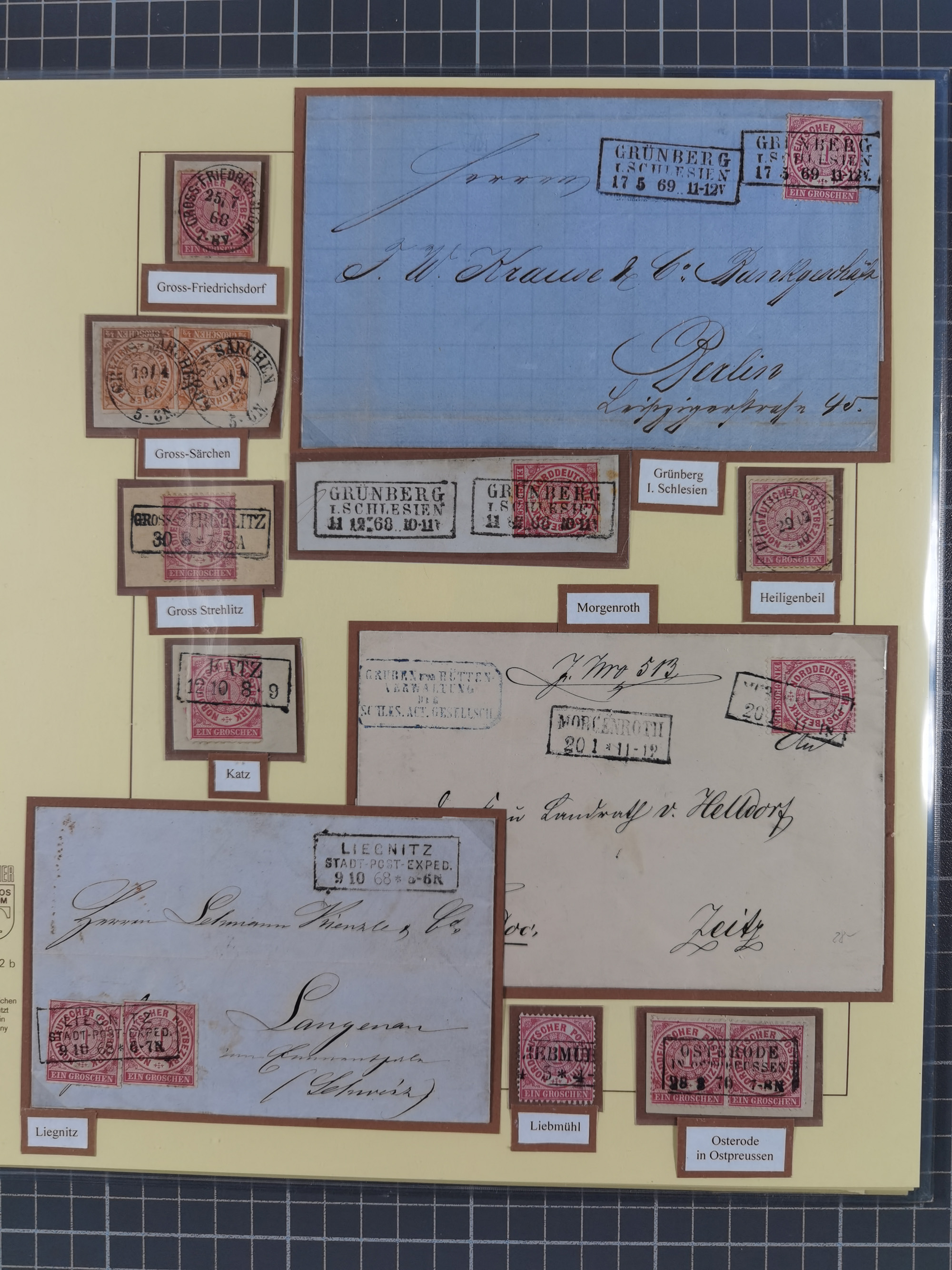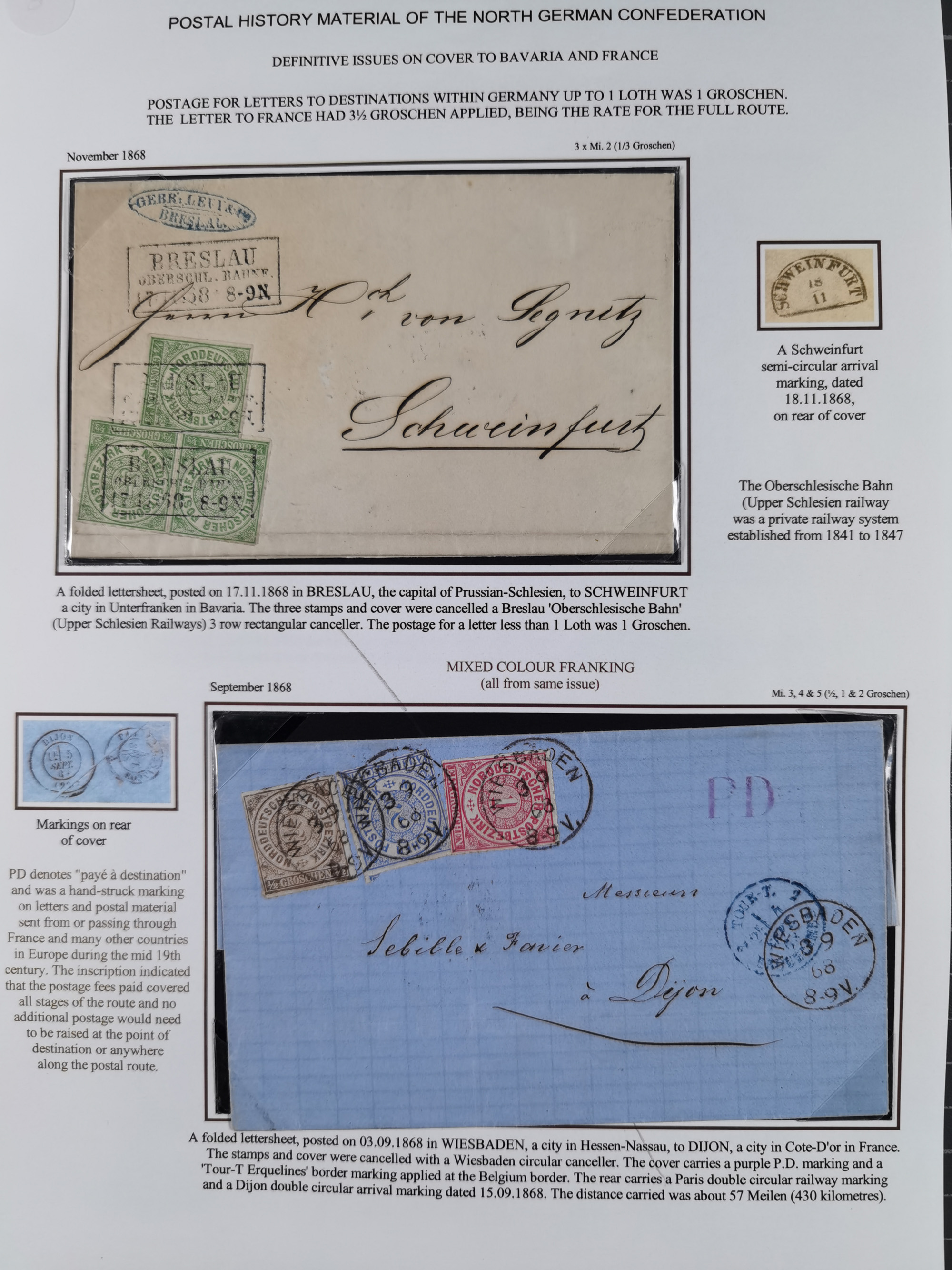 1868/71, 'Die Norddeutsche Post in Schlesien', Ausstellungssammlung mit rund 160 Belegen, dabei viele Besonderheiten, Ersttagsbriefe der Mi. 3 und 4, Orts-R-Brief von Breslau, 2 Express-Karten, viele Paketbegleit- und Wertsendungen, Teil- und Mischfrankaturen, frankierte Postanweisung, Reco-Brief an den preußischen König, Auslandsbriefe u.a. nach Schweden und Konstantinopel, Drucksache nach Italien und Briefvorderseite ans Kap der Guten Hoffnung, interessanter Teil Krieg 1870/71 mit u.a. Ballon Monte-Briefen an bzw. von Kriegsgefangenen, etc. etc. Dazu ein Ordner mit zusätzlichem Material. Ein sehr interessantes und reichhaltiges Objekt.