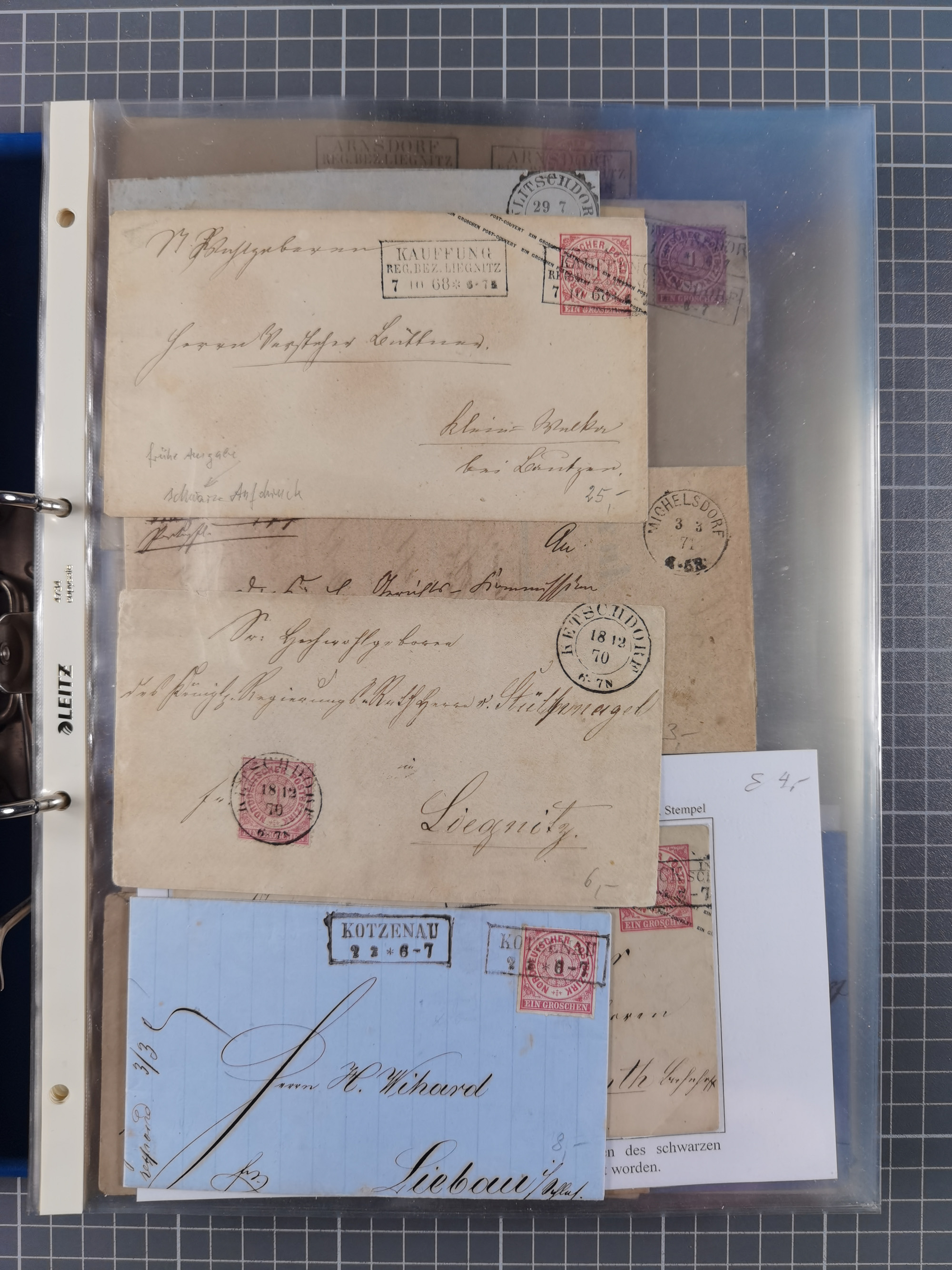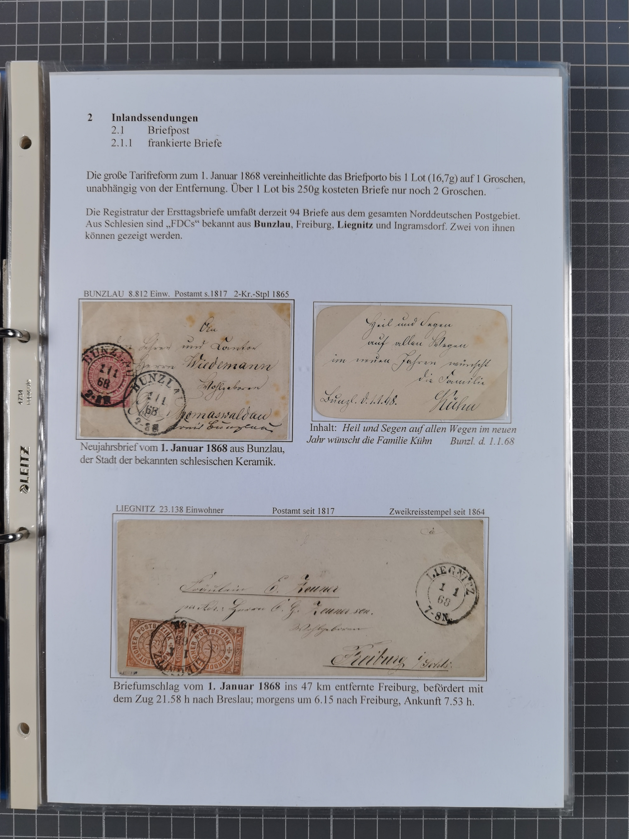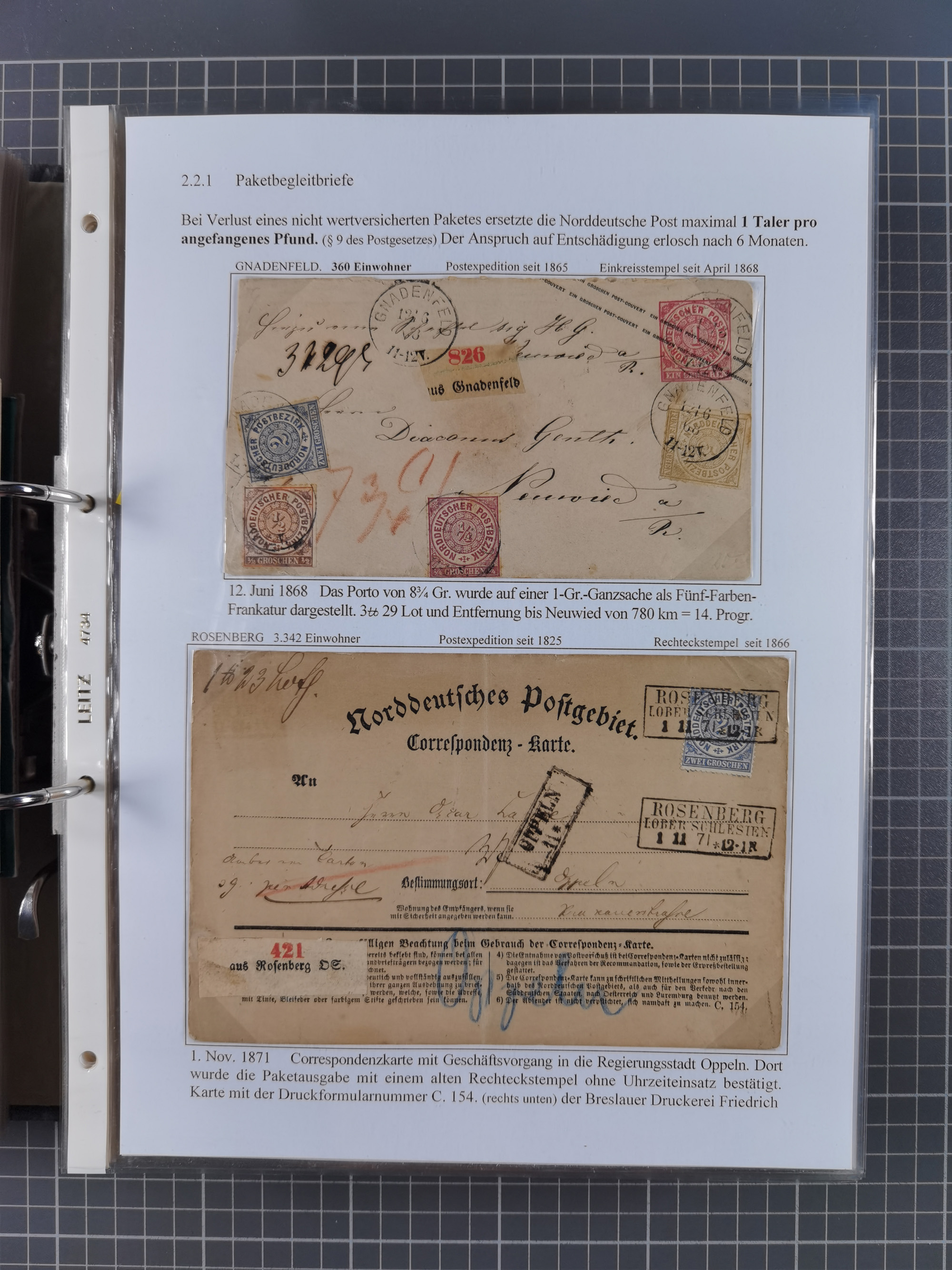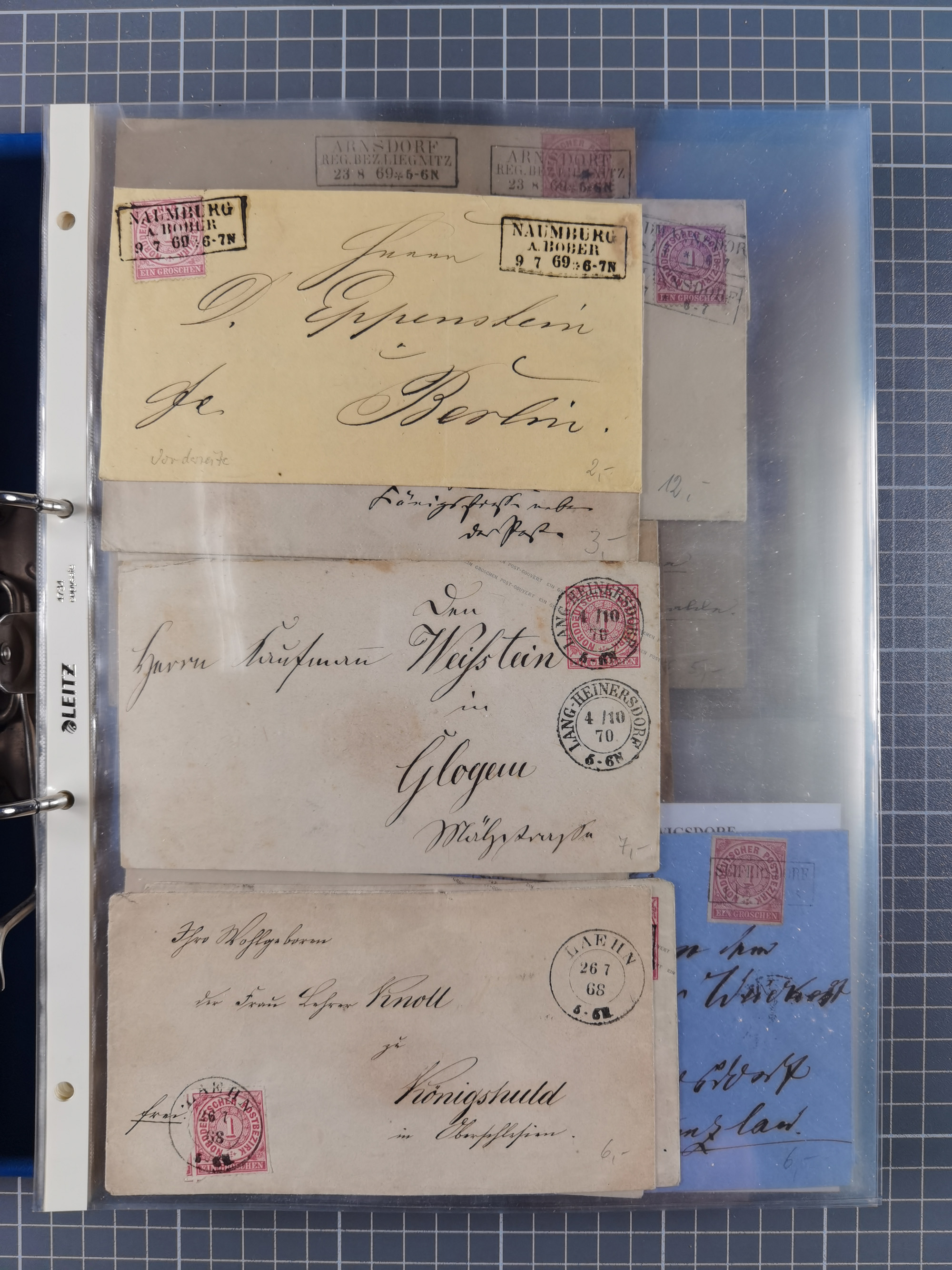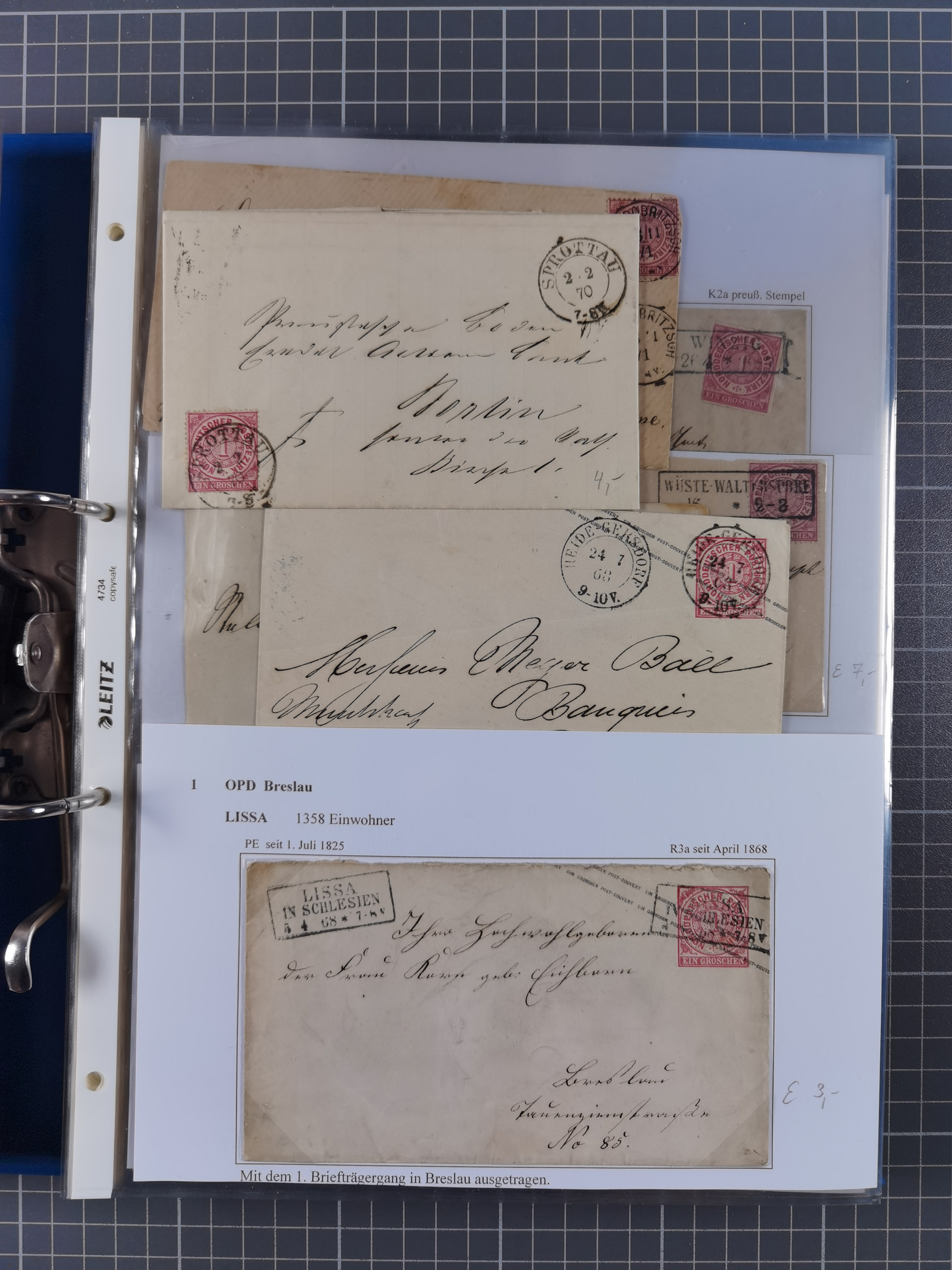 1868/71, 'Die Norddeutsche Post in Schlesien', Ausstellungssammlung mit rund 160 Belegen, dabei viele Besonderheiten, Ersttagsbriefe der Mi. 3 und 4, Orts-R-Brief von Breslau, 2 Express-Karten, viele Paketbegleit- und Wertsendungen, Teil- und Mischfrankaturen, frankierte Postanweisung, Reco-Brief an den preußischen König, Auslandsbriefe u.a. nach Schweden und Konstantinopel, Drucksache nach Italien und Briefvorderseite ans Kap der Guten Hoffnung, interessanter Teil Krieg 1870/71 mit u.a. Ballon Monte-Briefen an bzw. von Kriegsgefangenen, etc. etc. Dazu ein Ordner mit zusätzlichem Material. Ein sehr interessantes und reichhaltiges Objekt.