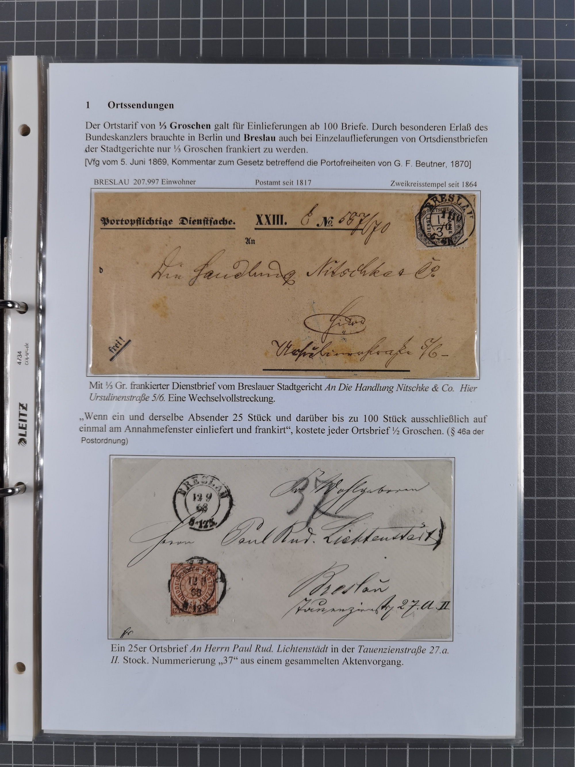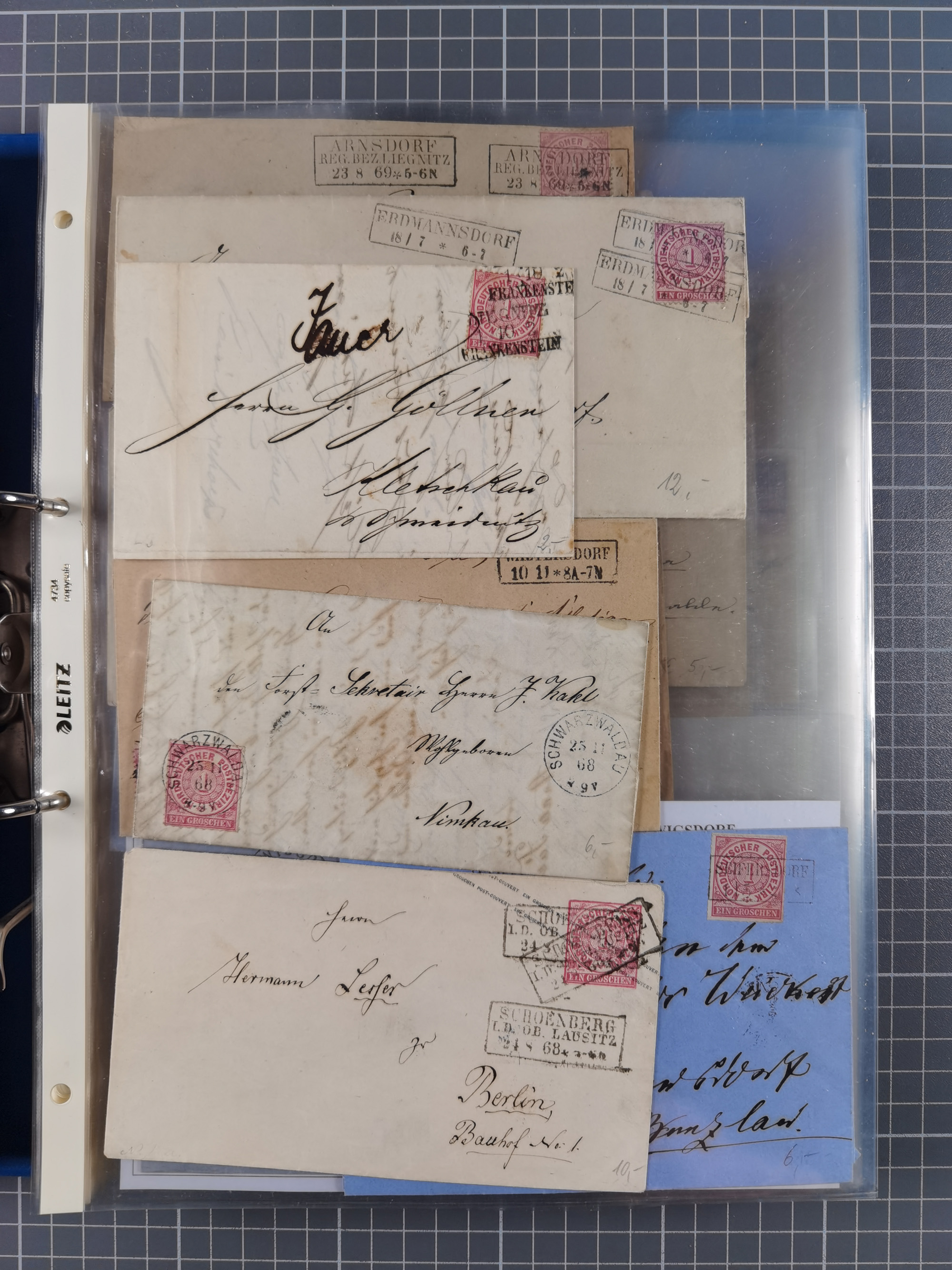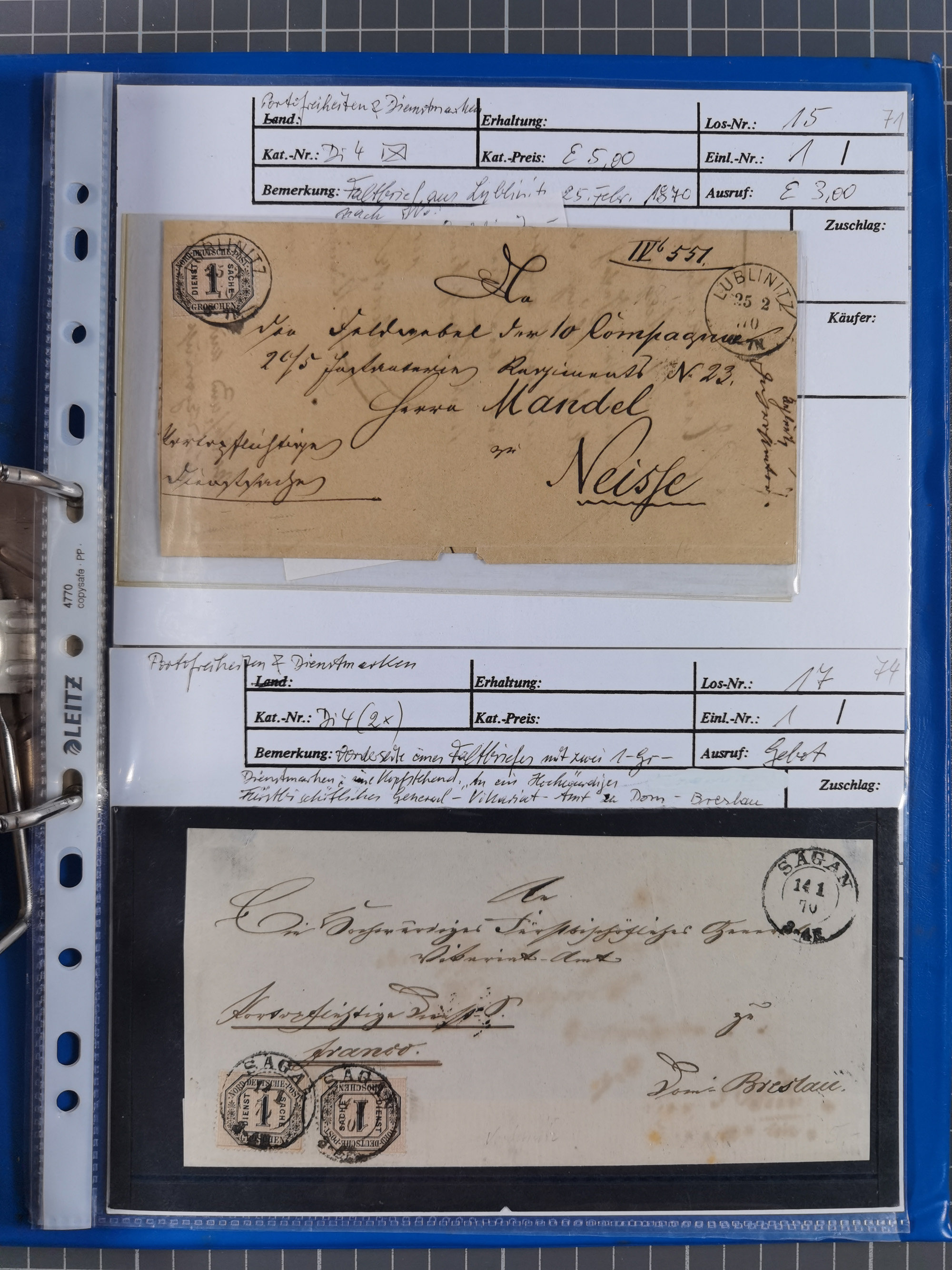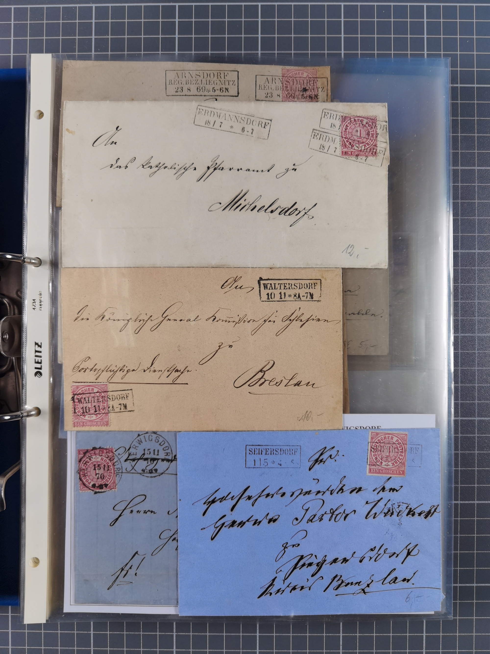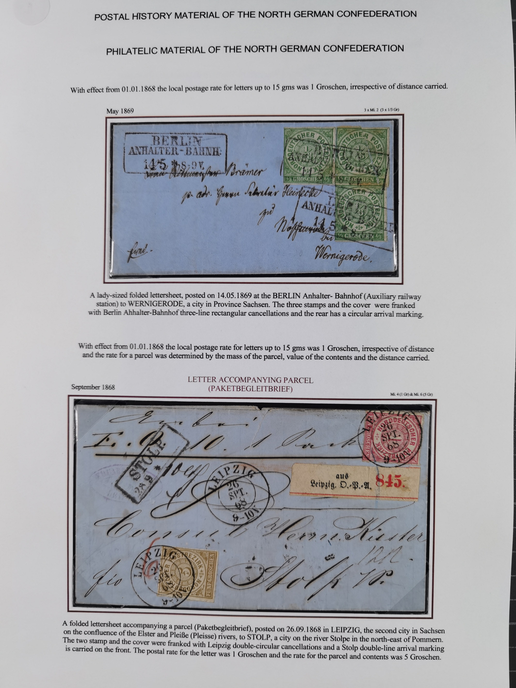 1868/71, 'Die Norddeutsche Post in Schlesien', Ausstellungssammlung mit rund 160 Belegen, dabei viele Besonderheiten, Ersttagsbriefe der Mi. 3 und 4, Orts-R-Brief von Breslau, 2 Express-Karten, viele Paketbegleit- und Wertsendungen, Teil- und Mischfrankaturen, frankierte Postanweisung, Reco-Brief an den preußischen König, Auslandsbriefe u.a. nach Schweden und Konstantinopel, Drucksache nach Italien und Briefvorderseite ans Kap der Guten Hoffnung, interessanter Teil Krieg 1870/71 mit u.a. Ballon Monte-Briefen an bzw. von Kriegsgefangenen, etc. etc. Dazu ein Ordner mit zusätzlichem Material. Ein sehr interessantes und reichhaltiges Objekt.