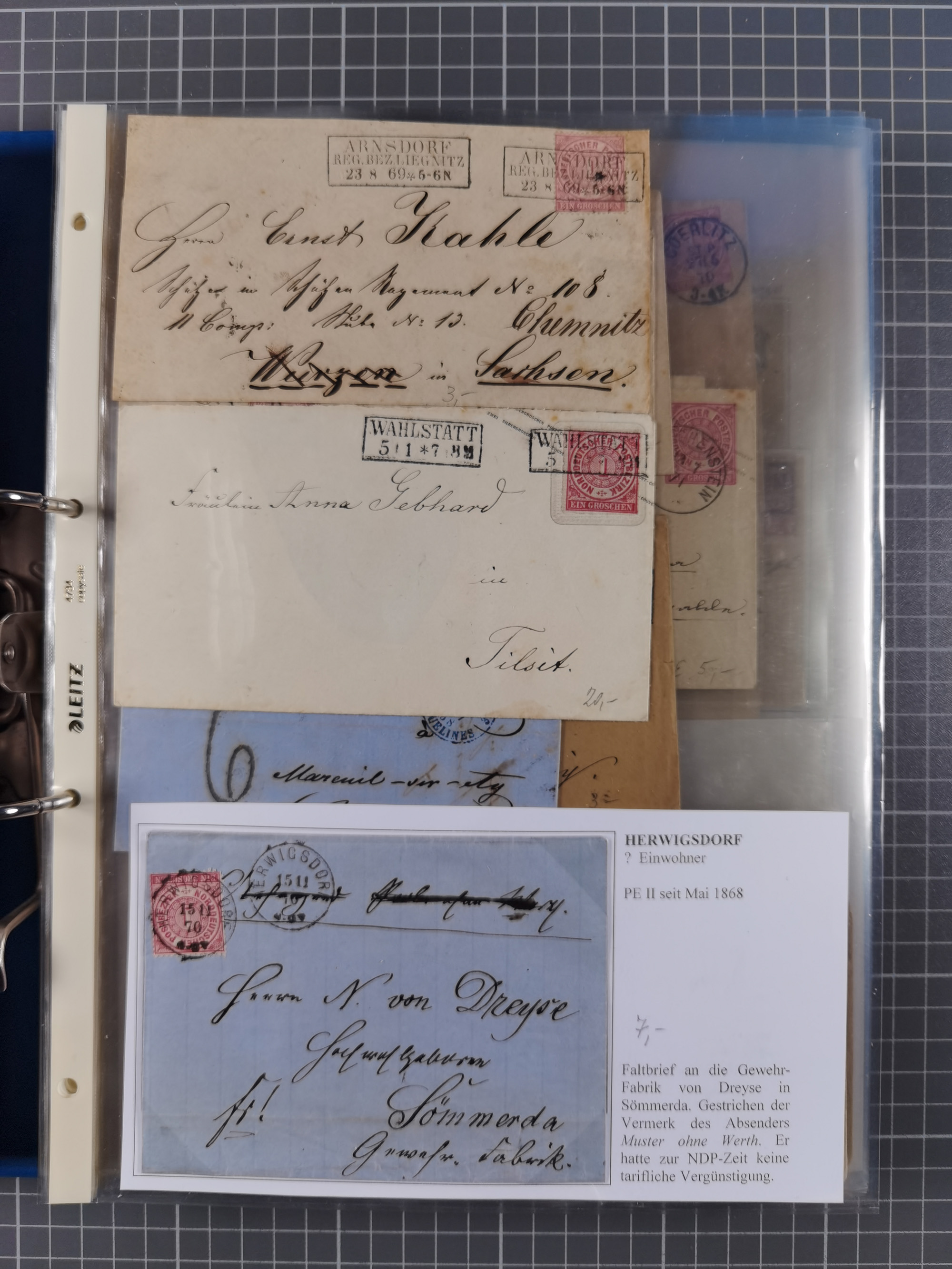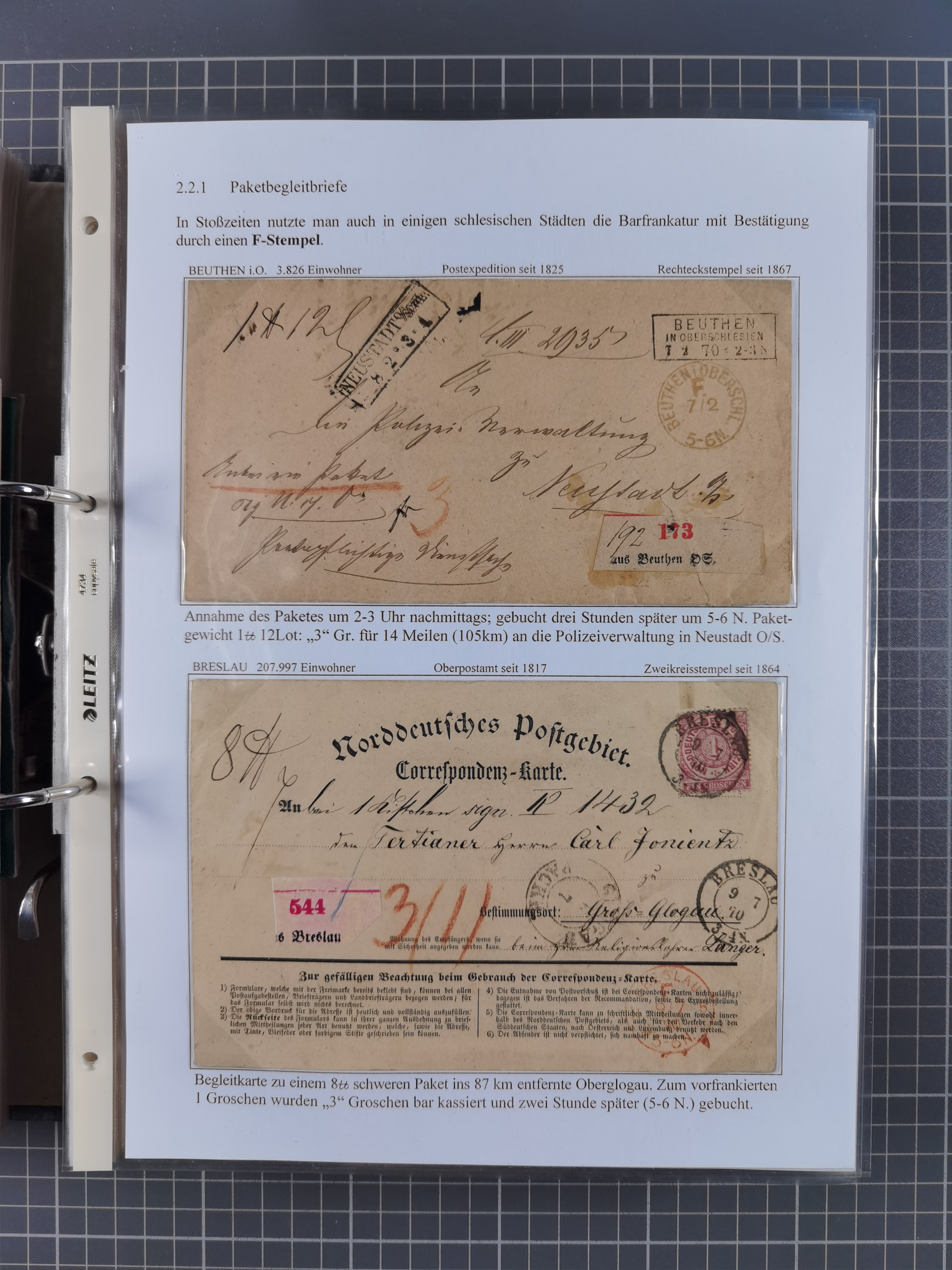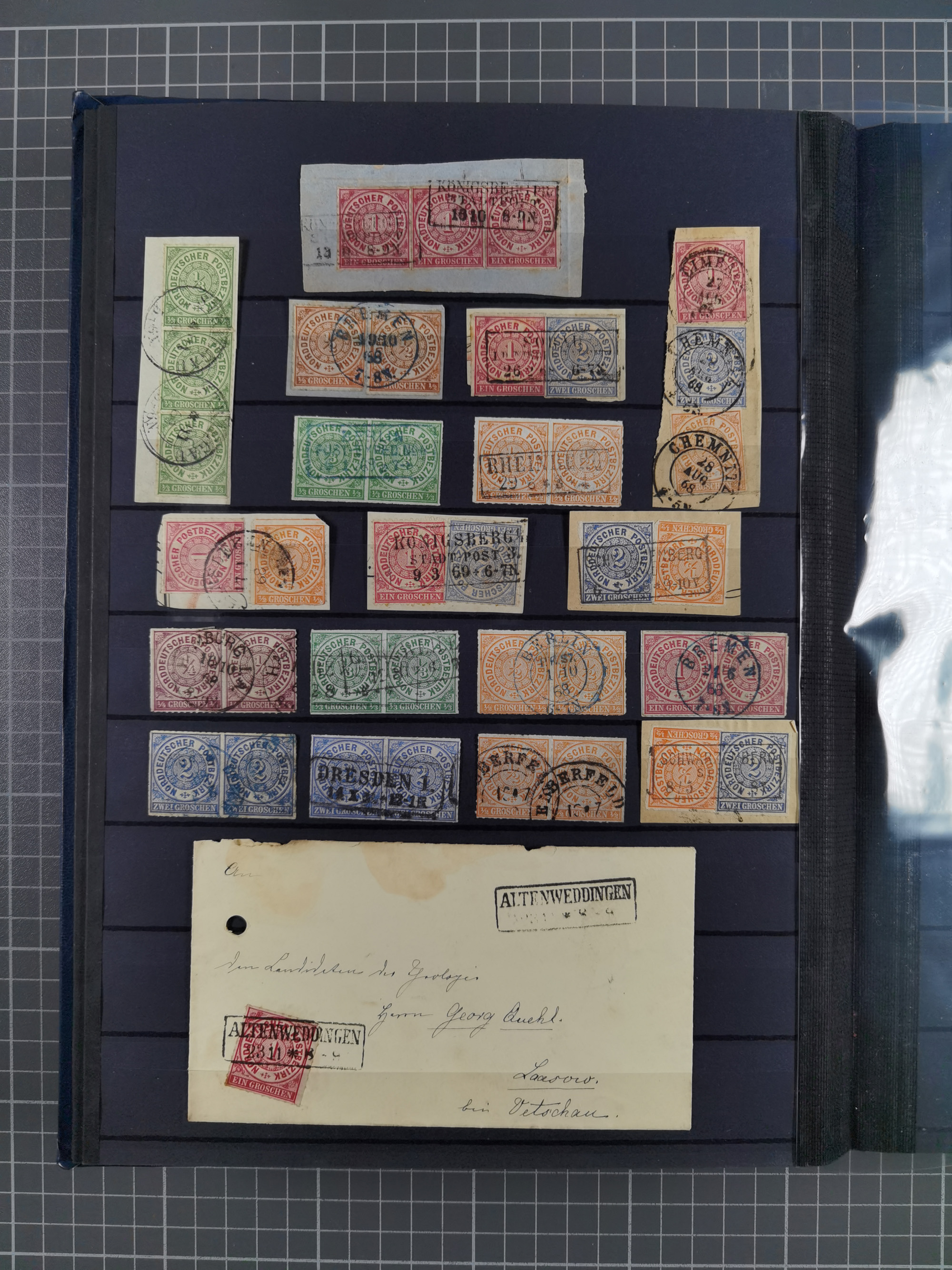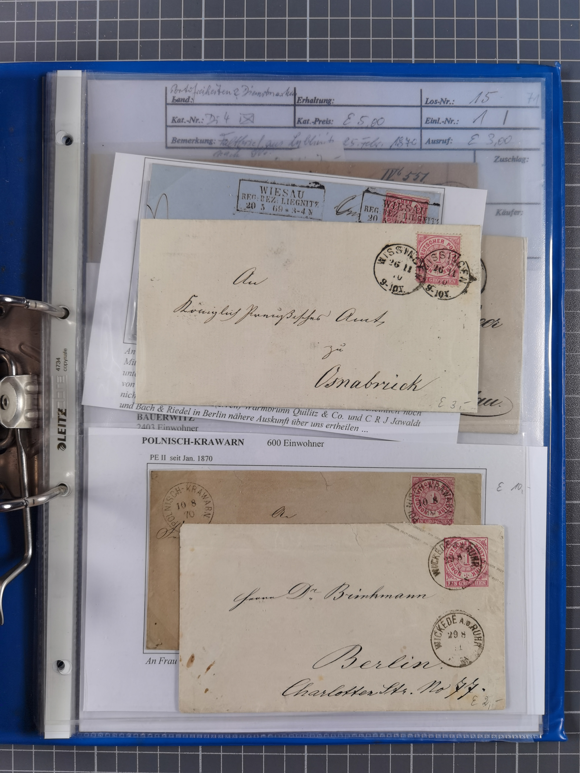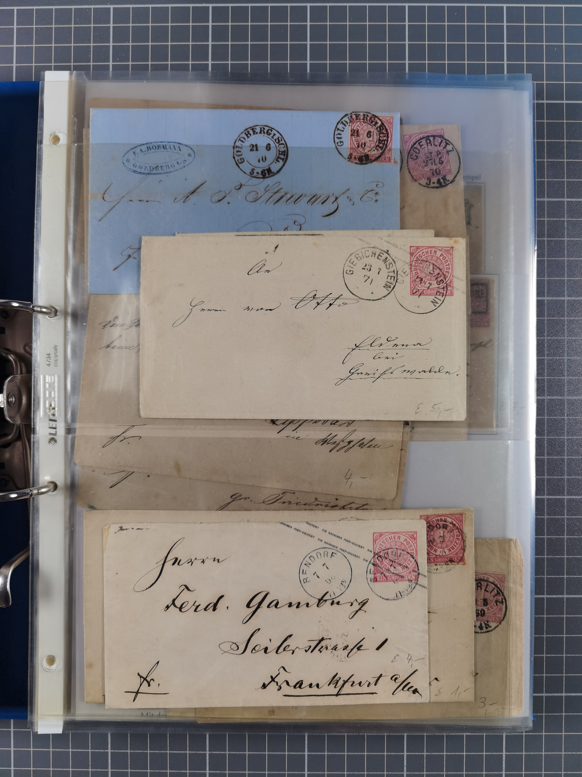 1868/71, 'Die Norddeutsche Post in Schlesien', Ausstellungssammlung mit rund 160 Belegen, dabei viele Besonderheiten, Ersttagsbriefe der Mi. 3 und 4, Orts-R-Brief von Breslau, 2 Express-Karten, viele Paketbegleit- und Wertsendungen, Teil- und Mischfrankaturen, frankierte Postanweisung, Reco-Brief an den preußischen König, Auslandsbriefe u.a. nach Schweden und Konstantinopel, Drucksache nach Italien und Briefvorderseite ans Kap der Guten Hoffnung, interessanter Teil Krieg 1870/71 mit u.a. Ballon Monte-Briefen an bzw. von Kriegsgefangenen, etc. etc. Dazu ein Ordner mit zusätzlichem Material. Ein sehr interessantes und reichhaltiges Objekt.