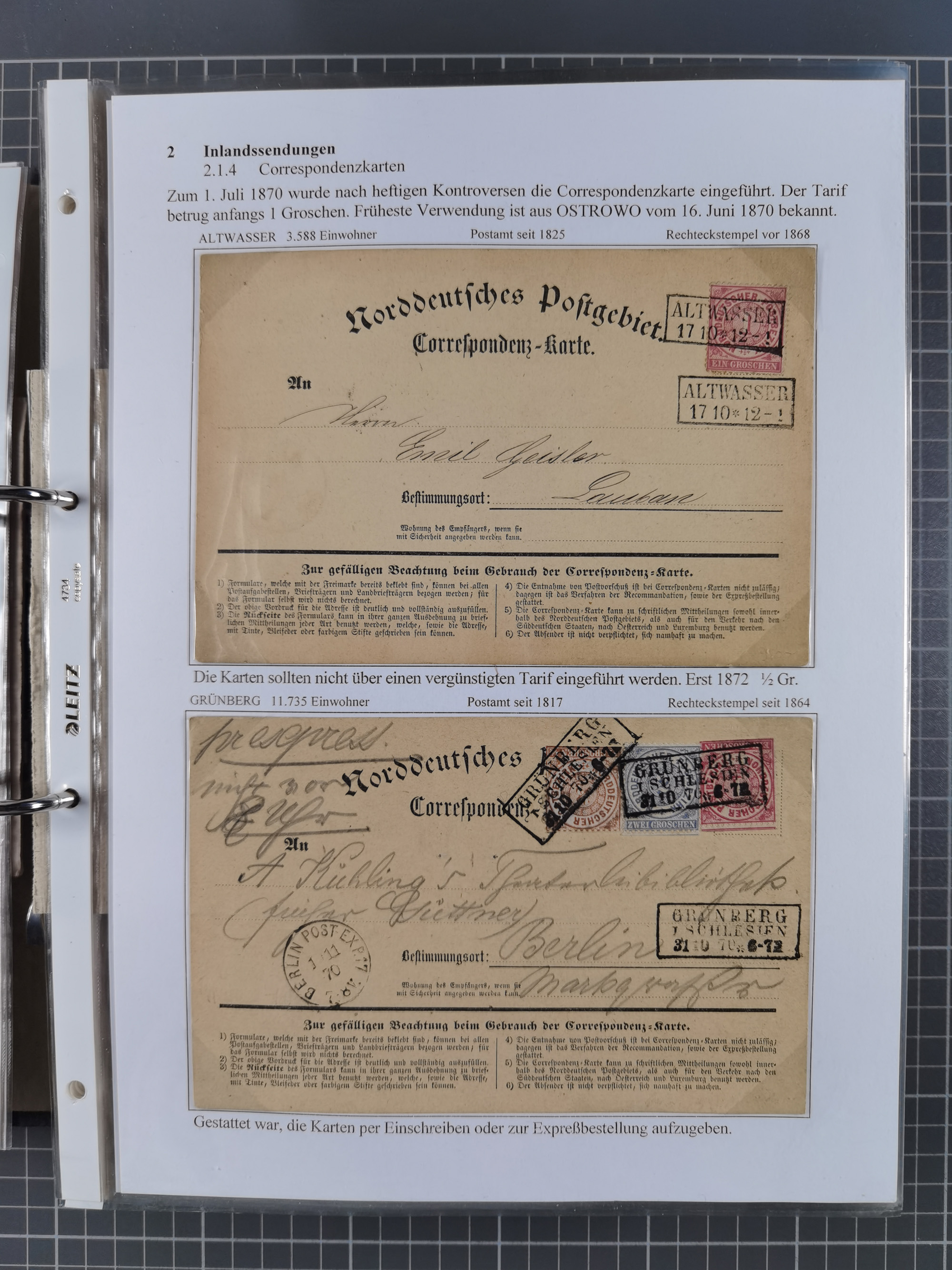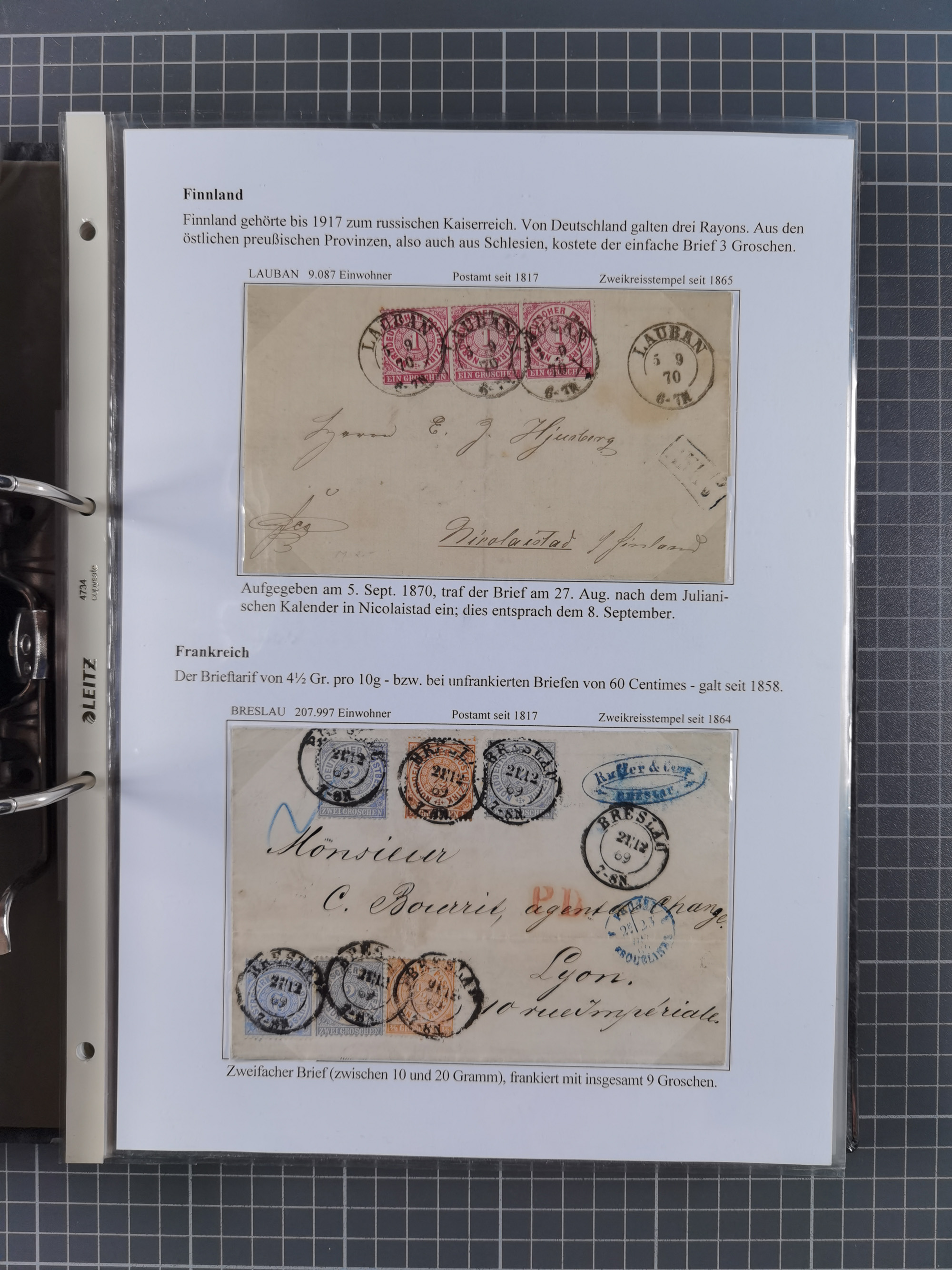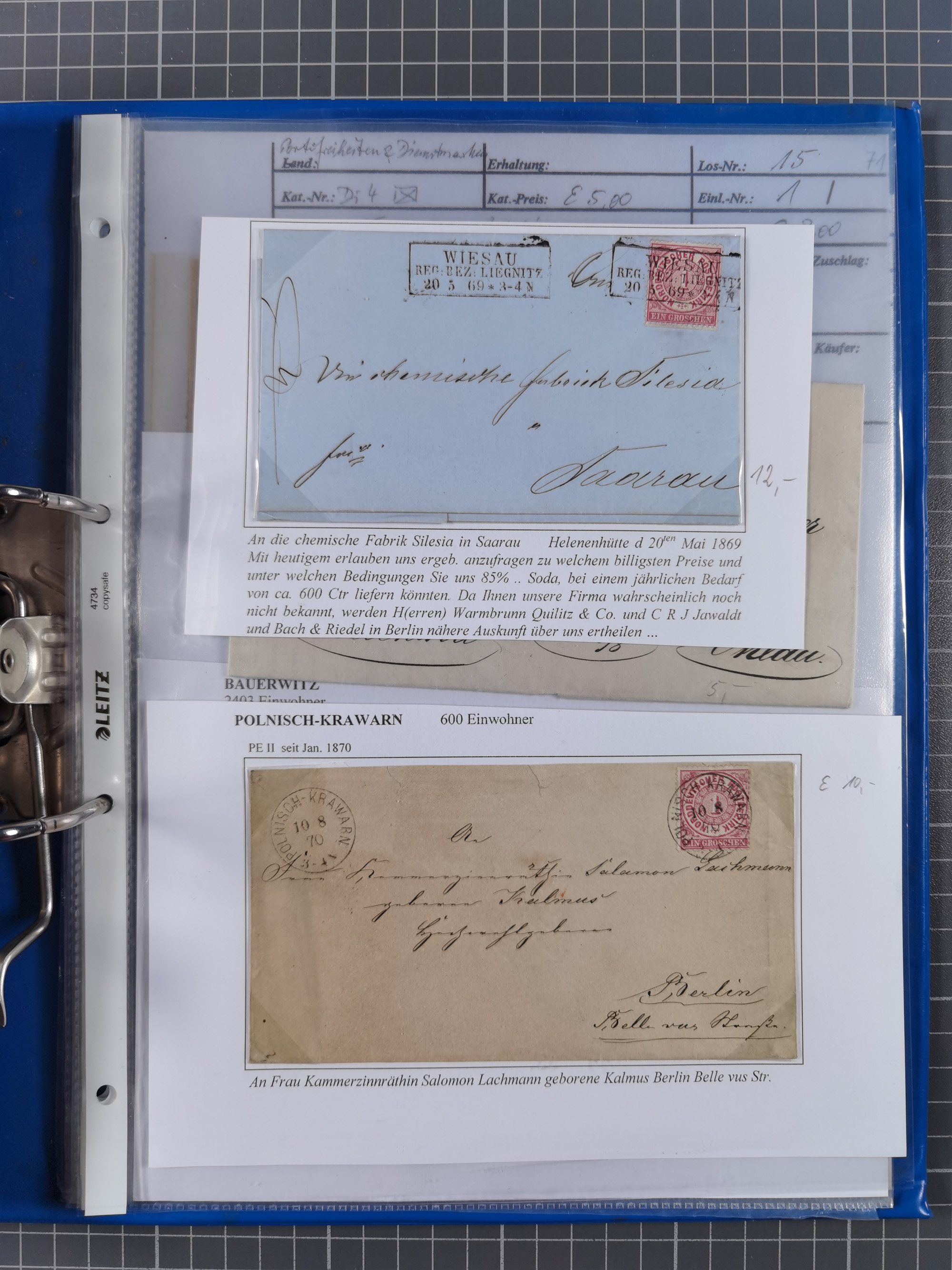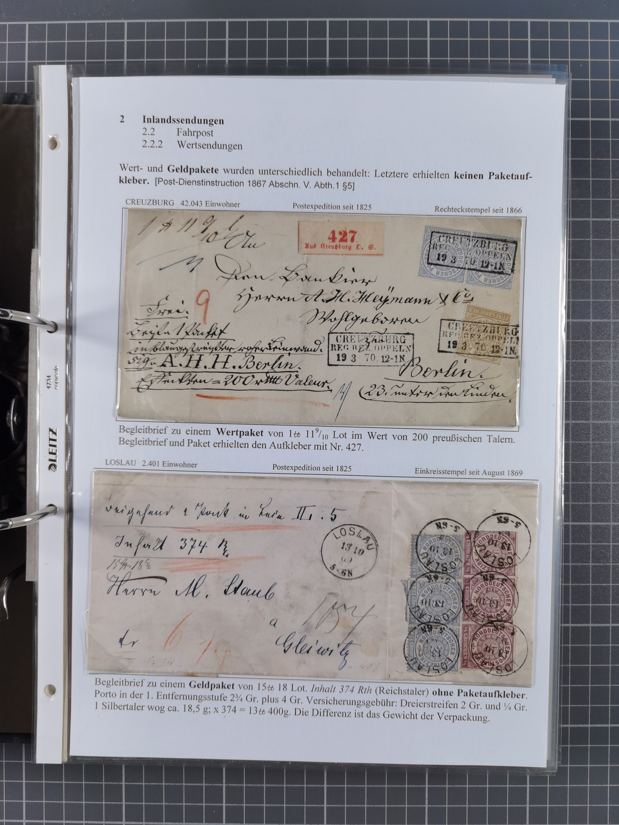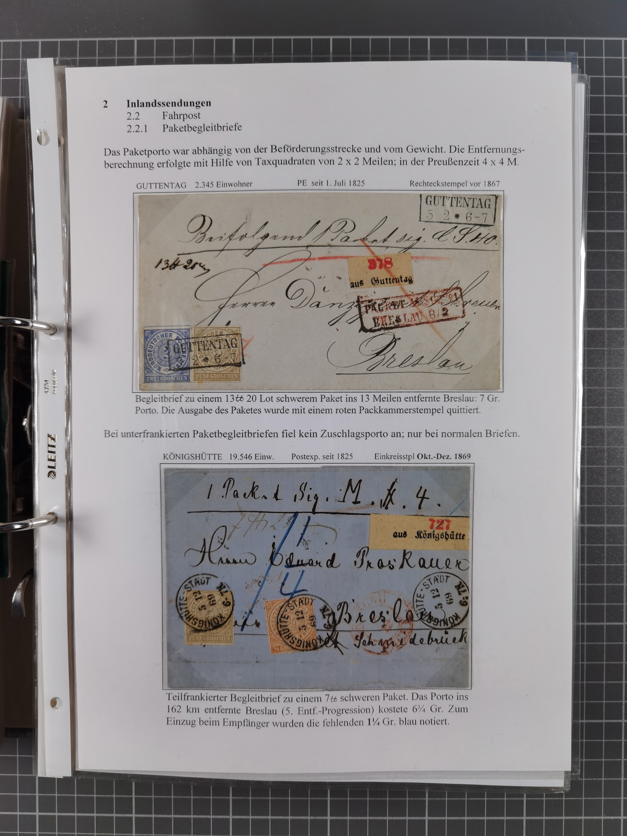 1868/71, 'Die Norddeutsche Post in Schlesien', Ausstellungssammlung mit rund 160 Belegen, dabei viele Besonderheiten, Ersttagsbriefe der Mi. 3 und 4, Orts-R-Brief von Breslau, 2 Express-Karten, viele Paketbegleit- und Wertsendungen, Teil- und Mischfrankaturen, frankierte Postanweisung, Reco-Brief an den preußischen König, Auslandsbriefe u.a. nach Schweden und Konstantinopel, Drucksache nach Italien und Briefvorderseite ans Kap der Guten Hoffnung, interessanter Teil Krieg 1870/71 mit u.a. Ballon Monte-Briefen an bzw. von Kriegsgefangenen, etc. etc. Dazu ein Ordner mit zusätzlichem Material. Ein sehr interessantes und reichhaltiges Objekt.