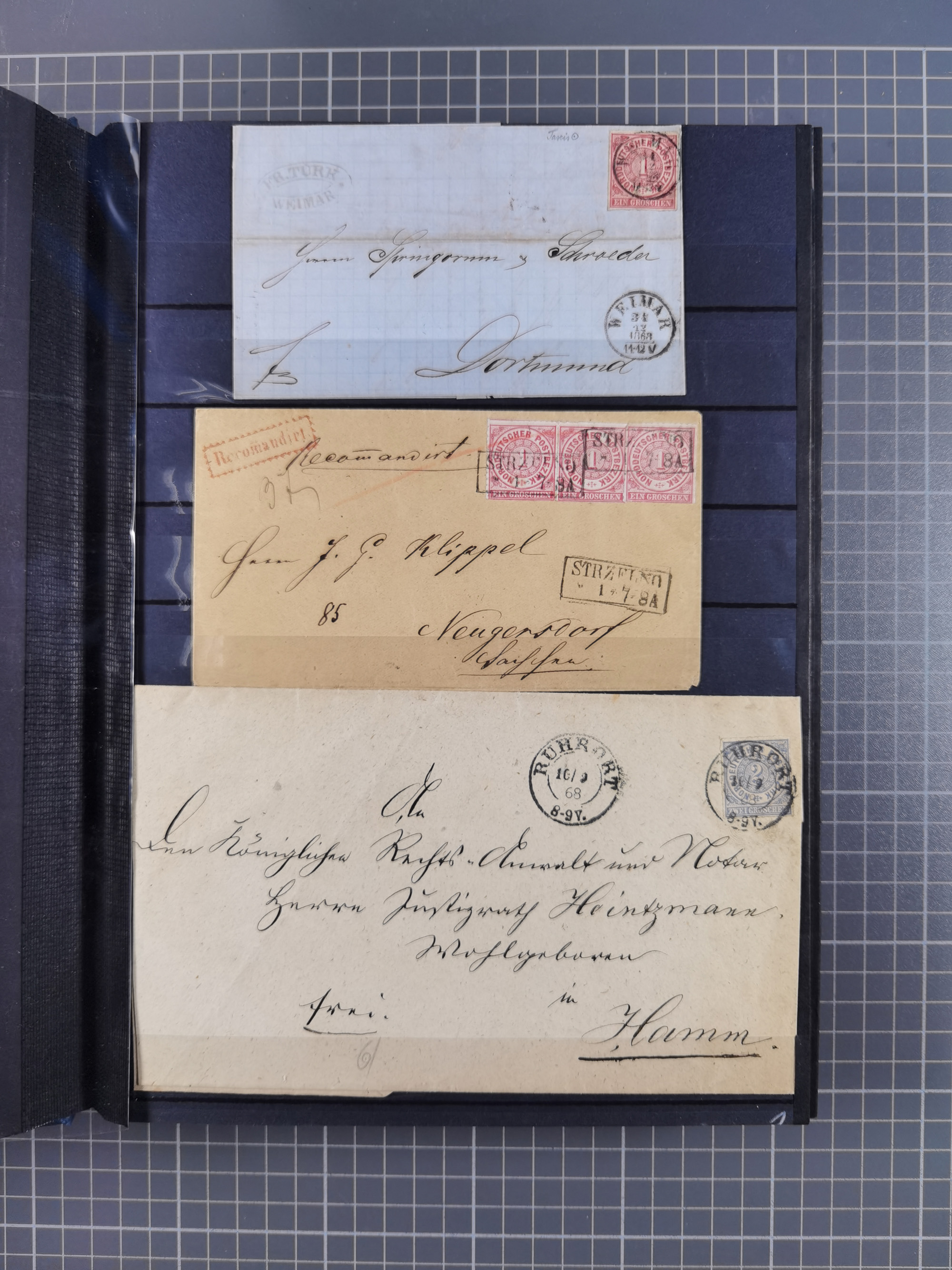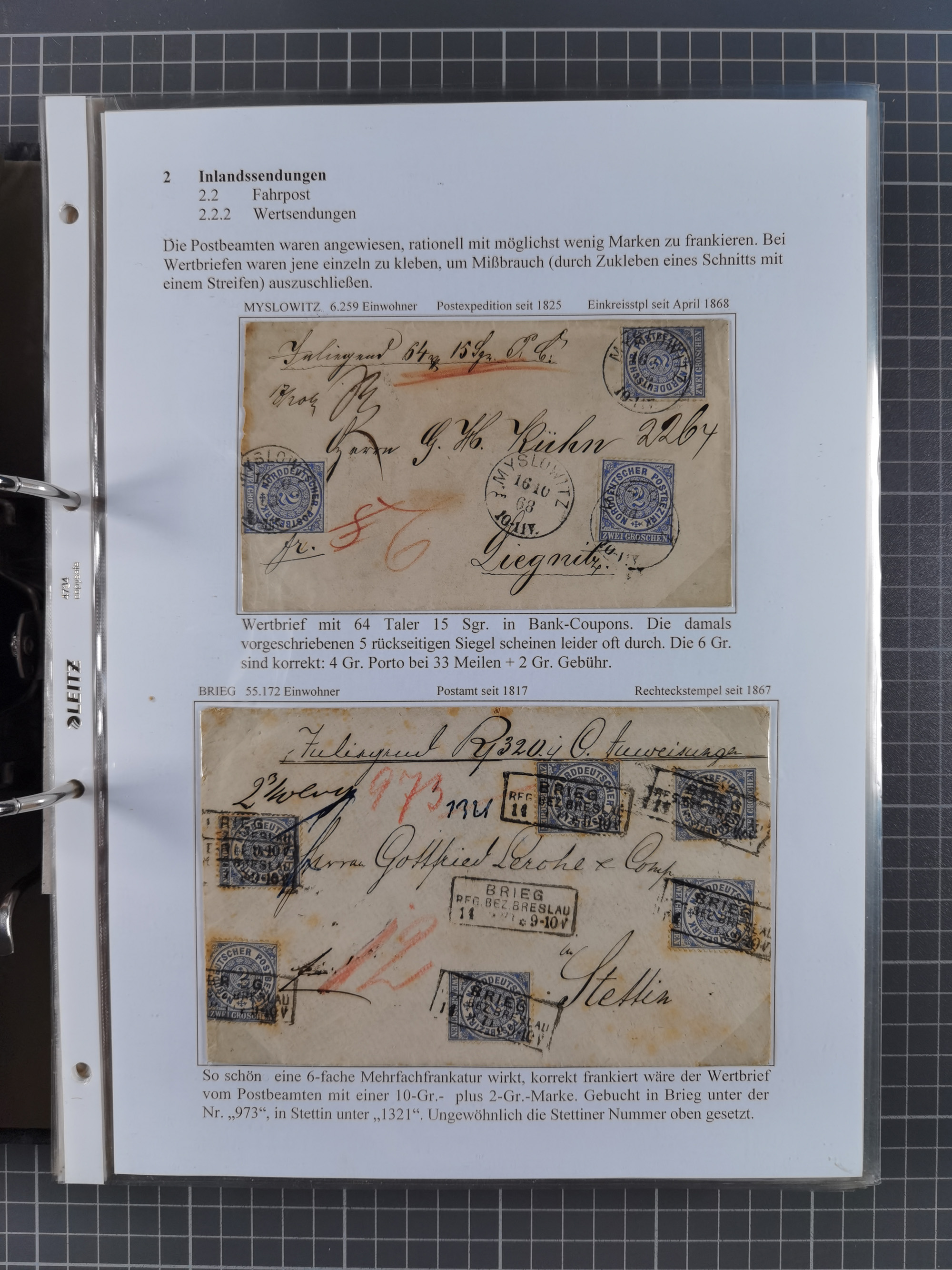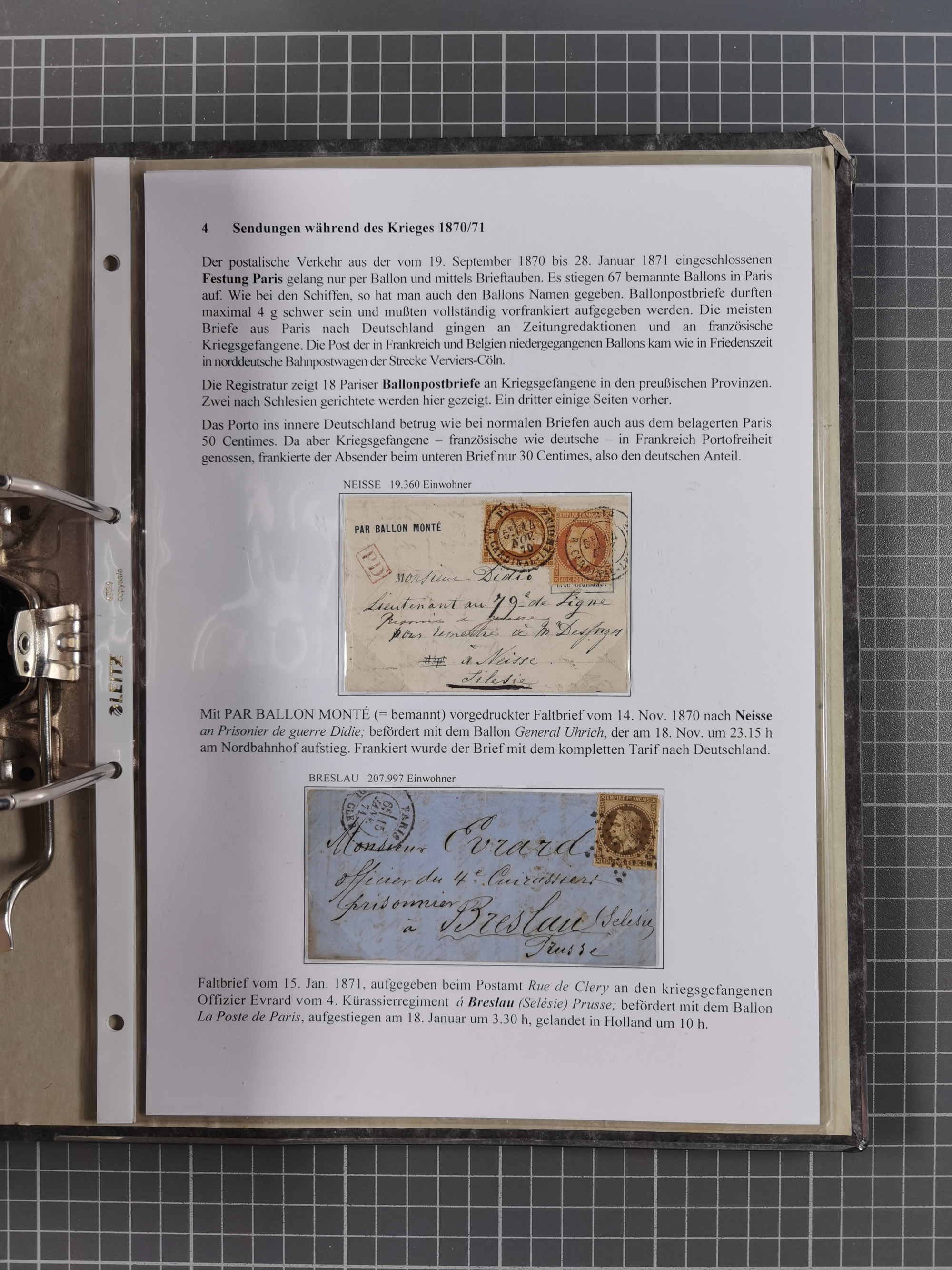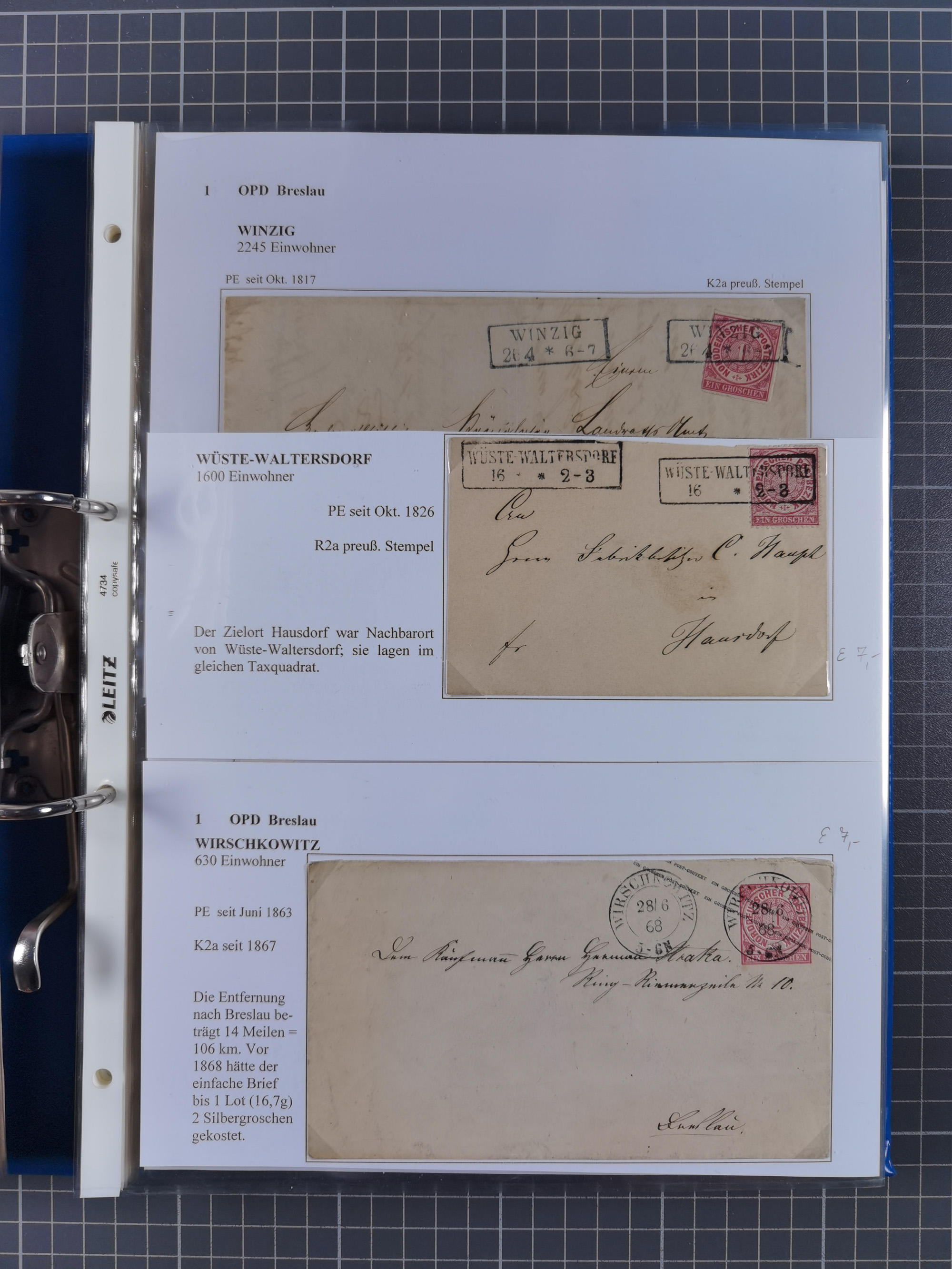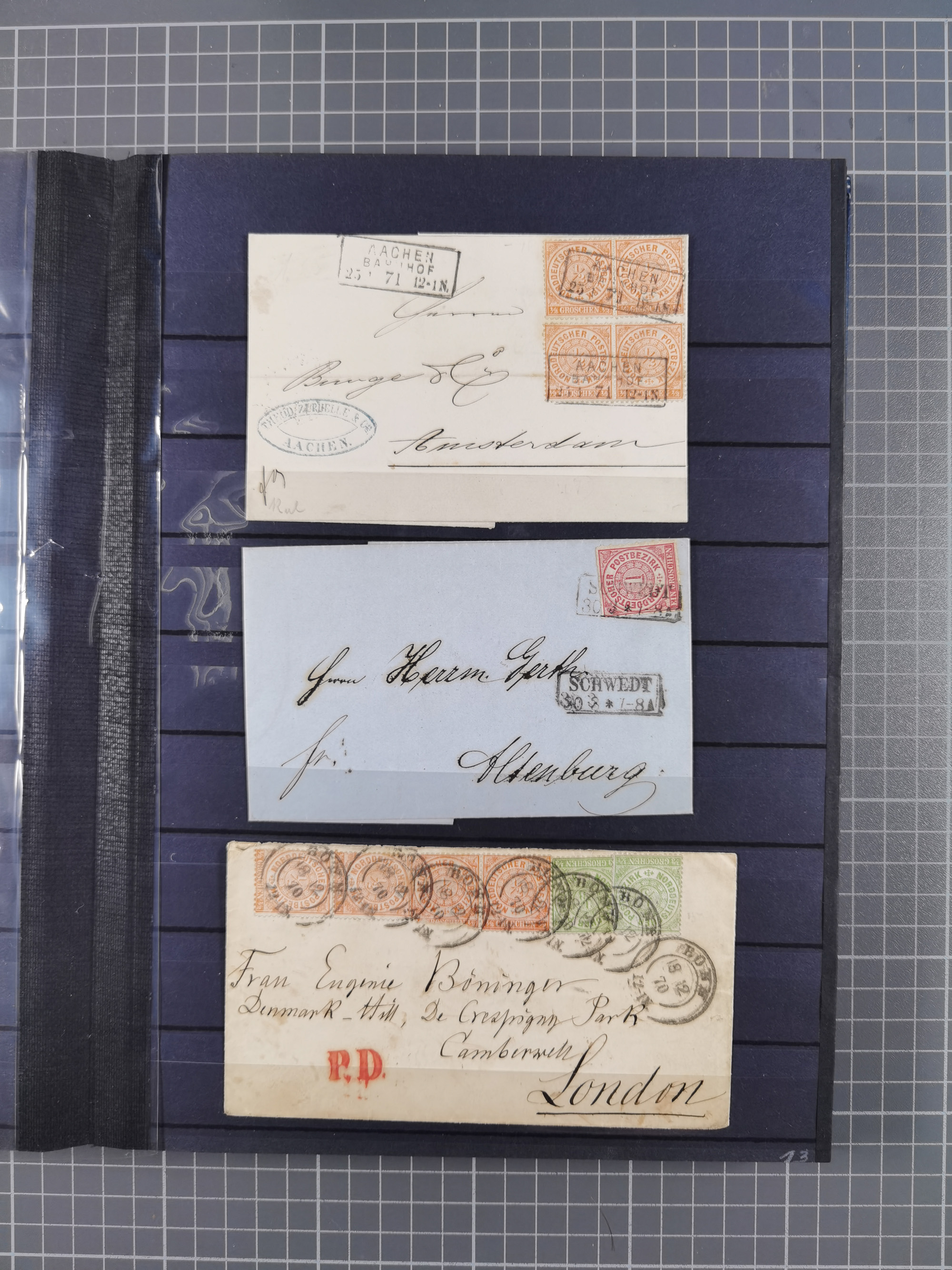 1868/71, 'Die Norddeutsche Post in Schlesien', Ausstellungssammlung mit rund 160 Belegen, dabei viele Besonderheiten, Ersttagsbriefe der Mi. 3 und 4, Orts-R-Brief von Breslau, 2 Express-Karten, viele Paketbegleit- und Wertsendungen, Teil- und Mischfrankaturen, frankierte Postanweisung, Reco-Brief an den preußischen König, Auslandsbriefe u.a. nach Schweden und Konstantinopel, Drucksache nach Italien und Briefvorderseite ans Kap der Guten Hoffnung, interessanter Teil Krieg 1870/71 mit u.a. Ballon Monte-Briefen an bzw. von Kriegsgefangenen, etc. etc. Dazu ein Ordner mit zusätzlichem Material. Ein sehr interessantes und reichhaltiges Objekt.