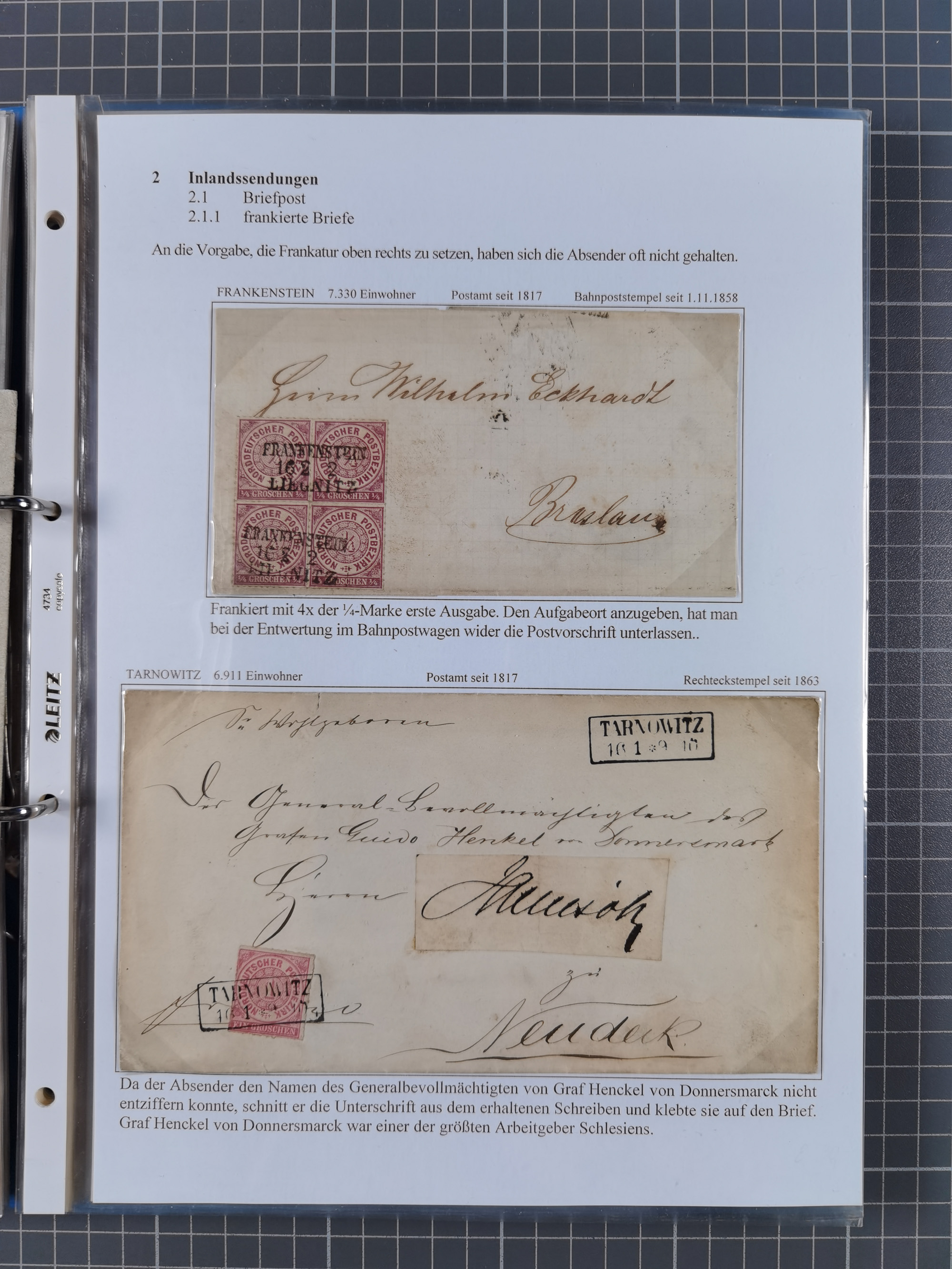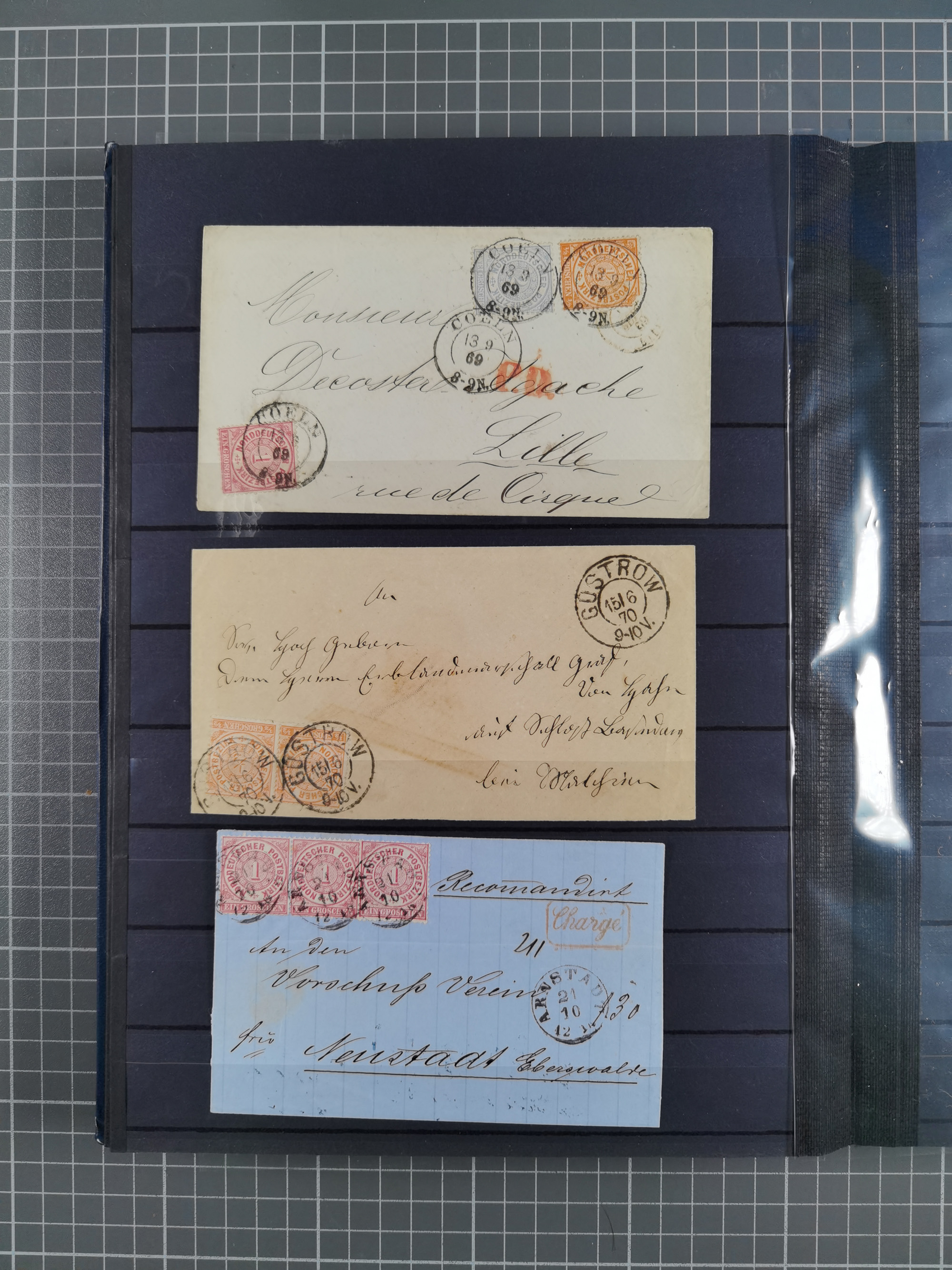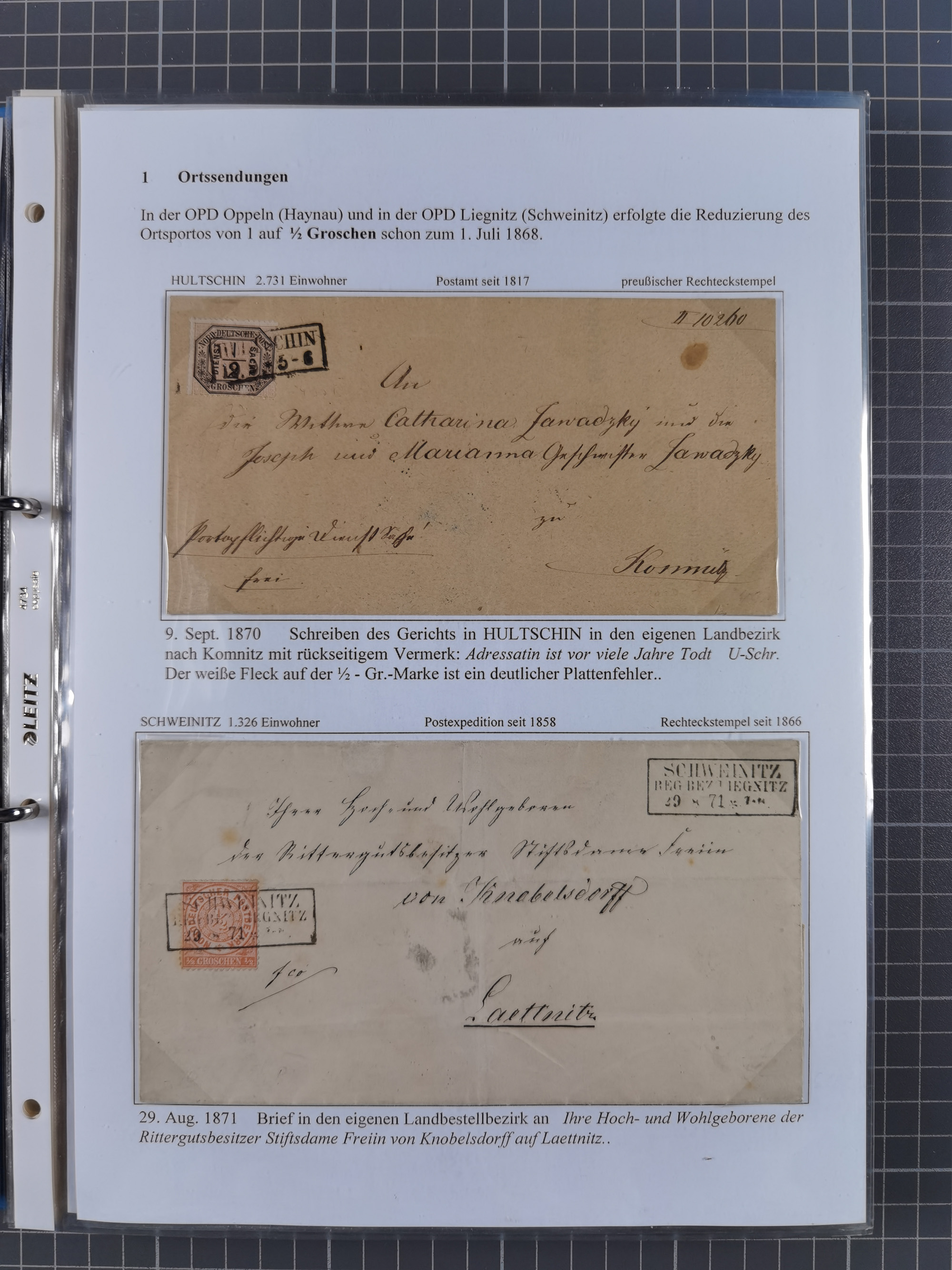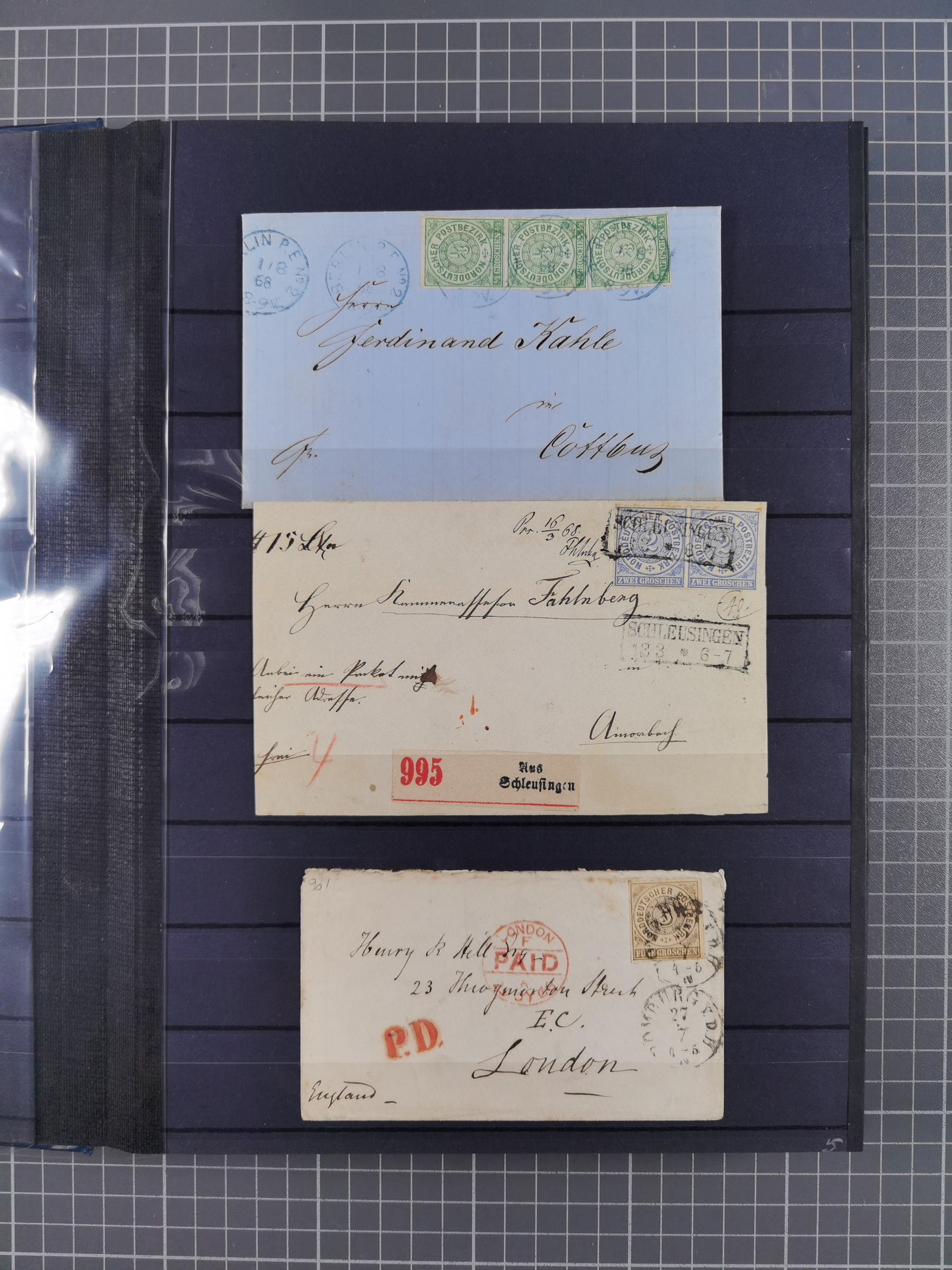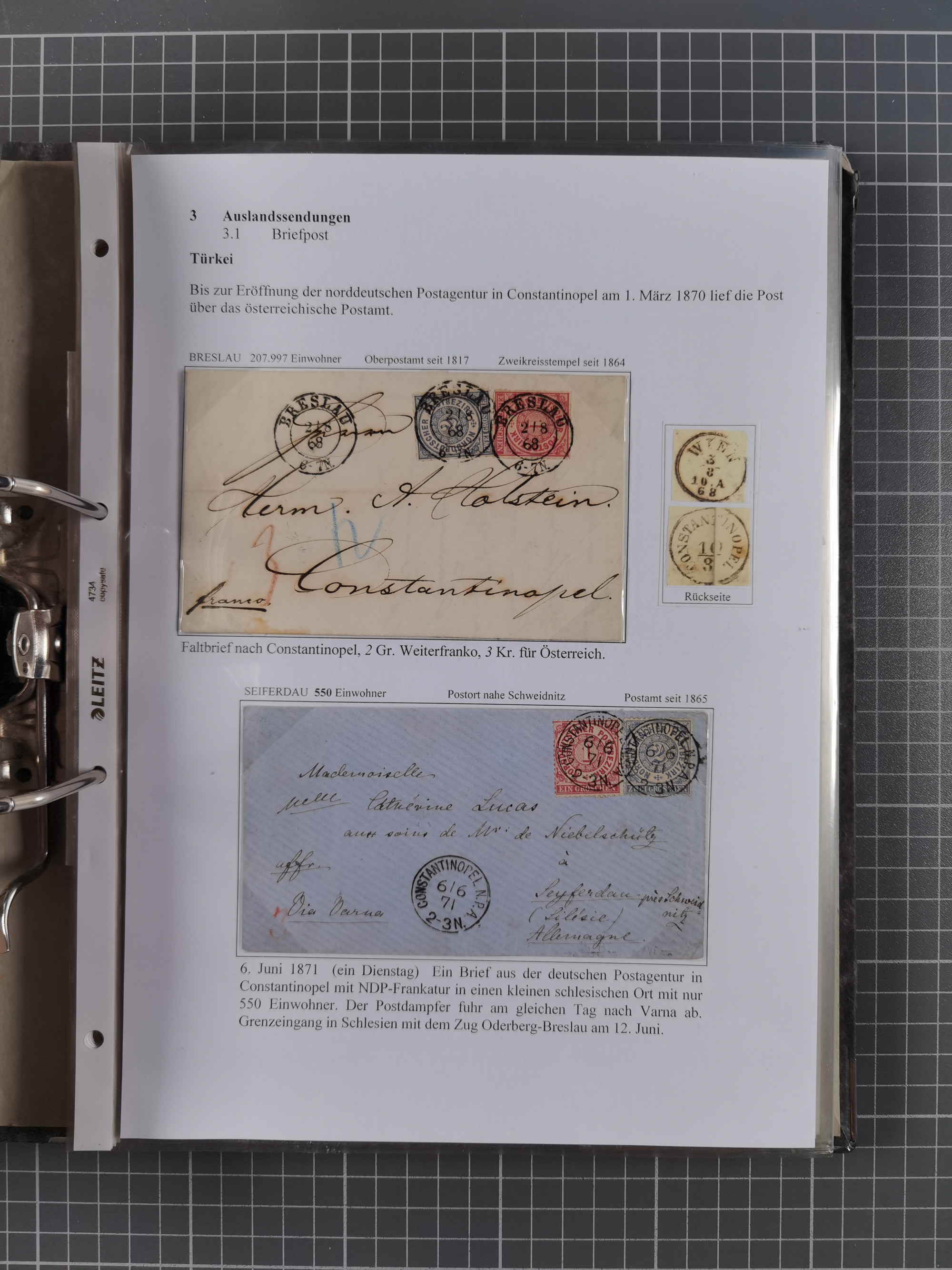 1868/71, 'Die Norddeutsche Post in Schlesien', Ausstellungssammlung mit rund 160 Belegen, dabei viele Besonderheiten, Ersttagsbriefe der Mi. 3 und 4, Orts-R-Brief von Breslau, 2 Express-Karten, viele Paketbegleit- und Wertsendungen, Teil- und Mischfrankaturen, frankierte Postanweisung, Reco-Brief an den preußischen König, Auslandsbriefe u.a. nach Schweden und Konstantinopel, Drucksache nach Italien und Briefvorderseite ans Kap der Guten Hoffnung, interessanter Teil Krieg 1870/71 mit u.a. Ballon Monte-Briefen an bzw. von Kriegsgefangenen, etc. etc. Dazu ein Ordner mit zusätzlichem Material. Ein sehr interessantes und reichhaltiges Objekt.