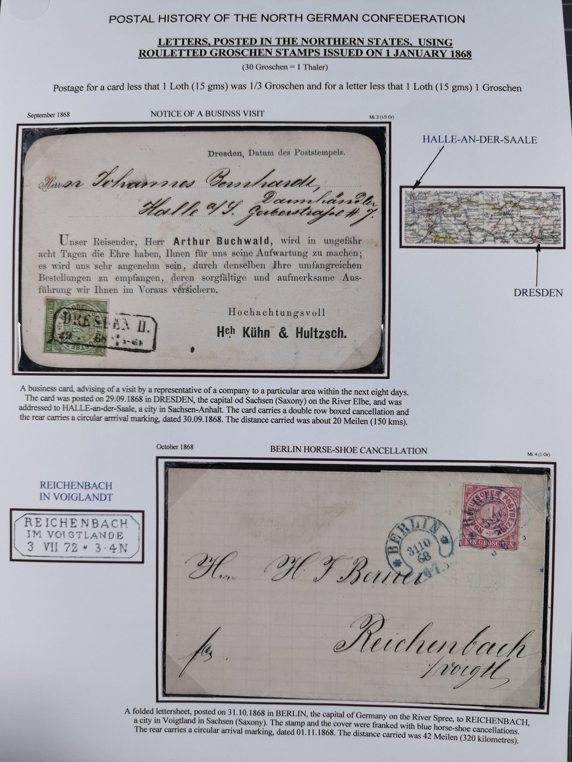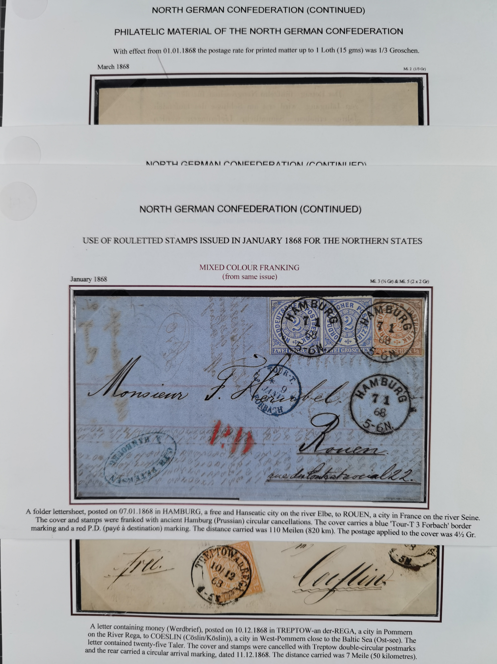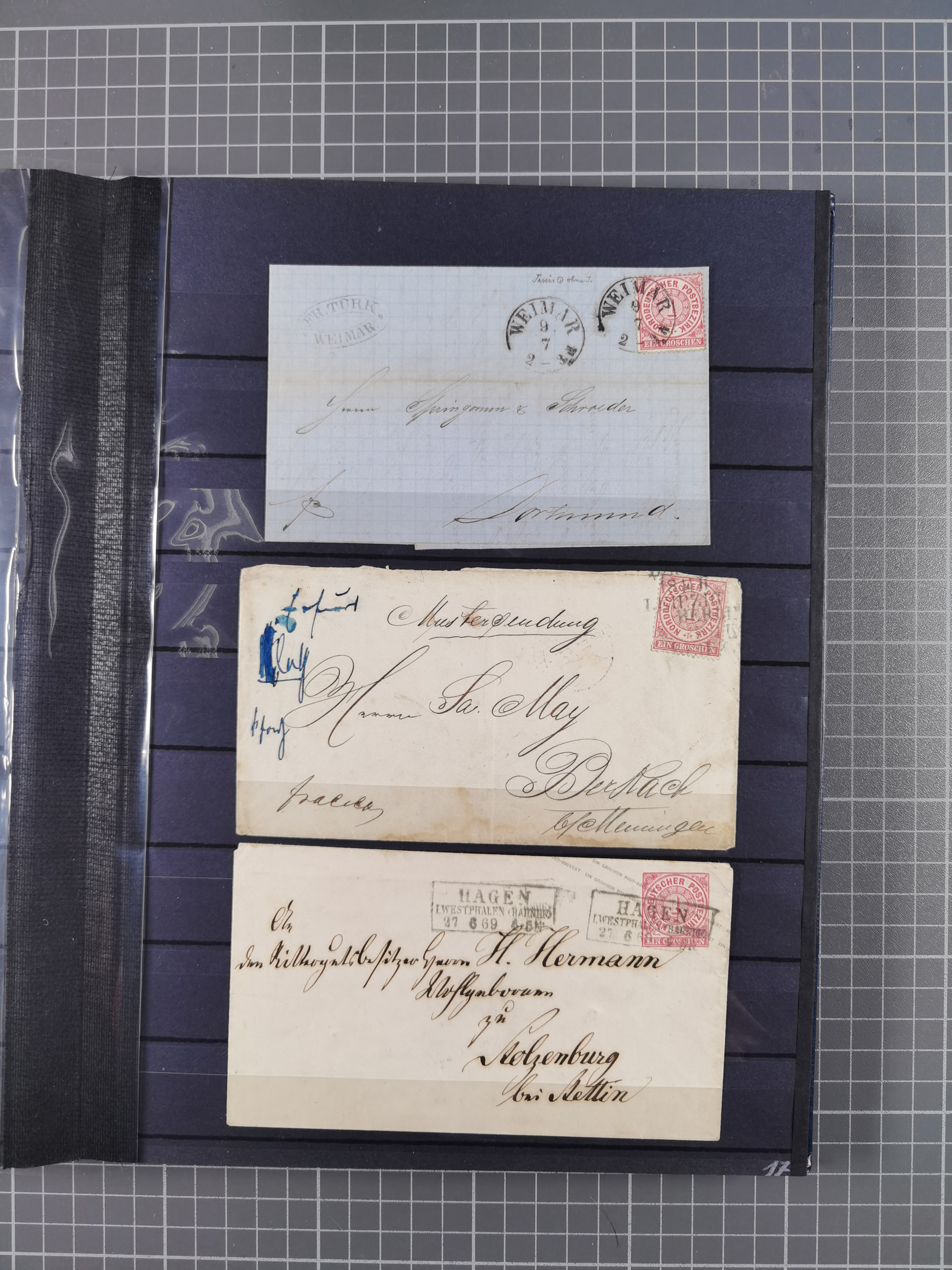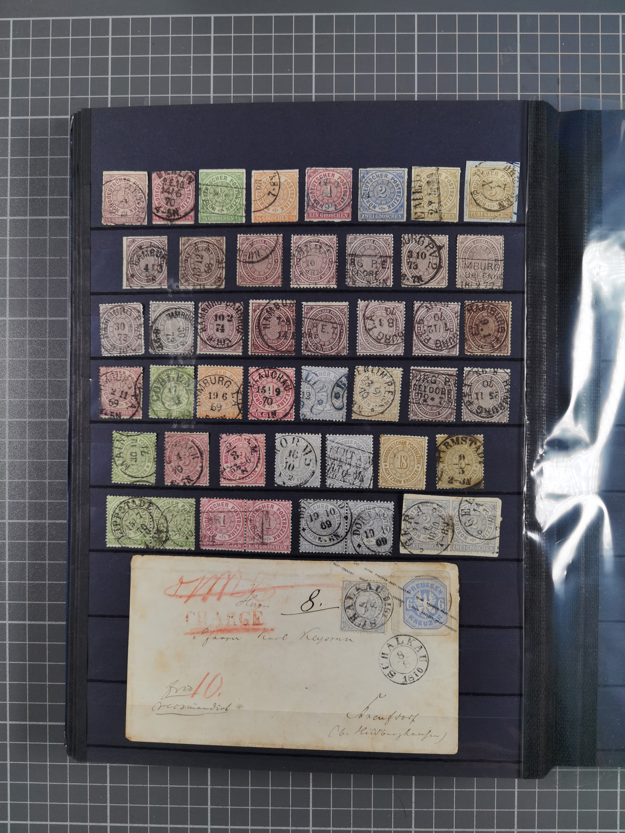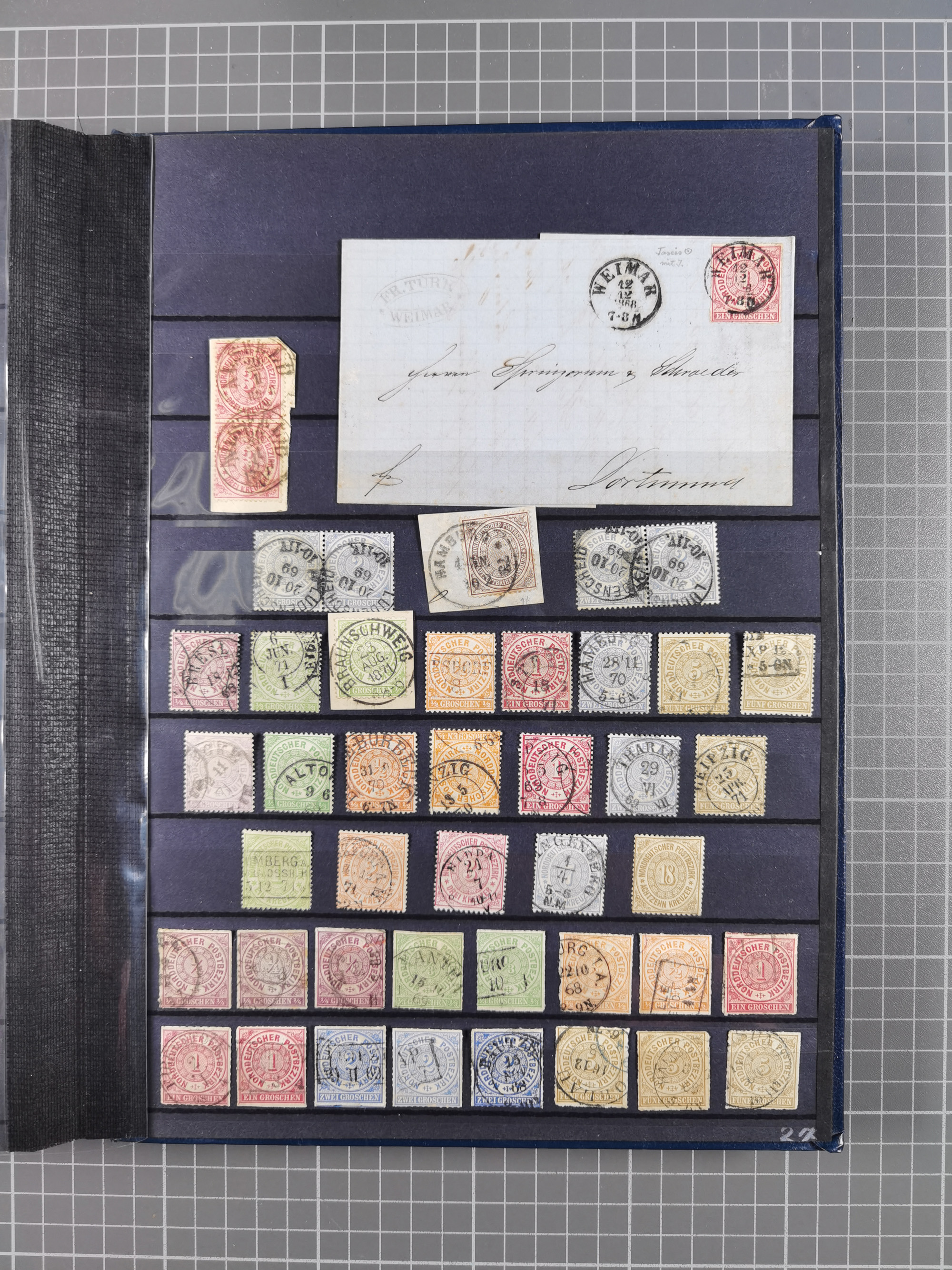 REICHSPOST-VORLÄUFER, ausstellungsmäßig aufgezogene Spezialsammlung von rund 120 Belegen und einigen losen Marken, Einheiten und Briefstücken, dabei eine Vielzahl von seltenen und besonderen Stücken, u.a. Frankaturen der durchstochenen Marken Mi. 2-4,9 und 11 (letztere u.a. MeF), Ortsbriefe und -Karten, Auslandsbriefe (dabei Drucksachen, Reco und Grenzrayon), 'Muster ohne Wert', Bücherzettel, Letzttagsbrief, Ganzsachenausschnitte auf Briefen, Eilboten, Währungsmischfrankatur, Mi. 25 als Mehrfachfrankatur und in Farbfrankatur auf Reco-Brief nach Frankreich, etc. etc. ein sehr interessantes und reichhaltiges Objekt.