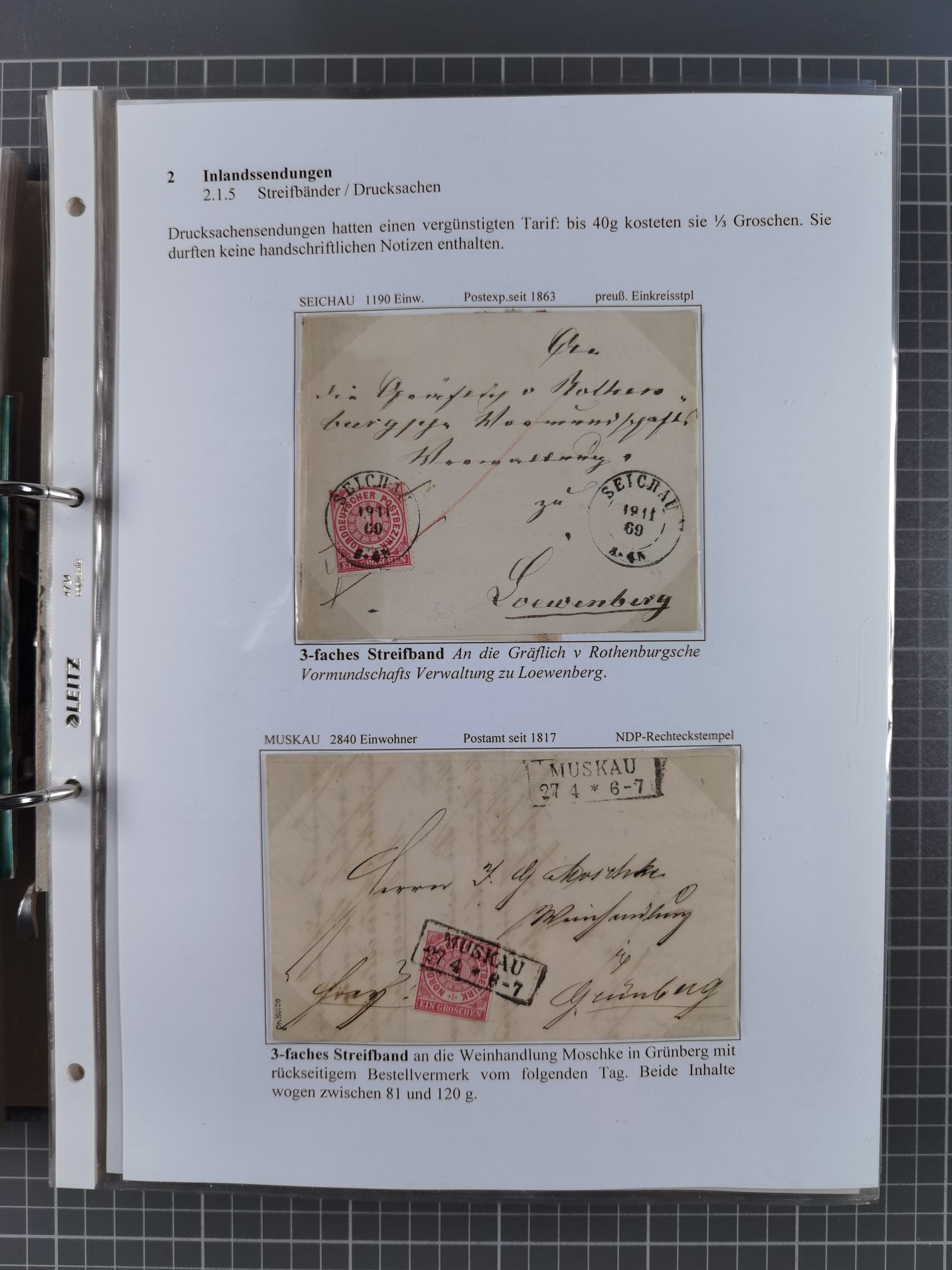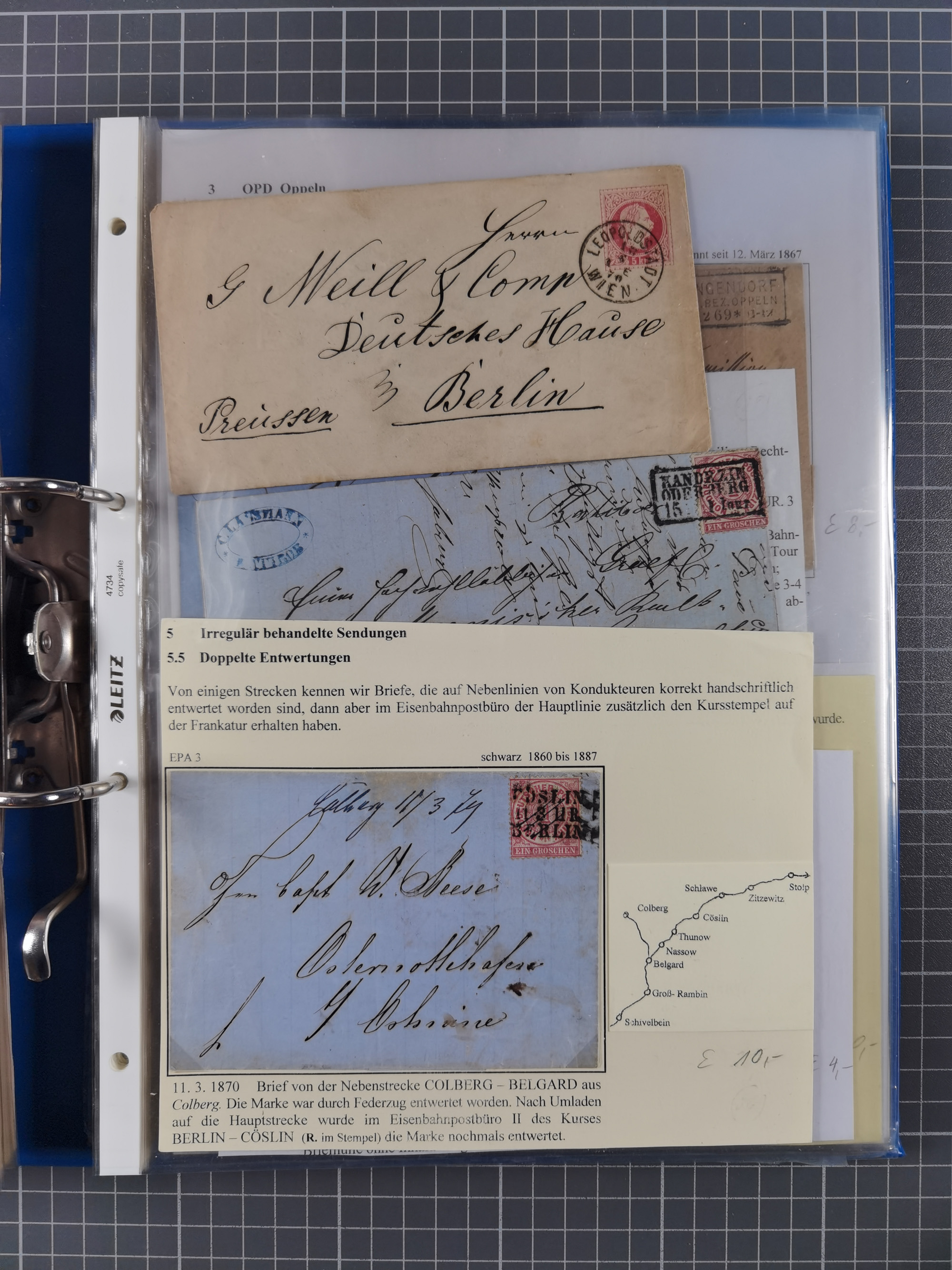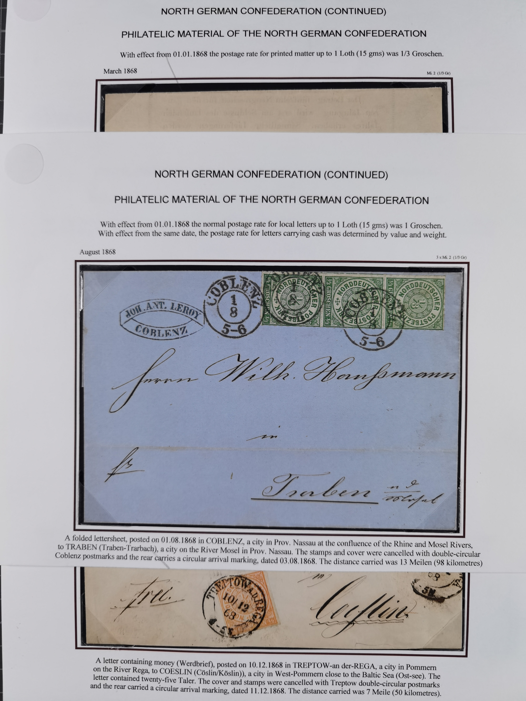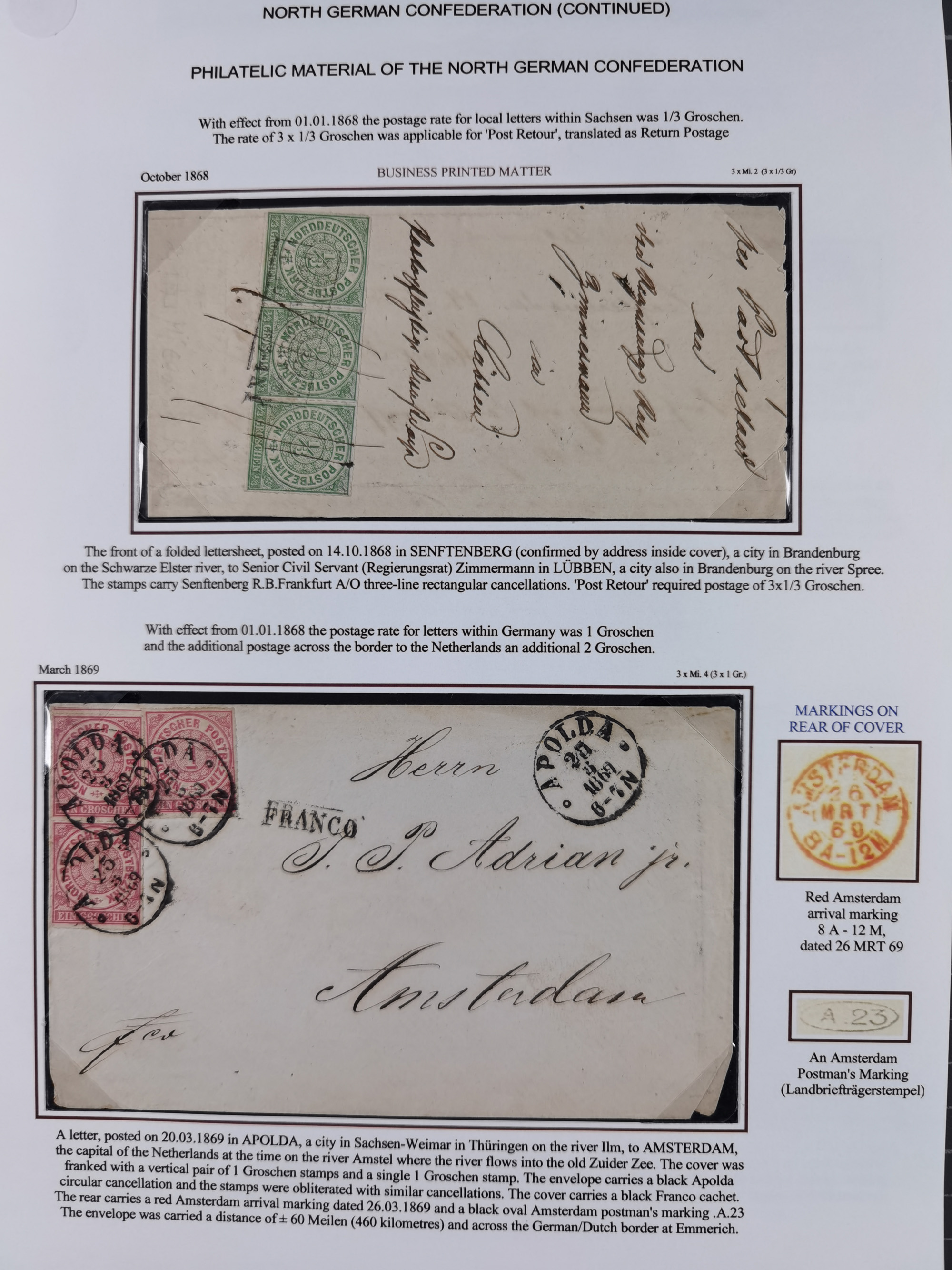 REICHSPOST-VORLÄUFER, ausstellungsmäßig aufgezogene Spezialsammlung von rund 120 Belegen und einigen losen Marken, Einheiten und Briefstücken, dabei eine Vielzahl von seltenen und besonderen Stücken, u.a. Frankaturen der durchstochenen Marken Mi. 2-4,9 und 11 (letztere u.a. MeF), Ortsbriefe und -Karten, Auslandsbriefe (dabei Drucksachen, Reco und Grenzrayon), 'Muster ohne Wert', Bücherzettel, Letzttagsbrief, Ganzsachenausschnitte auf Briefen, Eilboten, Währungsmischfrankatur, Mi. 25 als Mehrfachfrankatur und in Farbfrankatur auf Reco-Brief nach Frankreich, etc. etc. ein sehr interessantes und reichhaltiges Objekt.