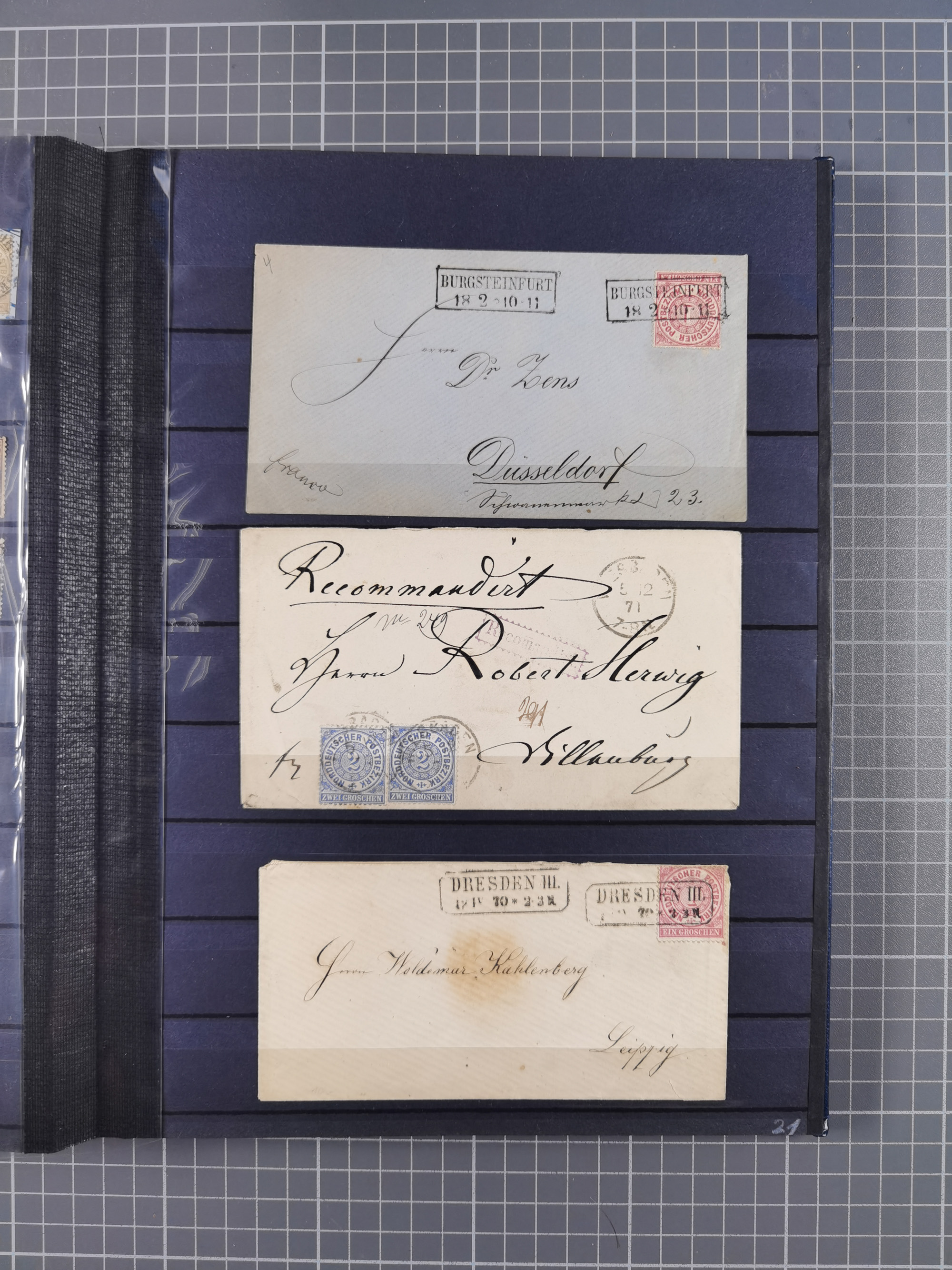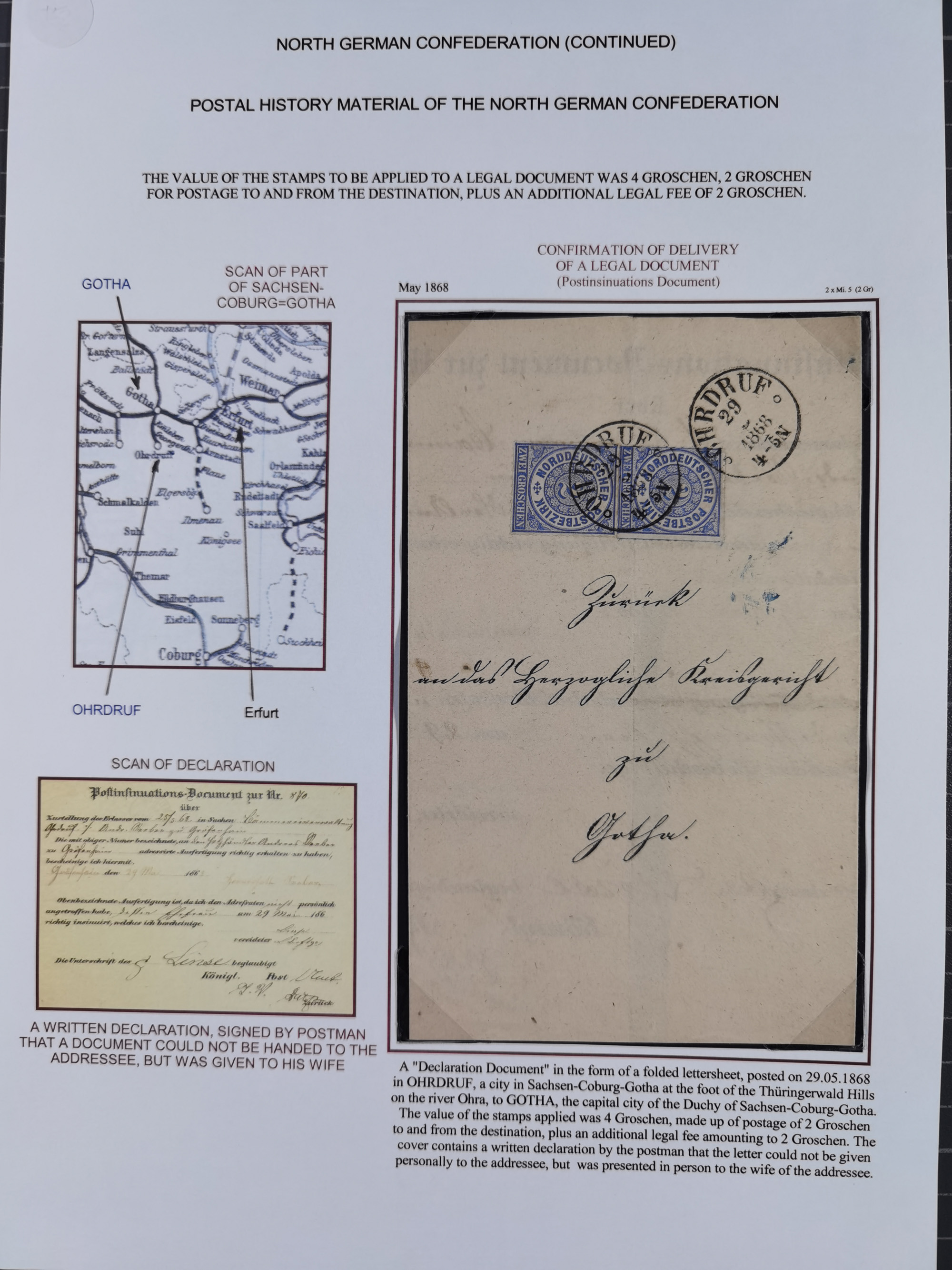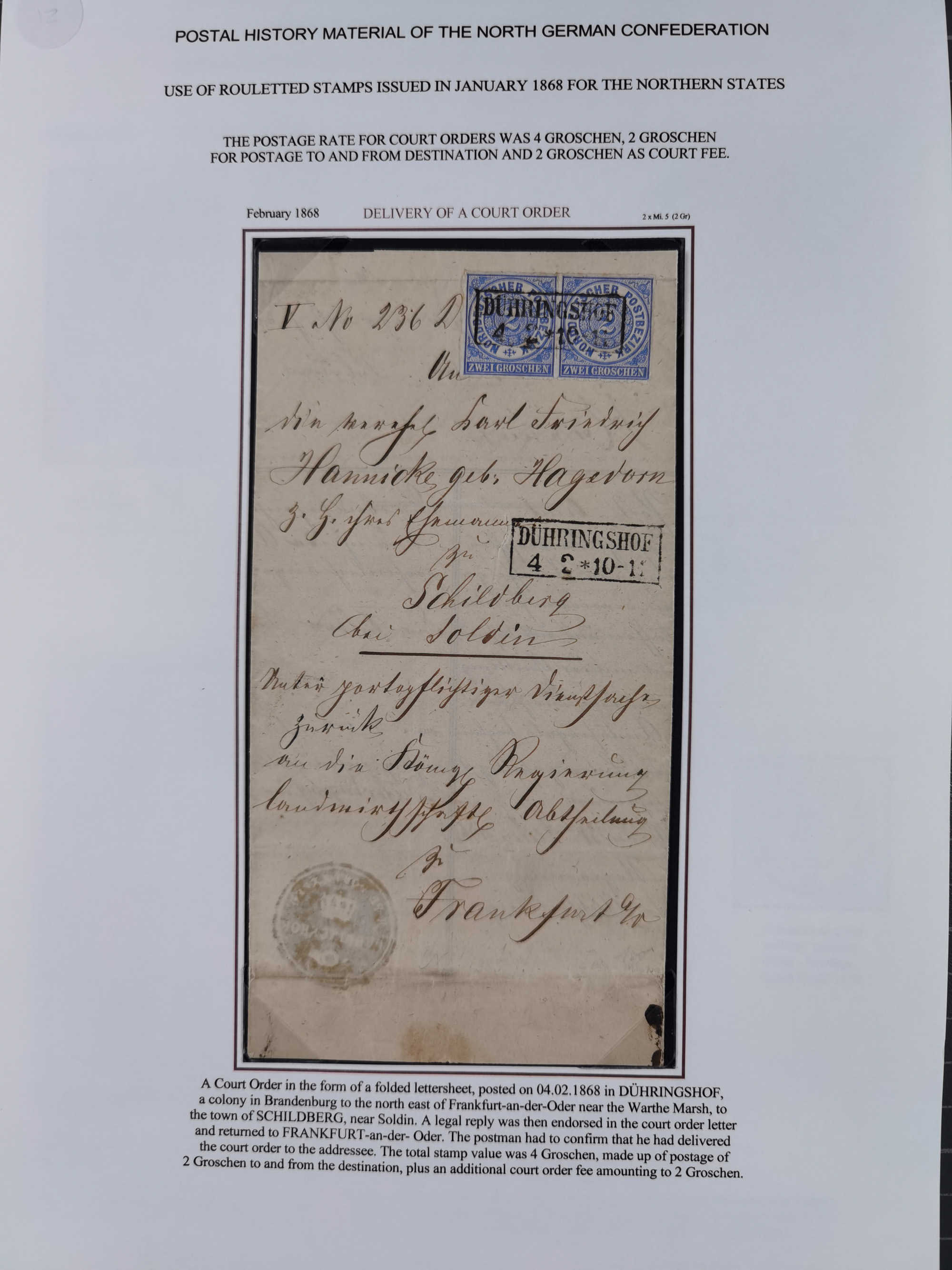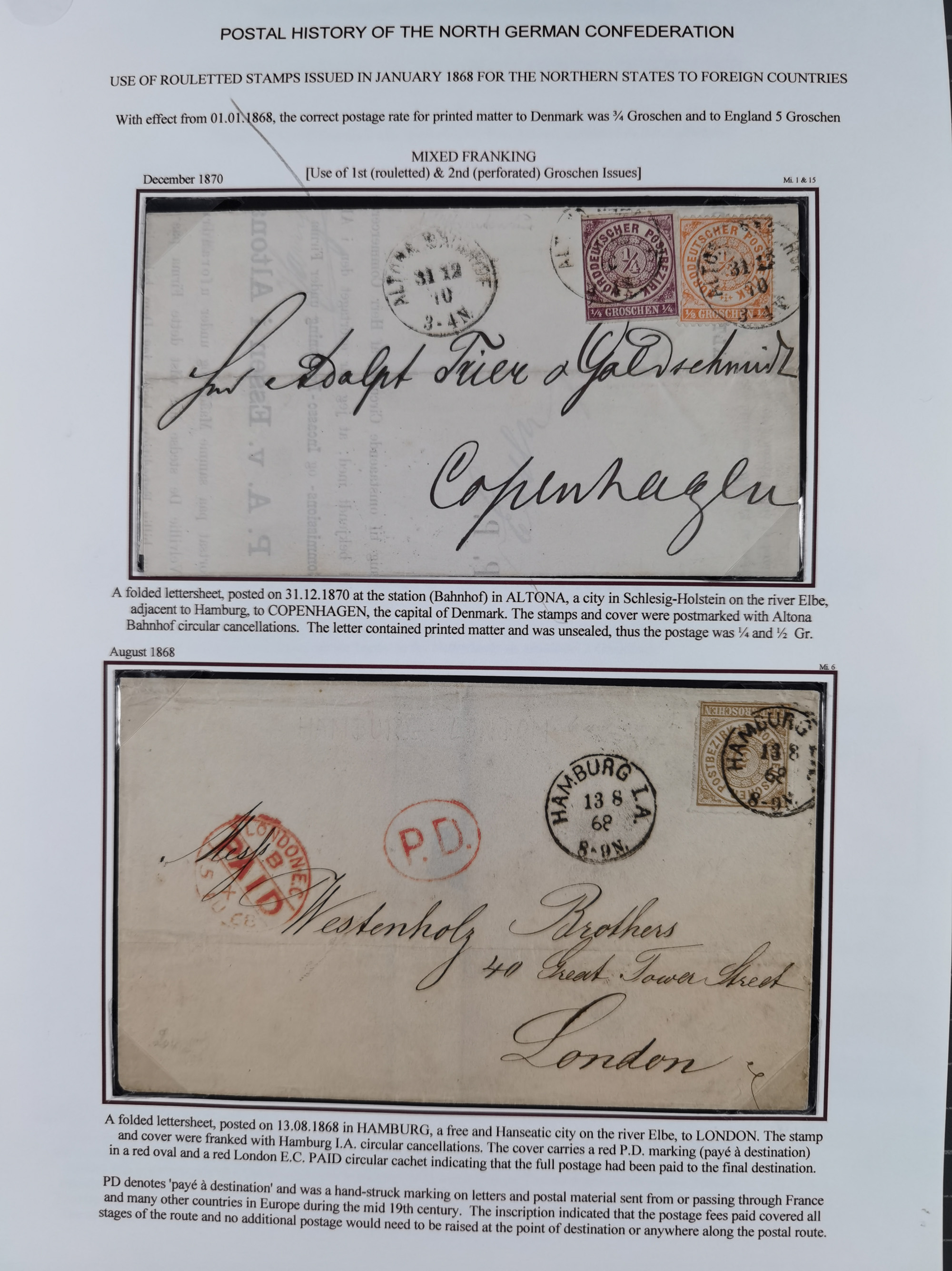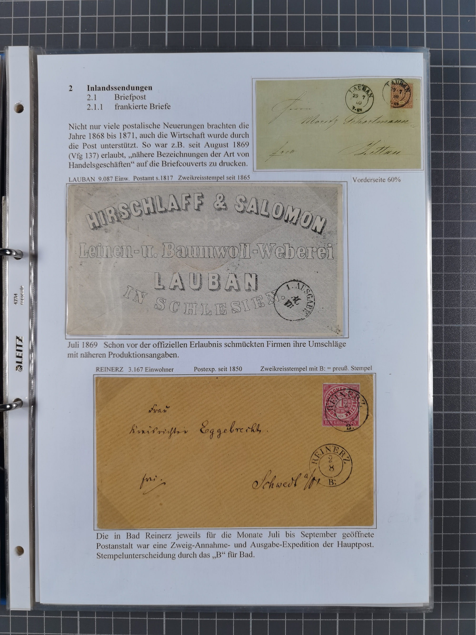 REICHSPOST-VORLÄUFER, ausstellungsmäßig aufgezogene Spezialsammlung von rund 120 Belegen und einigen losen Marken, Einheiten und Briefstücken, dabei eine Vielzahl von seltenen und besonderen Stücken, u.a. Frankaturen der durchstochenen Marken Mi. 2-4,9 und 11 (letztere u.a. MeF), Ortsbriefe und -Karten, Auslandsbriefe (dabei Drucksachen, Reco und Grenzrayon), 'Muster ohne Wert', Bücherzettel, Letzttagsbrief, Ganzsachenausschnitte auf Briefen, Eilboten, Währungsmischfrankatur, Mi. 25 als Mehrfachfrankatur und in Farbfrankatur auf Reco-Brief nach Frankreich, etc. etc. ein sehr interessantes und reichhaltiges Objekt.