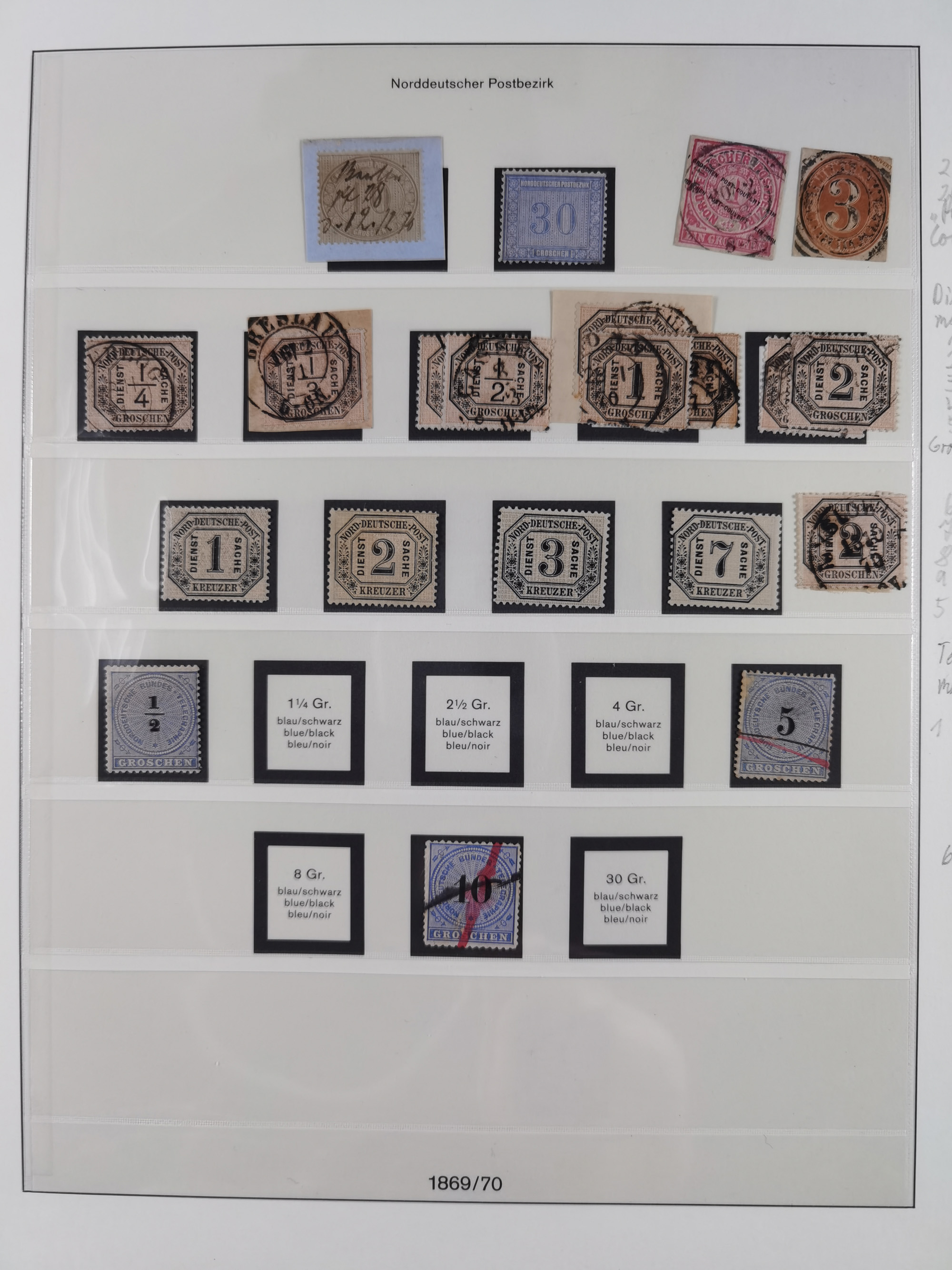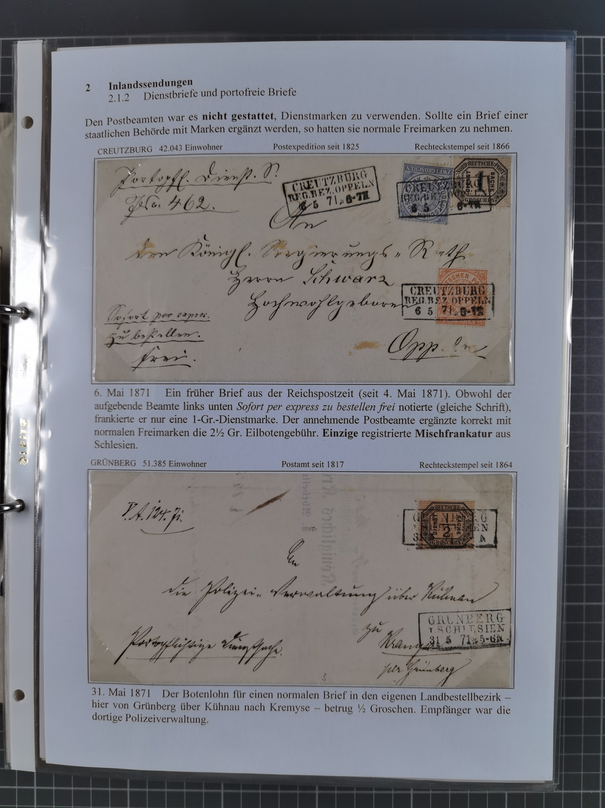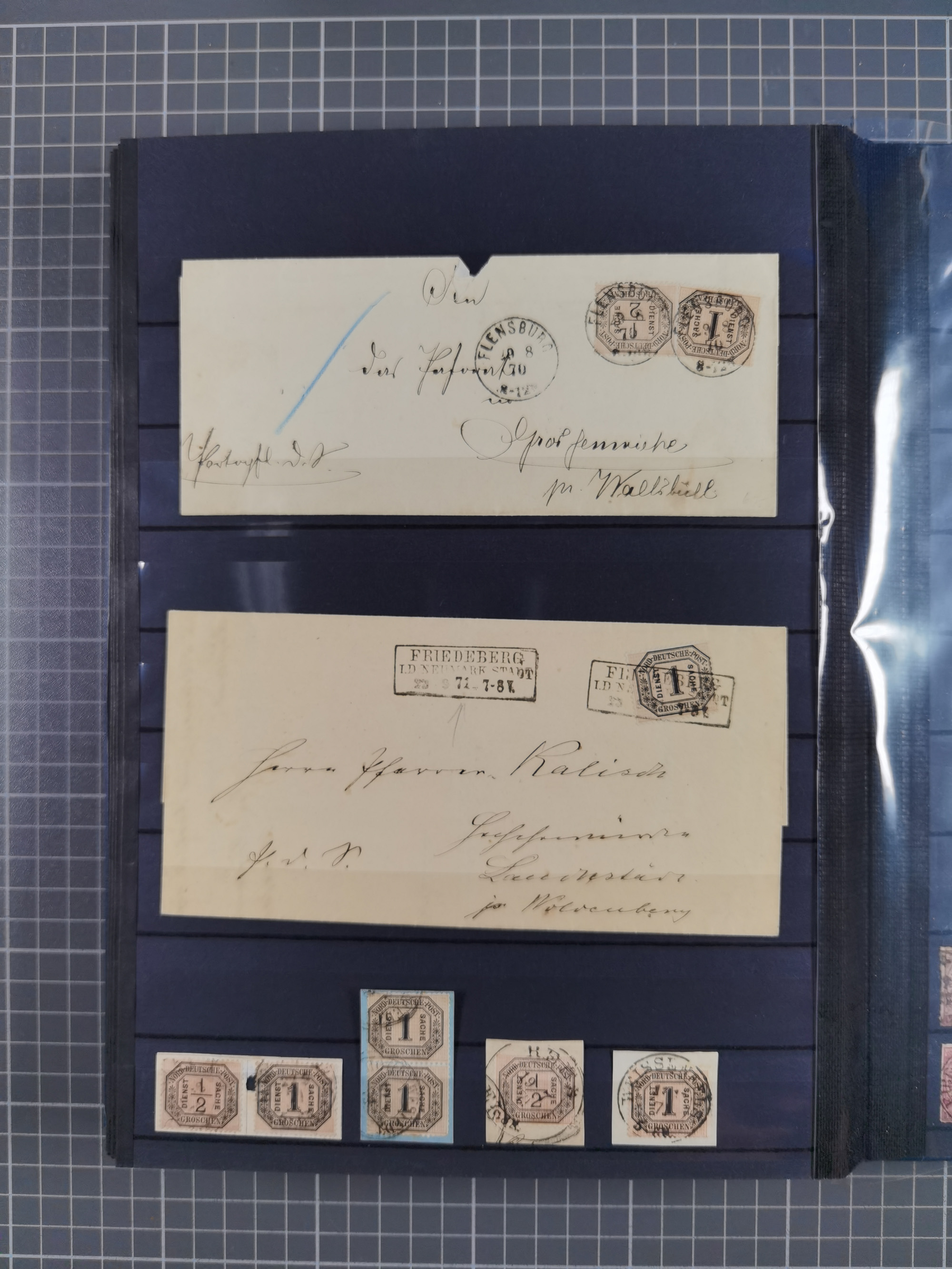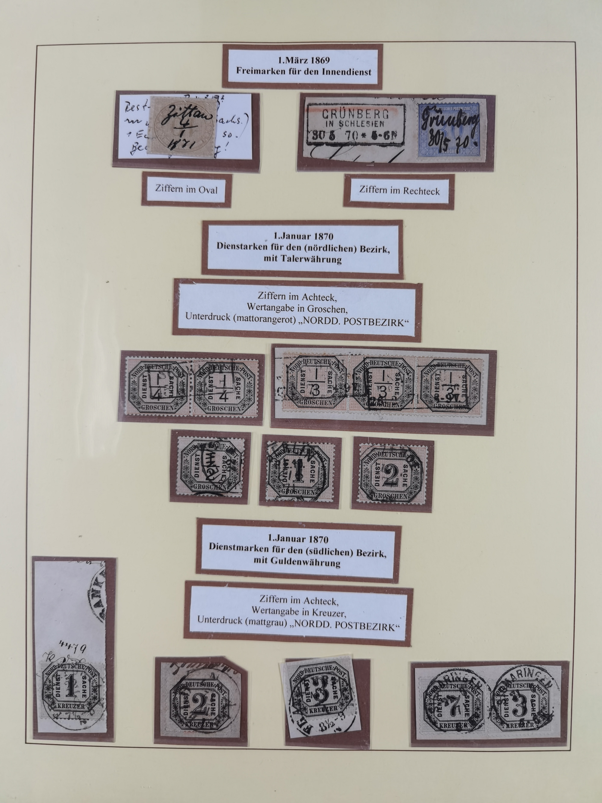 1871, DIENSTMARKEN-REICHSPOST-VORLÄUFER, ausstellungsmäßig aufgezogene kleine Spezialsammlung mit insgesamt 18 Belegen sowie einigen losen Marken und Briefstücken, dabei Mehrfachfrankaturen kleiner Groschenwerte, 2 Mischfrankaturen mit Freimarken, 1 Kr. im 3er-Streifen sowie 3 Briefe mit Kreuzer-Frankaturen, dabei 1 + 1+ 3 Kr.