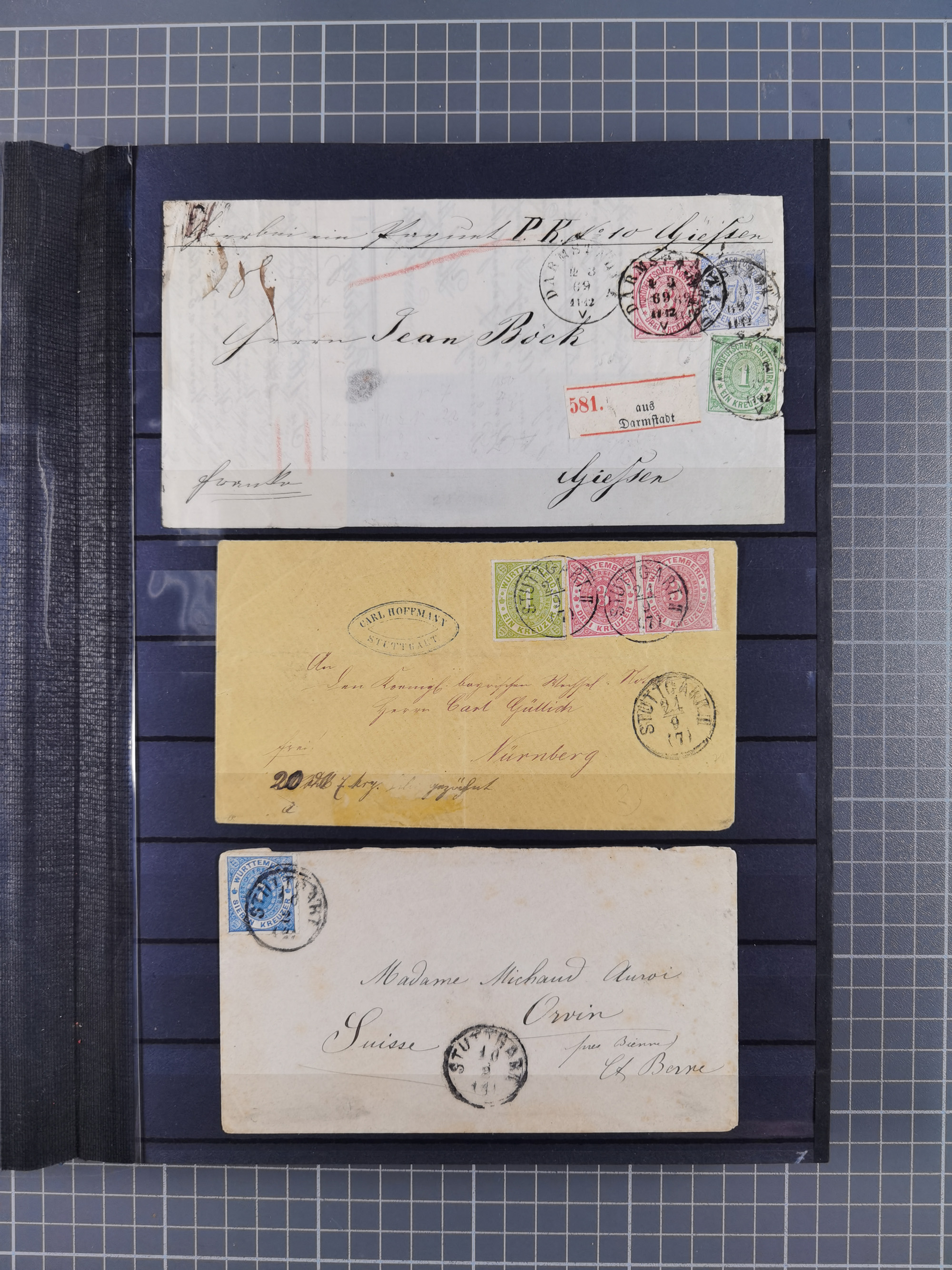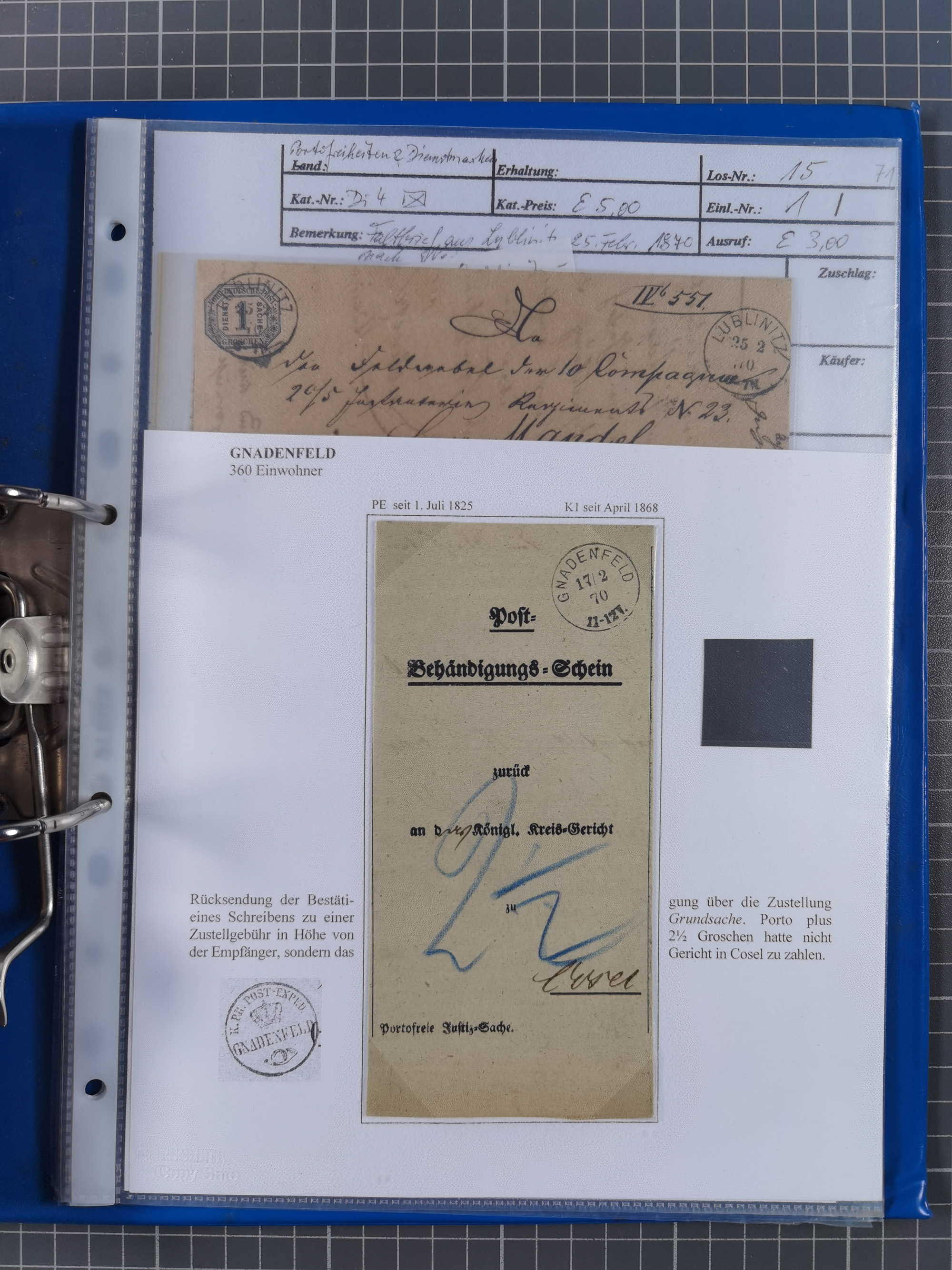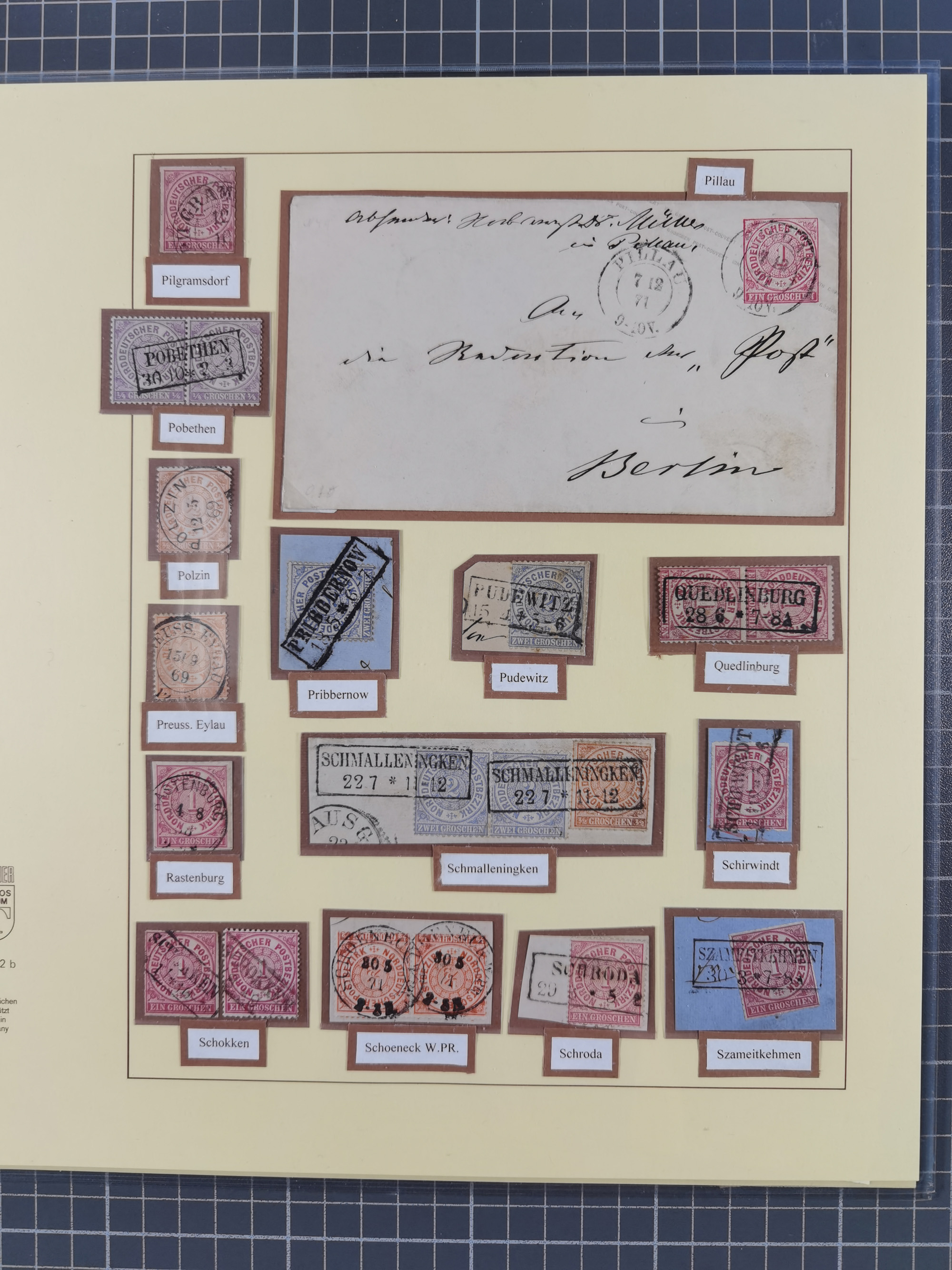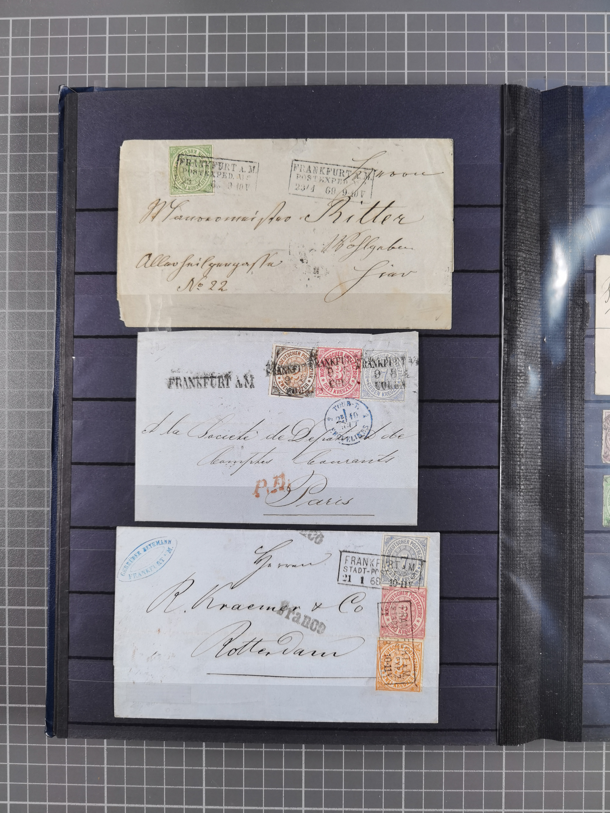1871, DIENSTMARKEN-REICHSPOST-VORLÄUFER, ausstellungsmäßig aufgezogene kleine Spezialsammlung mit insgesamt 18 Belegen sowie einigen losen Marken und Briefstücken, dabei Mehrfachfrankaturen kleiner Groschenwerte, 2 Mischfrankaturen mit Freimarken, 1 Kr. im 3er-Streifen sowie 3 Briefe mit Kreuzer-Frankaturen, dabei 1 + 1+ 3 Kr.