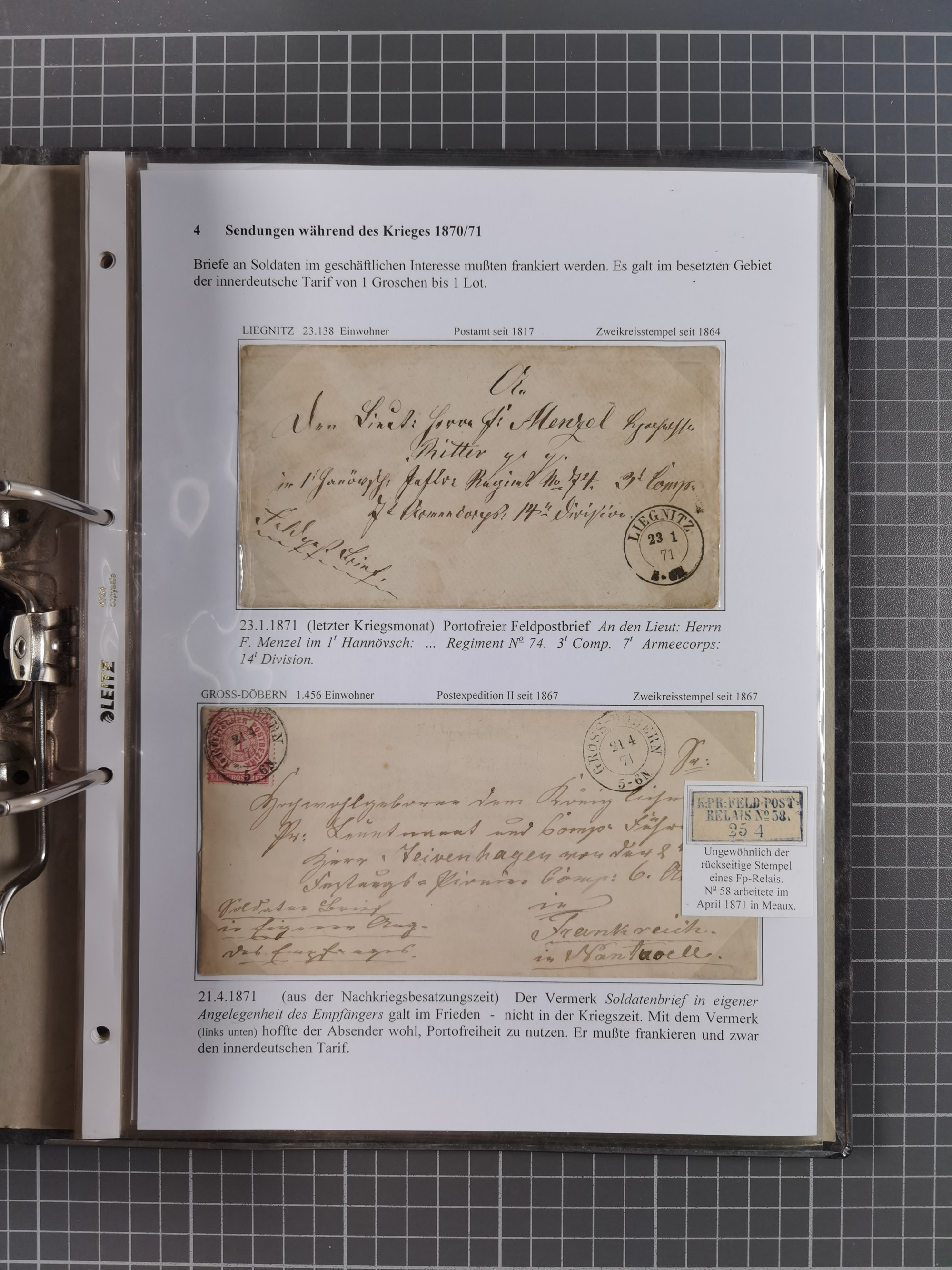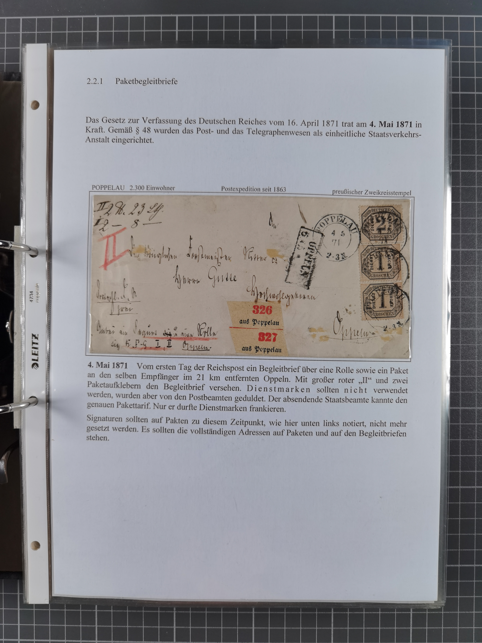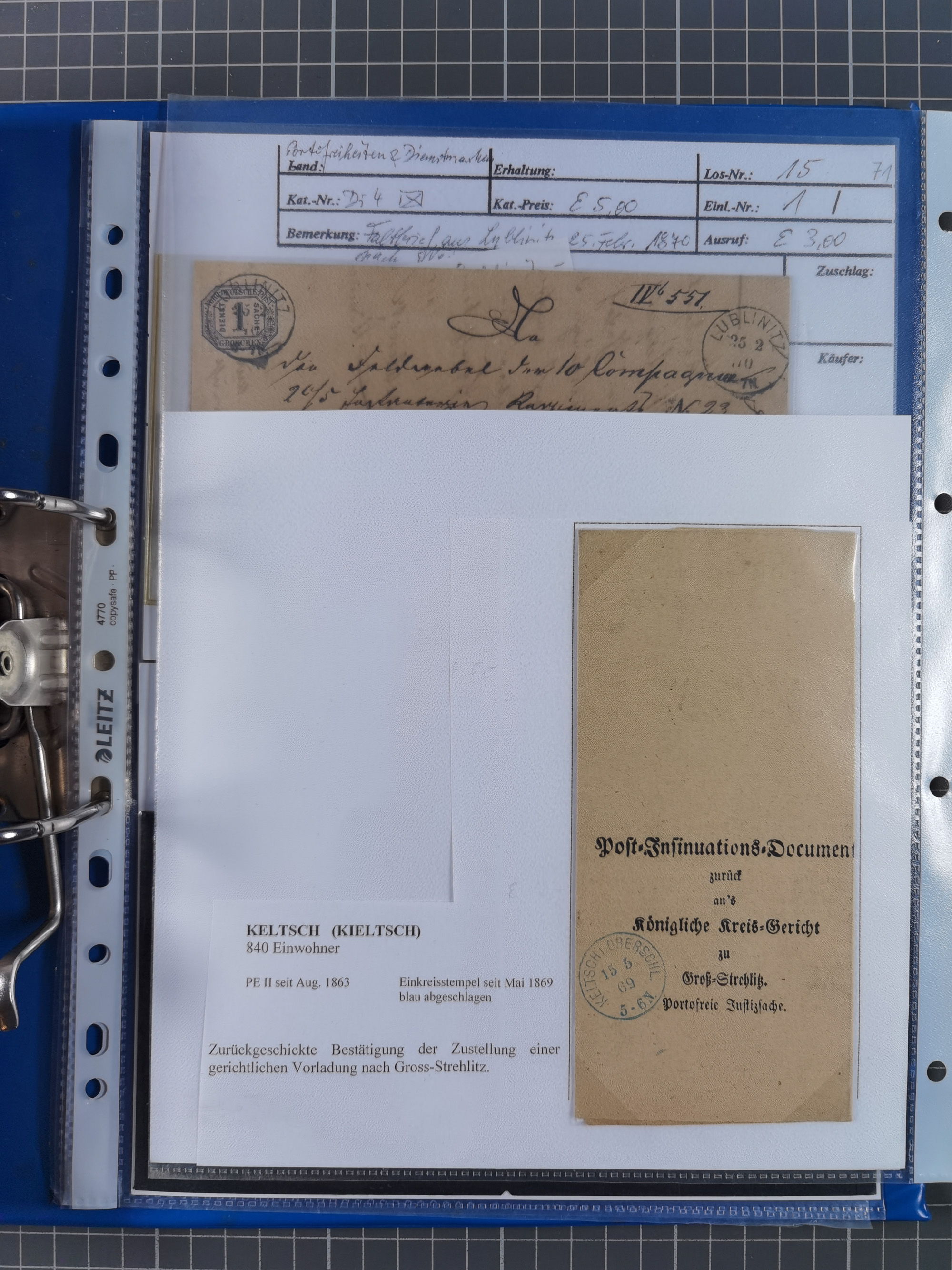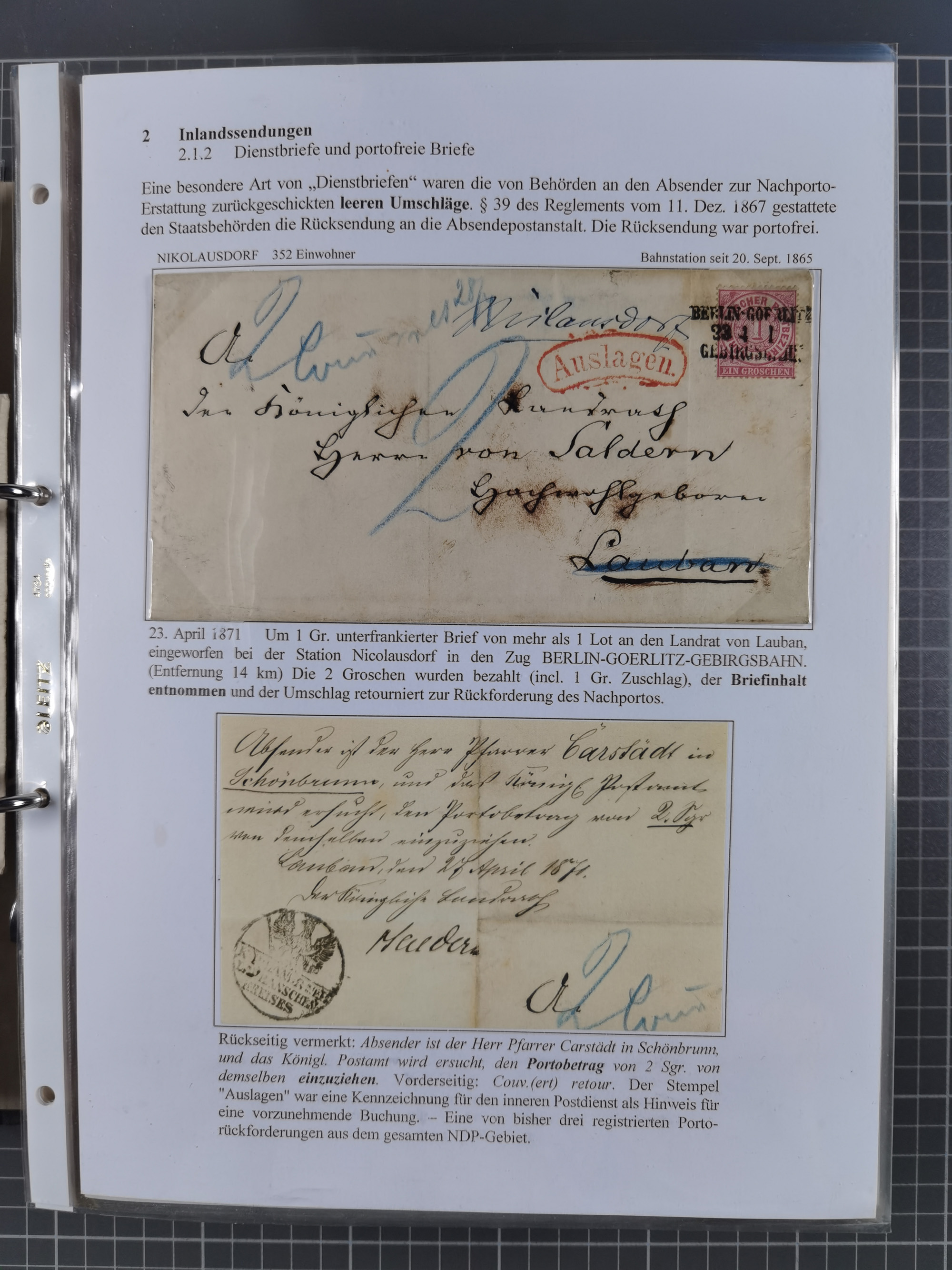 1871, DIENSTMARKEN-REICHSPOST-VORLÄUFER, ausstellungsmäßig aufgezogene kleine Spezialsammlung mit insgesamt 18 Belegen sowie einigen losen Marken und Briefstücken, dabei Mehrfachfrankaturen kleiner Groschenwerte, 2 Mischfrankaturen mit Freimarken, 1 Kr. im 3er-Streifen sowie 3 Briefe mit Kreuzer-Frankaturen, dabei 1 + 1+ 3 Kr.