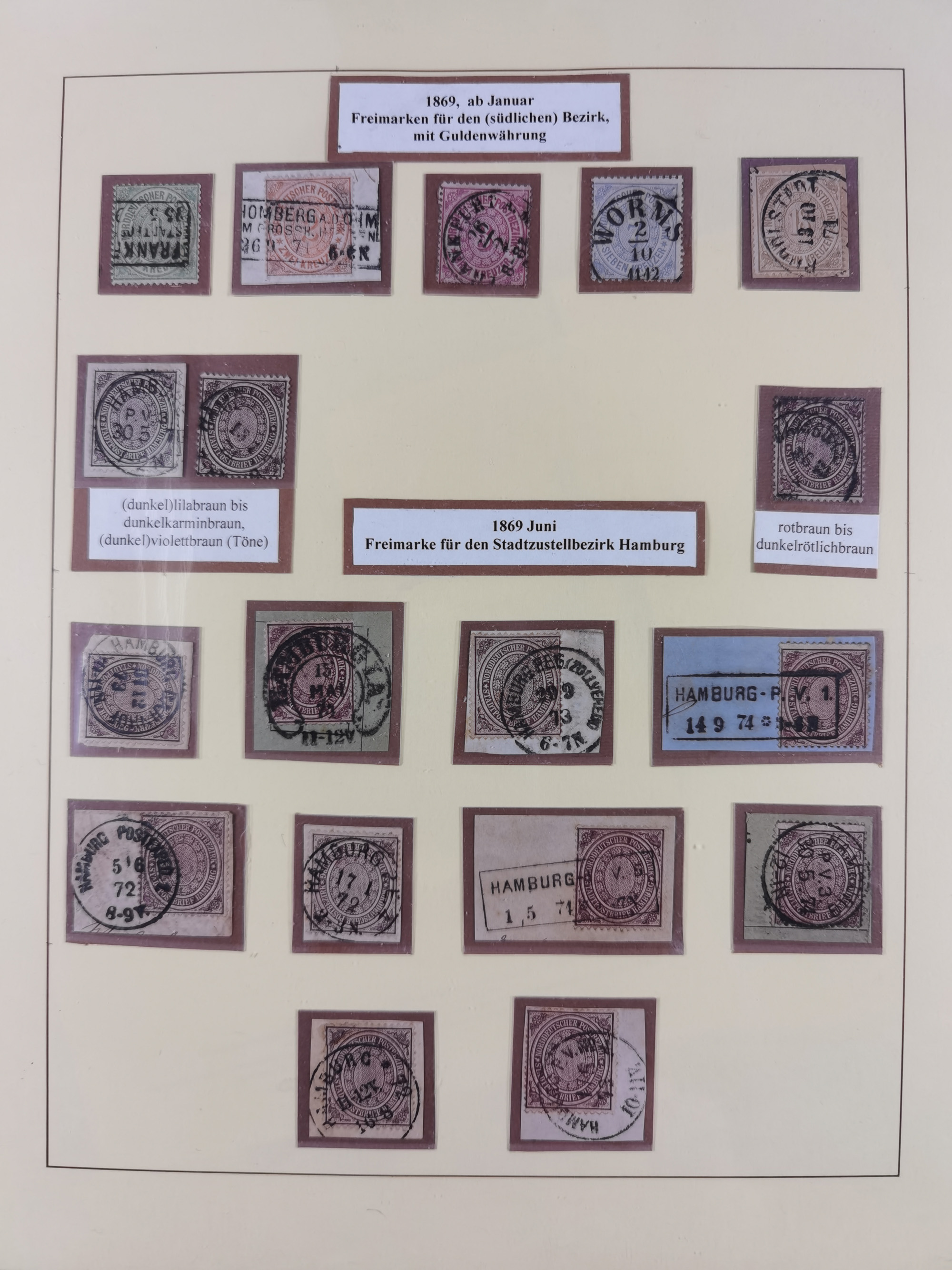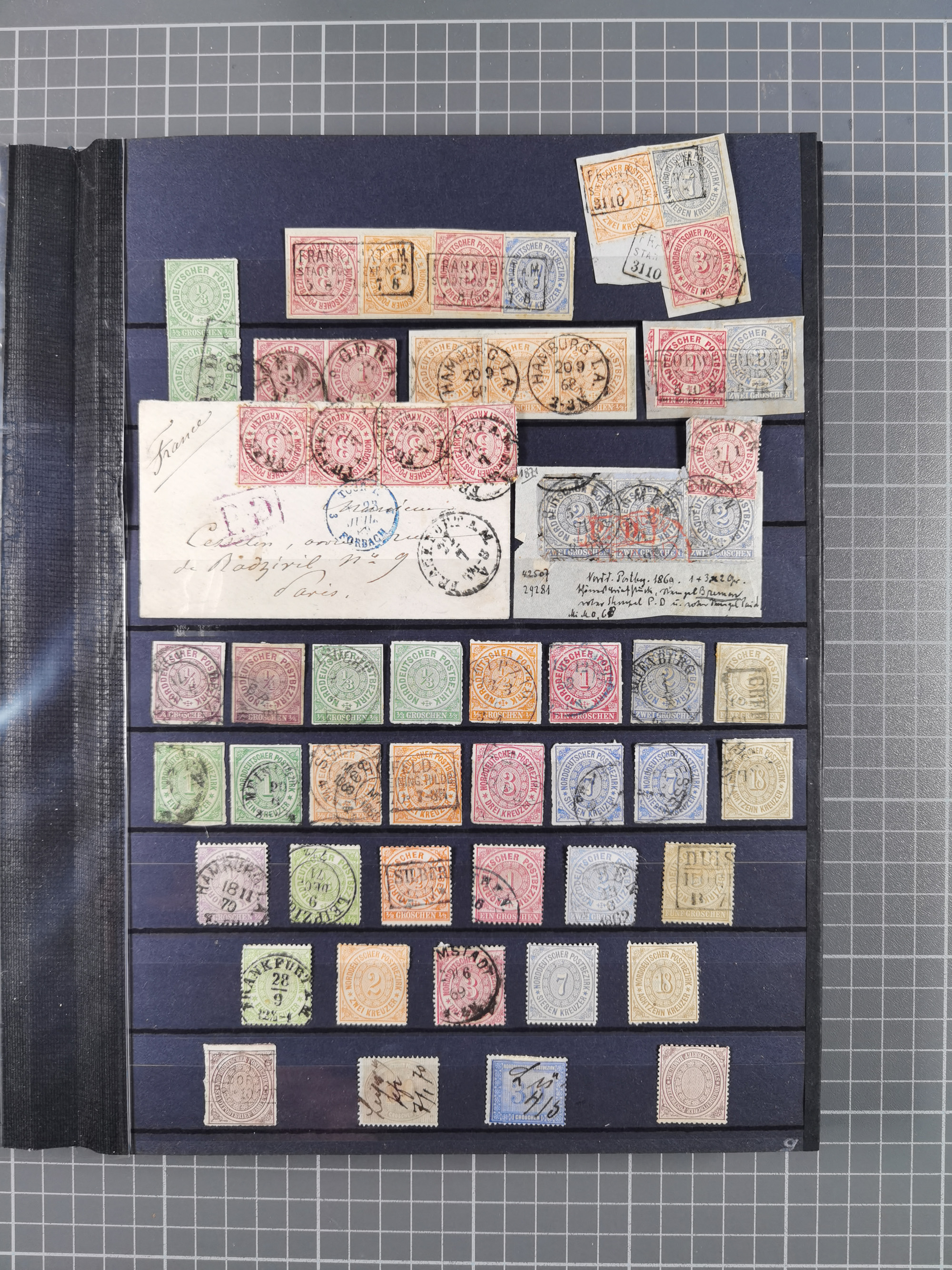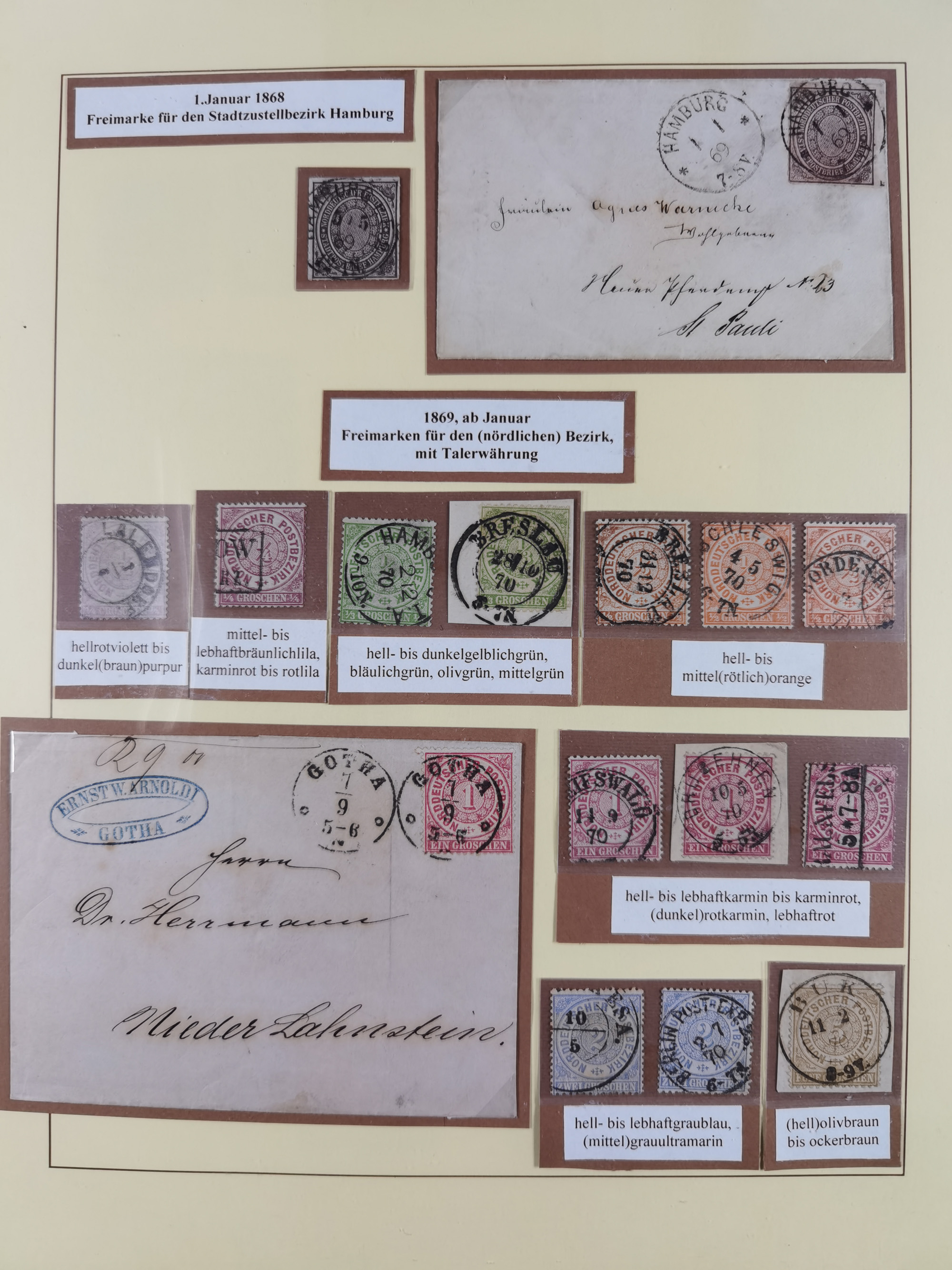 1868/71, interessante Partie im Steckbuch, dabei diverse Belege mit auch Farbfrankaturen, Paketbegleitbriefen, Auslandspost, etc.