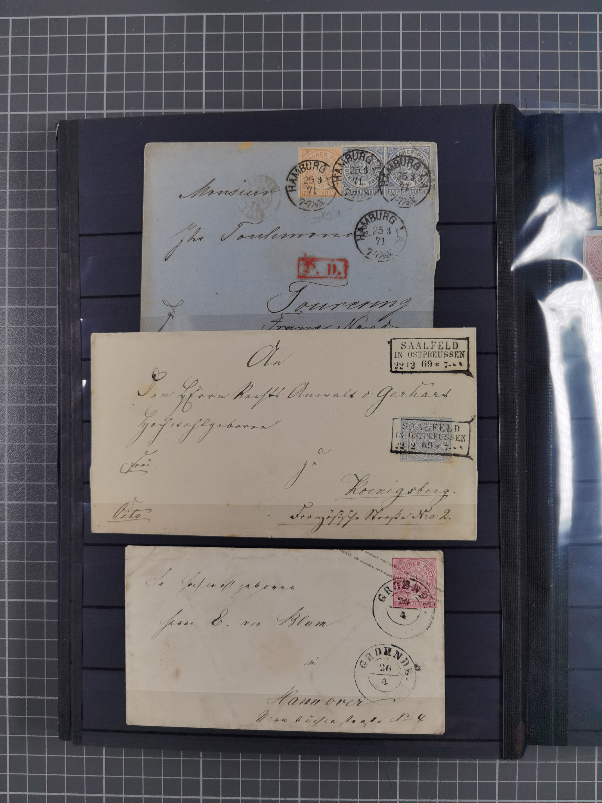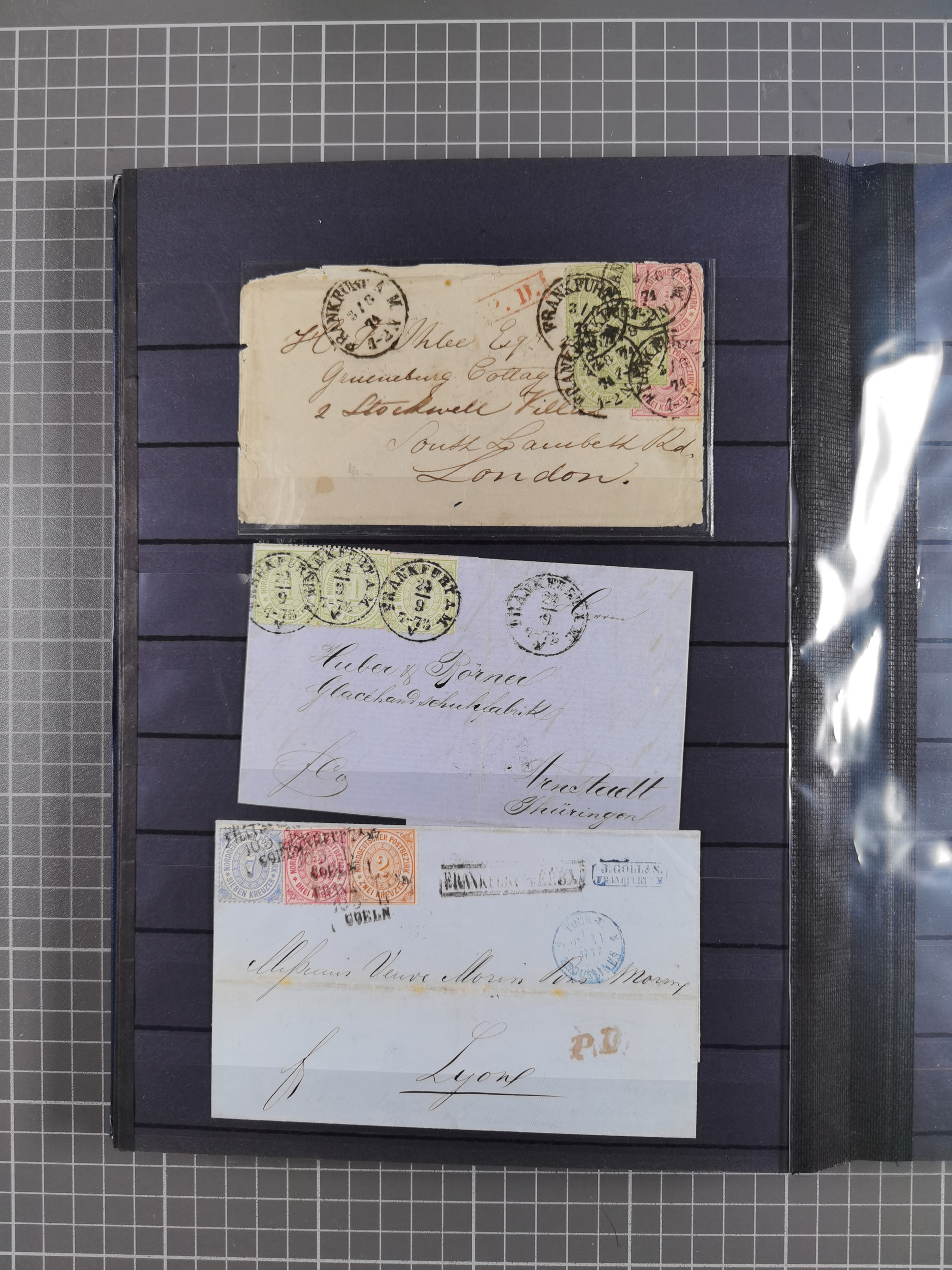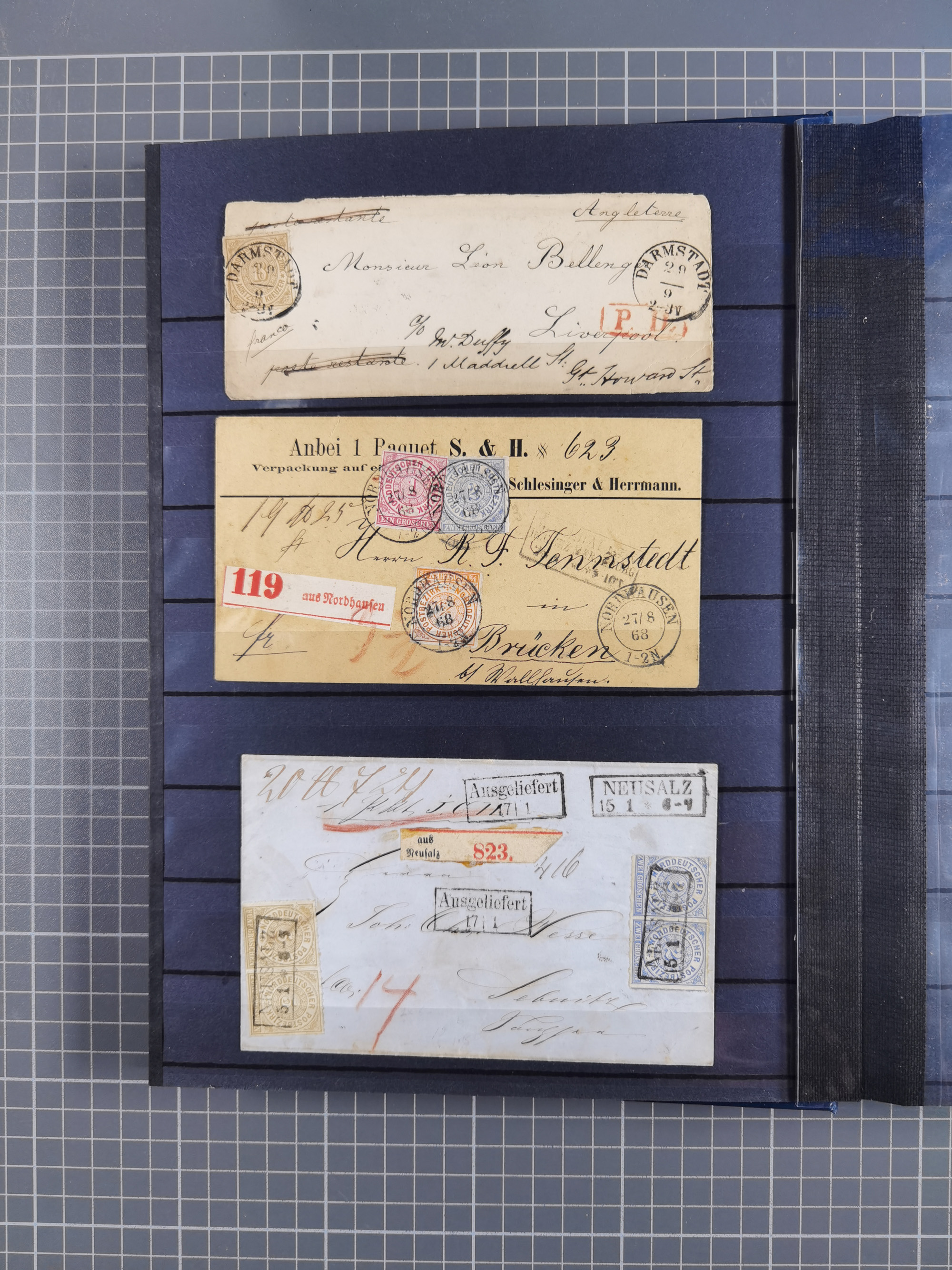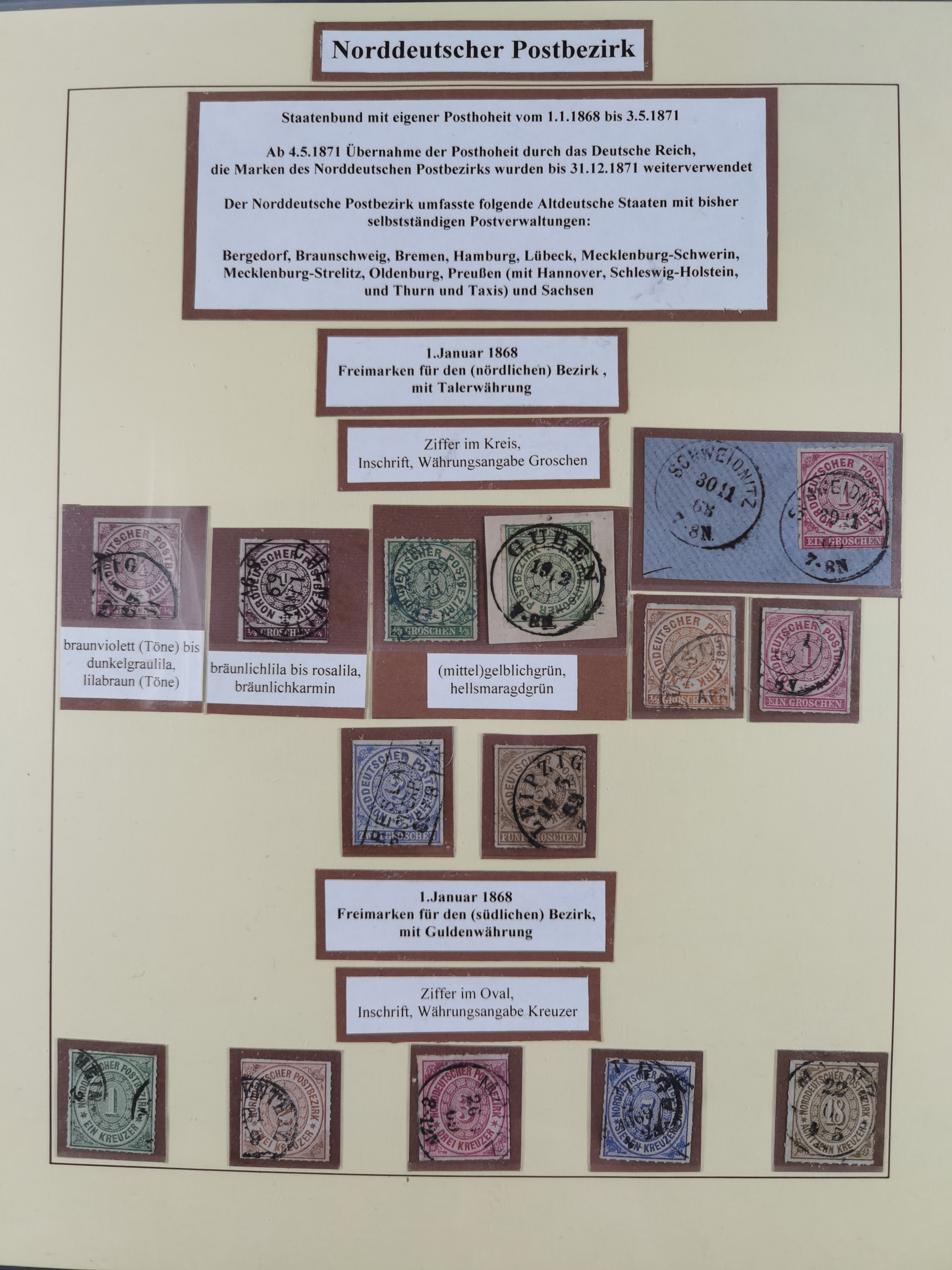 1868/71, interessante Partie im Steckbuch, dabei diverse Belege mit auch Farbfrankaturen, Paketbegleitbriefen, Auslandspost, etc.