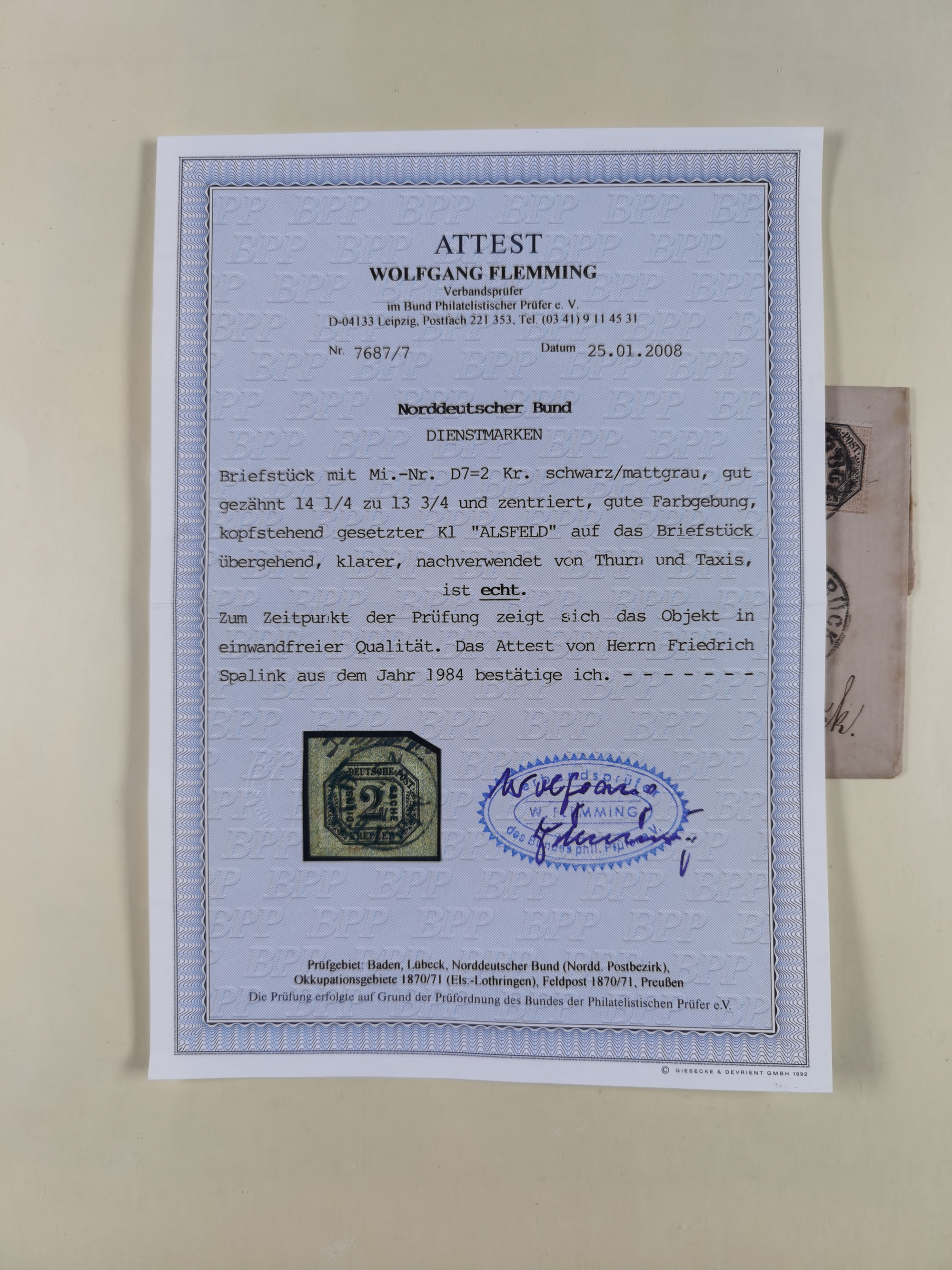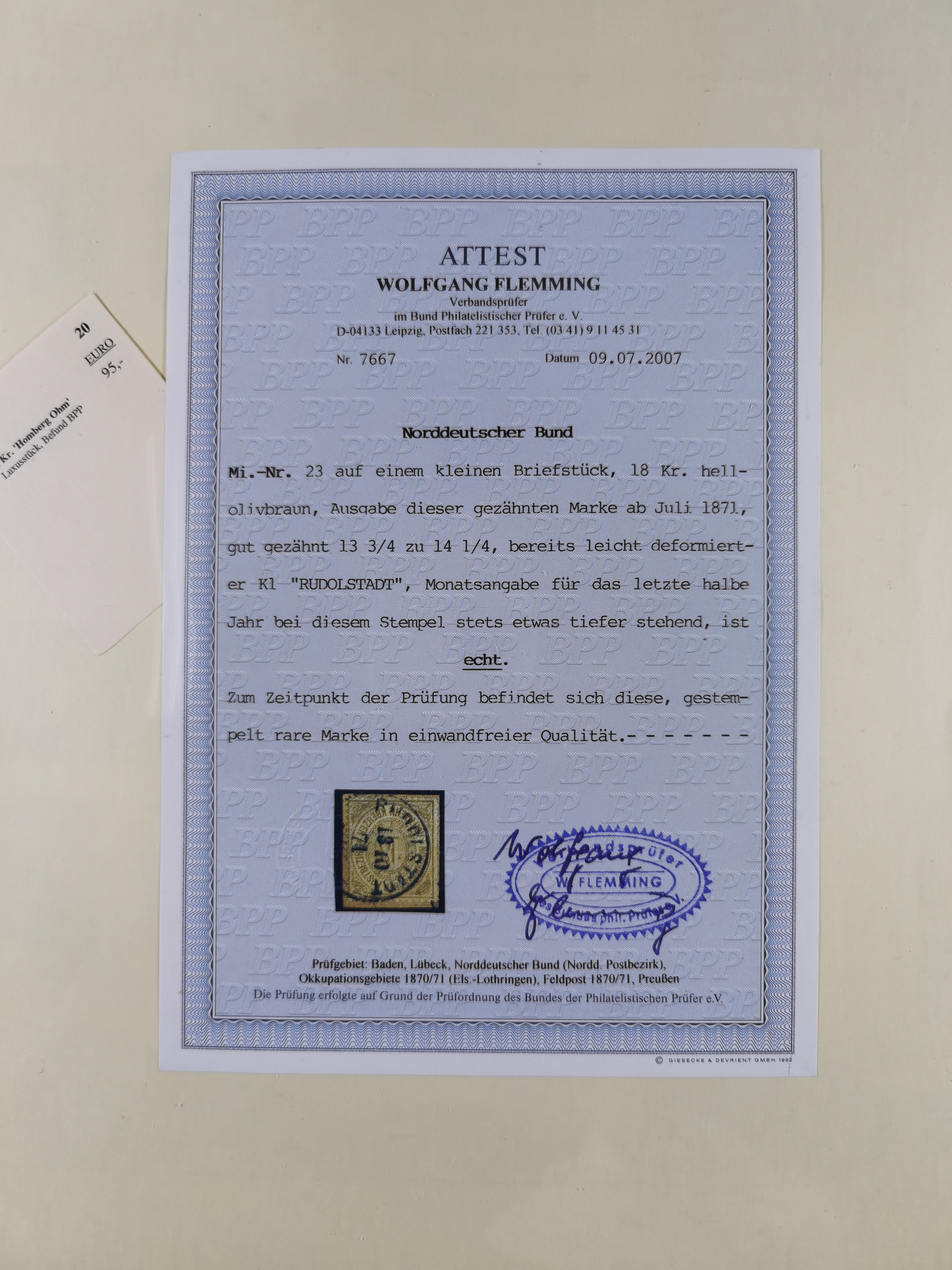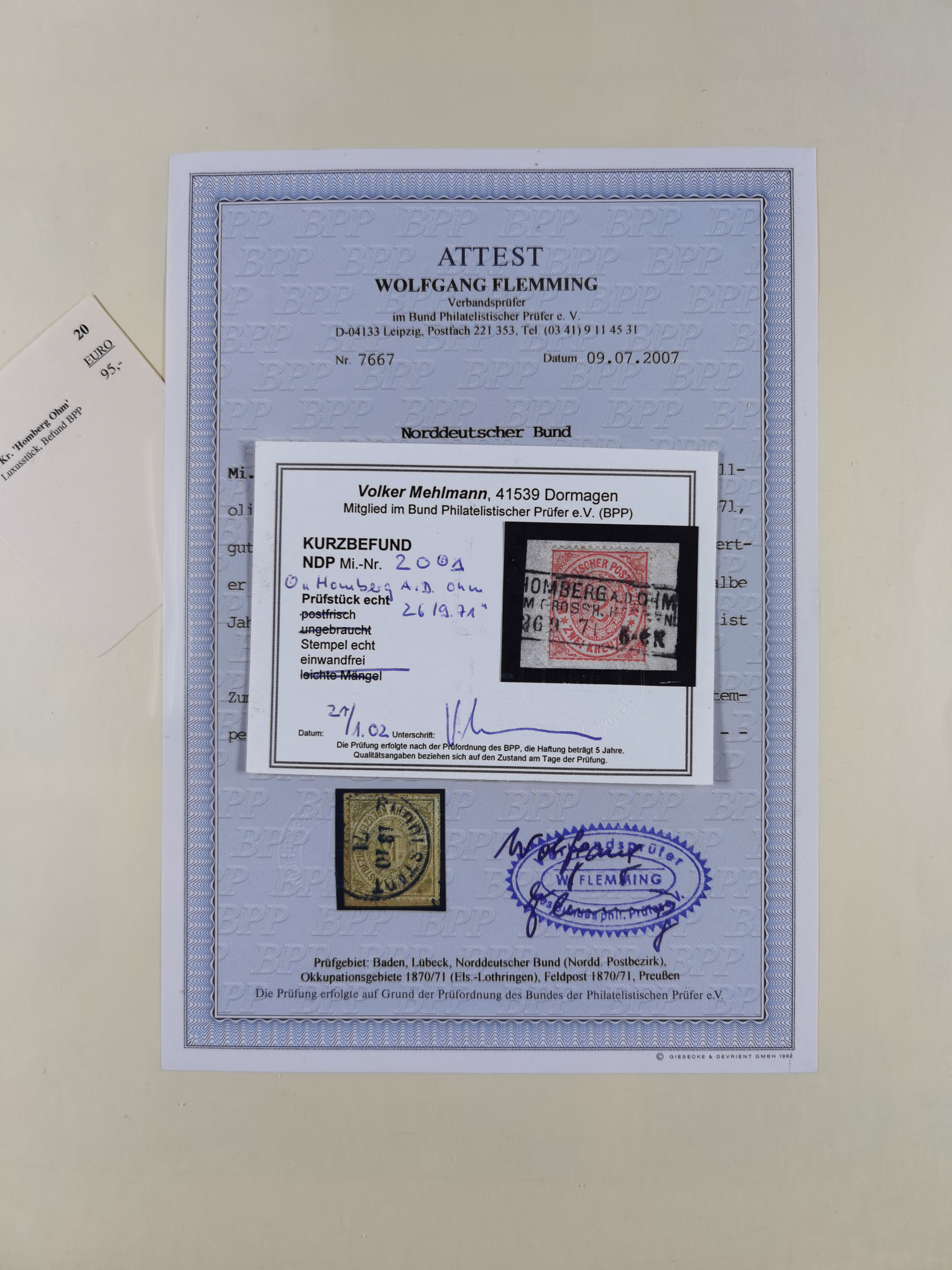 1868, 2 Groschen blau, farbfrisch und gut durchstochen, sauber mit EKr. “HAMBURG 18 9 68 5-6N” auf Postanweisung über “Fünf Thaler” nach Helgoland mit rückseitigem Empfangsvermerk sowie Ankunftsstempel “HELIGOLAND 19SP 1868”, Karte oben rechts kleiner Schrägschnitt, übliche senkrechte Faltung im Formular, ohne Belang, ein attraktives und sehr seltens Ganzstück aus der Aueckens-Korrespondenz, sign. Mehlmann BPP