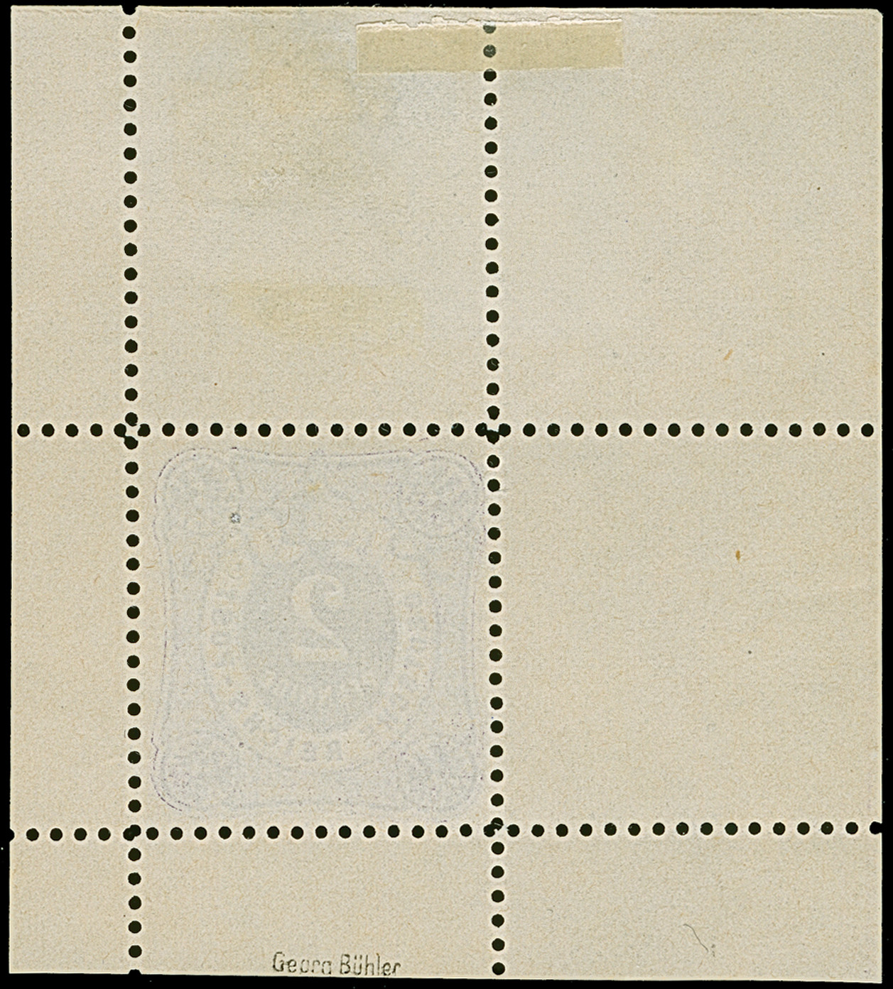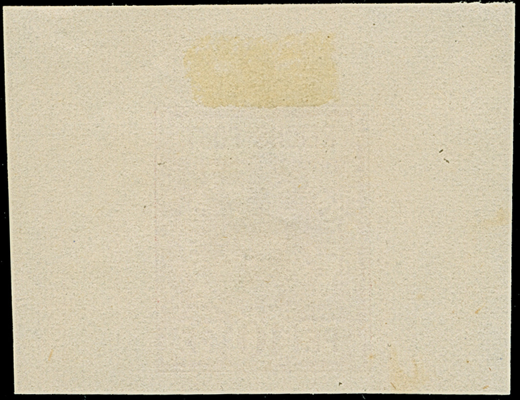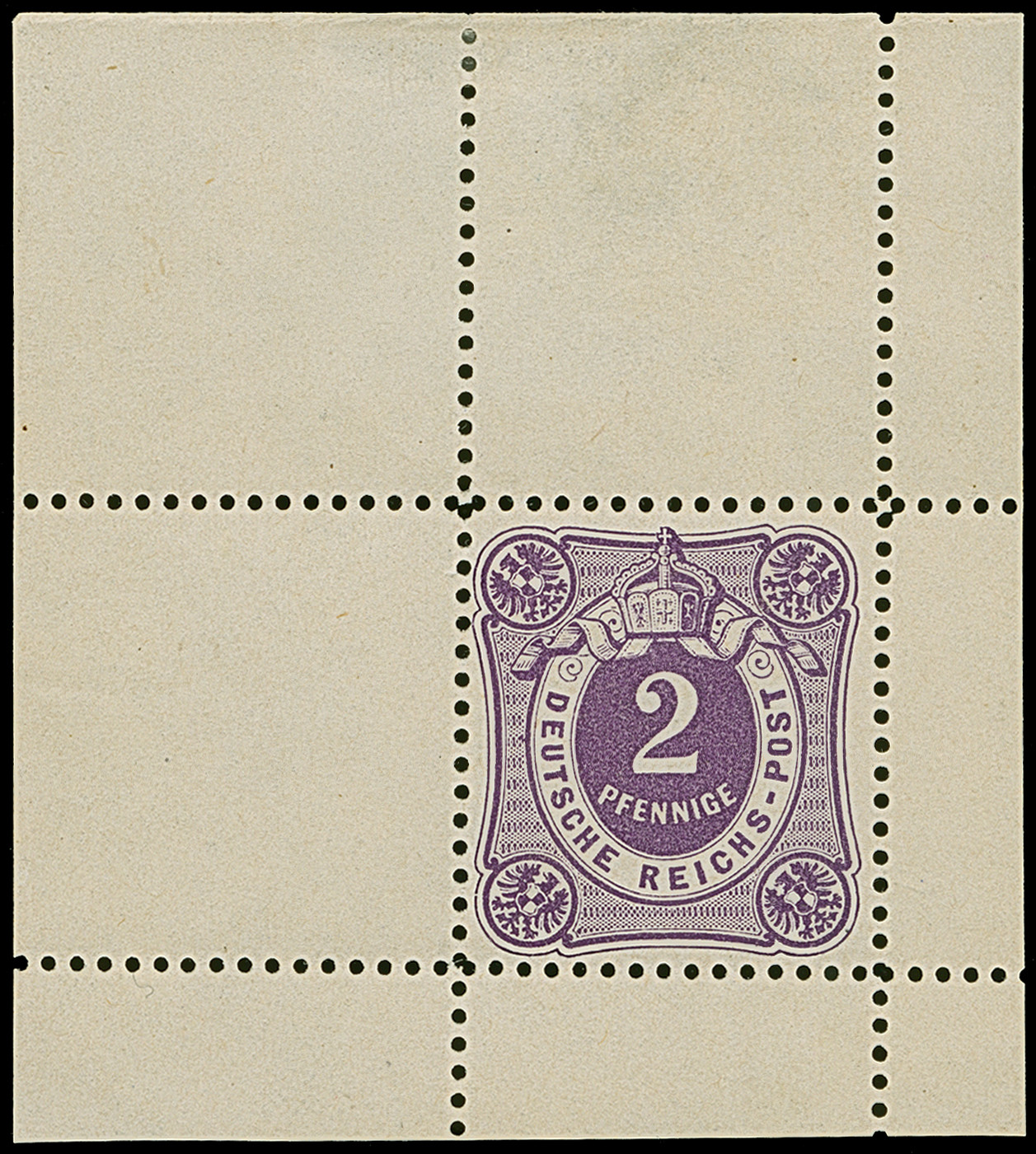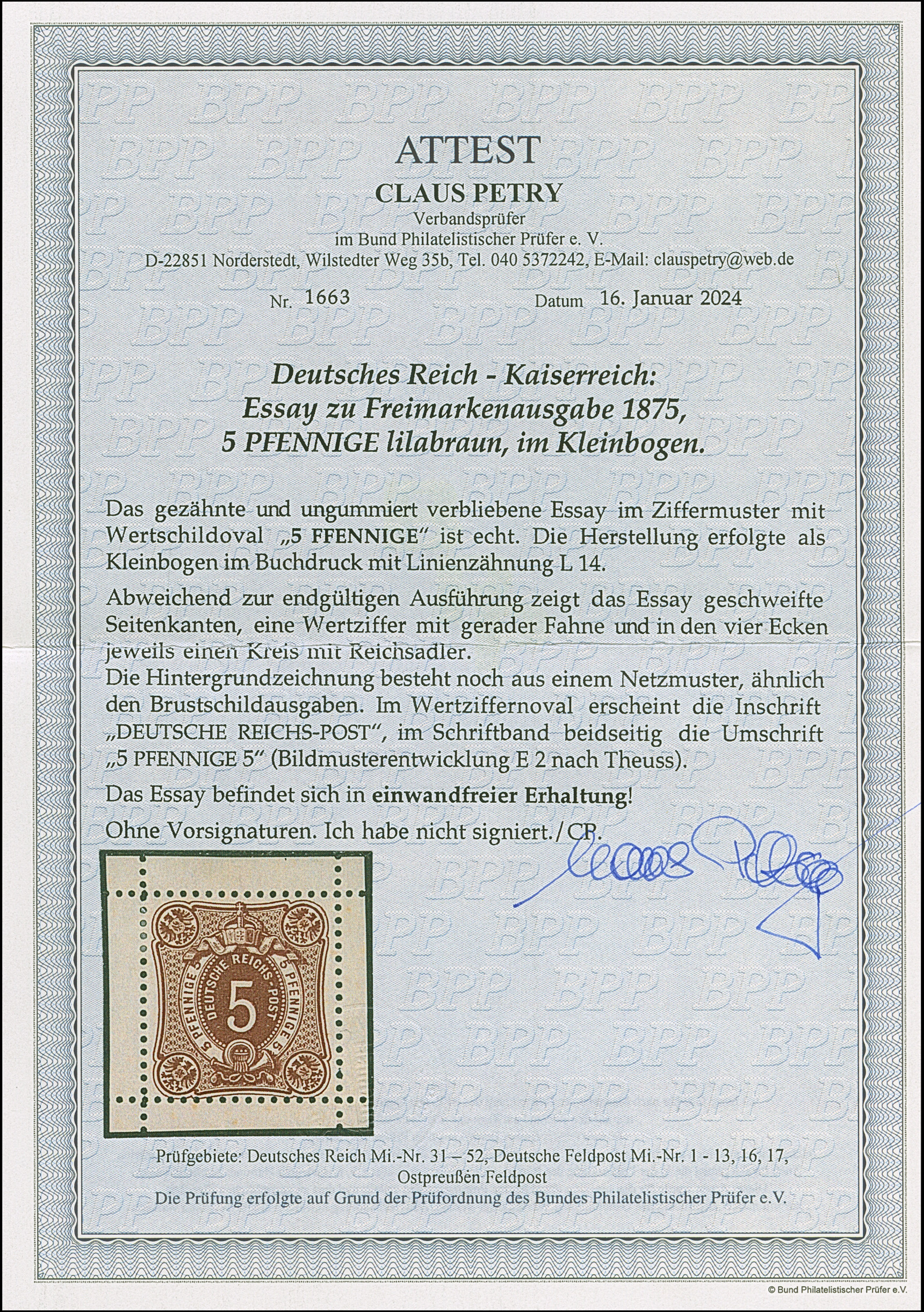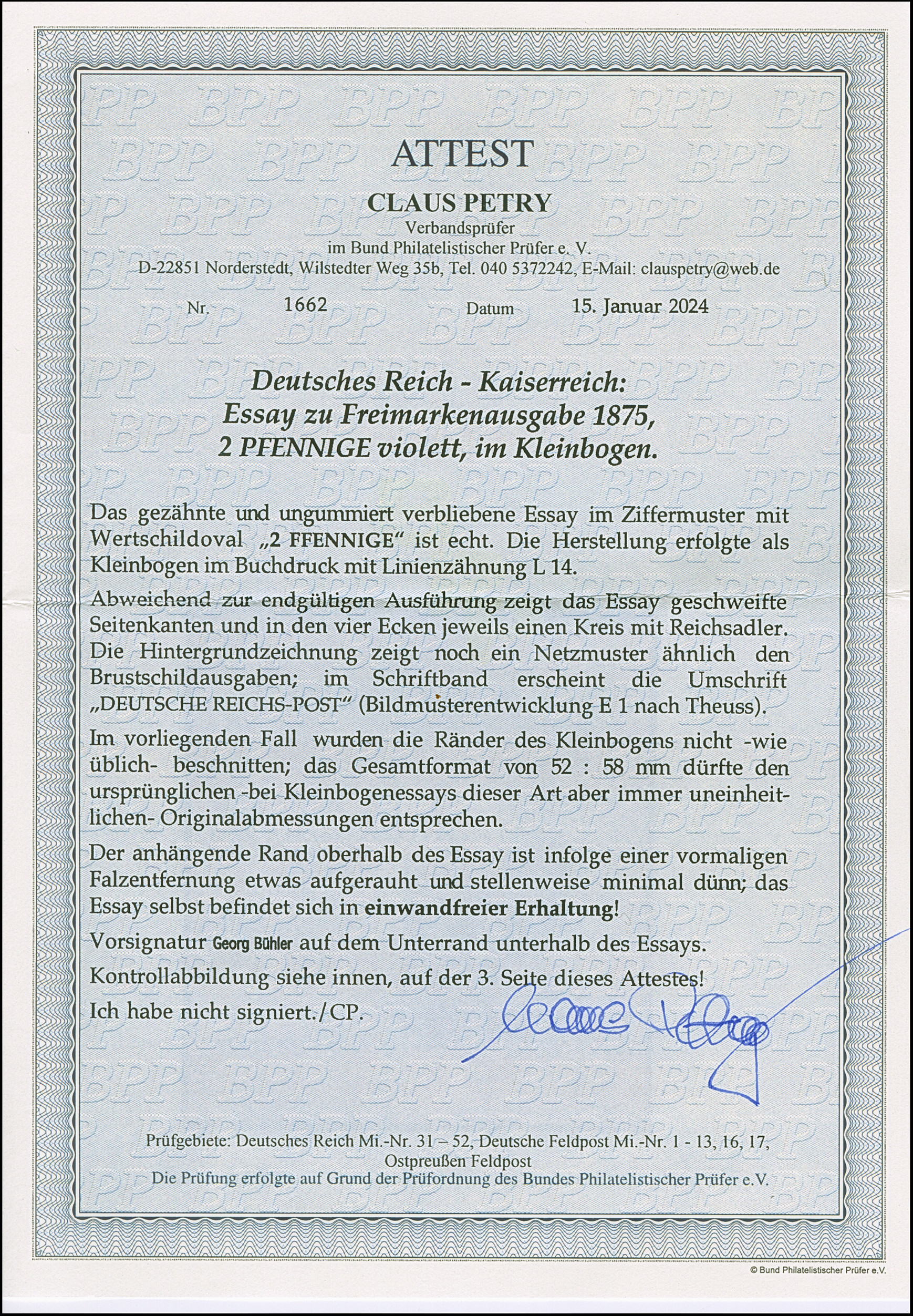 1875, 2 Pfge., Essay im Ziffermuster mit Wertschildoval und in den Ecken mit Reichsadler in Violett auf weißem Papier ohne Gummierung mit komplettem Kleinbogenrand (Format 52:58 mm). Der Oberrand mit dünnen Stellen durch eine Entfalzung, das Essay ist in einwandfreier Erhaltung, selten, signiert Bühler und Fotoattest Petry BPP (2024) (Theuss E1)