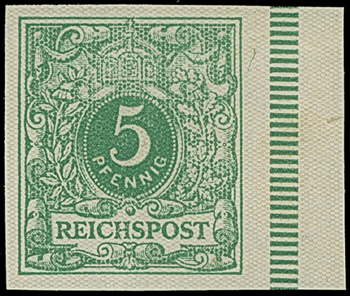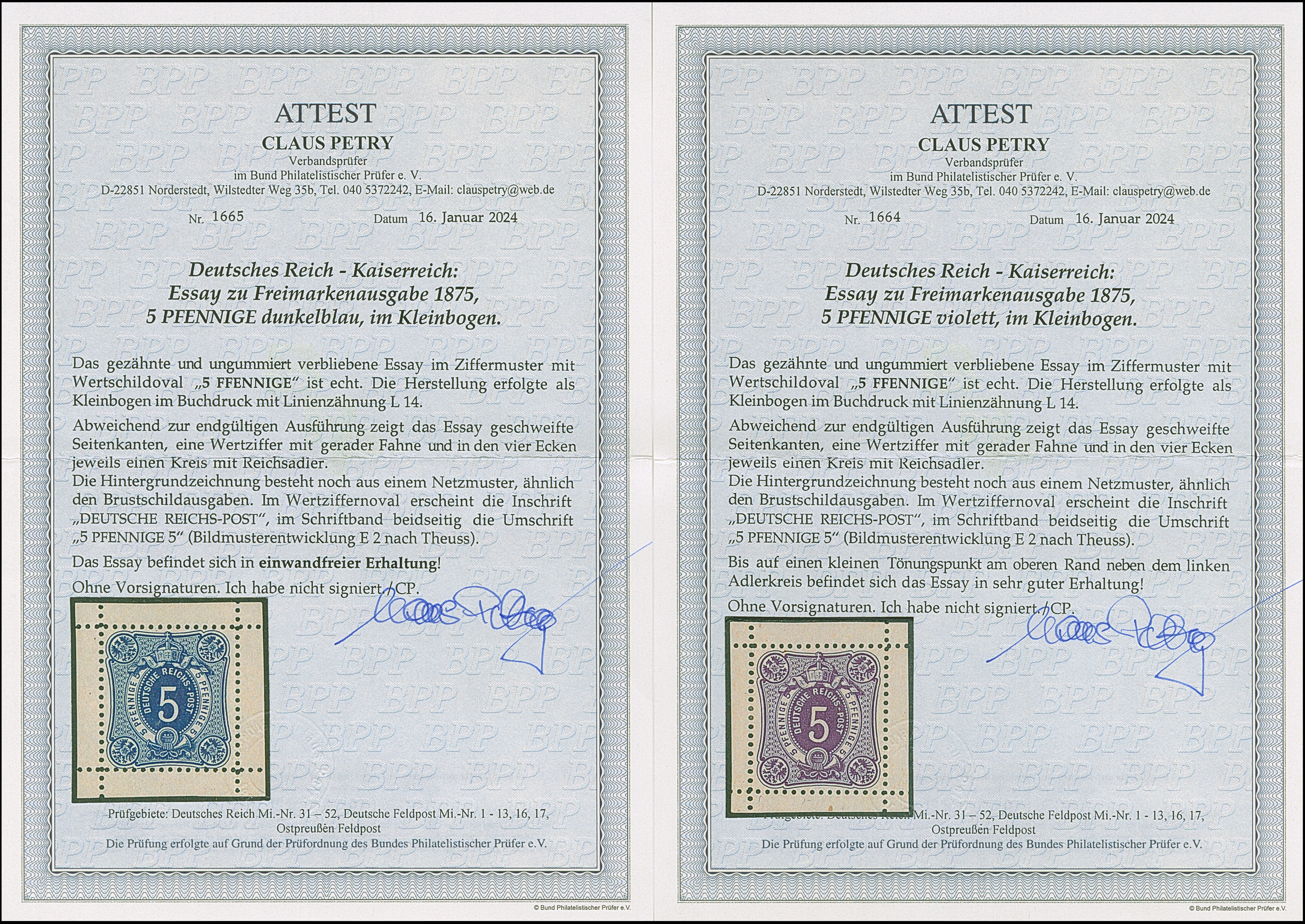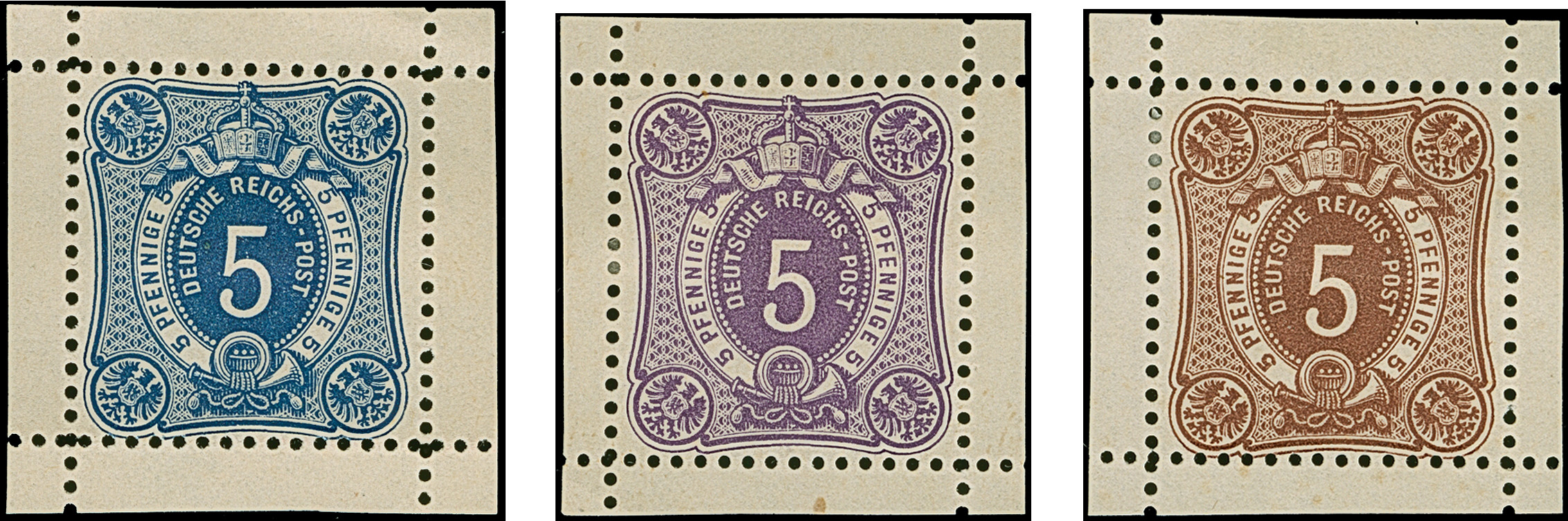 1875, 5 Pfge. als Essay im Ziffermuster mit Wertschildoval und in den Ecken mit Reichsadler in den Farben lilabraun, violett und dunkelblau auf weißem Papier ohne Gummierung je mit Kleinbogenrand, das Essay in Violett mit kaum sichtbarer kleiner Tönung, ansonsten sind alle drei Essays in einwandfreier Erhaltung, als komplette Serie sehr selten, drei Fotoatteste Petry BPP (2024) (Theuss E2)