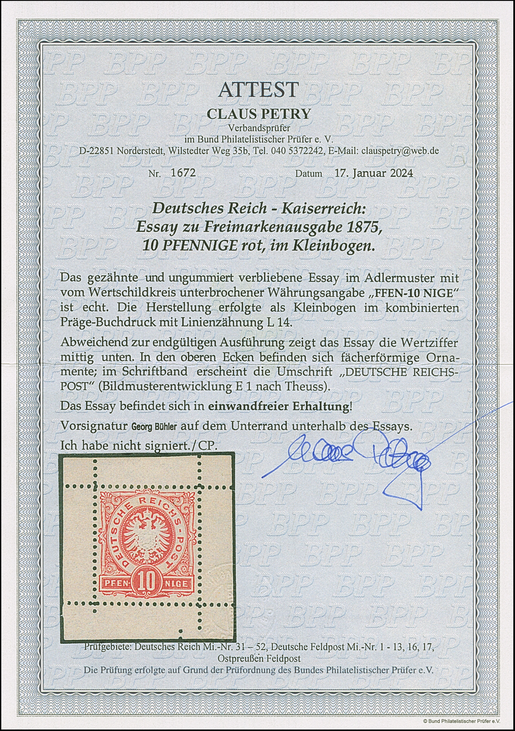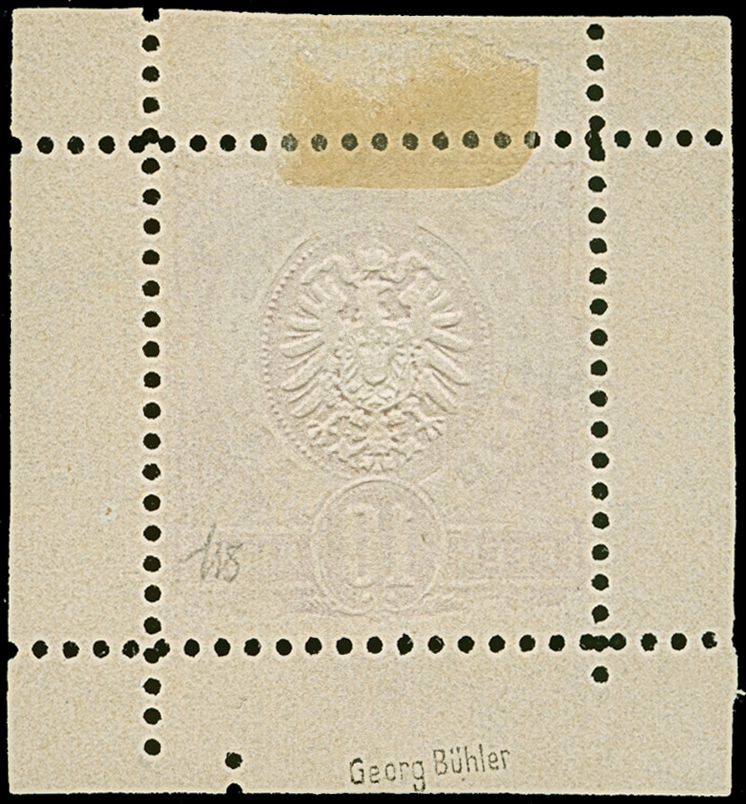 1875, 10 Pfge. als Essay im Adlermuster mit vom Wertschildkreis unterbrochener Währungsangabe “PFEN-10-NIGE” in Rot auf weißem Papier ohne Gummierung mit Kleinbogenrand, in einwandfreier Erhaltung, selten, signiert Bühler und Fotoattest Petry BPP (2024) (Theuss E1)